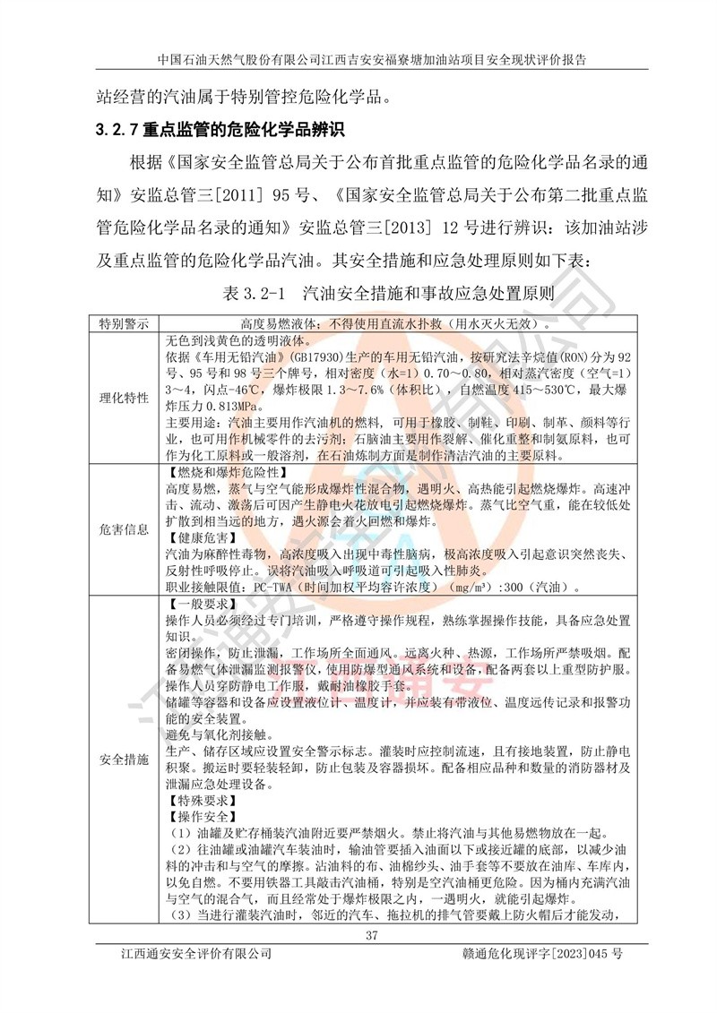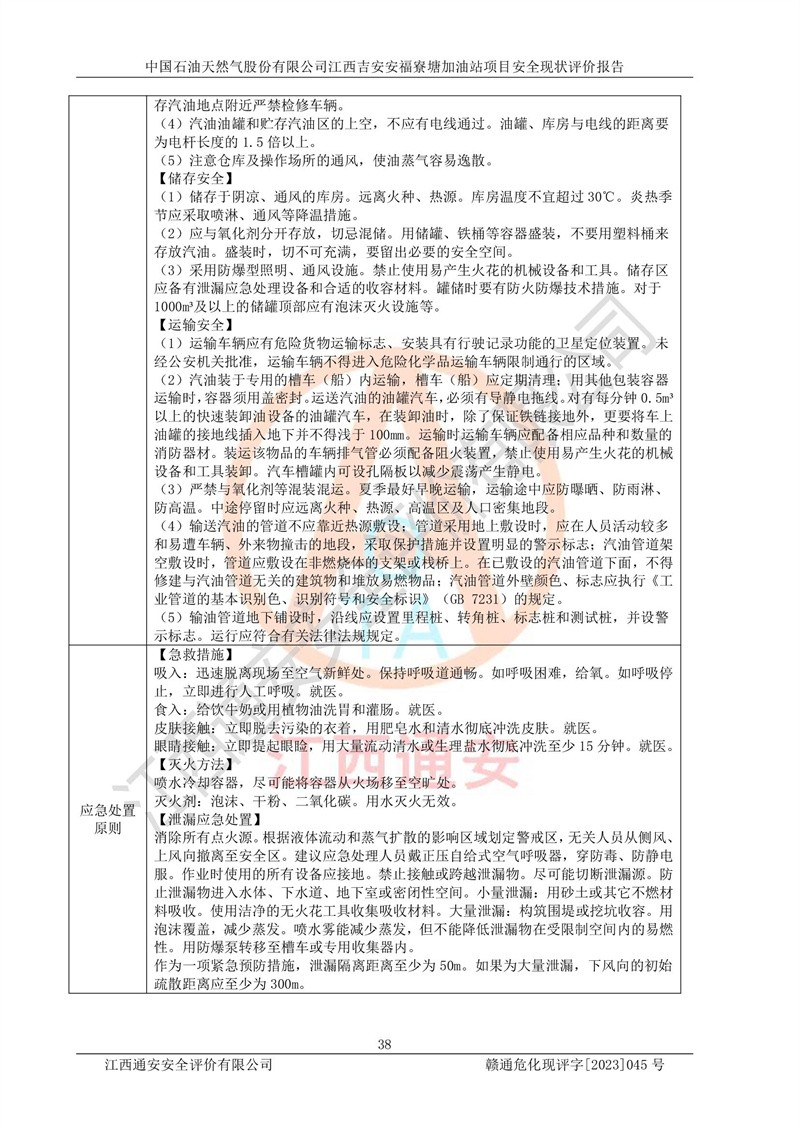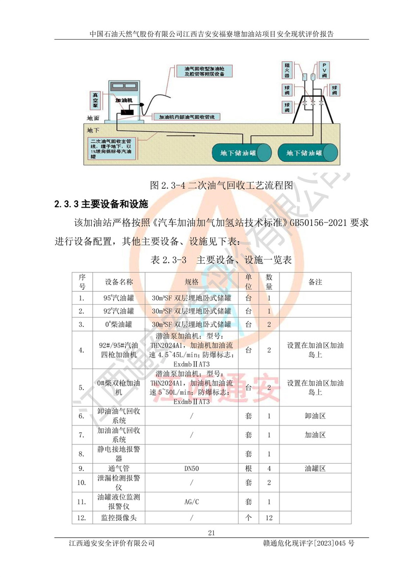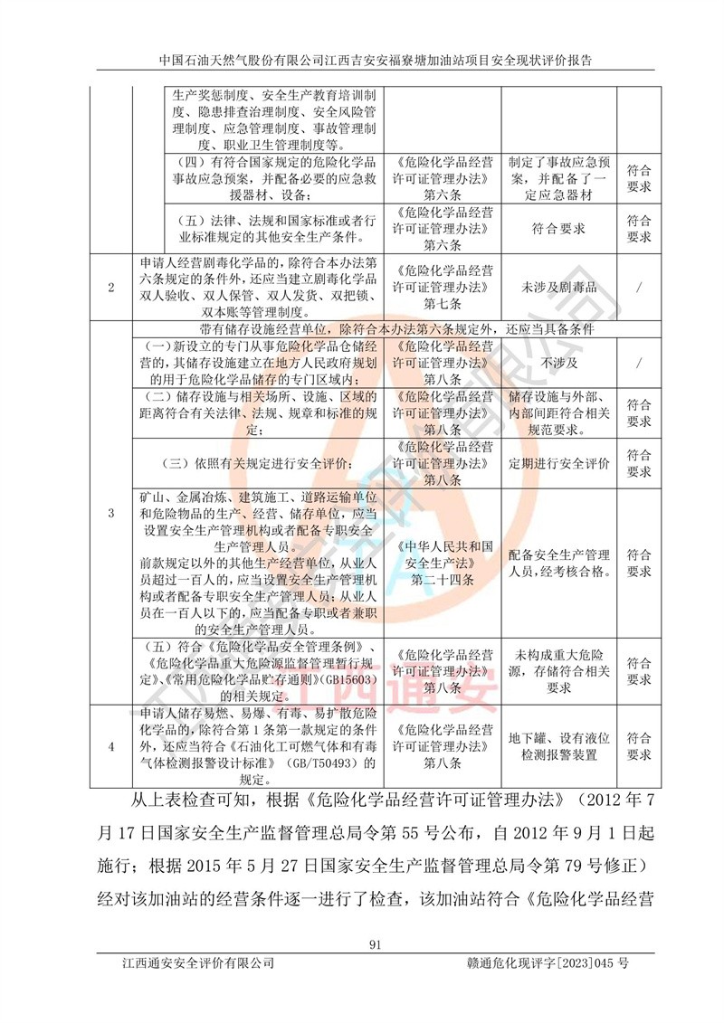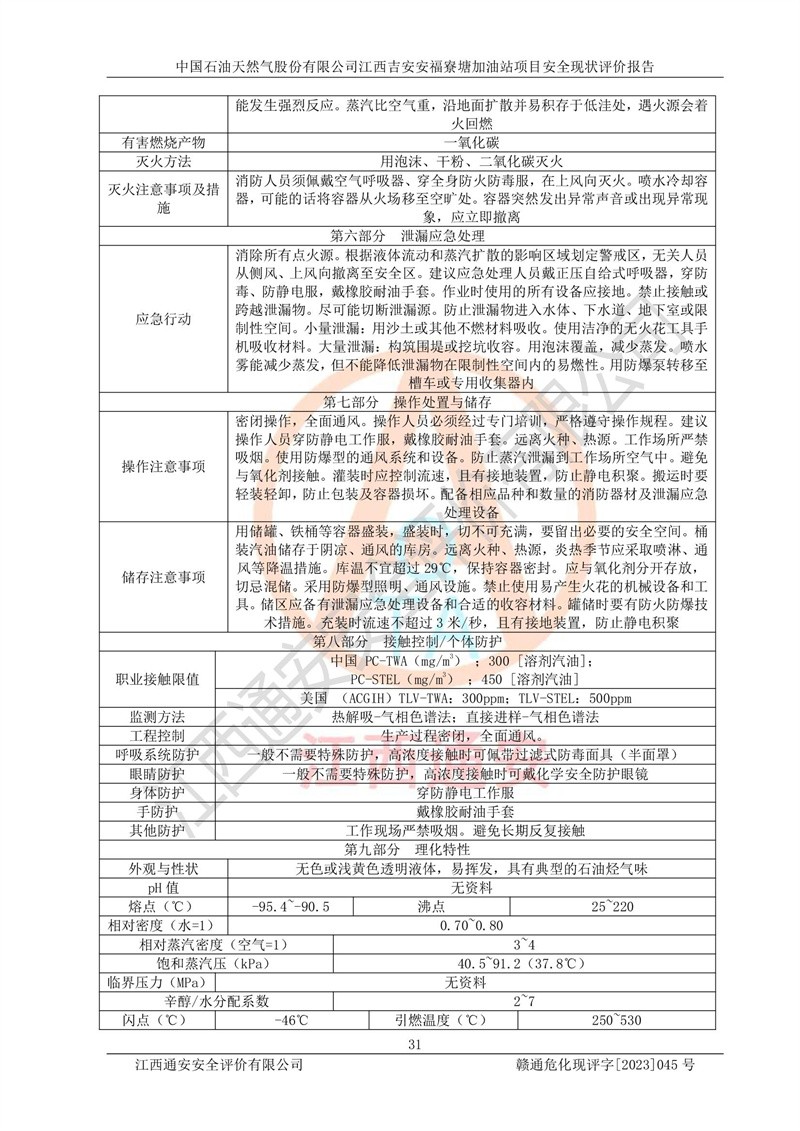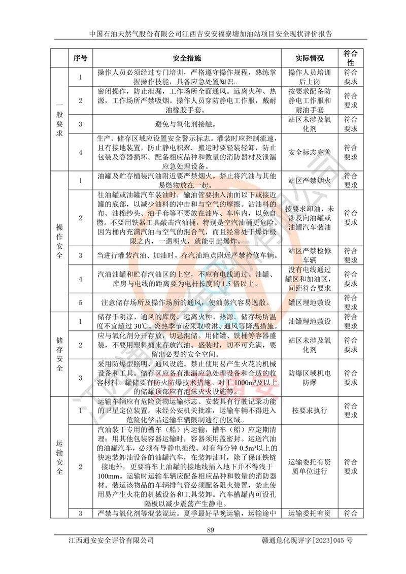 中國石油天然氣股份有限公司江西吉安安福寮塘加油站是一家從事成品油批發(fā)、成品油零售經(jīng)營的企業(yè)。該加油站成立于2011年5月4日,并獲得安??h市場監(jiān)督管理局頒發(fā)的營業(yè)執(zhí)照,營業(yè)執(zhí)照統(tǒng)一社會(huì)信用代碼為:91360829573618262D,加油站類型為股份有限公司分公司(上市,國有控股),負(fù)責(zé)人為鄢**,經(jīng)營范圍:許可項(xiàng)目:成品油批發(fā),成品油零售,住宿服務(wù),餐飲服務(wù),食品銷售,煙草制品零售,***零售,農(nóng)藥零售,藥品零售(依法須經(jīng)批準(zhǔn)的項(xiàng)目,經(jīng)相關(guān)部門批準(zhǔn)后在許可**期內(nèi)方可開展經(jīng)營活動(dòng),具體經(jīng)營項(xiàng)目和許可期限以相關(guān)部門批準(zhǔn)文件或許可證件為準(zhǔn))一般項(xiàng)目:潤滑油銷售,日用陶瓷制品銷售,汽車銷售,新能源汽車整車銷售,新能源汽車換電設(shè)施銷售,新能源汽車電附件銷售,互聯(lián)網(wǎng)銷售(除銷售需要許可的商品),汽車裝飾用品銷售,日用品銷售單用途商業(yè)預(yù)付卡代理銷售,日用化學(xué)產(chǎn)品銷售,勞動(dòng)保護(hù)用品銷售,家用電器銷售,塑料制品銷售,嬰幼兒配方乳粉及其他嬰幼兒配方食品銷售,食品用洗滌劑銷售,飼料添加劑銷售,肥料銷售,洗車服務(wù),農(nóng)副產(chǎn)品銷售,五金產(chǎn)品零售,辦公用品銷售,第二類醫(yī)療器械銷售,充電樁銷售農(nóng)作物種子經(jīng)營(**不再分裝的包裝種子),廣告設(shè)計(jì)代理,電子過磅服務(wù),化妝品零售,畜牧漁業(yè)飼料銷售消毒劑銷售 (不含危險(xiǎn)化學(xué)品),汽車零配件零售,電車銷售,機(jī)動(dòng)車修理和維護(hù),家具銷售,日用百貨銷售,集中式**充電站,針紡織品銷售,住房租賃 (除依法須經(jīng)批/準(zhǔn)的項(xiàng)目處,憑營業(yè)執(zhí)照依法自主開展經(jīng)營活動(dòng))。經(jīng)營場所:江西省吉安市安??h寮塘鄉(xiāng)龍佳村。 中國石油天然氣股份有限公司江西吉安安福寮塘加油站占地面積1200㎡,加油站中設(shè)有0#柴油雙槍加油機(jī)2臺(tái),92#汽油、95#汽油四槍加油機(jī)2臺(tái);該站設(shè)有4個(gè)30m3SF雙層埋地臥式儲(chǔ)罐,其中有2個(gè)30m3SF雙層埋地臥式0#柴油罐、1個(gè)92#30m3SF雙層埋地臥式汽油罐,1個(gè)95#30m3SF雙層埋地臥式汽油罐,油品折算總?cè)萘繛?/span>90m3(柴油罐容積折半計(jì)入油罐總?cè)莘e),屬三級加油站,汽油卸油、加油設(shè)置了油氣回收系統(tǒng)。 中國石油天然氣股份有限公司江西吉安安福寮塘加油站于2020年11月04日經(jīng)安??h應(yīng)急管理局核準(zhǔn),換發(fā)了新的《危險(xiǎn)化學(xué)品經(jīng)營許可證》,證書編號(hào):贛安安經(jīng)(甲)[2014]000007,許可經(jīng)營范圍:成品油。**期2020年11月04日至2023年11月03日。 中國石油天然氣股份有限公司江西吉安安福寮塘加油站2023年05月11日經(jīng)吉安市商務(wù)局核準(zhǔn),換取了新的《成品油零售經(jīng)營批準(zhǔn)證書》,證書編號(hào):油零售證書第吉0256號(hào),批準(zhǔn)從事成品油(汽油、柴油)零售業(yè)務(wù)。證書**期至2023年5月11日至2028年05月10日。 |