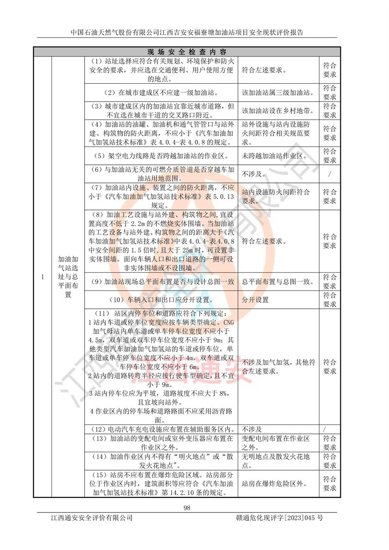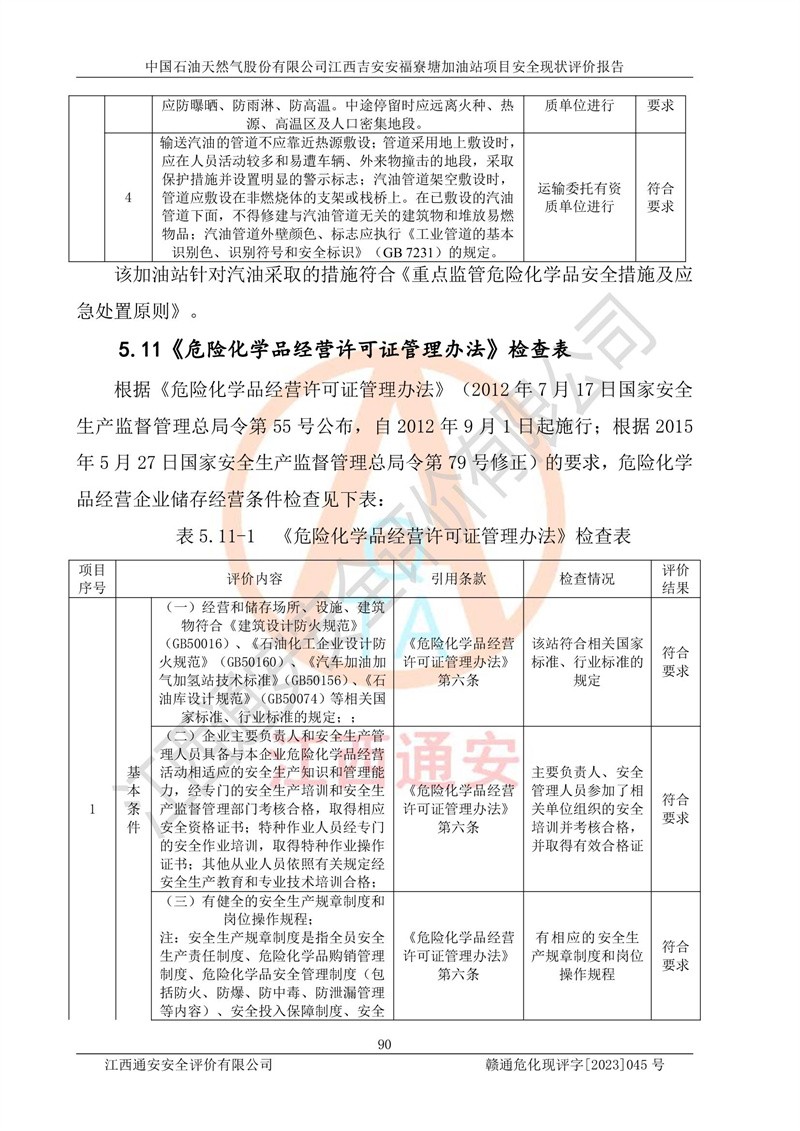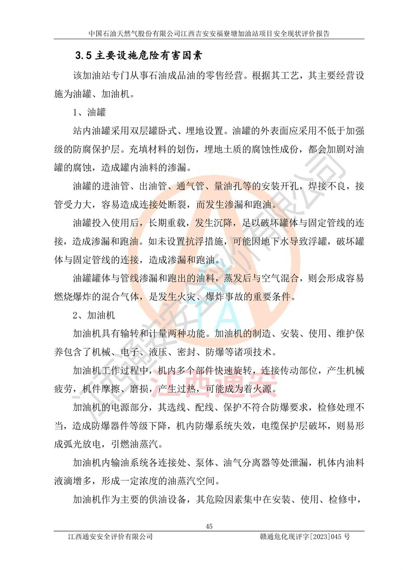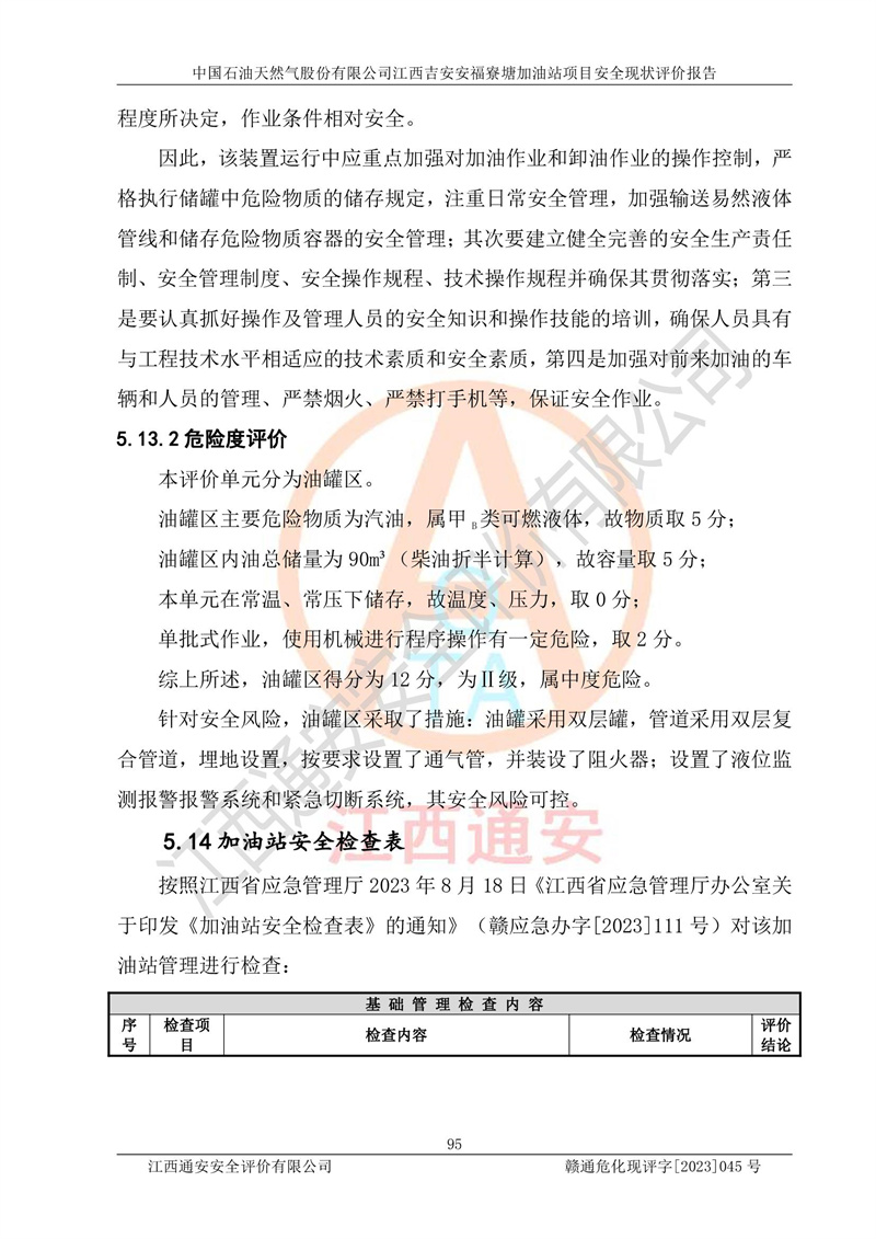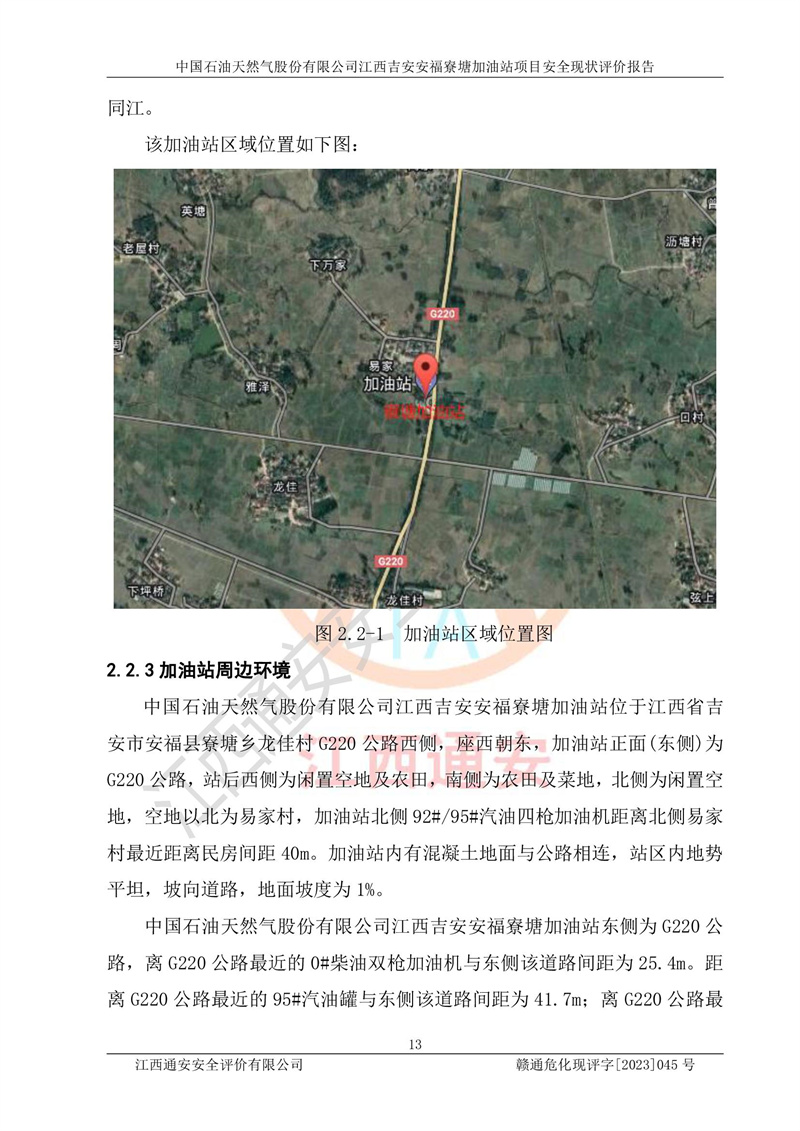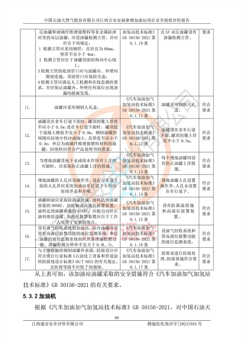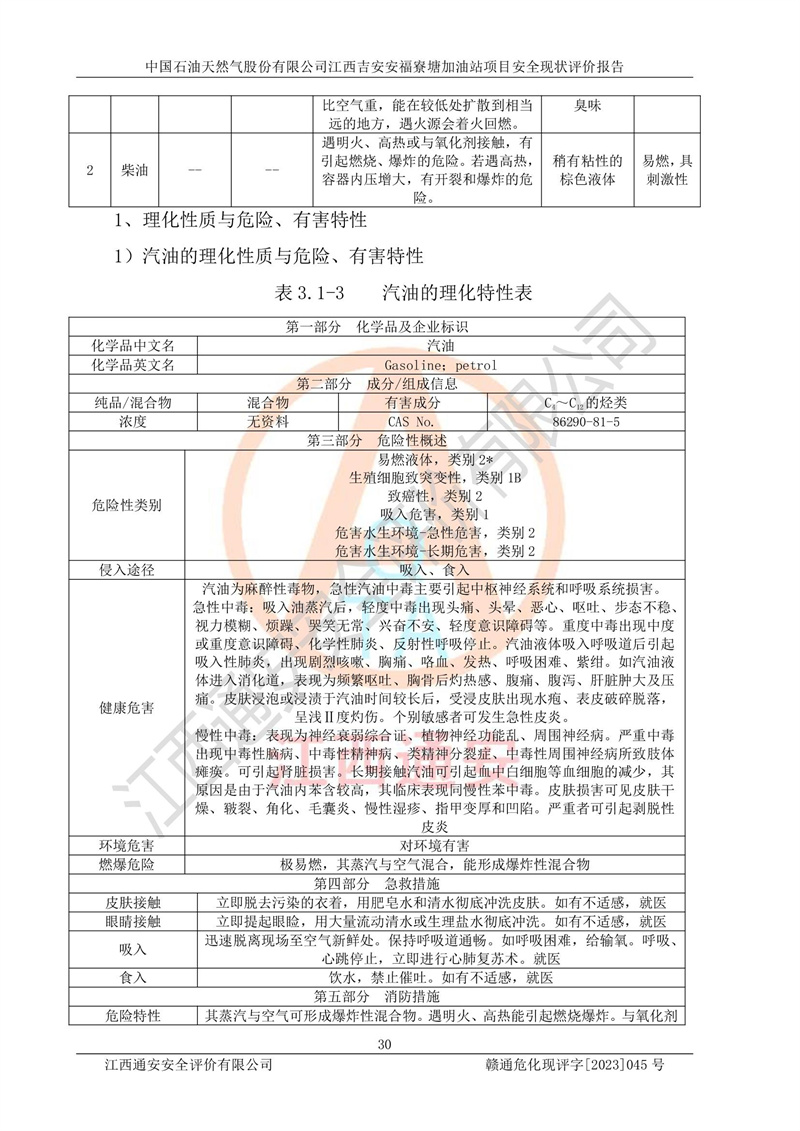 中國石油天然氣股份有限公司江西吉安安福寮塘加油站是一家從事成品油批發(fā)、成品油零售經(jīng)營的企業(yè)。該加油站成立于2011年5月4日,并獲得安??h市場監(jiān)督管理局頒發(fā)的營業(yè)執(zhí)照,營業(yè)執(zhí)照統(tǒng)一社會(huì)信用代碼為:91360829573618262D,加油站類型為股份有限公司分公司(上市,國有控股),負(fù)責(zé)人為鄢**,經(jīng)營范圍:許可項(xiàng)目:成品油批發(fā),成品油零售,住宿服務(wù),餐飲服務(wù),食品銷售,煙草制品零售,***零售,農(nóng)藥零售,藥品零售(依法須經(jīng)批準(zhǔn)的項(xiàng)目,經(jīng)相關(guān)部門批準(zhǔn)后在許可**期內(nèi)方可開展經(jīng)營活動(dòng),具體經(jīng)營項(xiàng)目和許可期限以相關(guān)部門批準(zhǔn)文件或許可證件為準(zhǔn))一般項(xiàng)目:潤滑油銷售,日用陶瓷制品銷售,汽車銷售,新能源汽車整車銷售,新能源汽車換電設(shè)施銷售,新能源汽車電附件銷售,互聯(lián)網(wǎng)銷售(除銷售需要許可的商品),汽車裝飾用品銷售,日用品銷售單用途商業(yè)預(yù)付卡代理銷售,日用化學(xué)產(chǎn)品銷售,勞動(dòng)保護(hù)用品銷售,家用電器銷售,塑料制品銷售,嬰幼兒配方乳粉及其他嬰幼兒配方食品銷售,食品用洗滌劑銷售,飼料添加劑銷售,肥料銷售,洗車服務(wù),農(nóng)副產(chǎn)品銷售,五金產(chǎn)品零售,辦公用品銷售,第二類醫(yī)療器械銷售,充電樁銷售農(nóng)作物種子經(jīng)營(**不再分裝的包裝種子),廣告設(shè)計(jì)代理,電子過磅服務(wù),化妝品零售,畜牧漁業(yè)飼料銷售消毒劑銷售 (不含危險(xiǎn)化學(xué)品),汽車零配件零售,電車銷售,機(jī)動(dòng)車修理和維護(hù),家具銷售,日用百貨銷售,集中式**充電站,針紡織品銷售,住房租賃 (除依法須經(jīng)批/準(zhǔn)的項(xiàng)目處,憑營業(yè)執(zhí)照依法自主開展經(jīng)營活動(dòng))。經(jīng)營場所:江西省吉安市安??h寮塘鄉(xiāng)龍佳村。 中國石油天然氣股份有限公司江西吉安安福寮塘加油站占地面積1200㎡,加油站中設(shè)有0#柴油雙槍加油機(jī)2臺(tái),92#汽油、95#汽油四槍加油機(jī)2臺(tái);該站設(shè)有4個(gè)30m3SF雙層埋地臥式儲(chǔ)罐,其中有2個(gè)30m3SF雙層埋地臥式0#柴油罐、1個(gè)92#30m3SF雙層埋地臥式汽油罐,1個(gè)95#30m3SF雙層埋地臥式汽油罐,油品折算總?cè)萘繛?/span>90m3(柴油罐容積折半計(jì)入油罐總?cè)莘e),屬三級加油站,汽油卸油、加油設(shè)置了油氣回收系統(tǒng)。 中國石油天然氣股份有限公司江西吉安安福寮塘加油站于2020年11月04日經(jīng)安??h應(yīng)急管理局核準(zhǔn),換發(fā)了新的《危險(xiǎn)化學(xué)品經(jīng)營許可證》,證書編號(hào):贛安安經(jīng)(甲)[2014]000007,許可經(jīng)營范圍:成品油。**期2020年11月04日至2023年11月03日。 中國石油天然氣股份有限公司江西吉安安福寮塘加油站2023年05月11日經(jīng)吉安市商務(wù)局核準(zhǔn),換取了新的《成品油零售經(jīng)營批準(zhǔn)證書》,證書編號(hào):油零售證書第吉0256號(hào),批準(zhǔn)從事成品油(汽油、柴油)零售業(yè)務(wù)。證書**期至2023年5月11日至2028年05月10日。 |