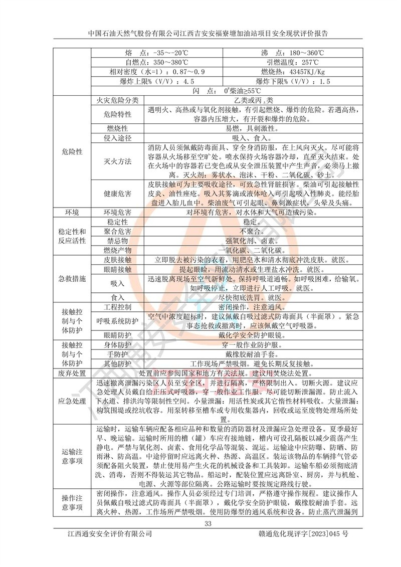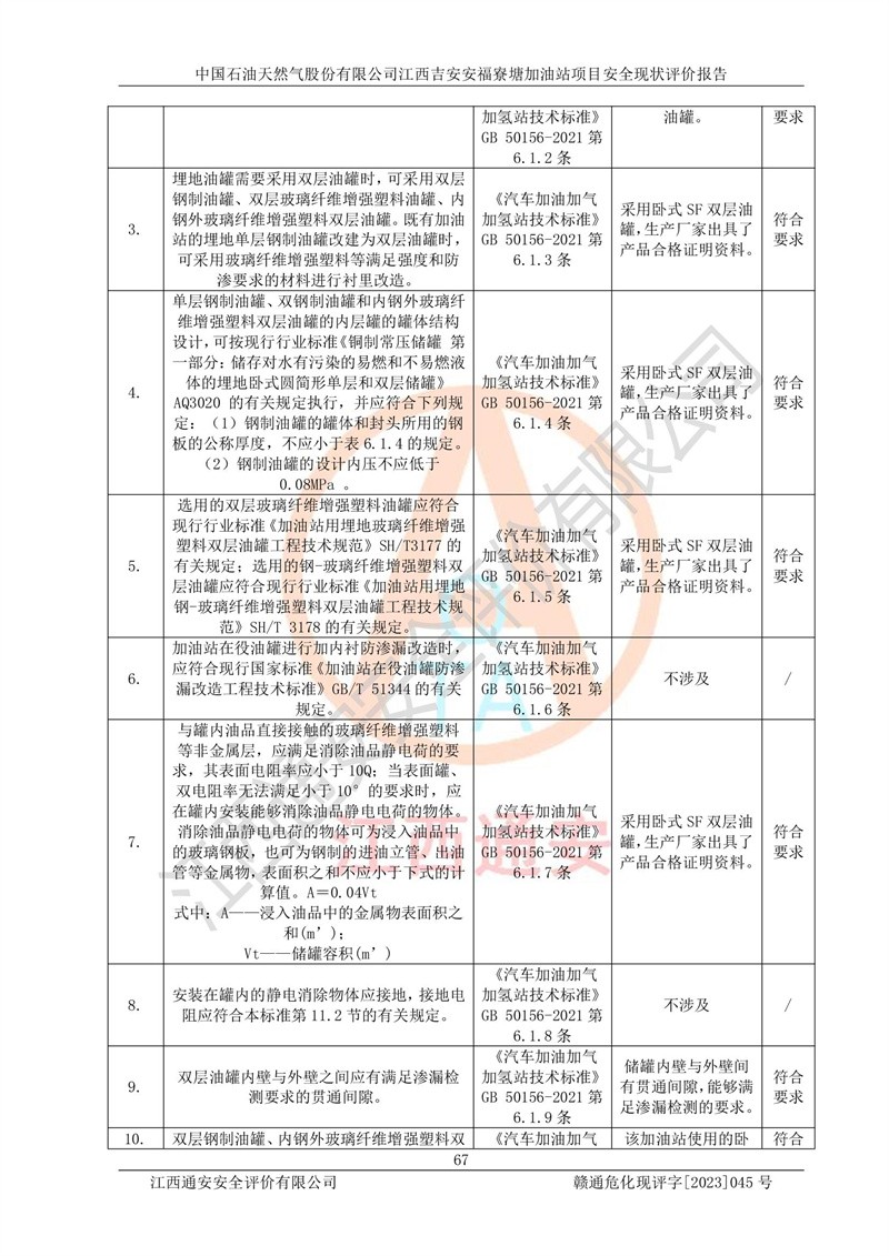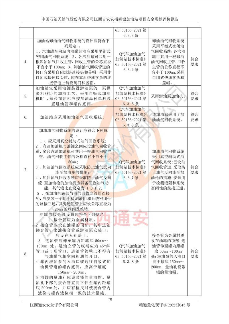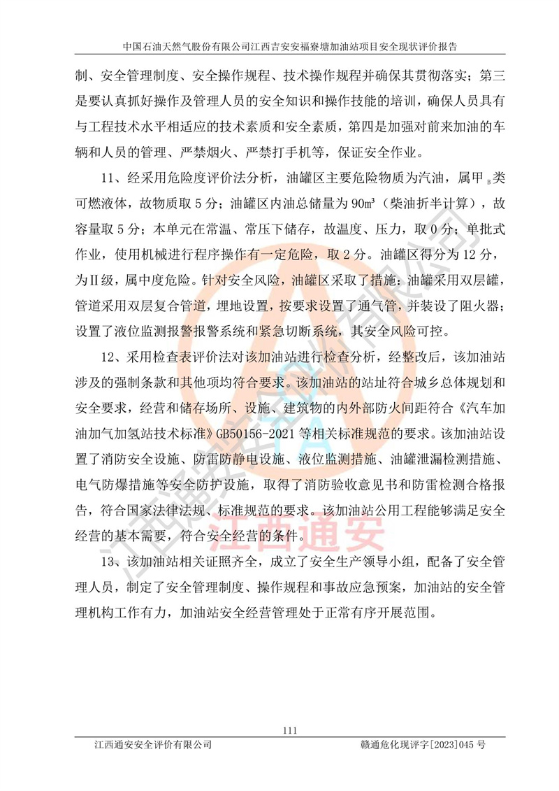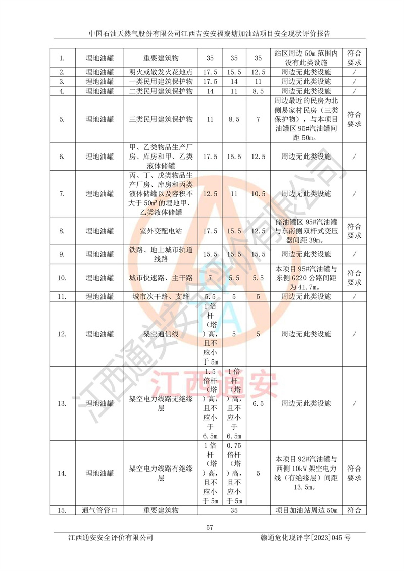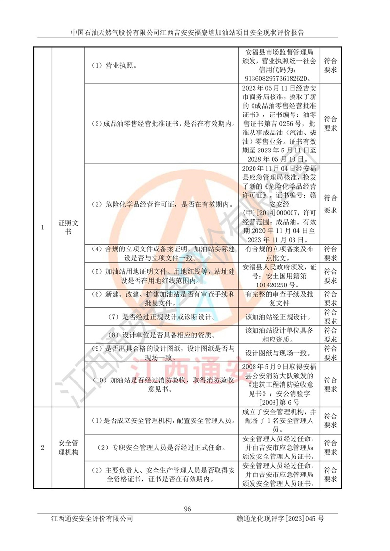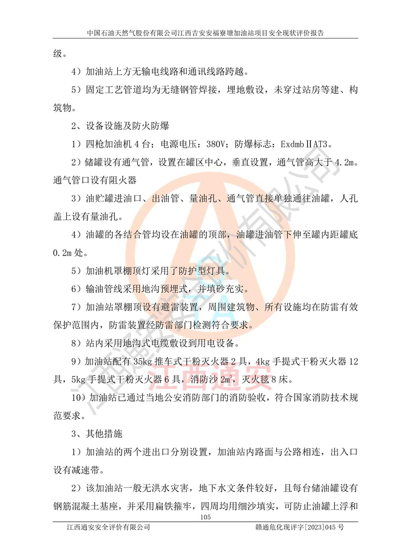 中國石油天然氣股份有限公司江西吉安安福寮塘加油站是一家從事成品油批發(fā)、成品油零售經(jīng)營的企業(yè)。該加油站成立于2011年5月4日,并獲得安??h市場監(jiān)督管理局頒發(fā)的營業(yè)執(zhí)照,營業(yè)執(zhí)照統(tǒng)一社會(huì)信用代碼為:91360829573618262D,加油站類型為股份有限公司分公司(上市,國有控股),負(fù)責(zé)人為鄢**,經(jīng)營范圍:許可項(xiàng)目:成品油批發(fā),成品油零售,住宿服務(wù),餐飲服務(wù),食品銷售,煙草制品零售,***零售,農(nóng)藥零售,藥品零售(依法須經(jīng)批準(zhǔn)的項(xiàng)目,經(jīng)相關(guān)部門批準(zhǔn)后在許可**期內(nèi)方可開展經(jīng)營活動(dòng),具體經(jīng)營項(xiàng)目和許可期限以相關(guān)部門批準(zhǔn)文件或許可證件為準(zhǔn))一般項(xiàng)目:潤滑油銷售,日用陶瓷制品銷售,汽車銷售,新能源汽車整車銷售,新能源汽車換電設(shè)施銷售,新能源汽車電附件銷售,互聯(lián)網(wǎng)銷售(除銷售需要許可的商品),汽車裝飾用品銷售,日用品銷售單用途商業(yè)預(yù)付卡代理銷售,日用化學(xué)產(chǎn)品銷售,勞動(dòng)保護(hù)用品銷售,家用電器銷售,塑料制品銷售,嬰幼兒配方乳粉及其他嬰幼兒配方食品銷售,食品用洗滌劑銷售,飼料添加劑銷售,肥料銷售,洗車服務(wù),農(nóng)副產(chǎn)品銷售,五金產(chǎn)品零售,辦公用品銷售,第二類醫(yī)療器械銷售,充電樁銷售農(nóng)作物種子經(jīng)營(**不再分裝的包裝種子),廣告設(shè)計(jì)代理,電子過磅服務(wù),化妝品零售,畜牧漁業(yè)飼料銷售消毒劑銷售 (不含危險(xiǎn)化學(xué)品),汽車零配件零售,電車銷售,機(jī)動(dòng)車修理和維護(hù),家具銷售,日用百貨銷售,集中式**充電站,針紡織品銷售,住房租賃 (除依法須經(jīng)批/準(zhǔn)的項(xiàng)目處,憑營業(yè)執(zhí)照依法自主開展經(jīng)營活動(dòng))。經(jīng)營場所:江西省吉安市安??h寮塘鄉(xiāng)龍佳村。 中國石油天然氣股份有限公司江西吉安安福寮塘加油站占地面積1200㎡,加油站中設(shè)有0#柴油雙槍加油機(jī)2臺(tái),92#汽油、95#汽油四槍加油機(jī)2臺(tái);該站設(shè)有4個(gè)30m3SF雙層埋地臥式儲(chǔ)罐,其中有2個(gè)30m3SF雙層埋地臥式0#柴油罐、1個(gè)92#30m3SF雙層埋地臥式汽油罐,1個(gè)95#30m3SF雙層埋地臥式汽油罐,油品折算總?cè)萘繛?/span>90m3(柴油罐容積折半計(jì)入油罐總?cè)莘e),屬三級加油站,汽油卸油、加油設(shè)置了油氣回收系統(tǒng)。 中國石油天然氣股份有限公司江西吉安安福寮塘加油站于2020年11月04日經(jīng)安??h應(yīng)急管理局核準(zhǔn),換發(fā)了新的《危險(xiǎn)化學(xué)品經(jīng)營許可證》,證書編號(hào):贛安安經(jīng)(甲)[2014]000007,許可經(jīng)營范圍:成品油。**期2020年11月04日至2023年11月03日。 中國石油天然氣股份有限公司江西吉安安福寮塘加油站2023年05月11日經(jīng)吉安市商務(wù)局核準(zhǔn),換取了新的《成品油零售經(jīng)營批準(zhǔn)證書》,證書編號(hào):油零售證書第吉0256號(hào),批準(zhǔn)從事成品油(汽油、柴油)零售業(yè)務(wù)。證書**期至2023年5月11日至2028年05月10日。 |