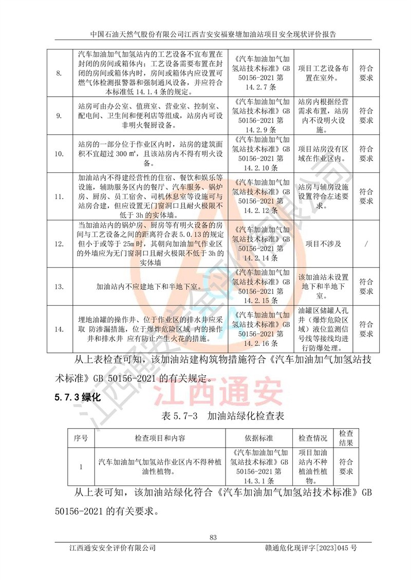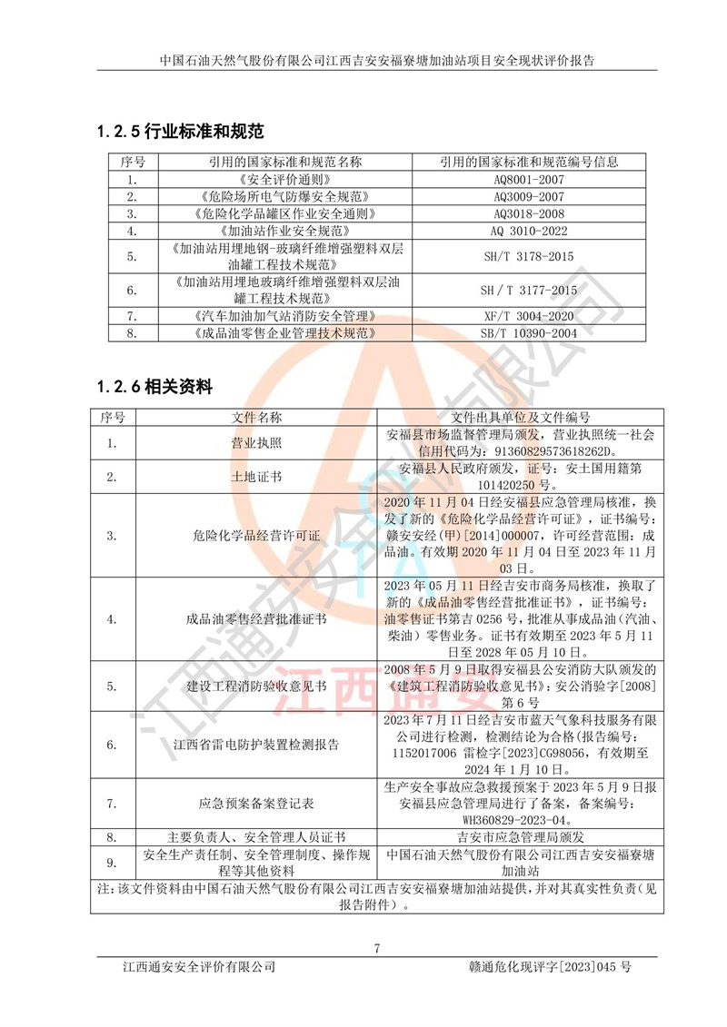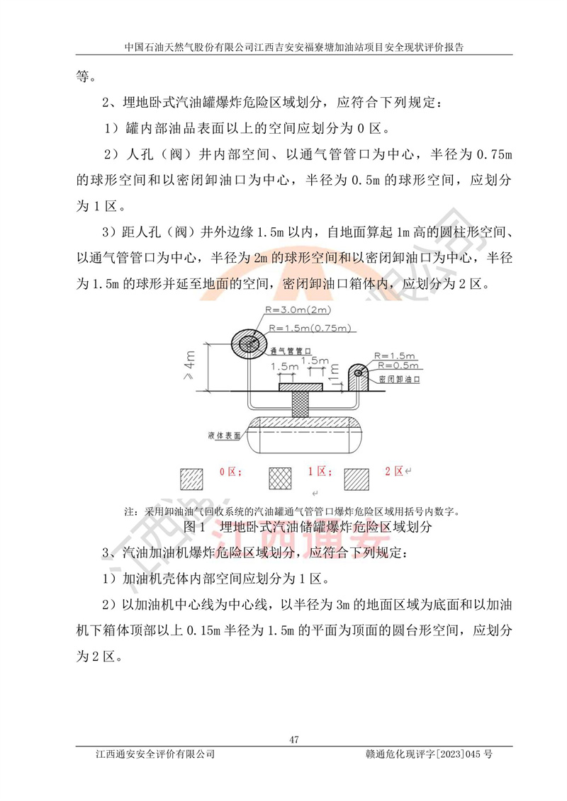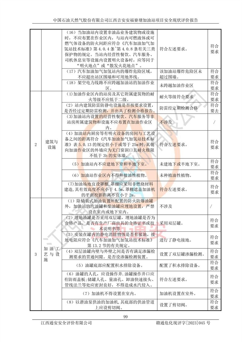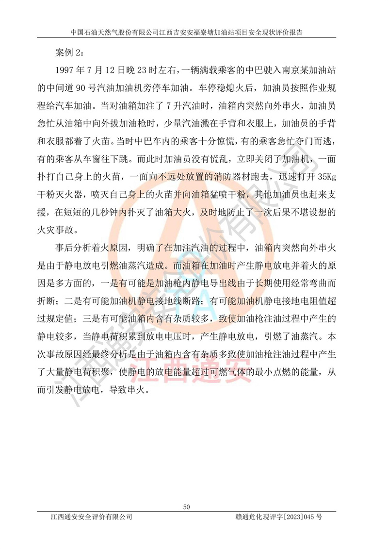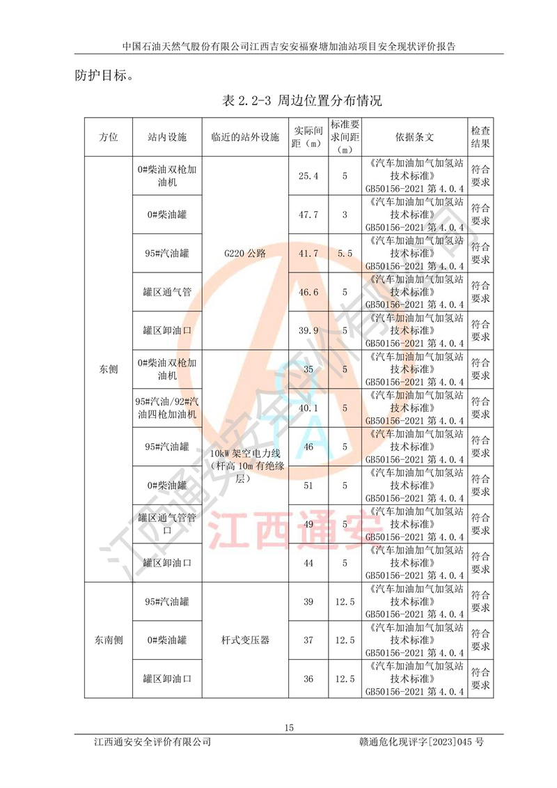 中國石油天然氣股份有限公司江西吉安安福寮塘加油站是一家從事成品油批發(fā)、成品油零售經(jīng)營的企業(yè)。該加油站成立于2011年5月4日,并獲得安??h市場監(jiān)督管理局頒發(fā)的營業(yè)執(zhí)照,營業(yè)執(zhí)照統(tǒng)一社會(huì)信用代碼為:91360829573618262D,加油站類型為股份有限公司分公司(上市,國有控股),負(fù)責(zé)人為鄢**,經(jīng)營范圍:許可項(xiàng)目:成品油批發(fā),成品油零售,住宿服務(wù),餐飲服務(wù),食品銷售,煙草制品零售,***零售,農(nóng)藥零售,藥品零售(依法須經(jīng)批準(zhǔn)的項(xiàng)目,經(jīng)相關(guān)部門批準(zhǔn)后在許可**期內(nèi)方可開展經(jīng)營活動(dòng),具體經(jīng)營項(xiàng)目和許可期限以相關(guān)部門批準(zhǔn)文件或許可證件為準(zhǔn))一般項(xiàng)目:潤滑油銷售,日用陶瓷制品銷售,汽車銷售,新能源汽車整車銷售,新能源汽車換電設(shè)施銷售,新能源汽車電附件銷售,互聯(lián)網(wǎng)銷售(除銷售需要許可的商品),汽車裝飾用品銷售,日用品銷售單用途商業(yè)預(yù)付卡代理銷售,日用化學(xué)產(chǎn)品銷售,勞動(dòng)保護(hù)用品銷售,家用電器銷售,塑料制品銷售,嬰幼兒配方乳粉及其他嬰幼兒配方食品銷售,食品用洗滌劑銷售,飼料添加劑銷售,肥料銷售,洗車服務(wù),農(nóng)副產(chǎn)品銷售,五金產(chǎn)品零售,辦公用品銷售,第二類醫(yī)療器械銷售,充電樁銷售農(nóng)作物種子經(jīng)營(**不再分裝的包裝種子),廣告設(shè)計(jì)代理,電子過磅服務(wù),化妝品零售,畜牧漁業(yè)飼料銷售消毒劑銷售 (不含危險(xiǎn)化學(xué)品),汽車零配件零售,電車銷售,機(jī)動(dòng)車修理和維護(hù),家具銷售,日用百貨銷售,集中式**充電站,針紡織品銷售,住房租賃 (除依法須經(jīng)批/準(zhǔn)的項(xiàng)目處,憑營業(yè)執(zhí)照依法自主開展經(jīng)營活動(dòng))。經(jīng)營場所:江西省吉安市安??h寮塘鄉(xiāng)龍佳村。 中國石油天然氣股份有限公司江西吉安安福寮塘加油站占地面積1200㎡,加油站中設(shè)有0#柴油雙槍加油機(jī)2臺(tái),92#汽油、95#汽油四槍加油機(jī)2臺(tái);該站設(shè)有4個(gè)30m3SF雙層埋地臥式儲(chǔ)罐,其中有2個(gè)30m3SF雙層埋地臥式0#柴油罐、1個(gè)92#30m3SF雙層埋地臥式汽油罐,1個(gè)95#30m3SF雙層埋地臥式汽油罐,油品折算總?cè)萘繛?/span>90m3(柴油罐容積折半計(jì)入油罐總?cè)莘e),屬三級加油站,汽油卸油、加油設(shè)置了油氣回收系統(tǒng)。 中國石油天然氣股份有限公司江西吉安安福寮塘加油站于2020年11月04日經(jīng)安??h應(yīng)急管理局核準(zhǔn),換發(fā)了新的《危險(xiǎn)化學(xué)品經(jīng)營許可證》,證書編號(hào):贛安安經(jīng)(甲)[2014]000007,許可經(jīng)營范圍:成品油。**期2020年11月04日至2023年11月03日。 中國石油天然氣股份有限公司江西吉安安福寮塘加油站2023年05月11日經(jīng)吉安市商務(wù)局核準(zhǔn),換取了新的《成品油零售經(jīng)營批準(zhǔn)證書》,證書編號(hào):油零售證書第吉0256號(hào),批準(zhǔn)從事成品油(汽油、柴油)零售業(yè)務(wù)。證書**期至2023年5月11日至2028年05月10日。 |
