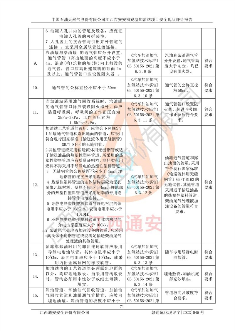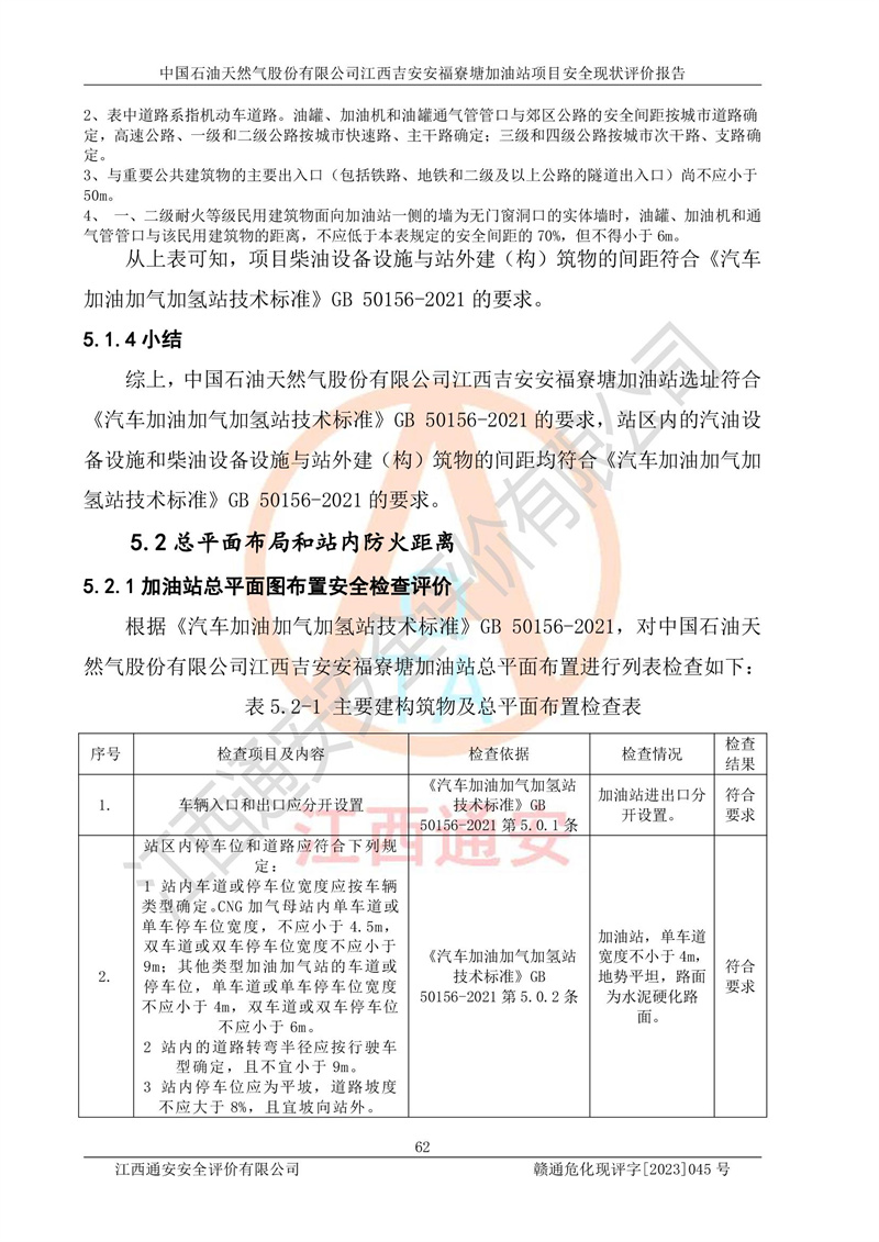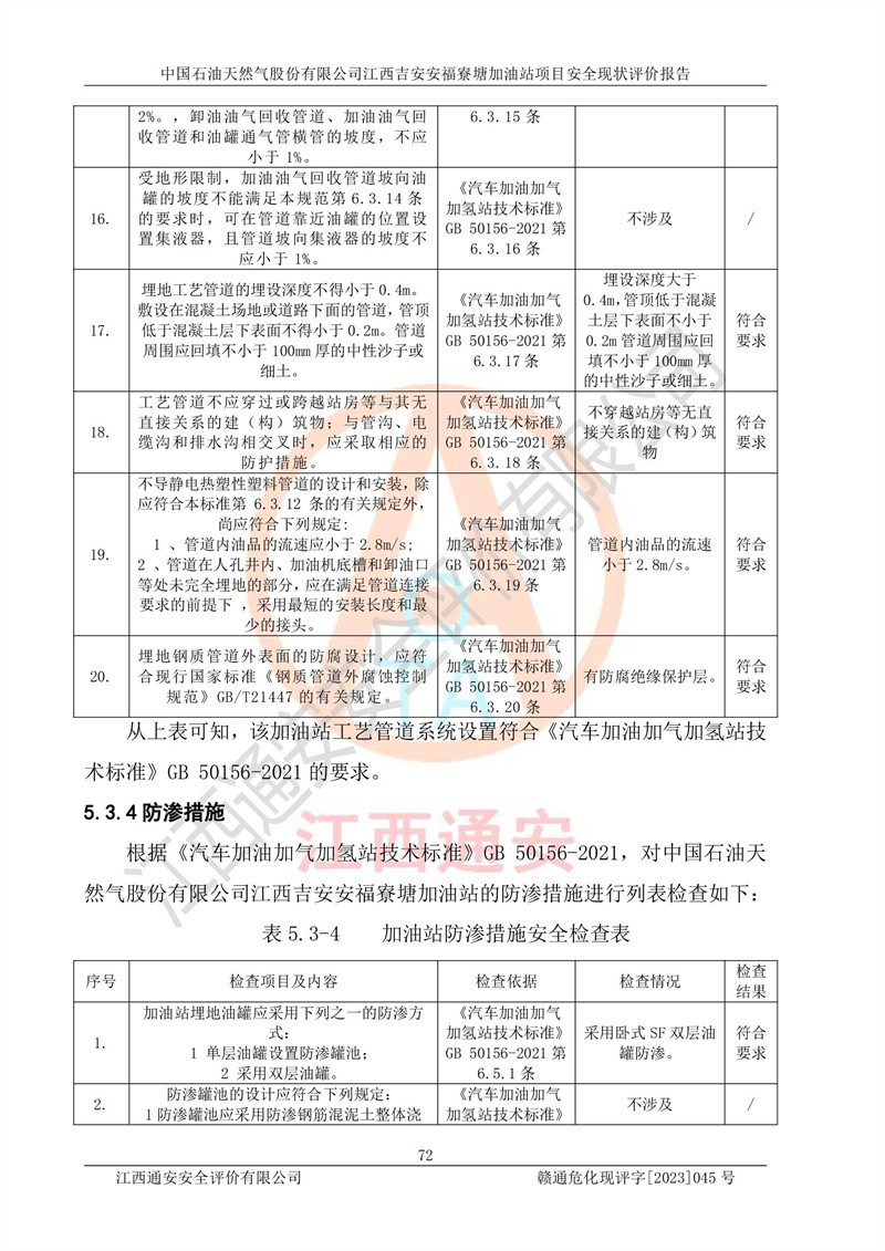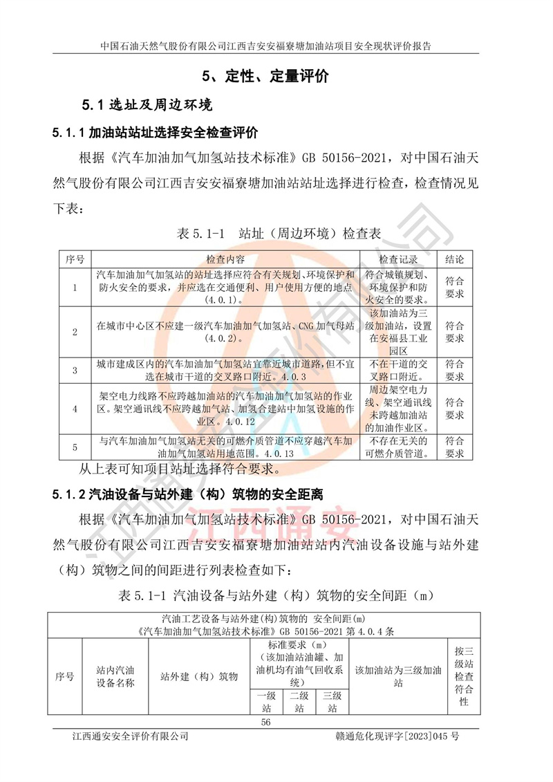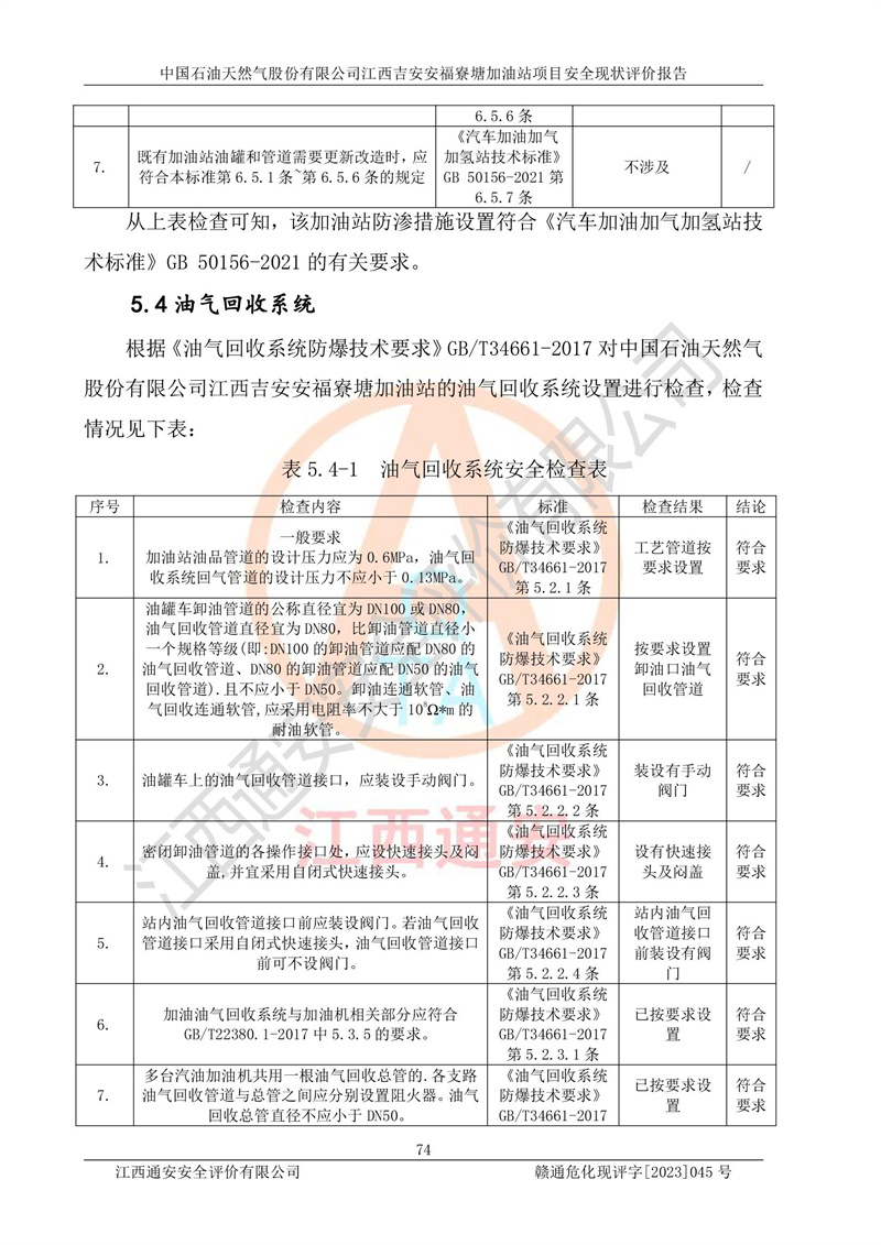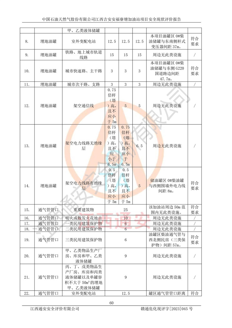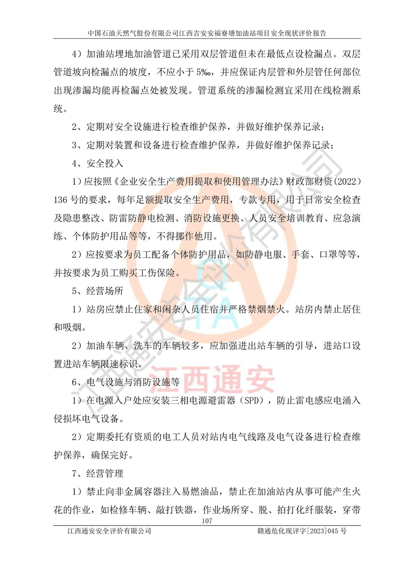 中國石油天然氣股份有限公司江西吉安安福寮塘加油站是一家從事成品油批發(fā)、成品油零售經(jīng)營的企業(yè)。該加油站成立于2011年5月4日,并獲得安??h市場監(jiān)督管理局頒發(fā)的營業(yè)執(zhí)照,營業(yè)執(zhí)照統(tǒng)一社會(huì)信用代碼為:91360829573618262D,加油站類型為股份有限公司分公司(上市,國有控股),負(fù)責(zé)人為鄢**,經(jīng)營范圍:許可項(xiàng)目:成品油批發(fā),成品油零售,住宿服務(wù),餐飲服務(wù),食品銷售,煙草制品零售,***零售,農(nóng)藥零售,藥品零售(依法須經(jīng)批準(zhǔn)的項(xiàng)目,經(jīng)相關(guān)部門批準(zhǔn)后在許可**期內(nèi)方可開展經(jīng)營活動(dòng),具體經(jīng)營項(xiàng)目和許可期限以相關(guān)部門批準(zhǔn)文件或許可證件為準(zhǔn))一般項(xiàng)目:潤滑油銷售,日用陶瓷制品銷售,汽車銷售,新能源汽車整車銷售,新能源汽車換電設(shè)施銷售,新能源汽車電附件銷售,互聯(lián)網(wǎng)銷售(除銷售需要許可的商品),汽車裝飾用品銷售,日用品銷售單用途商業(yè)預(yù)付卡代理銷售,日用化學(xué)產(chǎn)品銷售,勞動(dòng)保護(hù)用品銷售,家用電器銷售,塑料制品銷售,嬰幼兒配方乳粉及其他嬰幼兒配方食品銷售,食品用洗滌劑銷售,飼料添加劑銷售,肥料銷售,洗車服務(wù),農(nóng)副產(chǎn)品銷售,五金產(chǎn)品零售,辦公用品銷售,第二類醫(yī)療器械銷售,充電樁銷售農(nóng)作物種子經(jīng)營(**不再分裝的包裝種子),廣告設(shè)計(jì)代理,電子過磅服務(wù),化妝品零售,畜牧漁業(yè)飼料銷售消毒劑銷售 (不含危險(xiǎn)化學(xué)品),汽車零配件零售,電車銷售,機(jī)動(dòng)車修理和維護(hù),家具銷售,日用百貨銷售,集中式**充電站,針紡織品銷售,住房租賃 (除依法須經(jīng)批/準(zhǔn)的項(xiàng)目處,憑營業(yè)執(zhí)照依法自主開展經(jīng)營活動(dòng))。經(jīng)營場所:江西省吉安市安??h寮塘鄉(xiāng)龍佳村。 中國石油天然氣股份有限公司江西吉安安福寮塘加油站占地面積1200㎡,加油站中設(shè)有0#柴油雙槍加油機(jī)2臺(tái),92#汽油、95#汽油四槍加油機(jī)2臺(tái);該站設(shè)有4個(gè)30m3SF雙層埋地臥式儲(chǔ)罐,其中有2個(gè)30m3SF雙層埋地臥式0#柴油罐、1個(gè)92#30m3SF雙層埋地臥式汽油罐,1個(gè)95#30m3SF雙層埋地臥式汽油罐,油品折算總?cè)萘繛?/span>90m3(柴油罐容積折半計(jì)入油罐總?cè)莘e),屬三級加油站,汽油卸油、加油設(shè)置了油氣回收系統(tǒng)。 中國石油天然氣股份有限公司江西吉安安福寮塘加油站于2020年11月04日經(jīng)安??h應(yīng)急管理局核準(zhǔn),換發(fā)了新的《危險(xiǎn)化學(xué)品經(jīng)營許可證》,證書編號(hào):贛安安經(jīng)(甲)[2014]000007,許可經(jīng)營范圍:成品油。**期2020年11月04日至2023年11月03日。 中國石油天然氣股份有限公司江西吉安安福寮塘加油站2023年05月11日經(jīng)吉安市商務(wù)局核準(zhǔn),換取了新的《成品油零售經(jīng)營批準(zhǔn)證書》,證書編號(hào):油零售證書第吉0256號(hào),批準(zhǔn)從事成品油(汽油、柴油)零售業(yè)務(wù)。證書**期至2023年5月11日至2028年05月10日。 |