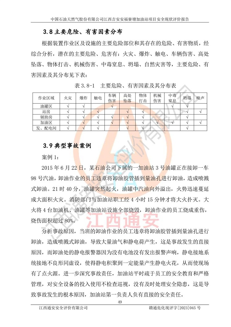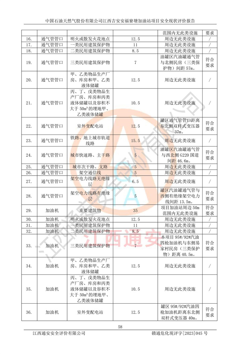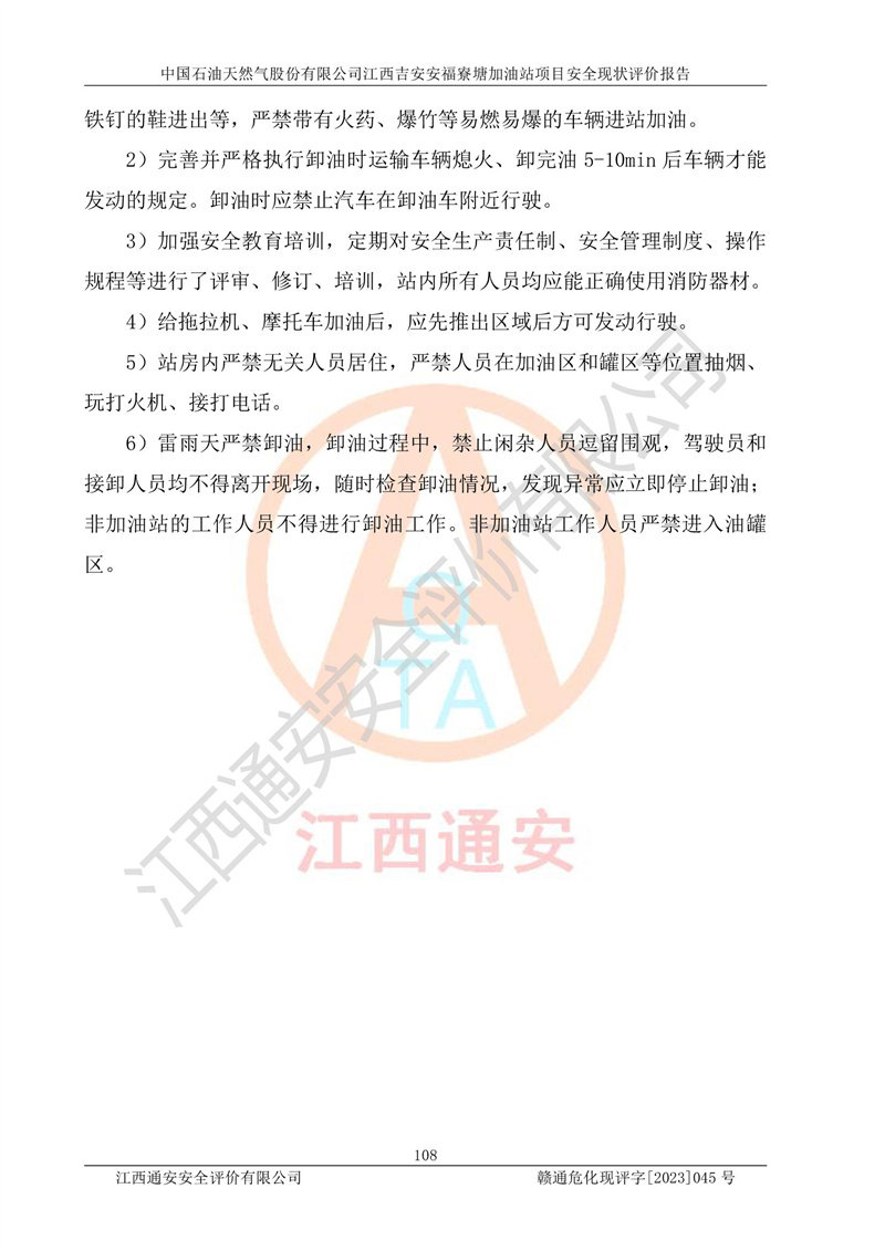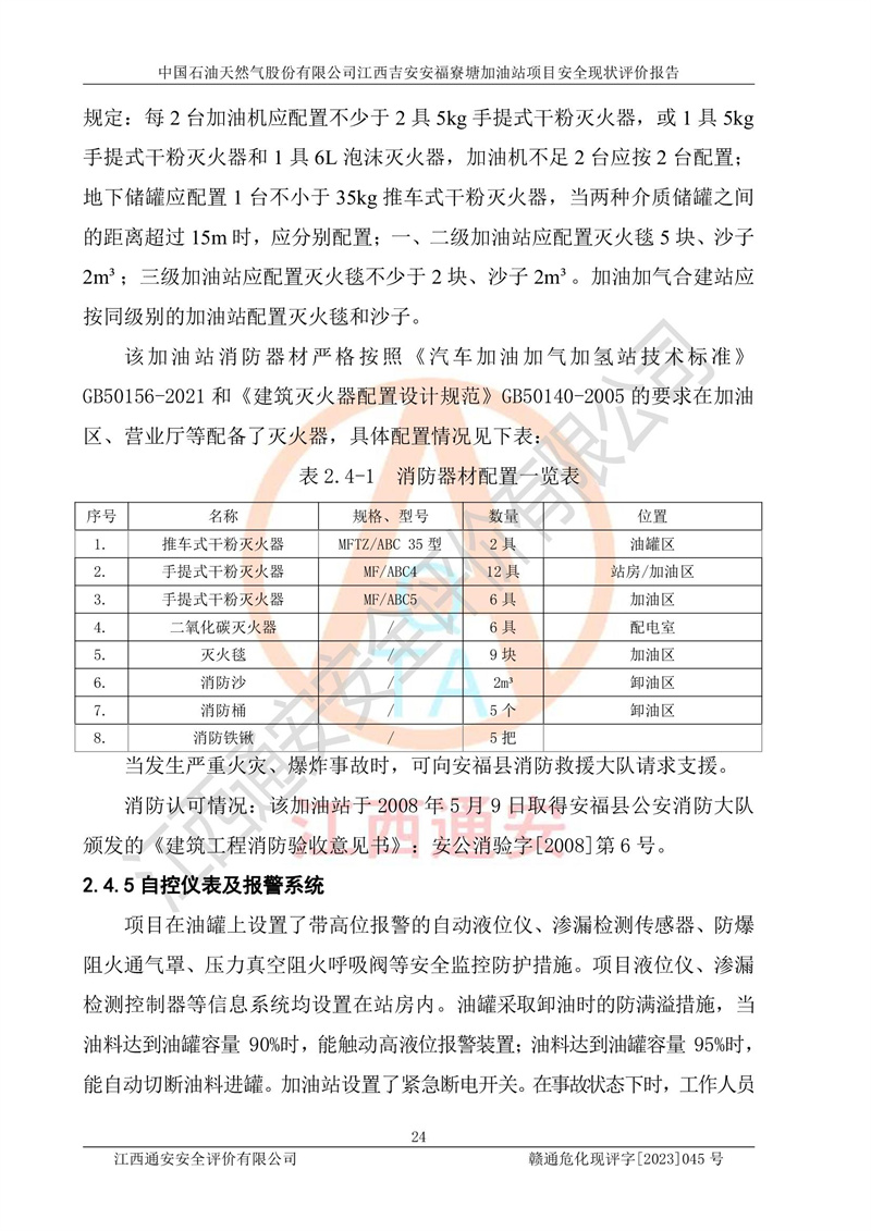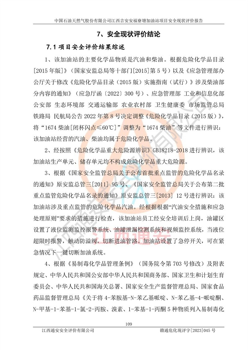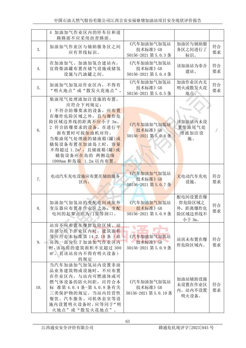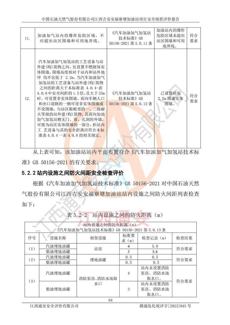 中國石油天然氣股份有限公司江西吉安安福寮塘加油站是一家從事成品油批發(fā)、成品油零售經(jīng)營的企業(yè)。該加油站成立于2011年5月4日,并獲得安??h市場監(jiān)督管理局頒發(fā)的營業(yè)執(zhí)照,營業(yè)執(zhí)照統(tǒng)一社會(huì)信用代碼為:91360829573618262D,加油站類型為股份有限公司分公司(上市,國有控股),負(fù)責(zé)人為鄢**,經(jīng)營范圍:許可項(xiàng)目:成品油批發(fā),成品油零售,住宿服務(wù),餐飲服務(wù),食品銷售,煙草制品零售,***零售,農(nóng)藥零售,藥品零售(依法須經(jīng)批準(zhǔn)的項(xiàng)目,經(jīng)相關(guān)部門批準(zhǔn)后在許可**期內(nèi)方可開展經(jīng)營活動(dòng),具體經(jīng)營項(xiàng)目和許可期限以相關(guān)部門批準(zhǔn)文件或許可證件為準(zhǔn))一般項(xiàng)目:潤滑油銷售,日用陶瓷制品銷售,汽車銷售,新能源汽車整車銷售,新能源汽車換電設(shè)施銷售,新能源汽車電附件銷售,互聯(lián)網(wǎng)銷售(除銷售需要許可的商品),汽車裝飾用品銷售,日用品銷售單用途商業(yè)預(yù)付卡代理銷售,日用化學(xué)產(chǎn)品銷售,勞動(dòng)保護(hù)用品銷售,家用電器銷售,塑料制品銷售,嬰幼兒配方乳粉及其他嬰幼兒配方食品銷售,食品用洗滌劑銷售,飼料添加劑銷售,肥料銷售,洗車服務(wù),農(nóng)副產(chǎn)品銷售,五金產(chǎn)品零售,辦公用品銷售,第二類醫(yī)療器械銷售,充電樁銷售農(nóng)作物種子經(jīng)營(**不再分裝的包裝種子),廣告設(shè)計(jì)代理,電子過磅服務(wù),化妝品零售,畜牧漁業(yè)飼料銷售消毒劑銷售 (不含危險(xiǎn)化學(xué)品),汽車零配件零售,電車銷售,機(jī)動(dòng)車修理和維護(hù),家具銷售,日用百貨銷售,集中式**充電站,針紡織品銷售,住房租賃 (除依法須經(jīng)批/準(zhǔn)的項(xiàng)目處,憑營業(yè)執(zhí)照依法自主開展經(jīng)營活動(dòng))。經(jīng)營場所:江西省吉安市安??h寮塘鄉(xiāng)龍佳村。 中國石油天然氣股份有限公司江西吉安安福寮塘加油站占地面積1200㎡,加油站中設(shè)有0#柴油雙槍加油機(jī)2臺(tái),92#汽油、95#汽油四槍加油機(jī)2臺(tái);該站設(shè)有4個(gè)30m3SF雙層埋地臥式儲(chǔ)罐,其中有2個(gè)30m3SF雙層埋地臥式0#柴油罐、1個(gè)92#30m3SF雙層埋地臥式汽油罐,1個(gè)95#30m3SF雙層埋地臥式汽油罐,油品折算總?cè)萘繛?/span>90m3(柴油罐容積折半計(jì)入油罐總?cè)莘e),屬三級加油站,汽油卸油、加油設(shè)置了油氣回收系統(tǒng)。 中國石油天然氣股份有限公司江西吉安安福寮塘加油站于2020年11月04日經(jīng)安??h應(yīng)急管理局核準(zhǔn),換發(fā)了新的《危險(xiǎn)化學(xué)品經(jīng)營許可證》,證書編號(hào):贛安安經(jīng)(甲)[2014]000007,許可經(jīng)營范圍:成品油。**期2020年11月04日至2023年11月03日。 中國石油天然氣股份有限公司江西吉安安福寮塘加油站2023年05月11日經(jīng)吉安市商務(wù)局核準(zhǔn),換取了新的《成品油零售經(jīng)營批準(zhǔn)證書》,證書編號(hào):油零售證書第吉0256號(hào),批準(zhǔn)從事成品油(汽油、柴油)零售業(yè)務(wù)。證書**期至2023年5月11日至2028年05月10日。 |