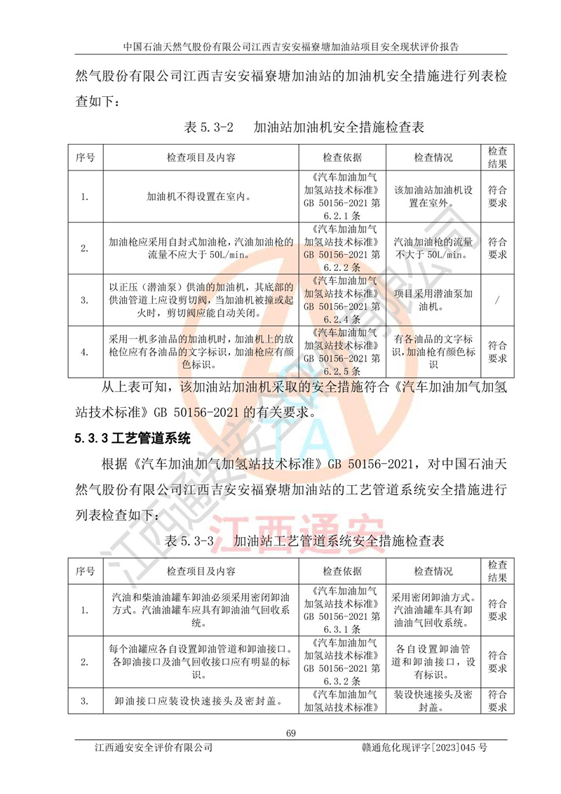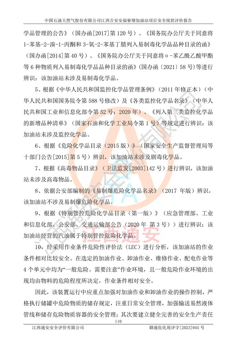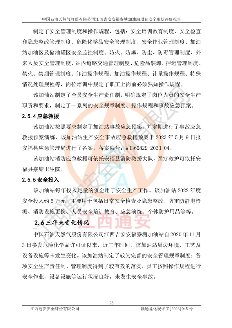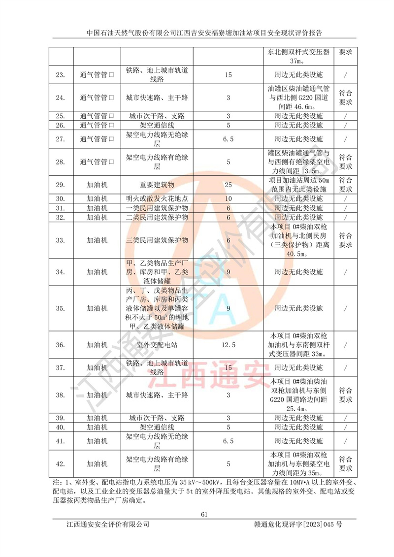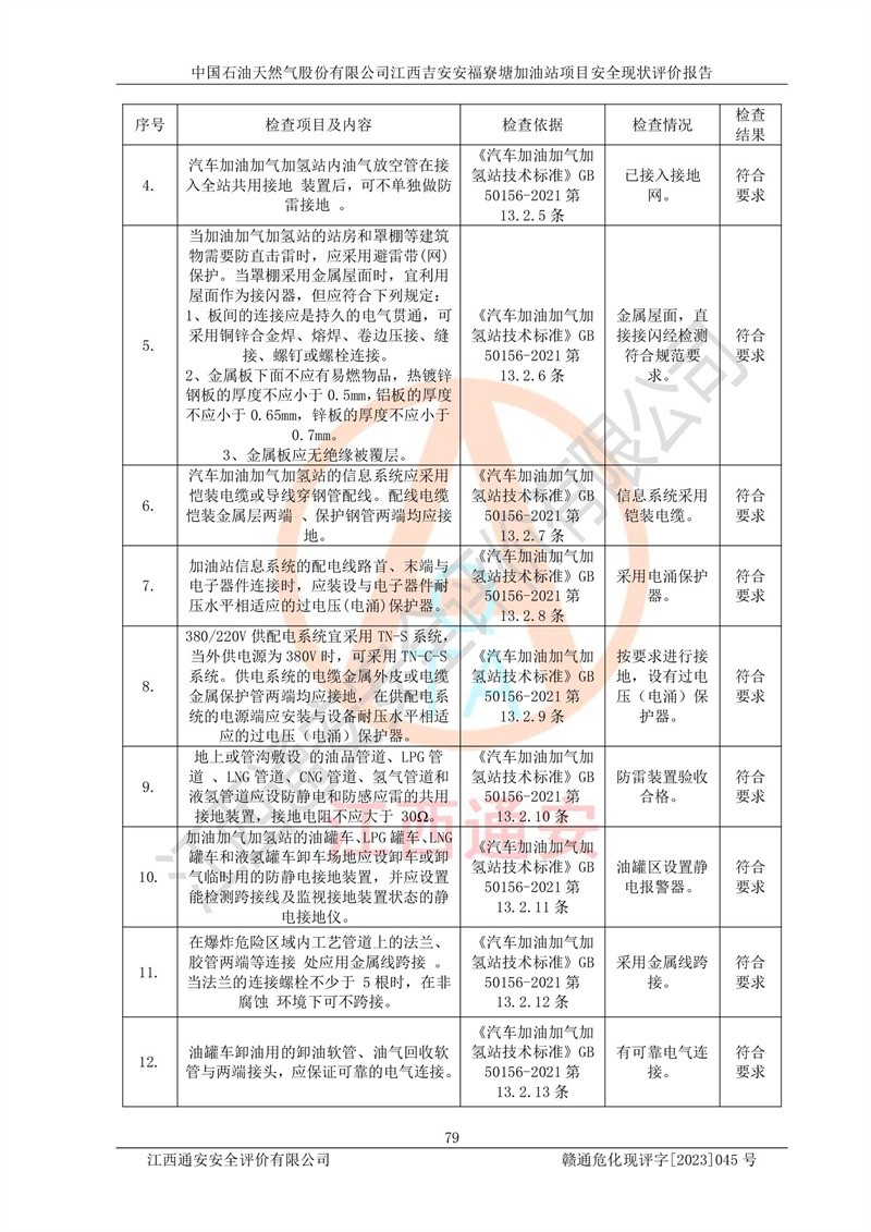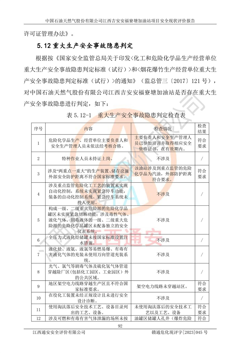 中國石油天然氣股份有限公司江西吉安安福寮塘加油站是一家從事成品油批發(fā)、成品油零售經(jīng)營的企業(yè)。該加油站成立于2011年5月4日,并獲得安??h市場監(jiān)督管理局頒發(fā)的營業(yè)執(zhí)照,營業(yè)執(zhí)照統(tǒng)一社會(huì)信用代碼為:91360829573618262D,加油站類型為股份有限公司分公司(上市,國有控股),負(fù)責(zé)人為鄢**,經(jīng)營范圍:許可項(xiàng)目:成品油批發(fā),成品油零售,住宿服務(wù),餐飲服務(wù),食品銷售,煙草制品零售,***零售,農(nóng)藥零售,藥品零售(依法須經(jīng)批準(zhǔn)的項(xiàng)目,經(jīng)相關(guān)部門批準(zhǔn)后在許可**期內(nèi)方可開展經(jīng)營活動(dòng),具體經(jīng)營項(xiàng)目和許可期限以相關(guān)部門批準(zhǔn)文件或許可證件為準(zhǔn))一般項(xiàng)目:潤滑油銷售,日用陶瓷制品銷售,汽車銷售,新能源汽車整車銷售,新能源汽車換電設(shè)施銷售,新能源汽車電附件銷售,互聯(lián)網(wǎng)銷售(除銷售需要許可的商品),汽車裝飾用品銷售,日用品銷售單用途商業(yè)預(yù)付卡代理銷售,日用化學(xué)產(chǎn)品銷售,勞動(dòng)保護(hù)用品銷售,家用電器銷售,塑料制品銷售,嬰幼兒配方乳粉及其他嬰幼兒配方食品銷售,食品用洗滌劑銷售,飼料添加劑銷售,肥料銷售,洗車服務(wù),農(nóng)副產(chǎn)品銷售,五金產(chǎn)品零售,辦公用品銷售,第二類醫(yī)療器械銷售,充電樁銷售農(nóng)作物種子經(jīng)營(**不再分裝的包裝種子),廣告設(shè)計(jì)代理,電子過磅服務(wù),化妝品零售,畜牧漁業(yè)飼料銷售消毒劑銷售 (不含危險(xiǎn)化學(xué)品),汽車零配件零售,電車銷售,機(jī)動(dòng)車修理和維護(hù),家具銷售,日用百貨銷售,集中式**充電站,針紡織品銷售,住房租賃 (除依法須經(jīng)批/準(zhǔn)的項(xiàng)目處,憑營業(yè)執(zhí)照依法自主開展經(jīng)營活動(dòng))。經(jīng)營場所:江西省吉安市安??h寮塘鄉(xiāng)龍佳村。 中國石油天然氣股份有限公司江西吉安安福寮塘加油站占地面積1200㎡,加油站中設(shè)有0#柴油雙槍加油機(jī)2臺(tái),92#汽油、95#汽油四槍加油機(jī)2臺(tái);該站設(shè)有4個(gè)30m3SF雙層埋地臥式儲(chǔ)罐,其中有2個(gè)30m3SF雙層埋地臥式0#柴油罐、1個(gè)92#30m3SF雙層埋地臥式汽油罐,1個(gè)95#30m3SF雙層埋地臥式汽油罐,油品折算總?cè)萘繛?/span>90m3(柴油罐容積折半計(jì)入油罐總?cè)莘e),屬三級加油站,汽油卸油、加油設(shè)置了油氣回收系統(tǒng)。 中國石油天然氣股份有限公司江西吉安安福寮塘加油站于2020年11月04日經(jīng)安??h應(yīng)急管理局核準(zhǔn),換發(fā)了新的《危險(xiǎn)化學(xué)品經(jīng)營許可證》,證書編號(hào):贛安安經(jīng)(甲)[2014]000007,許可經(jīng)營范圍:成品油。**期2020年11月04日至2023年11月03日。 中國石油天然氣股份有限公司江西吉安安福寮塘加油站2023年05月11日經(jīng)吉安市商務(wù)局核準(zhǔn),換取了新的《成品油零售經(jīng)營批準(zhǔn)證書》,證書編號(hào):油零售證書第吉0256號(hào),批準(zhǔn)從事成品油(汽油、柴油)零售業(yè)務(wù)。證書**期至2023年5月11日至2028年05月10日。 |