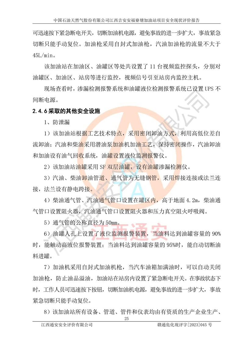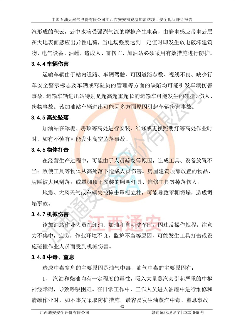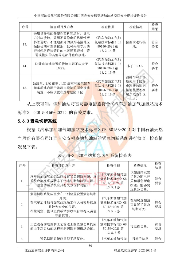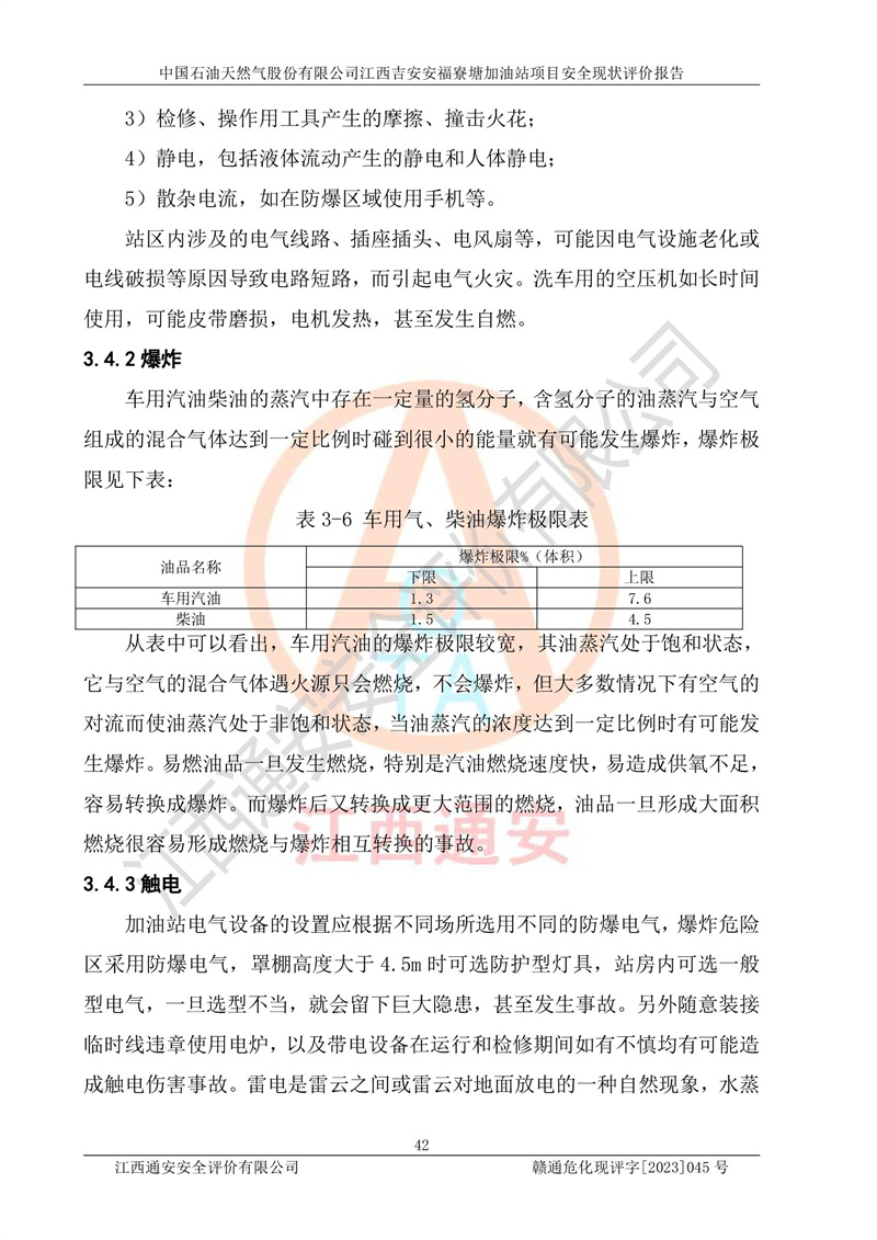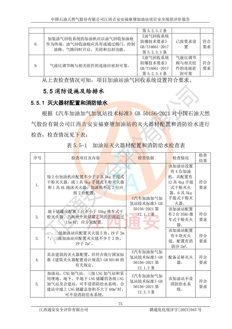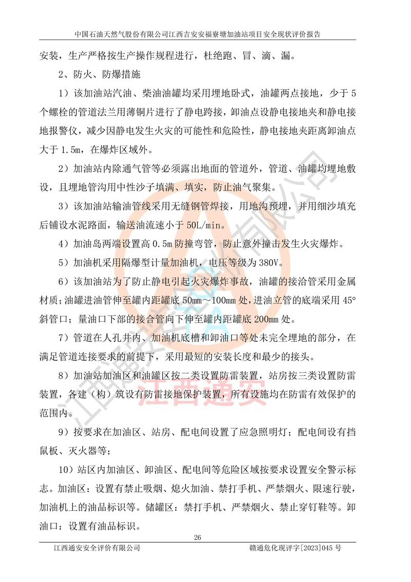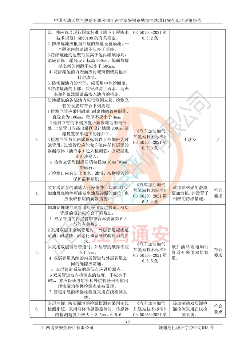 中國石油天然氣股份有限公司江西吉安安福寮塘加油站是一家從事成品油批發(fā)、成品油零售經(jīng)營的企業(yè)。該加油站成立于2011年5月4日,并獲得安??h市場監(jiān)督管理局頒發(fā)的營業(yè)執(zhí)照,營業(yè)執(zhí)照統(tǒng)一社會(huì)信用代碼為:91360829573618262D,加油站類型為股份有限公司分公司(上市,國有控股),負(fù)責(zé)人為鄢**,經(jīng)營范圍:許可項(xiàng)目:成品油批發(fā),成品油零售,住宿服務(wù),餐飲服務(wù),食品銷售,煙草制品零售,***零售,農(nóng)藥零售,藥品零售(依法須經(jīng)批準(zhǔn)的項(xiàng)目,經(jīng)相關(guān)部門批準(zhǔn)后在許可**期內(nèi)方可開展經(jīng)營活動(dòng),具體經(jīng)營項(xiàng)目和許可期限以相關(guān)部門批準(zhǔn)文件或許可證件為準(zhǔn))一般項(xiàng)目:潤滑油銷售,日用陶瓷制品銷售,汽車銷售,新能源汽車整車銷售,新能源汽車換電設(shè)施銷售,新能源汽車電附件銷售,互聯(lián)網(wǎng)銷售(除銷售需要許可的商品),汽車裝飾用品銷售,日用品銷售單用途商業(yè)預(yù)付卡代理銷售,日用化學(xué)產(chǎn)品銷售,勞動(dòng)保護(hù)用品銷售,家用電器銷售,塑料制品銷售,嬰幼兒配方乳粉及其他嬰幼兒配方食品銷售,食品用洗滌劑銷售,飼料添加劑銷售,肥料銷售,洗車服務(wù),農(nóng)副產(chǎn)品銷售,五金產(chǎn)品零售,辦公用品銷售,第二類醫(yī)療器械銷售,充電樁銷售農(nóng)作物種子經(jīng)營(**不再分裝的包裝種子),廣告設(shè)計(jì)代理,電子過磅服務(wù),化妝品零售,畜牧漁業(yè)飼料銷售消毒劑銷售 (不含危險(xiǎn)化學(xué)品),汽車零配件零售,電車銷售,機(jī)動(dòng)車修理和維護(hù),家具銷售,日用百貨銷售,集中式**充電站,針紡織品銷售,住房租賃 (除依法須經(jīng)批/準(zhǔn)的項(xiàng)目處,憑營業(yè)執(zhí)照依法自主開展經(jīng)營活動(dòng))。經(jīng)營場所:江西省吉安市安??h寮塘鄉(xiāng)龍佳村。 中國石油天然氣股份有限公司江西吉安安福寮塘加油站占地面積1200㎡,加油站中設(shè)有0#柴油雙槍加油機(jī)2臺(tái),92#汽油、95#汽油四槍加油機(jī)2臺(tái);該站設(shè)有4個(gè)30m3SF雙層埋地臥式儲(chǔ)罐,其中有2個(gè)30m3SF雙層埋地臥式0#柴油罐、1個(gè)92#30m3SF雙層埋地臥式汽油罐,1個(gè)95#30m3SF雙層埋地臥式汽油罐,油品折算總?cè)萘繛?/span>90m3(柴油罐容積折半計(jì)入油罐總?cè)莘e),屬三級加油站,汽油卸油、加油設(shè)置了油氣回收系統(tǒng)。 中國石油天然氣股份有限公司江西吉安安福寮塘加油站于2020年11月04日經(jīng)安??h應(yīng)急管理局核準(zhǔn),換發(fā)了新的《危險(xiǎn)化學(xué)品經(jīng)營許可證》,證書編號(hào):贛安安經(jīng)(甲)[2014]000007,許可經(jīng)營范圍:成品油。**期2020年11月04日至2023年11月03日。 中國石油天然氣股份有限公司江西吉安安福寮塘加油站2023年05月11日經(jīng)吉安市商務(wù)局核準(zhǔn),換取了新的《成品油零售經(jīng)營批準(zhǔn)證書》,證書編號(hào):油零售證書第吉0256號(hào),批準(zhǔn)從事成品油(汽油、柴油)零售業(yè)務(wù)。證書**期至2023年5月11日至2028年05月10日。 |
