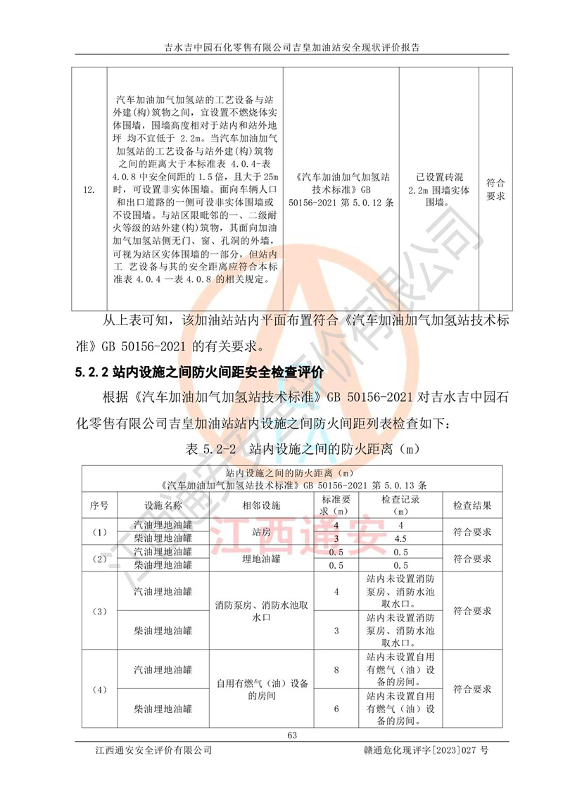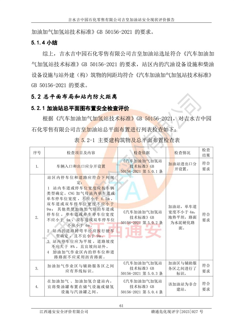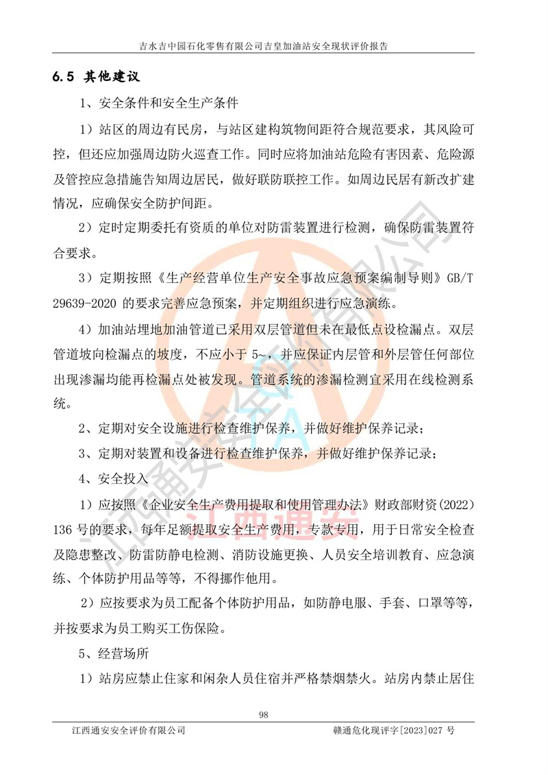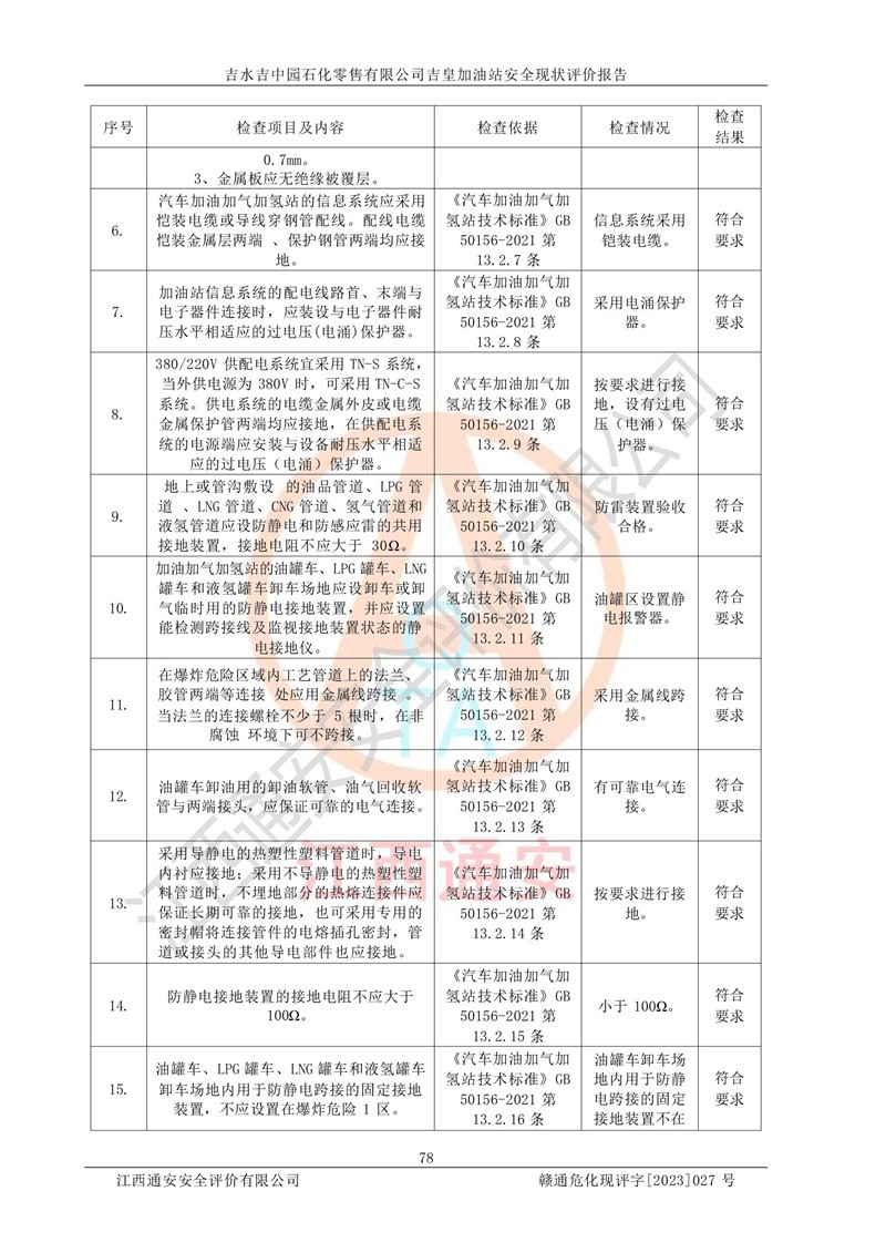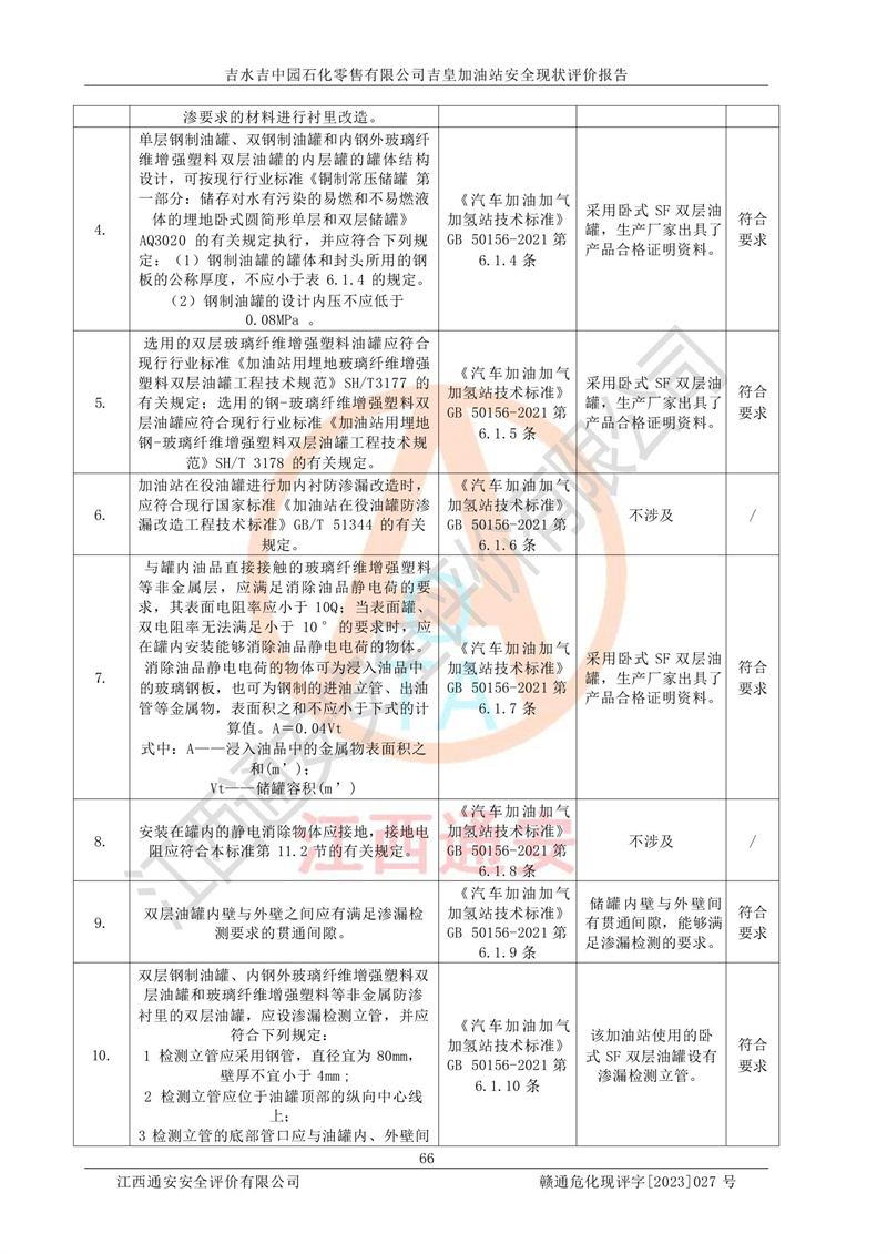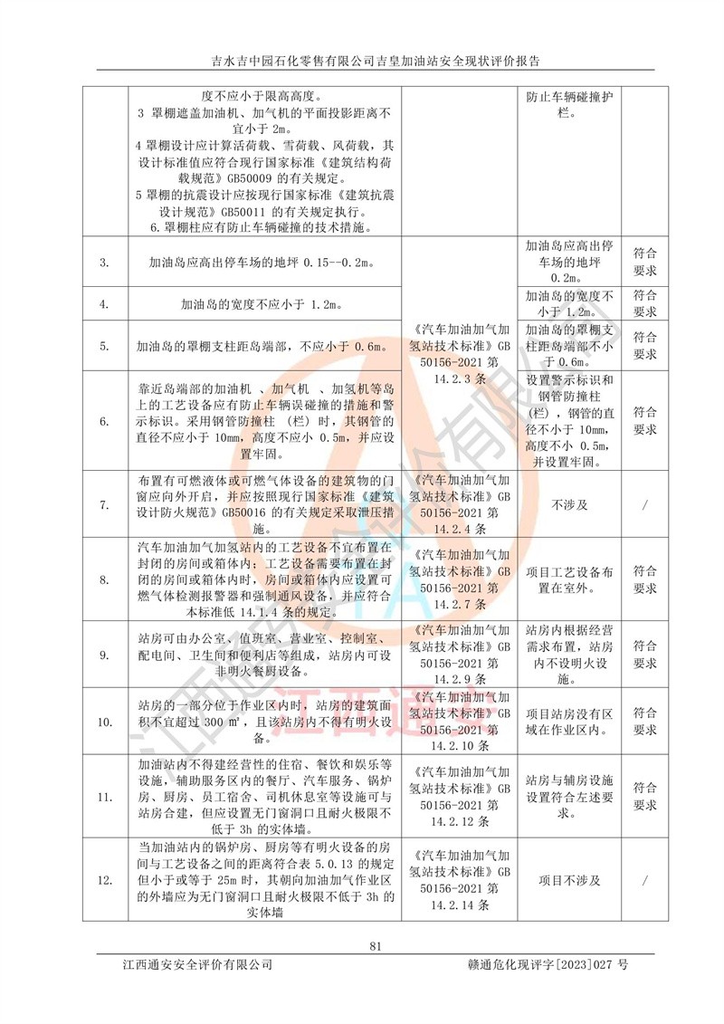 綜上:吉水吉中園石化零售有限公司吉皇加油站符合《汽車加油加氣加氫站技術(shù)標準》GB50156-2021等標準規(guī)范的要求,安全風險可控,滿足危險化學(xué)品經(jīng)營的安全條件。
