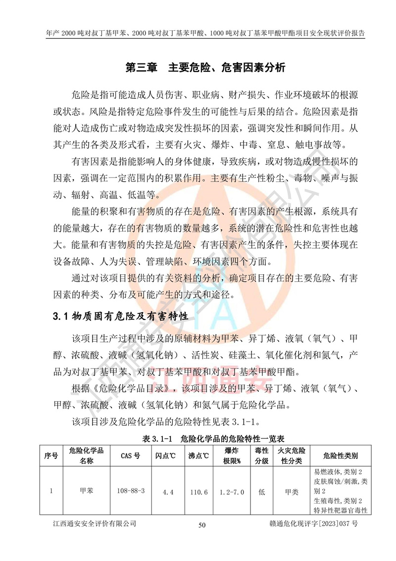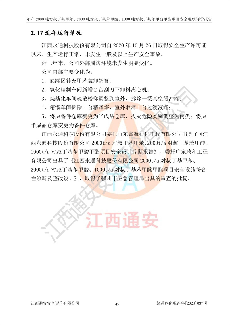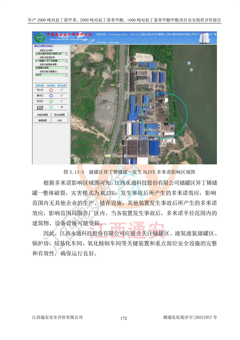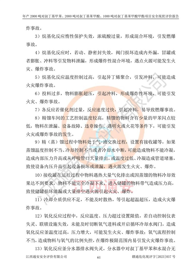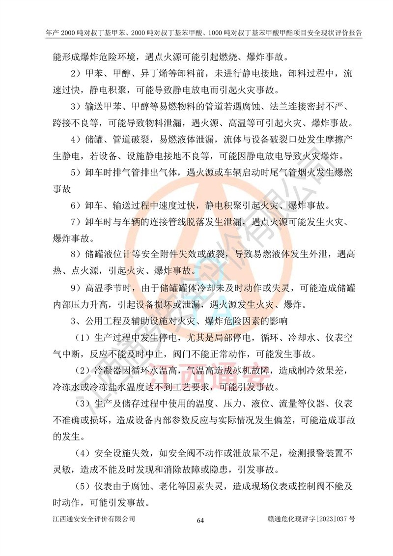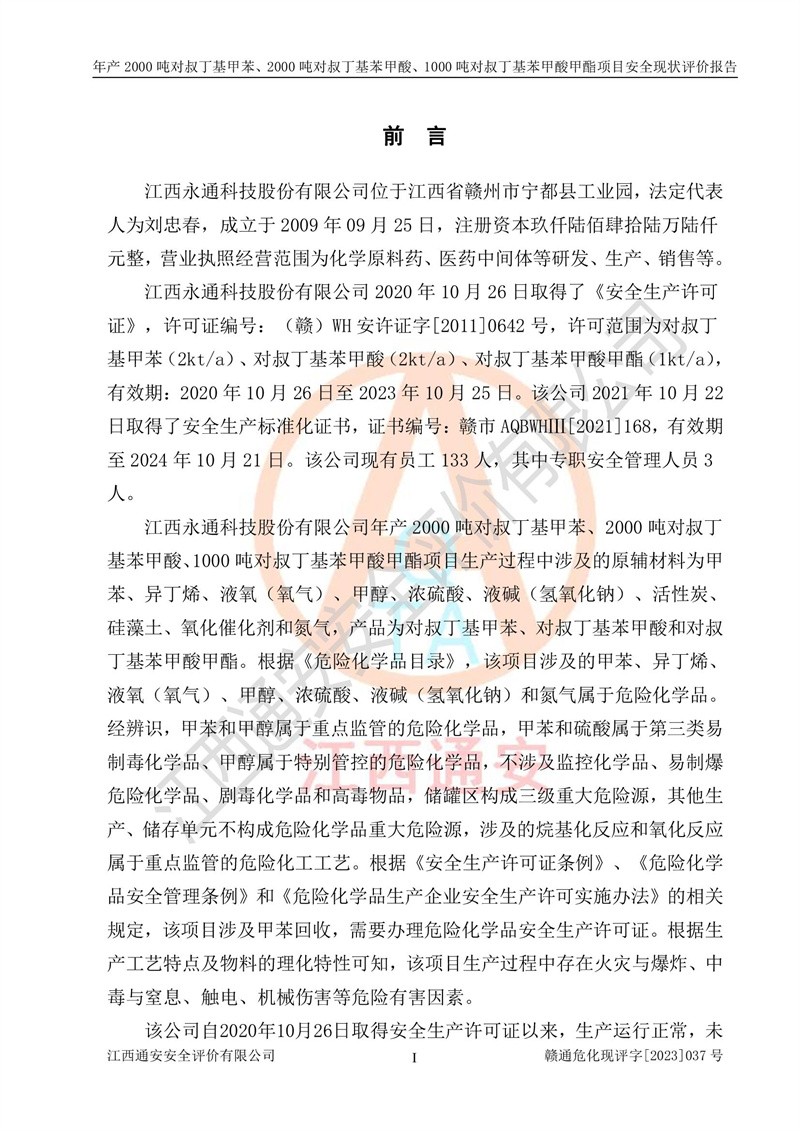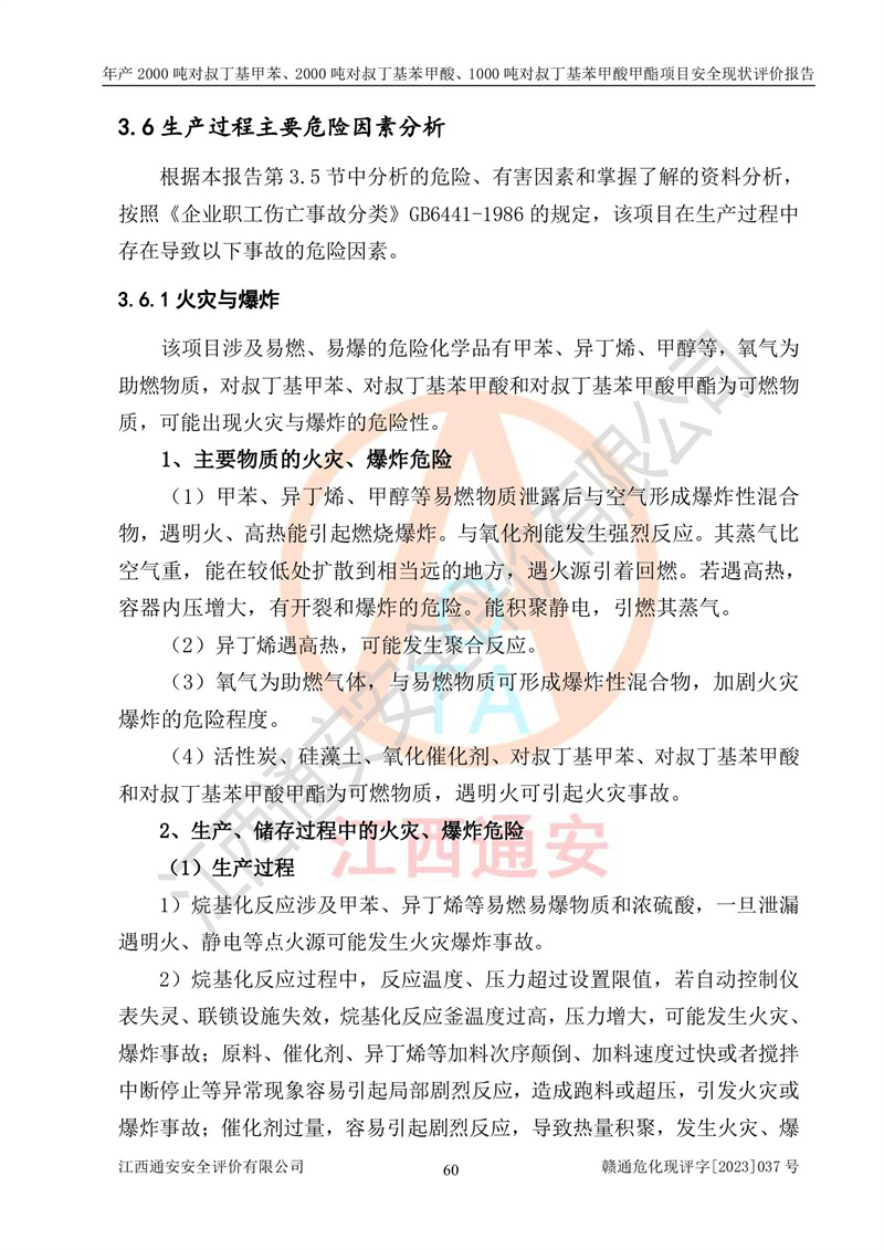 江西永通科技股份有限公司位于江西省贛州市寧都縣工業(yè)園,法定**人為劉忠春,成立于2009年09月25日,注冊資本玖仟陸佰肆拾陸萬陸仟元整,營業(yè)執(zhí)照經(jīng)營范圍為化學(xué)原料藥、醫(yī)藥中間體等研發(fā)、生產(chǎn)、銷售等。 江西永通科技股份有限公司2020年10月26日取得了《安全生產(chǎn)許可證》,許可證編號:(贛)WH安許證字[2011]0642號,許可范圍為對叔丁基甲苯(2kt/a)、對叔丁基苯甲酸(2kt/a)、對叔丁基苯甲酸甲酯(1kt/a),**期:2020年10月26日至2023年10月25日。該公司2021年10月22日取得了安全生產(chǎn)標(biāo)準(zhǔn)化證書,證書編號:贛市AQBWHⅢ[2021]168,**期至2024年10月21日。該公司現(xiàn)有員工133人,其中專職安全管理人員3人。 江西永通科技股份有限公司年產(chǎn)2000噸對叔丁基甲苯、2000噸對叔丁基苯甲酸、1000噸對叔丁基苯甲酸甲酯項(xiàng)目生產(chǎn)過程中涉及的原輔材料為甲苯、異丁烯、液氧(氧氣)、甲醇、濃硫酸、液堿(氫氧化鈉)、活性炭、硅藻土、氧化催化劑和氮?dú)?,產(chǎn)品為對叔丁基甲苯、對叔丁基苯甲酸和對叔丁基苯甲酸甲酯。根據(jù)《危險(xiǎn)化學(xué)品目錄》,該項(xiàng)目涉及的甲苯、異丁烯、液氧(氧氣)、甲醇、濃硫酸、液堿(氫氧化鈉)和氮?dú)鈱儆?/span>危險(xiǎn)化學(xué)品。經(jīng)辨識,甲苯和甲醇屬于重點(diǎn)監(jiān)管的危險(xiǎn)化學(xué)品,甲苯和硫酸屬于第三類易制毒化學(xué)品、甲醇屬于特別管控的危險(xiǎn)化學(xué)品,不涉及監(jiān)控化學(xué)品、易制爆危險(xiǎn)化學(xué)品、劇毒化學(xué)品和高毒物品,儲罐區(qū)構(gòu)成三級重大危險(xiǎn)源,其他生產(chǎn)、儲存單元不構(gòu)成危險(xiǎn)化學(xué)品重大危險(xiǎn)源,涉及的烷基化反應(yīng)和氧化反應(yīng)屬于重點(diǎn)監(jiān)管的危險(xiǎn)化工工藝。根據(jù)《安全生產(chǎn)許可證條例》、《危險(xiǎn)化學(xué)品安全管理?xiàng)l例》和《危險(xiǎn)化學(xué)品生產(chǎn)企業(yè)安全生產(chǎn)許可實(shí)施辦法》的相關(guān)規(guī)定,該項(xiàng)目涉及甲苯回收,需要辦理危險(xiǎn)化學(xué)品安全生產(chǎn)許可證。根據(jù)生產(chǎn)工藝特點(diǎn)及物料的理化特性可知,該項(xiàng)目生產(chǎn)過程中存在火災(zāi)與爆炸、中毒與窒息、觸電、機(jī)械傷害等危險(xiǎn)有害因素。 該公司自2020年10月26日取得安全生產(chǎn)許可證以來,生產(chǎn)運(yùn)行正常,未發(fā)生一般及以上生產(chǎn)安全事故。 |