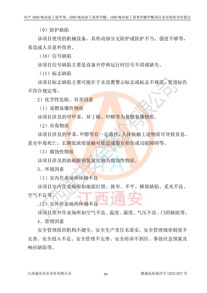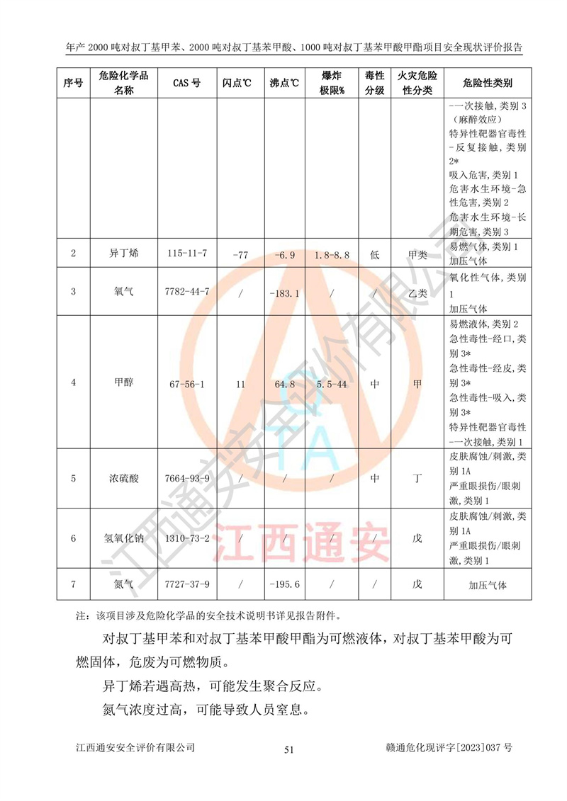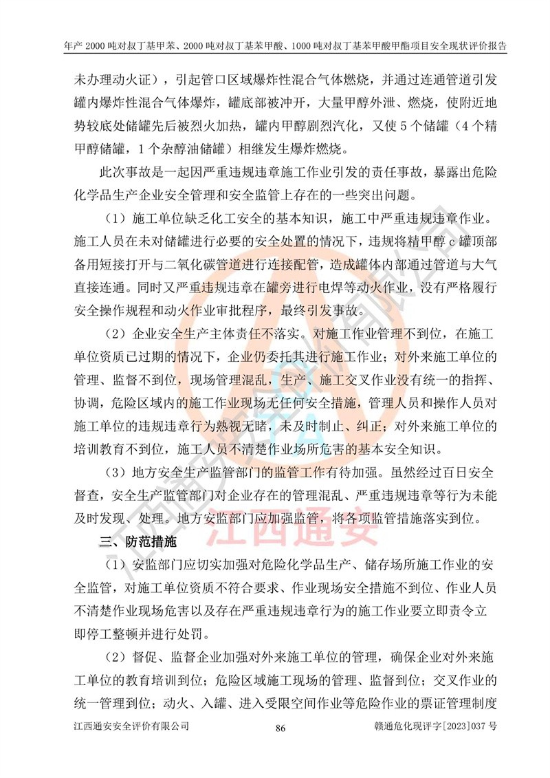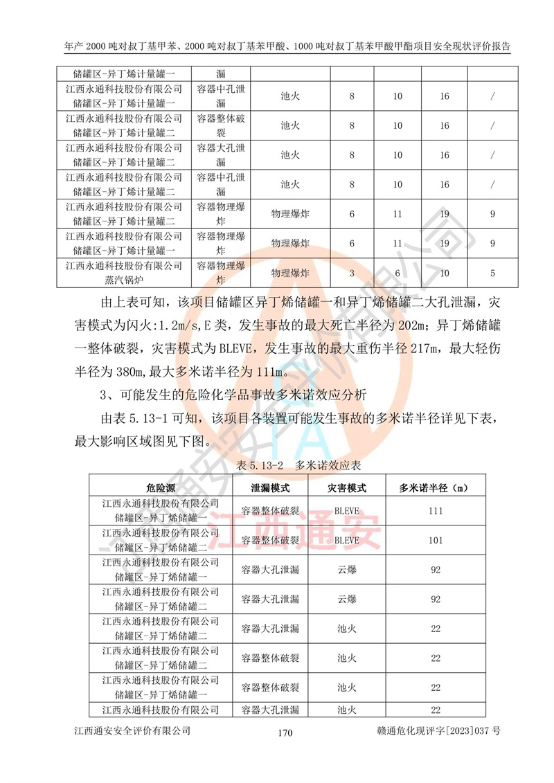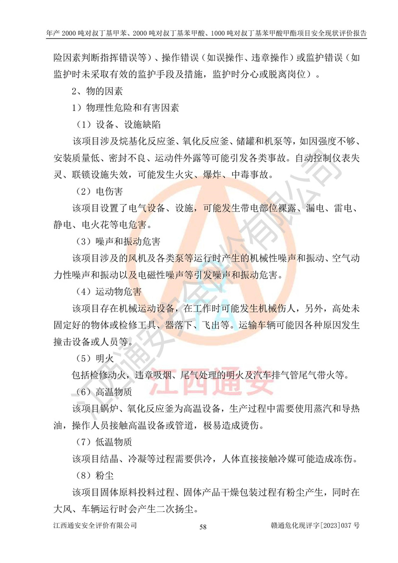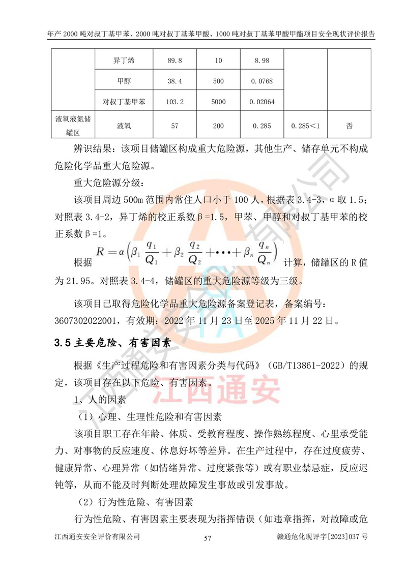 江西永通科技股份有限公司位于江西省贛州市寧都縣工業(yè)園,法定**人為劉忠春,成立于2009年09月25日,注冊資本玖仟陸佰肆拾陸萬陸仟元整,營業(yè)執(zhí)照經(jīng)營范圍為化學(xué)原料藥、醫(yī)藥中間體等研發(fā)、生產(chǎn)、銷售等。 江西永通科技股份有限公司2020年10月26日取得了《安全生產(chǎn)許可證》,許可證編號:(贛)WH安許證字[2011]0642號,許可范圍為對叔丁基甲苯(2kt/a)、對叔丁基苯甲酸(2kt/a)、對叔丁基苯甲酸甲酯(1kt/a),**期:2020年10月26日至2023年10月25日。該公司2021年10月22日取得了安全生產(chǎn)標(biāo)準(zhǔn)化證書,證書編號:贛市AQBWHⅢ[2021]168,**期至2024年10月21日。該公司現(xiàn)有員工133人,其中專職安全管理人員3人。 江西永通科技股份有限公司年產(chǎn)2000噸對叔丁基甲苯、2000噸對叔丁基苯甲酸、1000噸對叔丁基苯甲酸甲酯項(xiàng)目生產(chǎn)過程中涉及的原輔材料為甲苯、異丁烯、液氧(氧氣)、甲醇、濃硫酸、液堿(氫氧化鈉)、活性炭、硅藻土、氧化催化劑和氮?dú)?,產(chǎn)品為對叔丁基甲苯、對叔丁基苯甲酸和對叔丁基苯甲酸甲酯。根據(jù)《危險(xiǎn)化學(xué)品目錄》,該項(xiàng)目涉及的甲苯、異丁烯、液氧(氧氣)、甲醇、濃硫酸、液堿(氫氧化鈉)和氮?dú)鈱儆?/span>危險(xiǎn)化學(xué)品。經(jīng)辨識,甲苯和甲醇屬于重點(diǎn)監(jiān)管的危險(xiǎn)化學(xué)品,甲苯和硫酸屬于第三類易制毒化學(xué)品、甲醇屬于特別管控的危險(xiǎn)化學(xué)品,不涉及監(jiān)控化學(xué)品、易制爆危險(xiǎn)化學(xué)品、劇毒化學(xué)品和高毒物品,儲罐區(qū)構(gòu)成三級重大危險(xiǎn)源,其他生產(chǎn)、儲存單元不構(gòu)成危險(xiǎn)化學(xué)品重大危險(xiǎn)源,涉及的烷基化反應(yīng)和氧化反應(yīng)屬于重點(diǎn)監(jiān)管的危險(xiǎn)化工工藝。根據(jù)《安全生產(chǎn)許可證條例》、《危險(xiǎn)化學(xué)品安全管理?xiàng)l例》和《危險(xiǎn)化學(xué)品生產(chǎn)企業(yè)安全生產(chǎn)許可實(shí)施辦法》的相關(guān)規(guī)定,該項(xiàng)目涉及甲苯回收,需要辦理危險(xiǎn)化學(xué)品安全生產(chǎn)許可證。根據(jù)生產(chǎn)工藝特點(diǎn)及物料的理化特性可知,該項(xiàng)目生產(chǎn)過程中存在火災(zāi)與爆炸、中毒與窒息、觸電、機(jī)械傷害等危險(xiǎn)有害因素。 該公司自2020年10月26日取得安全生產(chǎn)許可證以來,生產(chǎn)運(yùn)行正常,未發(fā)生一般及以上生產(chǎn)安全事故。 |
