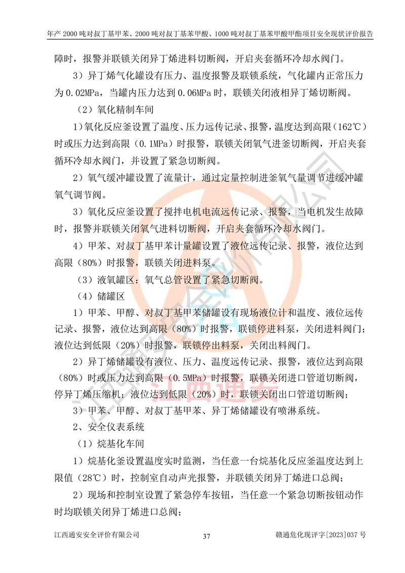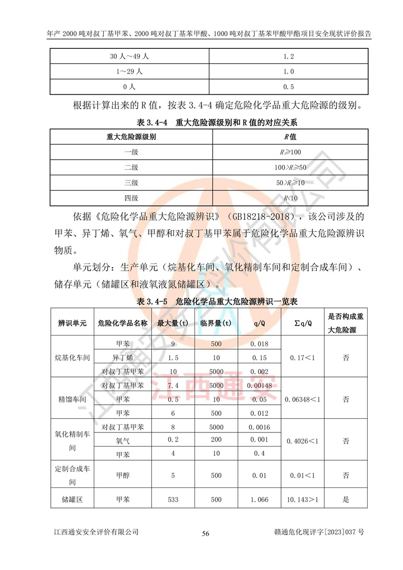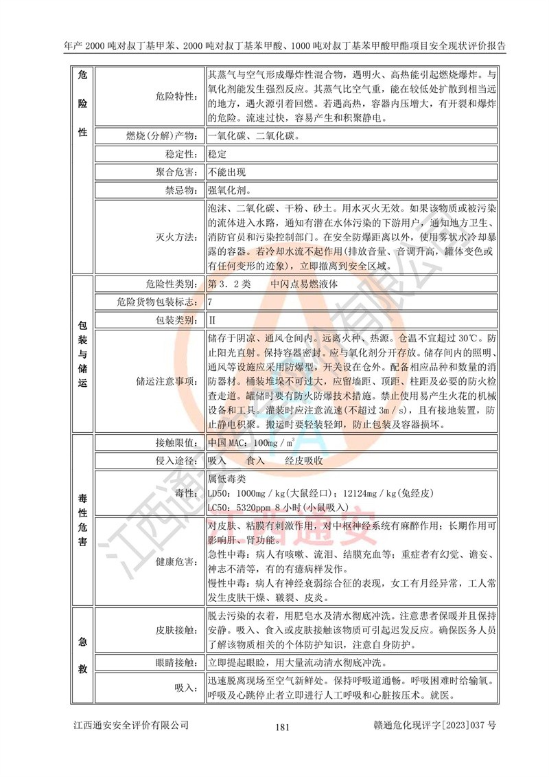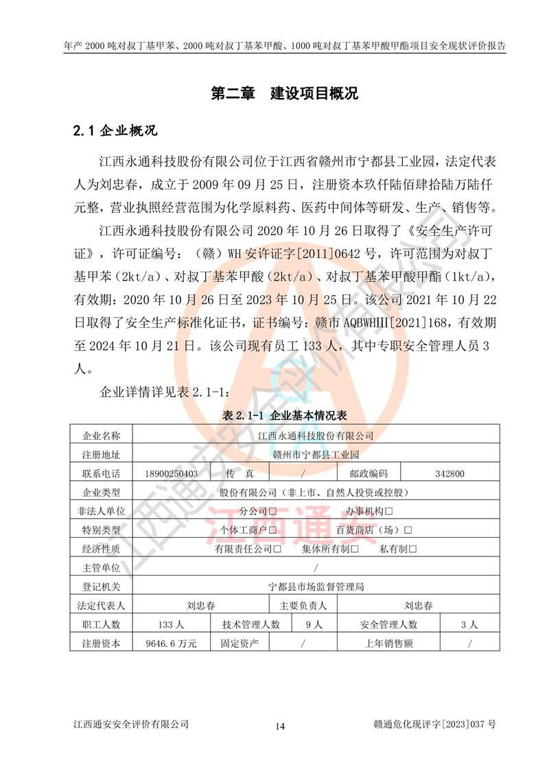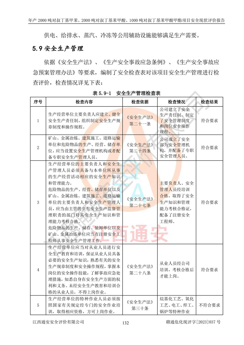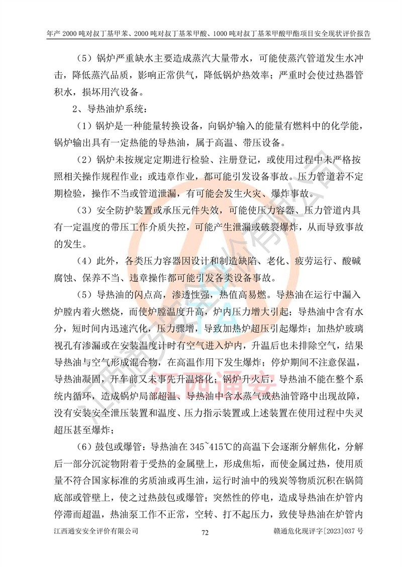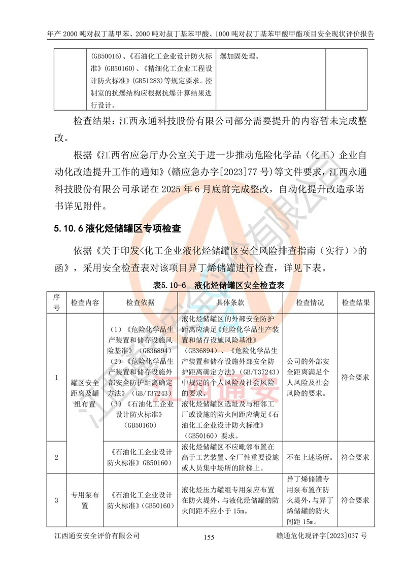 江西永通科技股份有限公司位于江西省贛州市寧都縣工業(yè)園,法定**人為劉忠春,成立于2009年09月25日,注冊資本玖仟陸佰肆拾陸萬陸仟元整,營業(yè)執(zhí)照經(jīng)營范圍為化學(xué)原料藥、醫(yī)藥中間體等研發(fā)、生產(chǎn)、銷售等。 江西永通科技股份有限公司2020年10月26日取得了《安全生產(chǎn)許可證》,許可證編號:(贛)WH安許證字[2011]0642號,許可范圍為對叔丁基甲苯(2kt/a)、對叔丁基苯甲酸(2kt/a)、對叔丁基苯甲酸甲酯(1kt/a),**期:2020年10月26日至2023年10月25日。該公司2021年10月22日取得了安全生產(chǎn)標(biāo)準(zhǔn)化證書,證書編號:贛市AQBWHⅢ[2021]168,**期至2024年10月21日。該公司現(xiàn)有員工133人,其中專職安全管理人員3人。 江西永通科技股份有限公司年產(chǎn)2000噸對叔丁基甲苯、2000噸對叔丁基苯甲酸、1000噸對叔丁基苯甲酸甲酯項(xiàng)目生產(chǎn)過程中涉及的原輔材料為甲苯、異丁烯、液氧(氧氣)、甲醇、濃硫酸、液堿(氫氧化鈉)、活性炭、硅藻土、氧化催化劑和氮?dú)?,產(chǎn)品為對叔丁基甲苯、對叔丁基苯甲酸和對叔丁基苯甲酸甲酯。根據(jù)《危險(xiǎn)化學(xué)品目錄》,該項(xiàng)目涉及的甲苯、異丁烯、液氧(氧氣)、甲醇、濃硫酸、液堿(氫氧化鈉)和氮?dú)鈱儆?/span>危險(xiǎn)化學(xué)品。經(jīng)辨識,甲苯和甲醇屬于重點(diǎn)監(jiān)管的危險(xiǎn)化學(xué)品,甲苯和硫酸屬于第三類易制毒化學(xué)品、甲醇屬于特別管控的危險(xiǎn)化學(xué)品,不涉及監(jiān)控化學(xué)品、易制爆危險(xiǎn)化學(xué)品、劇毒化學(xué)品和高毒物品,儲罐區(qū)構(gòu)成三級重大危險(xiǎn)源,其他生產(chǎn)、儲存單元不構(gòu)成危險(xiǎn)化學(xué)品重大危險(xiǎn)源,涉及的烷基化反應(yīng)和氧化反應(yīng)屬于重點(diǎn)監(jiān)管的危險(xiǎn)化工工藝。根據(jù)《安全生產(chǎn)許可證條例》、《危險(xiǎn)化學(xué)品安全管理?xiàng)l例》和《危險(xiǎn)化學(xué)品生產(chǎn)企業(yè)安全生產(chǎn)許可實(shí)施辦法》的相關(guān)規(guī)定,該項(xiàng)目涉及甲苯回收,需要辦理危險(xiǎn)化學(xué)品安全生產(chǎn)許可證。根據(jù)生產(chǎn)工藝特點(diǎn)及物料的理化特性可知,該項(xiàng)目生產(chǎn)過程中存在火災(zāi)與爆炸、中毒與窒息、觸電、機(jī)械傷害等危險(xiǎn)有害因素。 該公司自2020年10月26日取得安全生產(chǎn)許可證以來,生產(chǎn)運(yùn)行正常,未發(fā)生一般及以上生產(chǎn)安全事故。 |