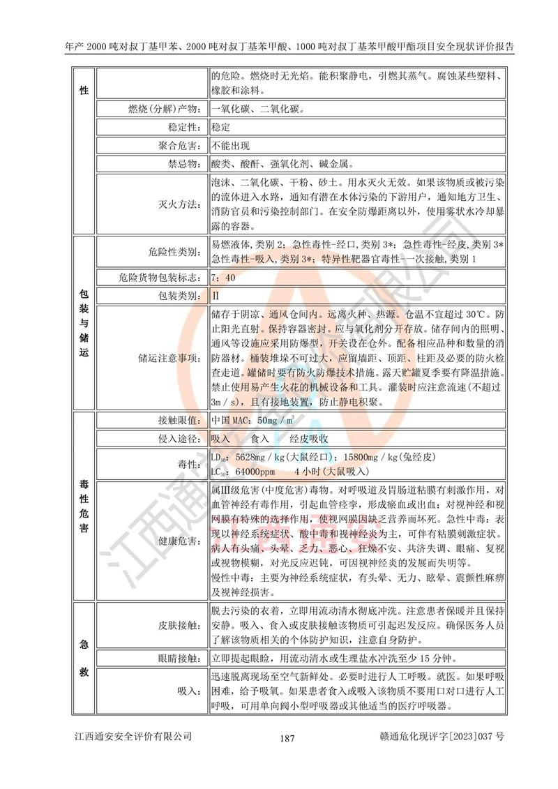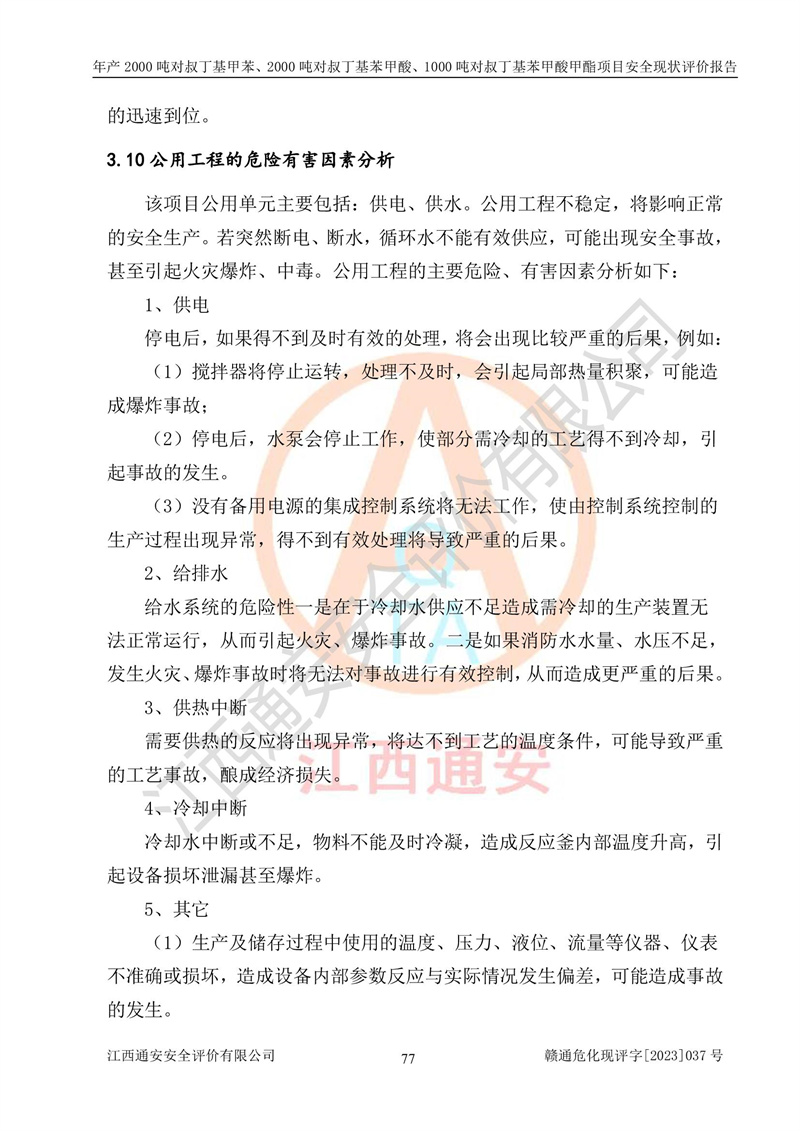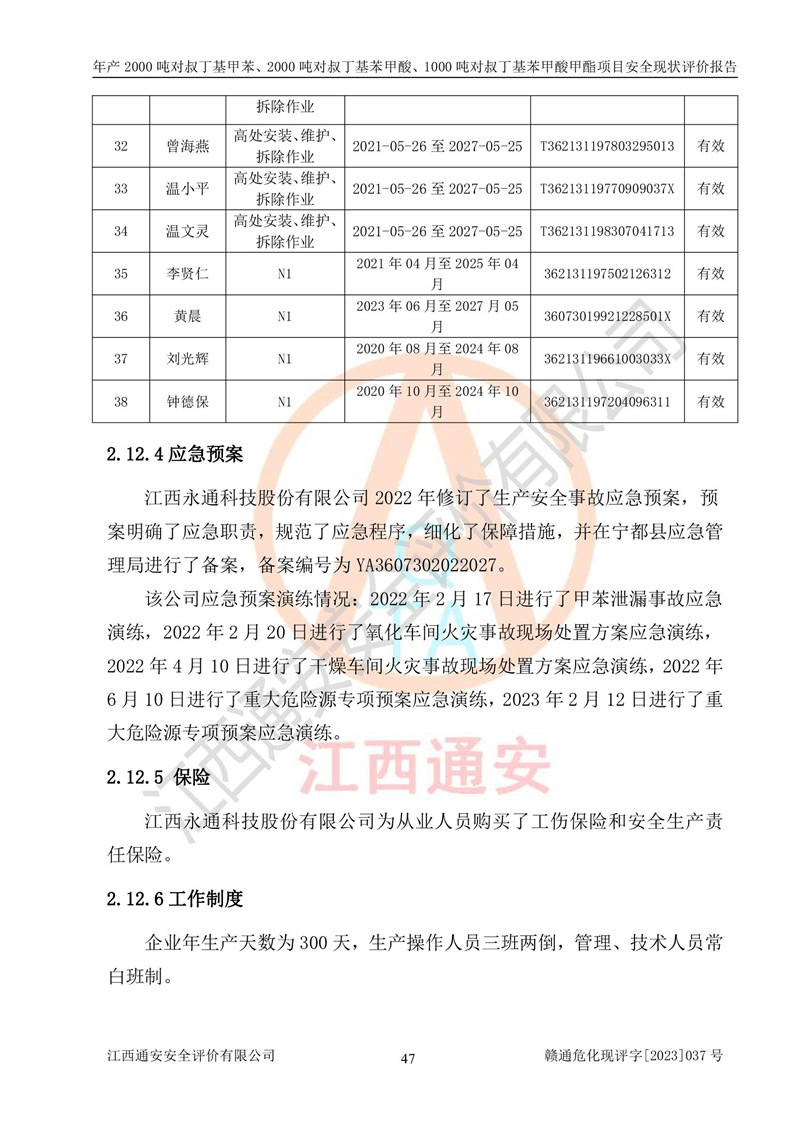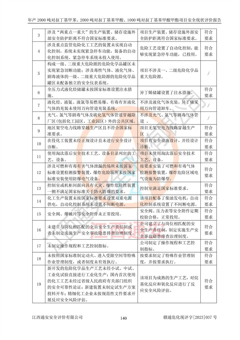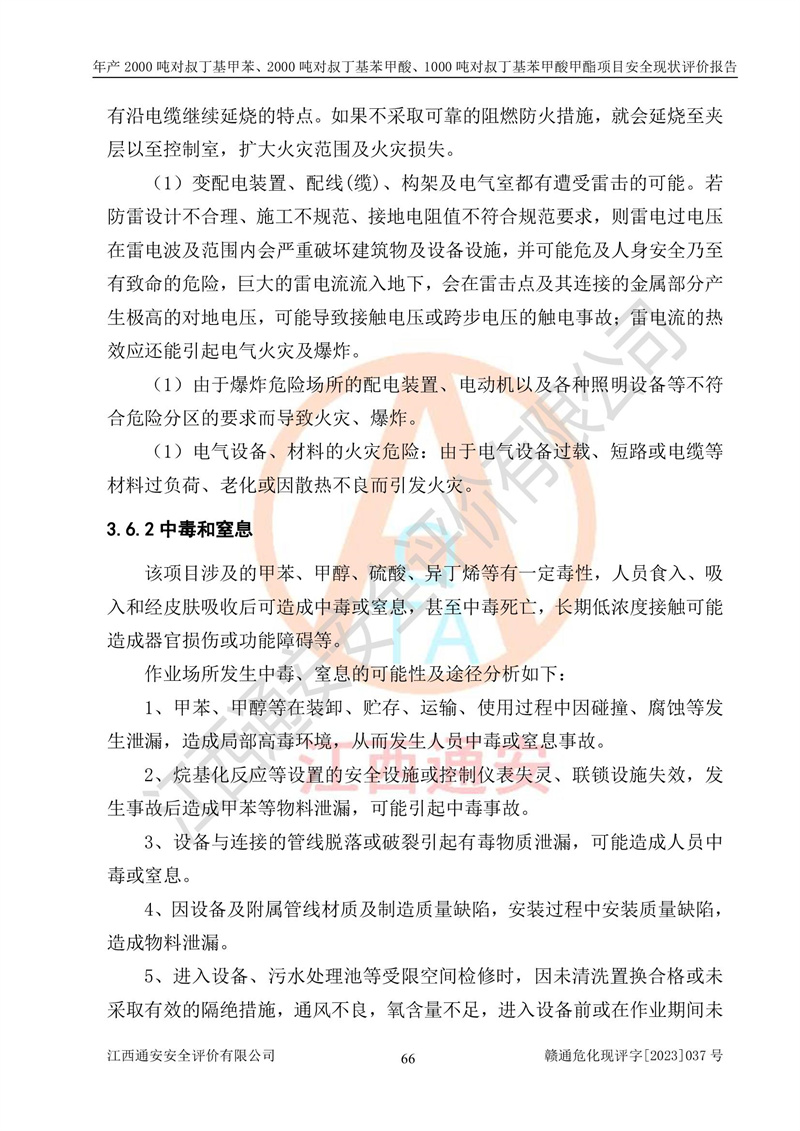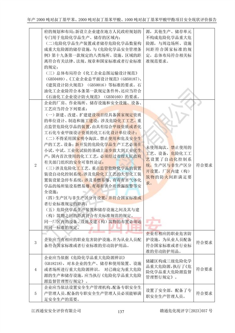 江西永通科技股份有限公司位于江西省贛州市寧都縣工業(yè)園,法定**人為劉忠春,成立于2009年09月25日,注冊資本玖仟陸佰肆拾陸萬陸仟元整,營業(yè)執(zhí)照經(jīng)營范圍為化學(xué)原料藥、醫(yī)藥中間體等研發(fā)、生產(chǎn)、銷售等。 江西永通科技股份有限公司2020年10月26日取得了《安全生產(chǎn)許可證》,許可證編號:(贛)WH安許證字[2011]0642號,許可范圍為對叔丁基甲苯(2kt/a)、對叔丁基苯甲酸(2kt/a)、對叔丁基苯甲酸甲酯(1kt/a),**期:2020年10月26日至2023年10月25日。該公司2021年10月22日取得了安全生產(chǎn)標(biāo)準(zhǔn)化證書,證書編號:贛市AQBWHⅢ[2021]168,**期至2024年10月21日。該公司現(xiàn)有員工133人,其中專職安全管理人員3人。 江西永通科技股份有限公司年產(chǎn)2000噸對叔丁基甲苯、2000噸對叔丁基苯甲酸、1000噸對叔丁基苯甲酸甲酯項(xiàng)目生產(chǎn)過程中涉及的原輔材料為甲苯、異丁烯、液氧(氧氣)、甲醇、濃硫酸、液堿(氫氧化鈉)、活性炭、硅藻土、氧化催化劑和氮?dú)?,產(chǎn)品為對叔丁基甲苯、對叔丁基苯甲酸和對叔丁基苯甲酸甲酯。根據(jù)《危險(xiǎn)化學(xué)品目錄》,該項(xiàng)目涉及的甲苯、異丁烯、液氧(氧氣)、甲醇、濃硫酸、液堿(氫氧化鈉)和氮?dú)鈱儆?/span>危險(xiǎn)化學(xué)品。經(jīng)辨識,甲苯和甲醇屬于重點(diǎn)監(jiān)管的危險(xiǎn)化學(xué)品,甲苯和硫酸屬于第三類易制毒化學(xué)品、甲醇屬于特別管控的危險(xiǎn)化學(xué)品,不涉及監(jiān)控化學(xué)品、易制爆危險(xiǎn)化學(xué)品、劇毒化學(xué)品和高毒物品,儲罐區(qū)構(gòu)成三級重大危險(xiǎn)源,其他生產(chǎn)、儲存單元不構(gòu)成危險(xiǎn)化學(xué)品重大危險(xiǎn)源,涉及的烷基化反應(yīng)和氧化反應(yīng)屬于重點(diǎn)監(jiān)管的危險(xiǎn)化工工藝。根據(jù)《安全生產(chǎn)許可證條例》、《危險(xiǎn)化學(xué)品安全管理?xiàng)l例》和《危險(xiǎn)化學(xué)品生產(chǎn)企業(yè)安全生產(chǎn)許可實(shí)施辦法》的相關(guān)規(guī)定,該項(xiàng)目涉及甲苯回收,需要辦理危險(xiǎn)化學(xué)品安全生產(chǎn)許可證。根據(jù)生產(chǎn)工藝特點(diǎn)及物料的理化特性可知,該項(xiàng)目生產(chǎn)過程中存在火災(zāi)與爆炸、中毒與窒息、觸電、機(jī)械傷害等危險(xiǎn)有害因素。 該公司自2020年10月26日取得安全生產(chǎn)許可證以來,生產(chǎn)運(yùn)行正常,未發(fā)生一般及以上生產(chǎn)安全事故。 |