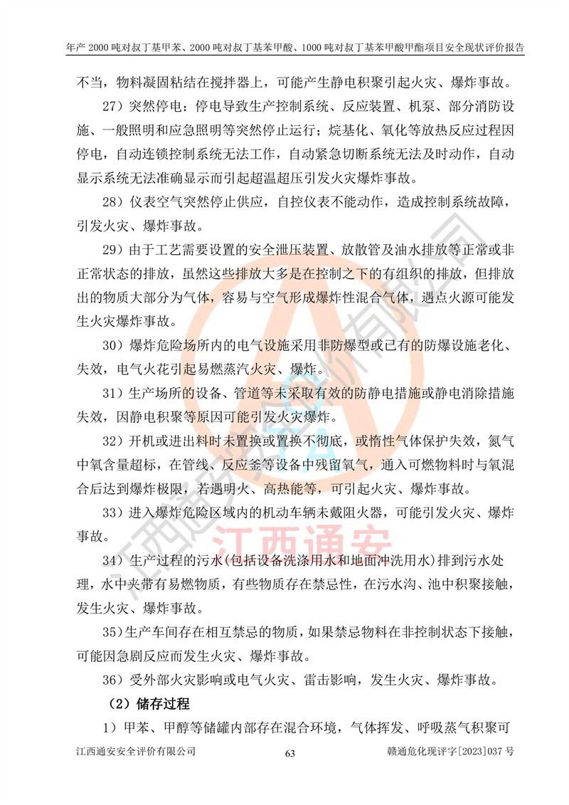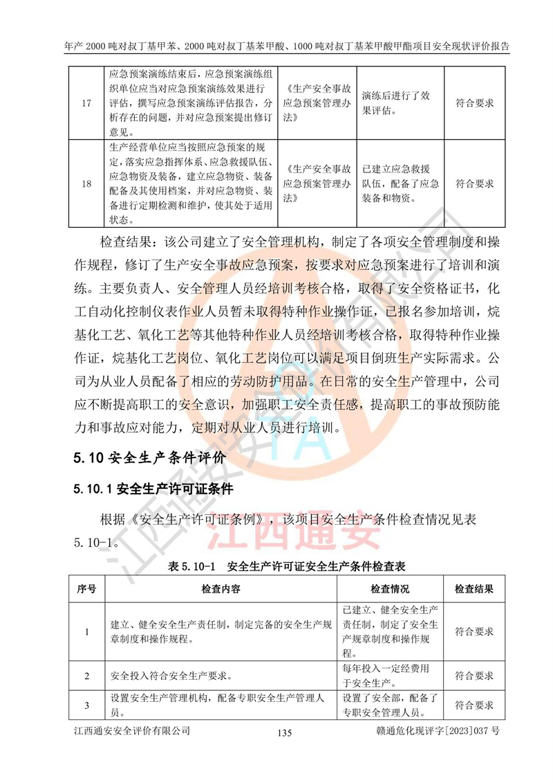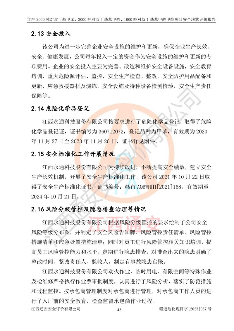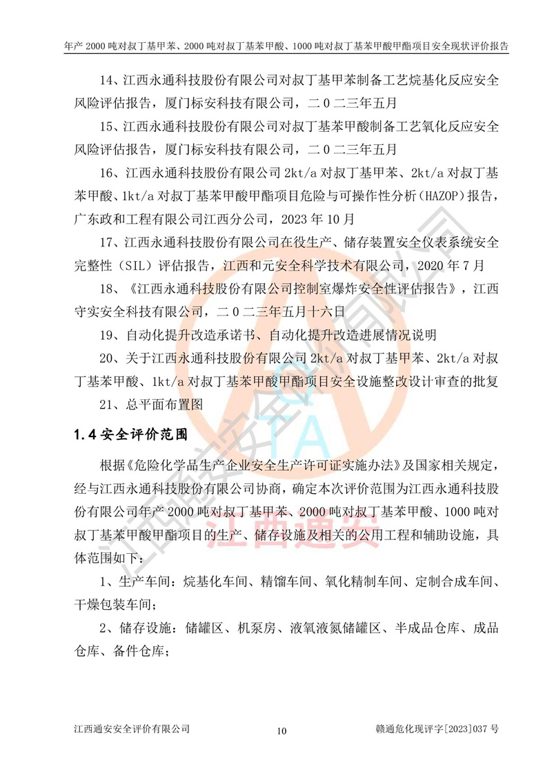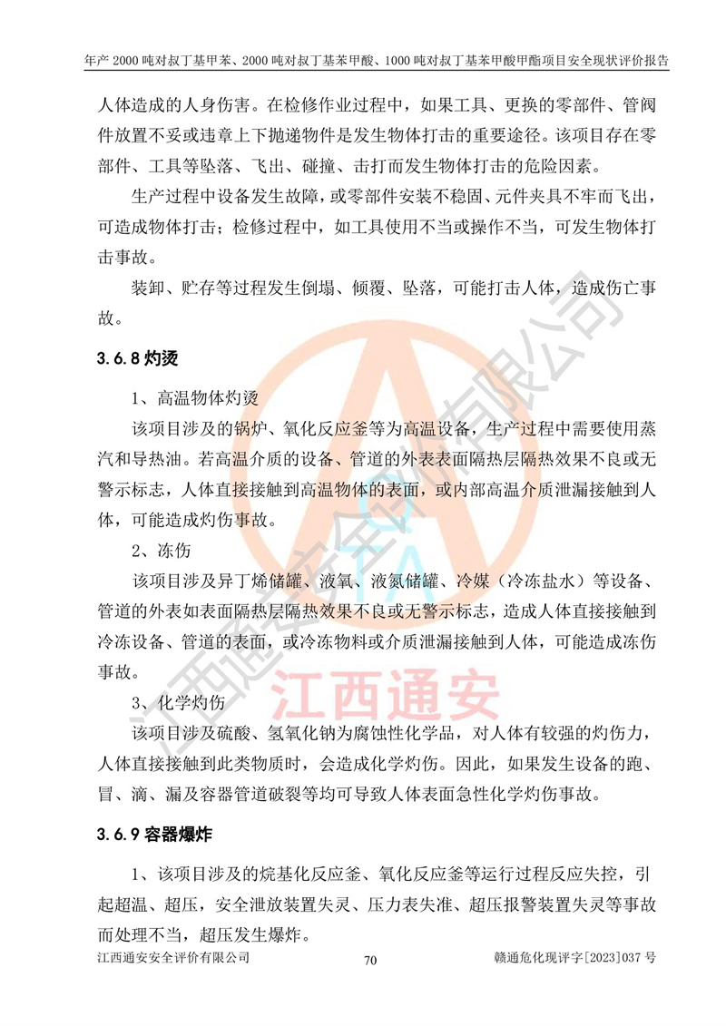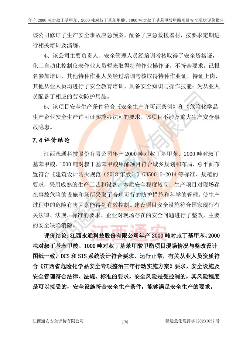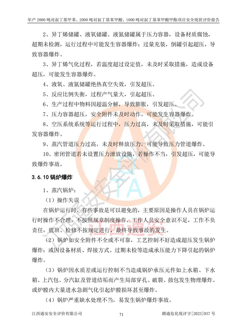 江西永通科技股份有限公司位于江西省贛州市寧都縣工業(yè)園,法定**人為劉忠春,成立于2009年09月25日,注冊資本玖仟陸佰肆拾陸萬陸仟元整,營業(yè)執(zhí)照經(jīng)營范圍為化學(xué)原料藥、醫(yī)藥中間體等研發(fā)、生產(chǎn)、銷售等。 江西永通科技股份有限公司2020年10月26日取得了《安全生產(chǎn)許可證》,許可證編號:(贛)WH安許證字[2011]0642號,許可范圍為對叔丁基甲苯(2kt/a)、對叔丁基苯甲酸(2kt/a)、對叔丁基苯甲酸甲酯(1kt/a),**期:2020年10月26日至2023年10月25日。該公司2021年10月22日取得了安全生產(chǎn)標(biāo)準(zhǔn)化證書,證書編號:贛市AQBWHⅢ[2021]168,**期至2024年10月21日。該公司現(xiàn)有員工133人,其中專職安全管理人員3人。 江西永通科技股份有限公司年產(chǎn)2000噸對叔丁基甲苯、2000噸對叔丁基苯甲酸、1000噸對叔丁基苯甲酸甲酯項(xiàng)目生產(chǎn)過程中涉及的原輔材料為甲苯、異丁烯、液氧(氧氣)、甲醇、濃硫酸、液堿(氫氧化鈉)、活性炭、硅藻土、氧化催化劑和氮?dú)?,產(chǎn)品為對叔丁基甲苯、對叔丁基苯甲酸和對叔丁基苯甲酸甲酯。根據(jù)《危險(xiǎn)化學(xué)品目錄》,該項(xiàng)目涉及的甲苯、異丁烯、液氧(氧氣)、甲醇、濃硫酸、液堿(氫氧化鈉)和氮?dú)鈱儆?/span>危險(xiǎn)化學(xué)品。經(jīng)辨識,甲苯和甲醇屬于重點(diǎn)監(jiān)管的危險(xiǎn)化學(xué)品,甲苯和硫酸屬于第三類易制毒化學(xué)品、甲醇屬于特別管控的危險(xiǎn)化學(xué)品,不涉及監(jiān)控化學(xué)品、易制爆危險(xiǎn)化學(xué)品、劇毒化學(xué)品和高毒物品,儲罐區(qū)構(gòu)成三級重大危險(xiǎn)源,其他生產(chǎn)、儲存單元不構(gòu)成危險(xiǎn)化學(xué)品重大危險(xiǎn)源,涉及的烷基化反應(yīng)和氧化反應(yīng)屬于重點(diǎn)監(jiān)管的危險(xiǎn)化工工藝。根據(jù)《安全生產(chǎn)許可證條例》、《危險(xiǎn)化學(xué)品安全管理?xiàng)l例》和《危險(xiǎn)化學(xué)品生產(chǎn)企業(yè)安全生產(chǎn)許可實(shí)施辦法》的相關(guān)規(guī)定,該項(xiàng)目涉及甲苯回收,需要辦理危險(xiǎn)化學(xué)品安全生產(chǎn)許可證。根據(jù)生產(chǎn)工藝特點(diǎn)及物料的理化特性可知,該項(xiàng)目生產(chǎn)過程中存在火災(zāi)與爆炸、中毒與窒息、觸電、機(jī)械傷害等危險(xiǎn)有害因素。 該公司自2020年10月26日取得安全生產(chǎn)許可證以來,生產(chǎn)運(yùn)行正常,未發(fā)生一般及以上生產(chǎn)安全事故。 |