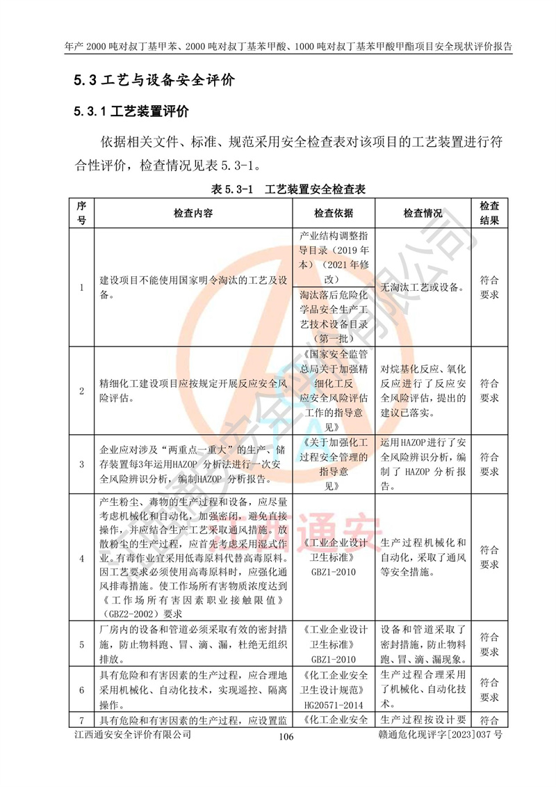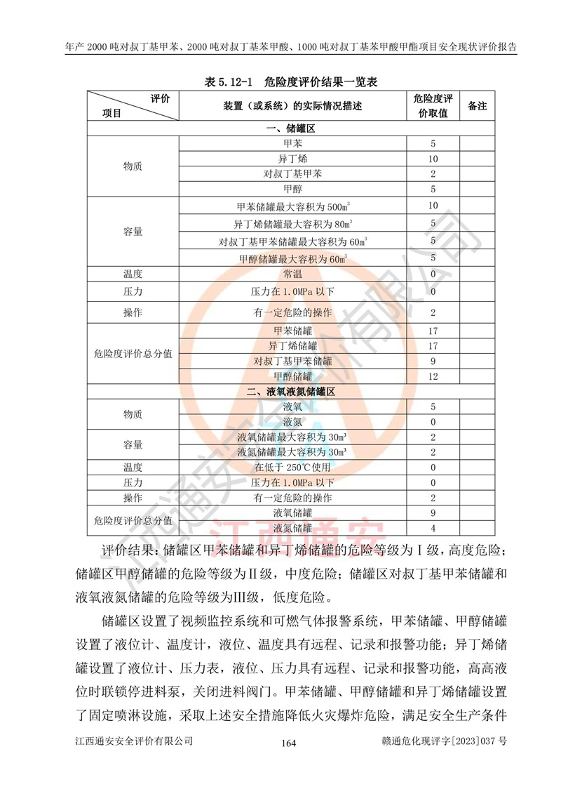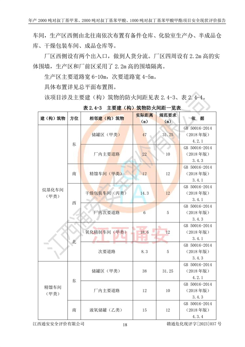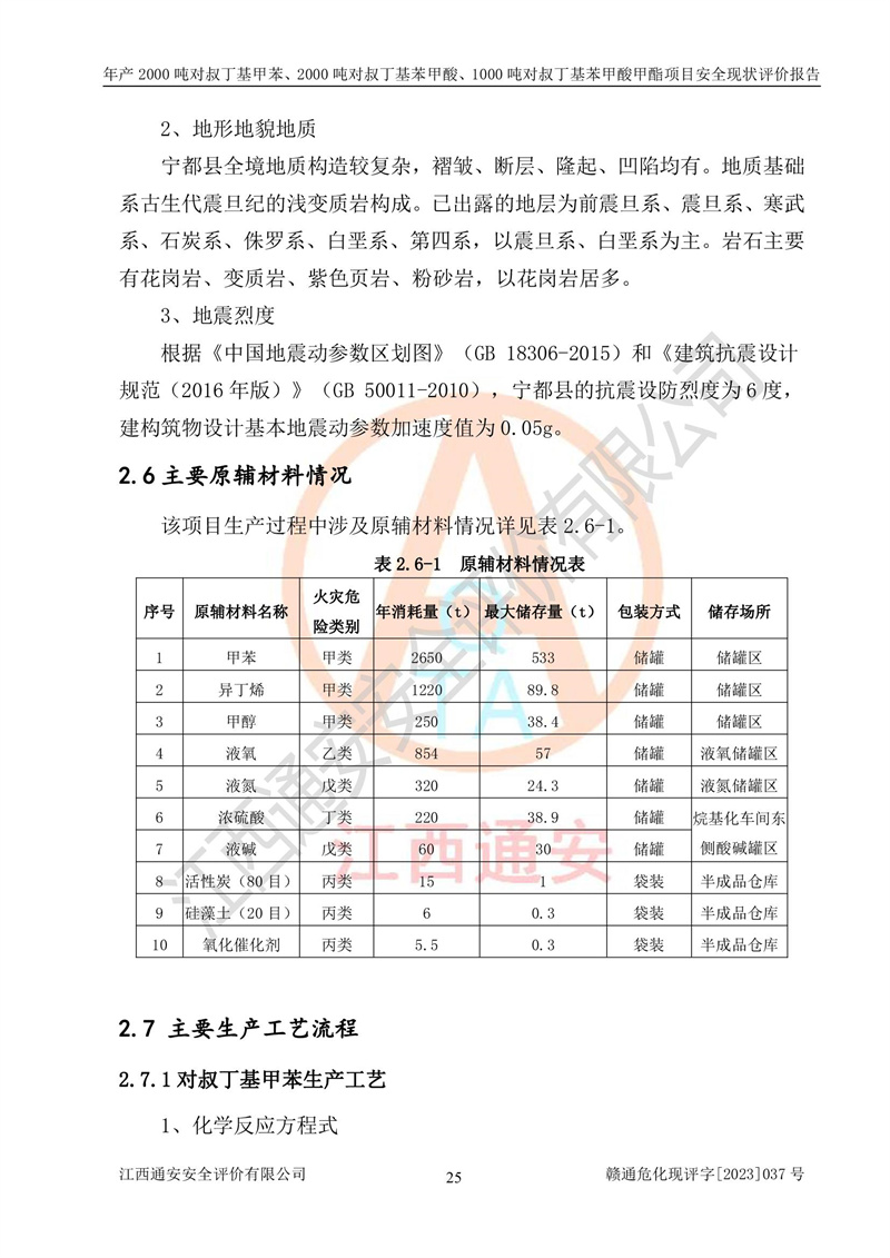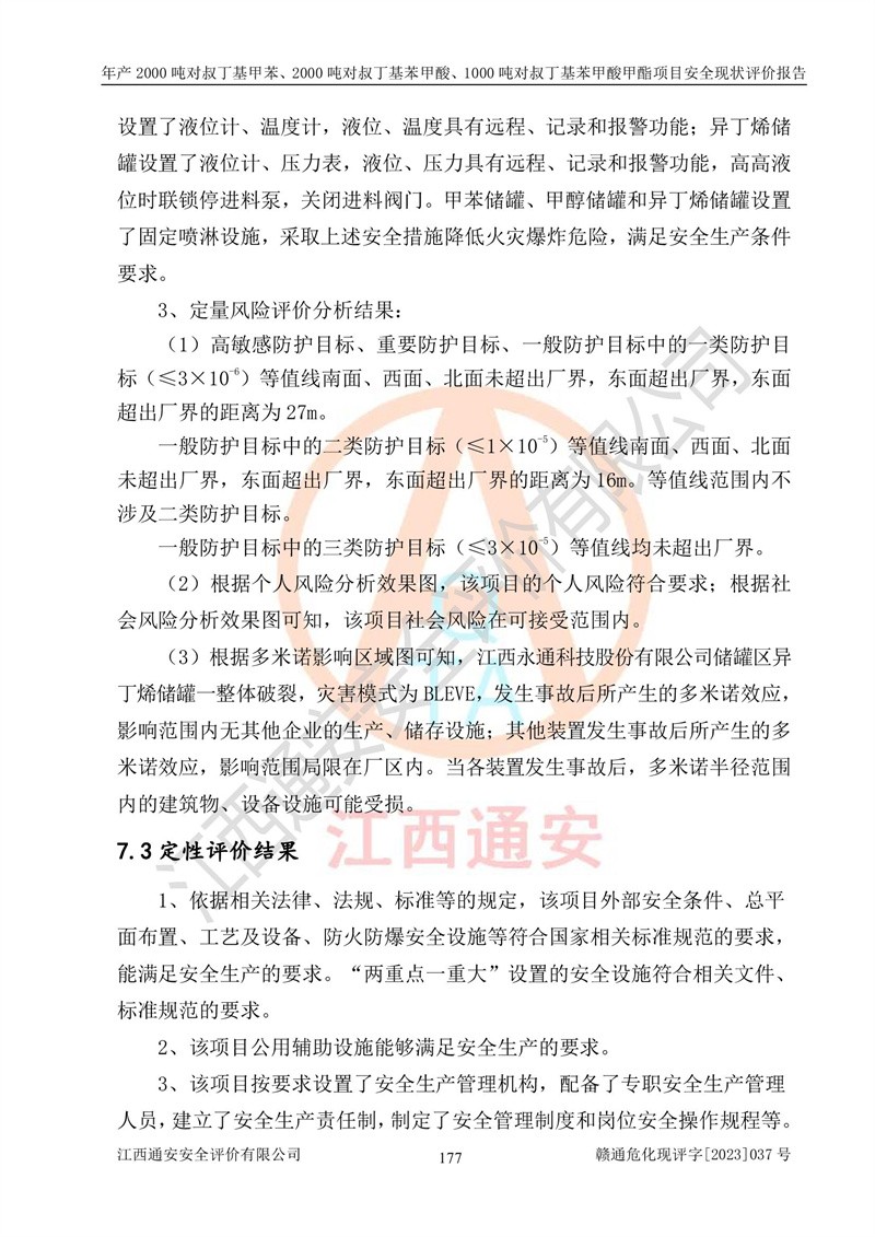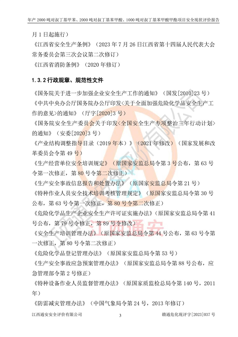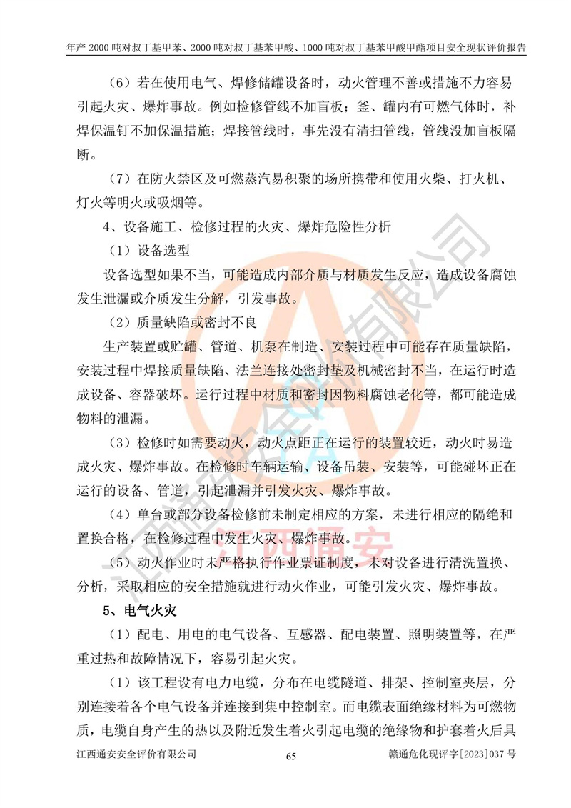 江西永通科技股份有限公司位于江西省贛州市寧都縣工業(yè)園,法定**人為劉忠春,成立于2009年09月25日,注冊資本玖仟陸佰肆拾陸萬陸仟元整,營業(yè)執(zhí)照經(jīng)營范圍為化學(xué)原料藥、醫(yī)藥中間體等研發(fā)、生產(chǎn)、銷售等。 江西永通科技股份有限公司2020年10月26日取得了《安全生產(chǎn)許可證》,許可證編號:(贛)WH安許證字[2011]0642號,許可范圍為對叔丁基甲苯(2kt/a)、對叔丁基苯甲酸(2kt/a)、對叔丁基苯甲酸甲酯(1kt/a),**期:2020年10月26日至2023年10月25日。該公司2021年10月22日取得了安全生產(chǎn)標(biāo)準(zhǔn)化證書,證書編號:贛市AQBWHⅢ[2021]168,**期至2024年10月21日。該公司現(xiàn)有員工133人,其中專職安全管理人員3人。 江西永通科技股份有限公司年產(chǎn)2000噸對叔丁基甲苯、2000噸對叔丁基苯甲酸、1000噸對叔丁基苯甲酸甲酯項(xiàng)目生產(chǎn)過程中涉及的原輔材料為甲苯、異丁烯、液氧(氧氣)、甲醇、濃硫酸、液堿(氫氧化鈉)、活性炭、硅藻土、氧化催化劑和氮?dú)?,產(chǎn)品為對叔丁基甲苯、對叔丁基苯甲酸和對叔丁基苯甲酸甲酯。根據(jù)《危險(xiǎn)化學(xué)品目錄》,該項(xiàng)目涉及的甲苯、異丁烯、液氧(氧氣)、甲醇、濃硫酸、液堿(氫氧化鈉)和氮?dú)鈱儆?/span>危險(xiǎn)化學(xué)品。經(jīng)辨識,甲苯和甲醇屬于重點(diǎn)監(jiān)管的危險(xiǎn)化學(xué)品,甲苯和硫酸屬于第三類易制毒化學(xué)品、甲醇屬于特別管控的危險(xiǎn)化學(xué)品,不涉及監(jiān)控化學(xué)品、易制爆危險(xiǎn)化學(xué)品、劇毒化學(xué)品和高毒物品,儲罐區(qū)構(gòu)成三級重大危險(xiǎn)源,其他生產(chǎn)、儲存單元不構(gòu)成危險(xiǎn)化學(xué)品重大危險(xiǎn)源,涉及的烷基化反應(yīng)和氧化反應(yīng)屬于重點(diǎn)監(jiān)管的危險(xiǎn)化工工藝。根據(jù)《安全生產(chǎn)許可證條例》、《危險(xiǎn)化學(xué)品安全管理?xiàng)l例》和《危險(xiǎn)化學(xué)品生產(chǎn)企業(yè)安全生產(chǎn)許可實(shí)施辦法》的相關(guān)規(guī)定,該項(xiàng)目涉及甲苯回收,需要辦理危險(xiǎn)化學(xué)品安全生產(chǎn)許可證。根據(jù)生產(chǎn)工藝特點(diǎn)及物料的理化特性可知,該項(xiàng)目生產(chǎn)過程中存在火災(zāi)與爆炸、中毒與窒息、觸電、機(jī)械傷害等危險(xiǎn)有害因素。 該公司自2020年10月26日取得安全生產(chǎn)許可證以來,生產(chǎn)運(yùn)行正常,未發(fā)生一般及以上生產(chǎn)安全事故。 |