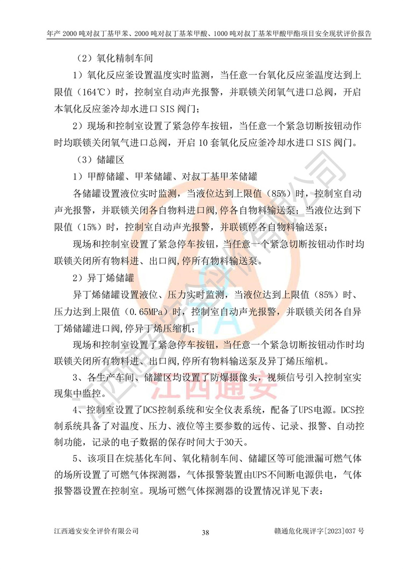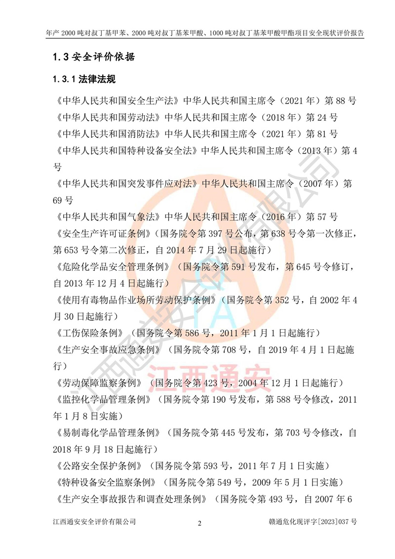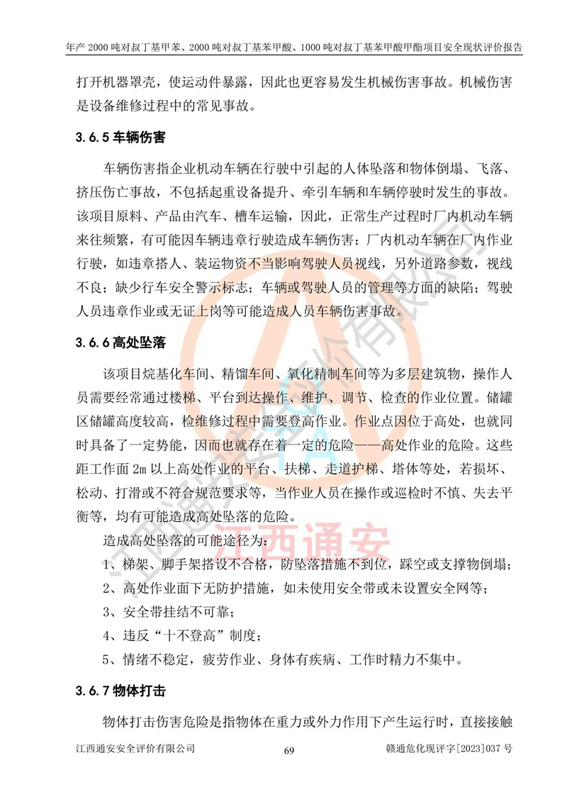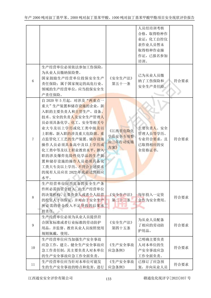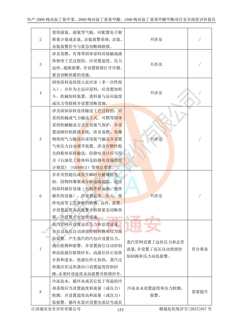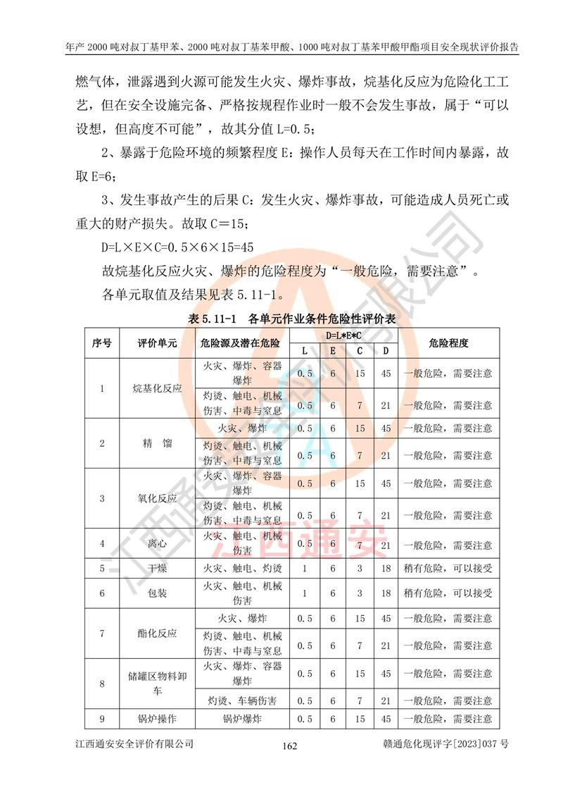 江西永通科技股份有限公司位于江西省贛州市寧都縣工業(yè)園,法定**人為劉忠春,成立于2009年09月25日,注冊資本玖仟陸佰肆拾陸萬陸仟元整,營業(yè)執(zhí)照經(jīng)營范圍為化學(xué)原料藥、醫(yī)藥中間體等研發(fā)、生產(chǎn)、銷售等。 江西永通科技股份有限公司2020年10月26日取得了《安全生產(chǎn)許可證》,許可證編號:(贛)WH安許證字[2011]0642號,許可范圍為對叔丁基甲苯(2kt/a)、對叔丁基苯甲酸(2kt/a)、對叔丁基苯甲酸甲酯(1kt/a),**期:2020年10月26日至2023年10月25日。該公司2021年10月22日取得了安全生產(chǎn)標(biāo)準(zhǔn)化證書,證書編號:贛市AQBWHⅢ[2021]168,**期至2024年10月21日。該公司現(xiàn)有員工133人,其中專職安全管理人員3人。 江西永通科技股份有限公司年產(chǎn)2000噸對叔丁基甲苯、2000噸對叔丁基苯甲酸、1000噸對叔丁基苯甲酸甲酯項(xiàng)目生產(chǎn)過程中涉及的原輔材料為甲苯、異丁烯、液氧(氧氣)、甲醇、濃硫酸、液堿(氫氧化鈉)、活性炭、硅藻土、氧化催化劑和氮?dú)?,產(chǎn)品為對叔丁基甲苯、對叔丁基苯甲酸和對叔丁基苯甲酸甲酯。根據(jù)《危險(xiǎn)化學(xué)品目錄》,該項(xiàng)目涉及的甲苯、異丁烯、液氧(氧氣)、甲醇、濃硫酸、液堿(氫氧化鈉)和氮?dú)鈱儆?/span>危險(xiǎn)化學(xué)品。經(jīng)辨識,甲苯和甲醇屬于重點(diǎn)監(jiān)管的危險(xiǎn)化學(xué)品,甲苯和硫酸屬于第三類易制毒化學(xué)品、甲醇屬于特別管控的危險(xiǎn)化學(xué)品,不涉及監(jiān)控化學(xué)品、易制爆危險(xiǎn)化學(xué)品、劇毒化學(xué)品和高毒物品,儲罐區(qū)構(gòu)成三級重大危險(xiǎn)源,其他生產(chǎn)、儲存單元不構(gòu)成危險(xiǎn)化學(xué)品重大危險(xiǎn)源,涉及的烷基化反應(yīng)和氧化反應(yīng)屬于重點(diǎn)監(jiān)管的危險(xiǎn)化工工藝。根據(jù)《安全生產(chǎn)許可證條例》、《危險(xiǎn)化學(xué)品安全管理?xiàng)l例》和《危險(xiǎn)化學(xué)品生產(chǎn)企業(yè)安全生產(chǎn)許可實(shí)施辦法》的相關(guān)規(guī)定,該項(xiàng)目涉及甲苯回收,需要辦理危險(xiǎn)化學(xué)品安全生產(chǎn)許可證。根據(jù)生產(chǎn)工藝特點(diǎn)及物料的理化特性可知,該項(xiàng)目生產(chǎn)過程中存在火災(zāi)與爆炸、中毒與窒息、觸電、機(jī)械傷害等危險(xiǎn)有害因素。 該公司自2020年10月26日取得安全生產(chǎn)許可證以來,生產(chǎn)運(yùn)行正常,未發(fā)生一般及以上生產(chǎn)安全事故。 |