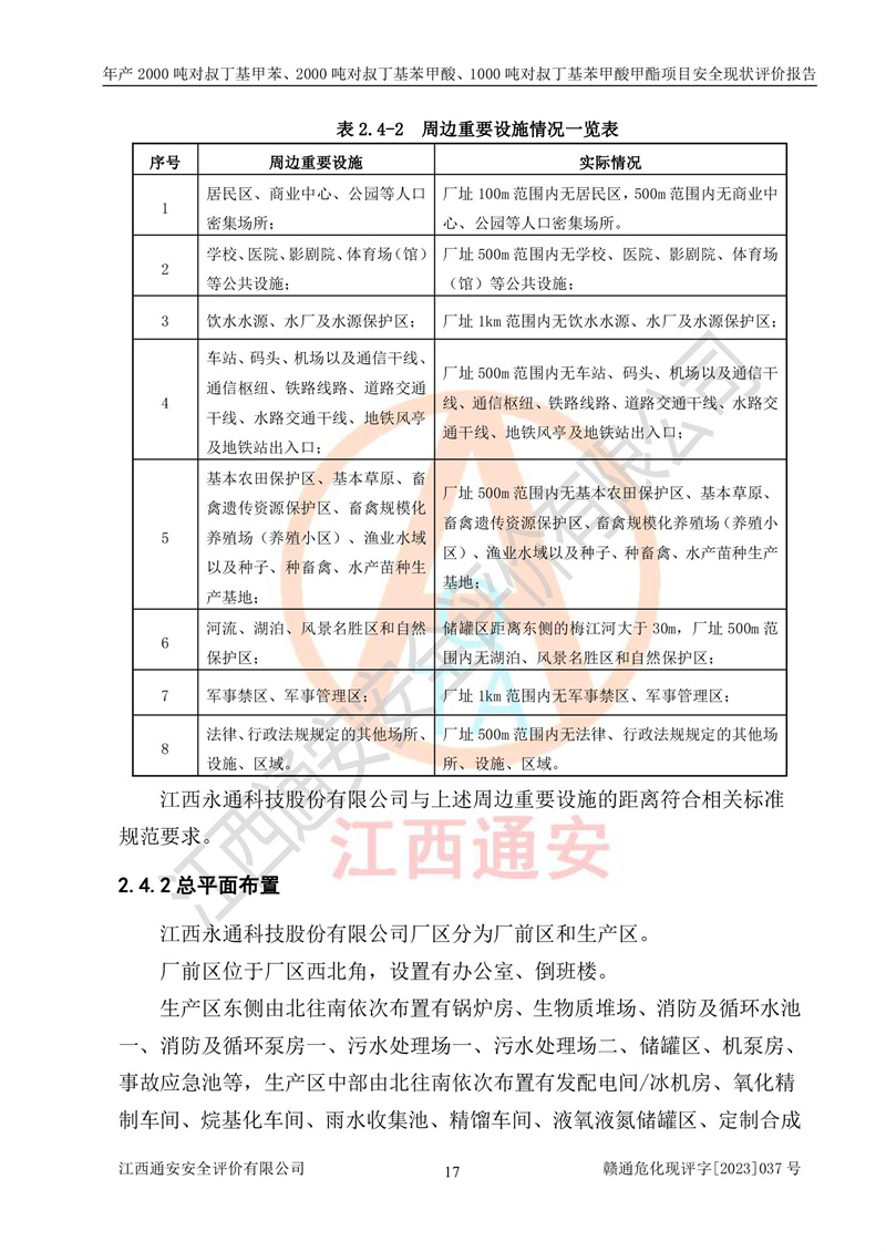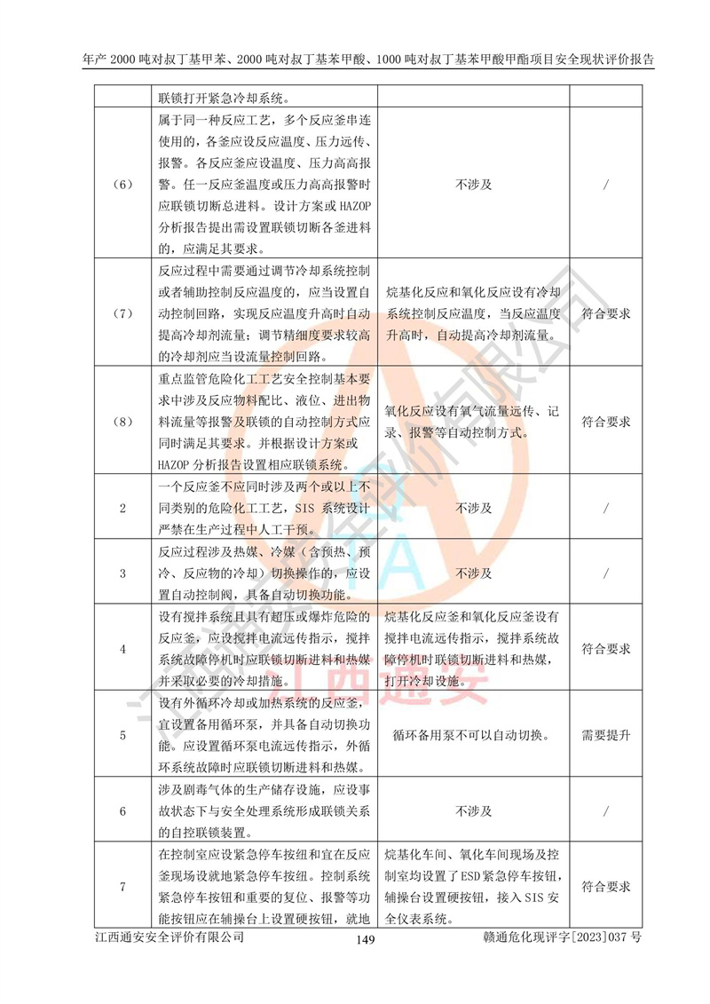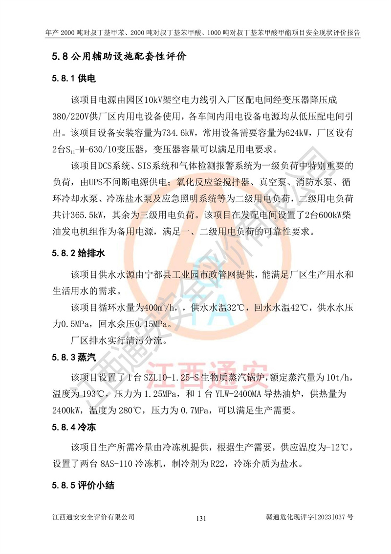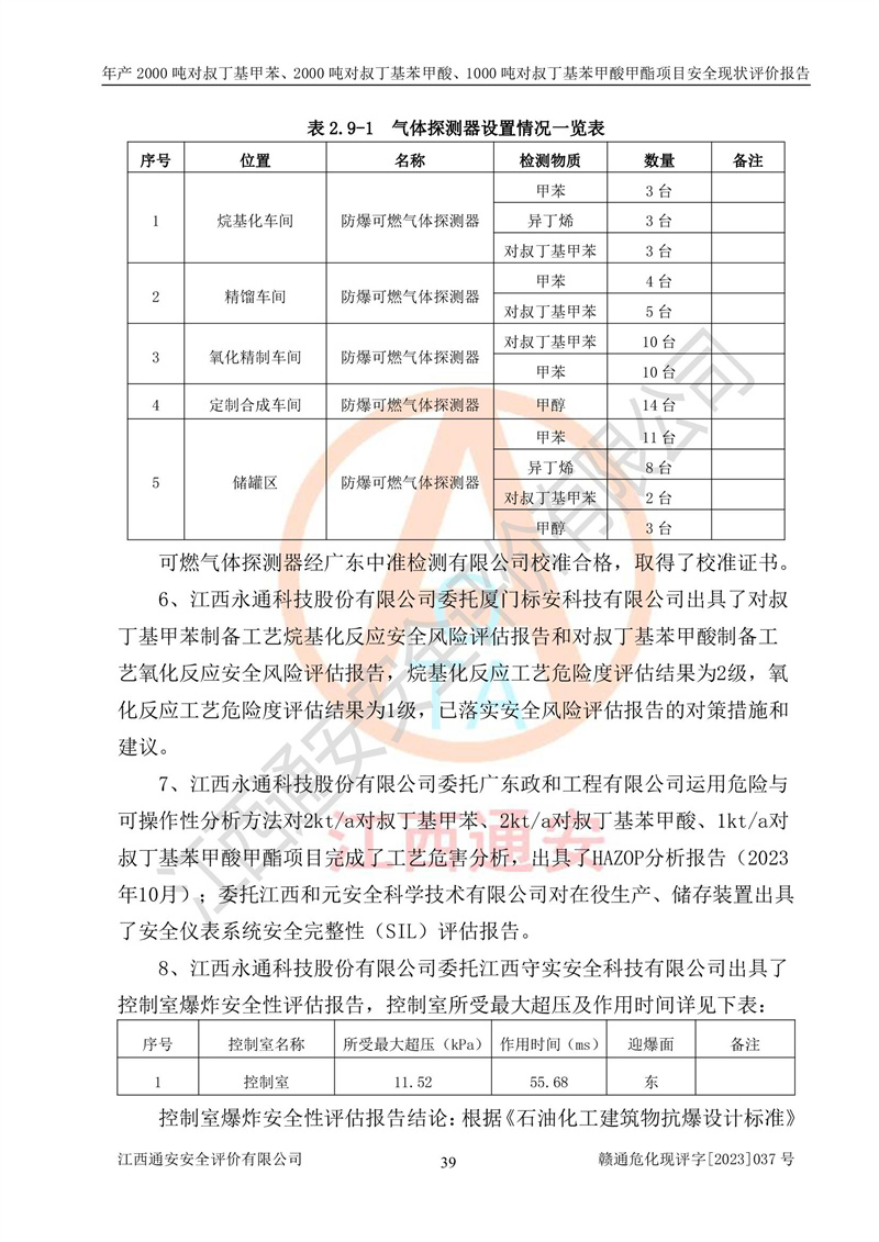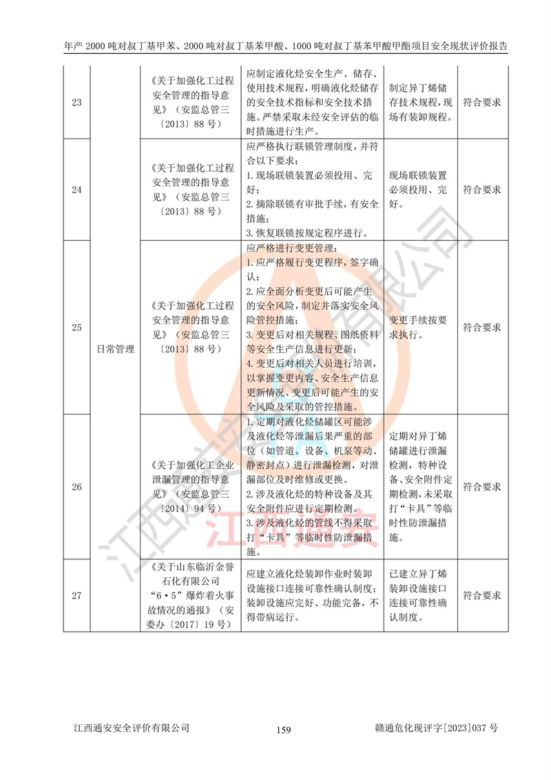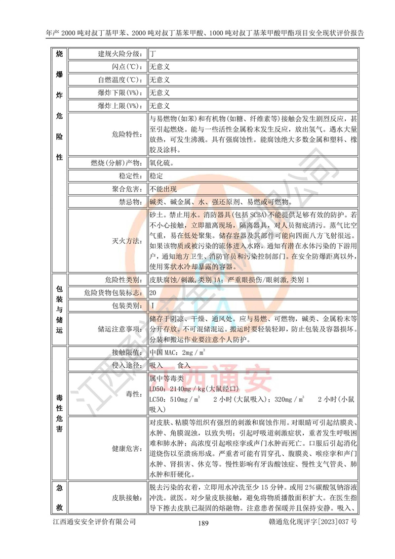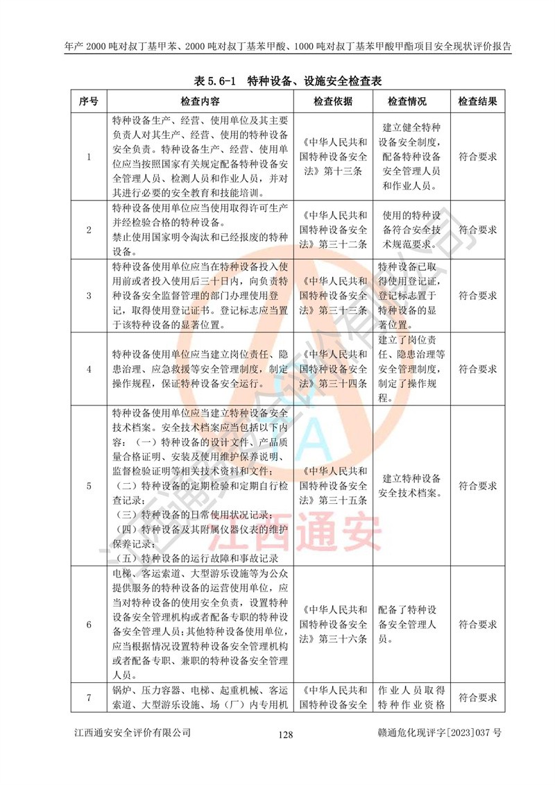 江西永通科技股份有限公司位于江西省贛州市寧都縣工業(yè)園,法定**人為劉忠春,成立于2009年09月25日,注冊資本玖仟陸佰肆拾陸萬陸仟元整,營業(yè)執(zhí)照經(jīng)營范圍為化學(xué)原料藥、醫(yī)藥中間體等研發(fā)、生產(chǎn)、銷售等。 江西永通科技股份有限公司2020年10月26日取得了《安全生產(chǎn)許可證》,許可證編號:(贛)WH安許證字[2011]0642號,許可范圍為對叔丁基甲苯(2kt/a)、對叔丁基苯甲酸(2kt/a)、對叔丁基苯甲酸甲酯(1kt/a),**期:2020年10月26日至2023年10月25日。該公司2021年10月22日取得了安全生產(chǎn)標(biāo)準(zhǔn)化證書,證書編號:贛市AQBWHⅢ[2021]168,**期至2024年10月21日。該公司現(xiàn)有員工133人,其中專職安全管理人員3人。 江西永通科技股份有限公司年產(chǎn)2000噸對叔丁基甲苯、2000噸對叔丁基苯甲酸、1000噸對叔丁基苯甲酸甲酯項(xiàng)目生產(chǎn)過程中涉及的原輔材料為甲苯、異丁烯、液氧(氧氣)、甲醇、濃硫酸、液堿(氫氧化鈉)、活性炭、硅藻土、氧化催化劑和氮?dú)?,產(chǎn)品為對叔丁基甲苯、對叔丁基苯甲酸和對叔丁基苯甲酸甲酯。根據(jù)《危險(xiǎn)化學(xué)品目錄》,該項(xiàng)目涉及的甲苯、異丁烯、液氧(氧氣)、甲醇、濃硫酸、液堿(氫氧化鈉)和氮?dú)鈱儆?/span>危險(xiǎn)化學(xué)品。經(jīng)辨識,甲苯和甲醇屬于重點(diǎn)監(jiān)管的危險(xiǎn)化學(xué)品,甲苯和硫酸屬于第三類易制毒化學(xué)品、甲醇屬于特別管控的危險(xiǎn)化學(xué)品,不涉及監(jiān)控化學(xué)品、易制爆危險(xiǎn)化學(xué)品、劇毒化學(xué)品和高毒物品,儲罐區(qū)構(gòu)成三級重大危險(xiǎn)源,其他生產(chǎn)、儲存單元不構(gòu)成危險(xiǎn)化學(xué)品重大危險(xiǎn)源,涉及的烷基化反應(yīng)和氧化反應(yīng)屬于重點(diǎn)監(jiān)管的危險(xiǎn)化工工藝。根據(jù)《安全生產(chǎn)許可證條例》、《危險(xiǎn)化學(xué)品安全管理?xiàng)l例》和《危險(xiǎn)化學(xué)品生產(chǎn)企業(yè)安全生產(chǎn)許可實(shí)施辦法》的相關(guān)規(guī)定,該項(xiàng)目涉及甲苯回收,需要辦理危險(xiǎn)化學(xué)品安全生產(chǎn)許可證。根據(jù)生產(chǎn)工藝特點(diǎn)及物料的理化特性可知,該項(xiàng)目生產(chǎn)過程中存在火災(zāi)與爆炸、中毒與窒息、觸電、機(jī)械傷害等危險(xiǎn)有害因素。 該公司自2020年10月26日取得安全生產(chǎn)許可證以來,生產(chǎn)運(yùn)行正常,未發(fā)生一般及以上生產(chǎn)安全事故。 |