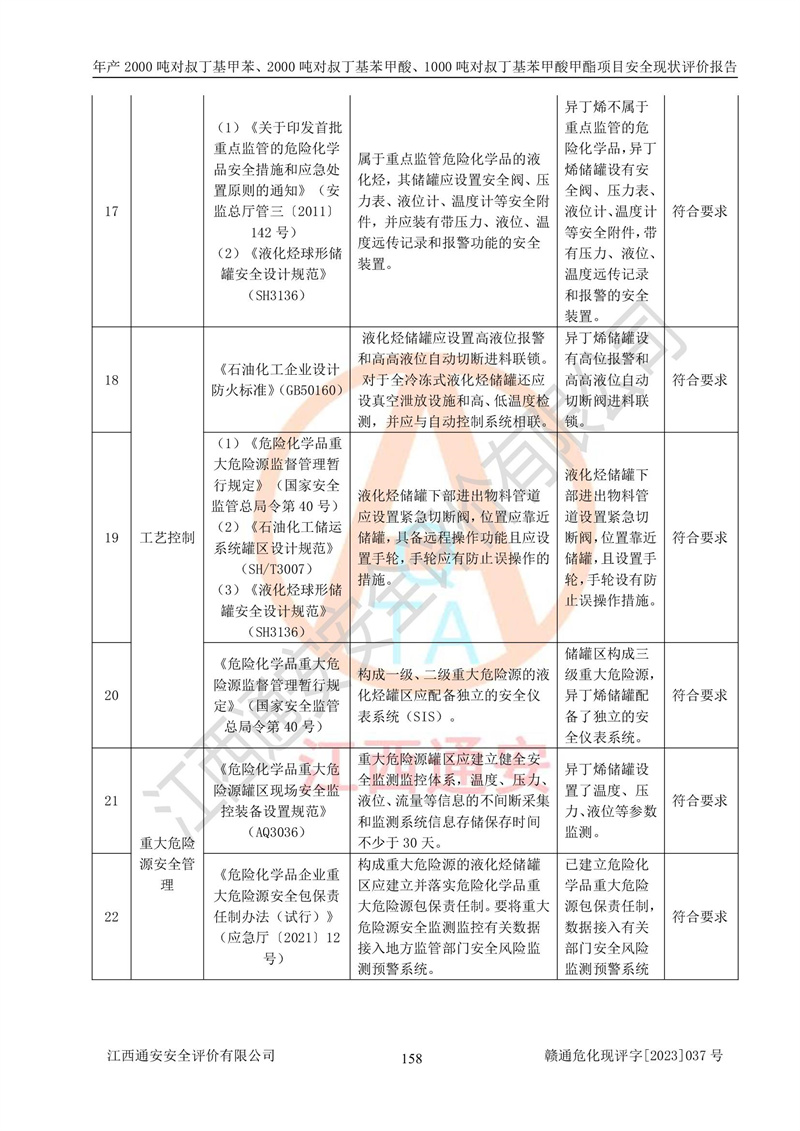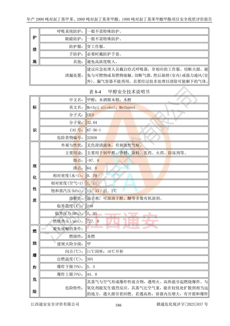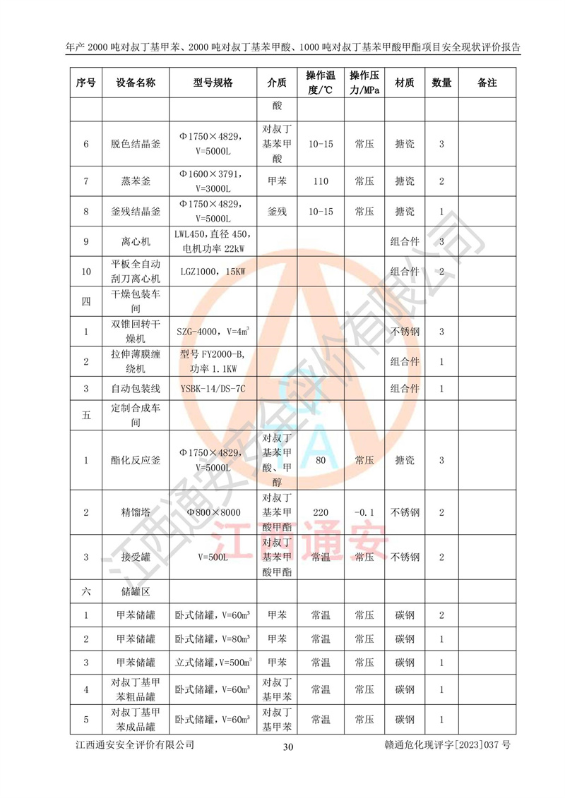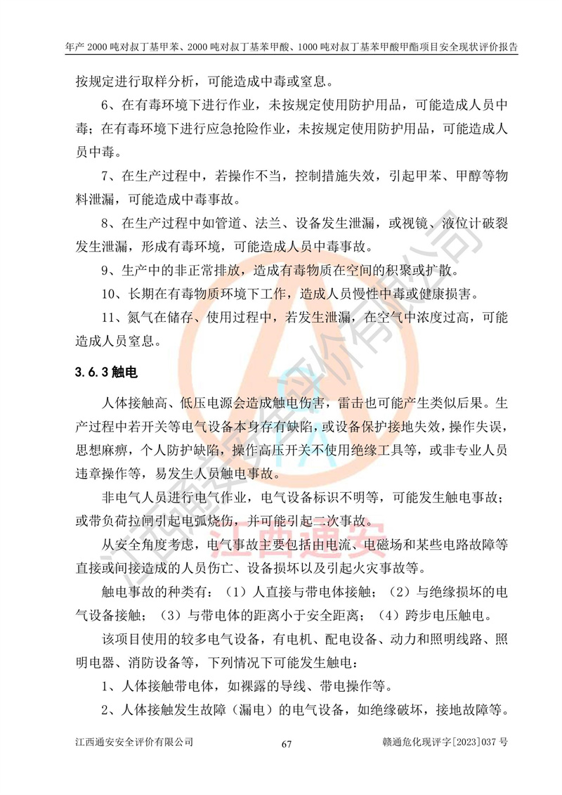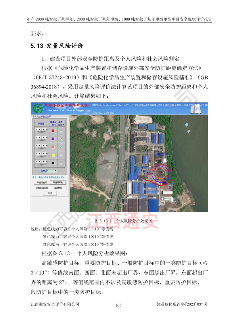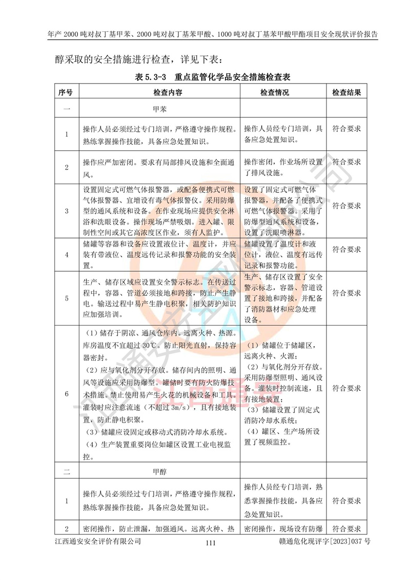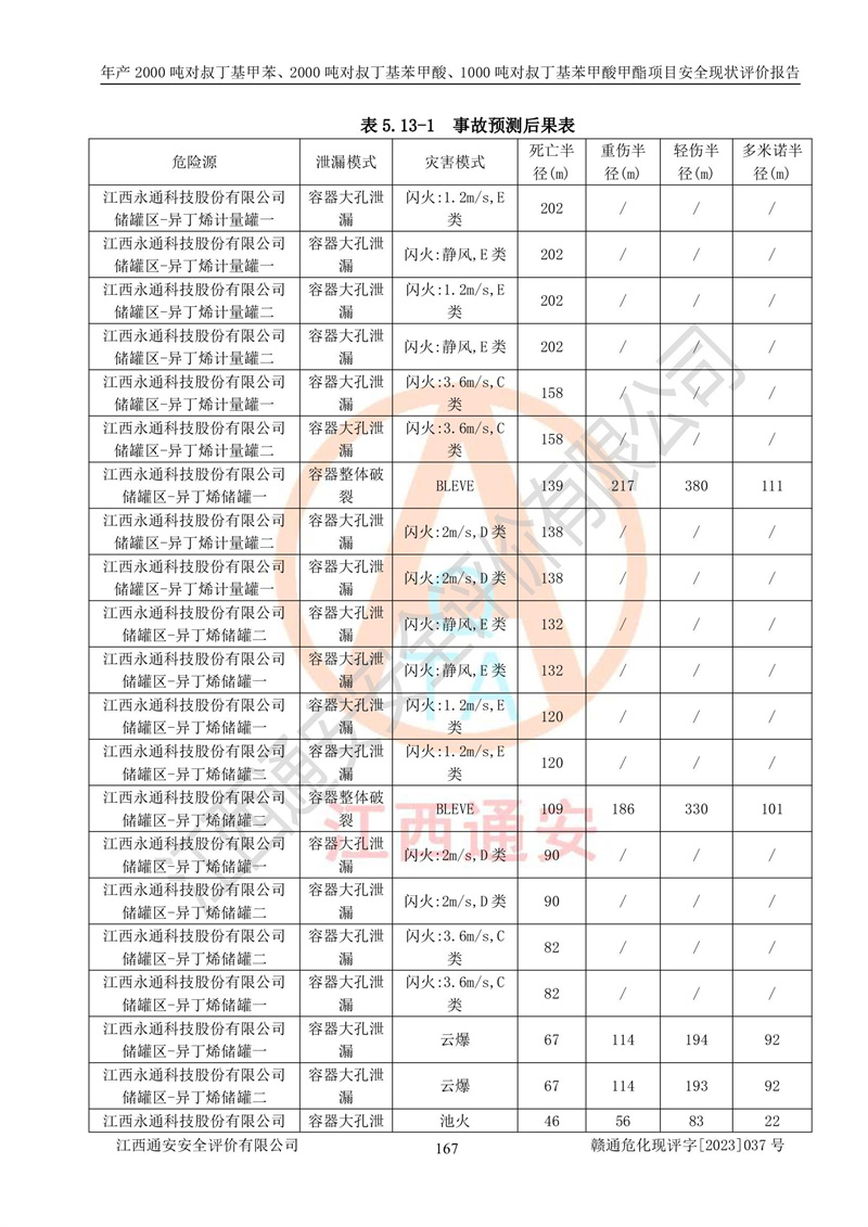 江西永通科技股份有限公司位于江西省贛州市寧都縣工業(yè)園,法定**人為劉忠春,成立于2009年09月25日,注冊資本玖仟陸佰肆拾陸萬陸仟元整,營業(yè)執(zhí)照經(jīng)營范圍為化學(xué)原料藥、醫(yī)藥中間體等研發(fā)、生產(chǎn)、銷售等。 江西永通科技股份有限公司2020年10月26日取得了《安全生產(chǎn)許可證》,許可證編號:(贛)WH安許證字[2011]0642號,許可范圍為對叔丁基甲苯(2kt/a)、對叔丁基苯甲酸(2kt/a)、對叔丁基苯甲酸甲酯(1kt/a),**期:2020年10月26日至2023年10月25日。該公司2021年10月22日取得了安全生產(chǎn)標(biāo)準(zhǔn)化證書,證書編號:贛市AQBWHⅢ[2021]168,**期至2024年10月21日。該公司現(xiàn)有員工133人,其中專職安全管理人員3人。 江西永通科技股份有限公司年產(chǎn)2000噸對叔丁基甲苯、2000噸對叔丁基苯甲酸、1000噸對叔丁基苯甲酸甲酯項(xiàng)目生產(chǎn)過程中涉及的原輔材料為甲苯、異丁烯、液氧(氧氣)、甲醇、濃硫酸、液堿(氫氧化鈉)、活性炭、硅藻土、氧化催化劑和氮?dú)?,產(chǎn)品為對叔丁基甲苯、對叔丁基苯甲酸和對叔丁基苯甲酸甲酯。根據(jù)《危險(xiǎn)化學(xué)品目錄》,該項(xiàng)目涉及的甲苯、異丁烯、液氧(氧氣)、甲醇、濃硫酸、液堿(氫氧化鈉)和氮?dú)鈱儆?/span>危險(xiǎn)化學(xué)品。經(jīng)辨識,甲苯和甲醇屬于重點(diǎn)監(jiān)管的危險(xiǎn)化學(xué)品,甲苯和硫酸屬于第三類易制毒化學(xué)品、甲醇屬于特別管控的危險(xiǎn)化學(xué)品,不涉及監(jiān)控化學(xué)品、易制爆危險(xiǎn)化學(xué)品、劇毒化學(xué)品和高毒物品,儲罐區(qū)構(gòu)成三級重大危險(xiǎn)源,其他生產(chǎn)、儲存單元不構(gòu)成危險(xiǎn)化學(xué)品重大危險(xiǎn)源,涉及的烷基化反應(yīng)和氧化反應(yīng)屬于重點(diǎn)監(jiān)管的危險(xiǎn)化工工藝。根據(jù)《安全生產(chǎn)許可證條例》、《危險(xiǎn)化學(xué)品安全管理?xiàng)l例》和《危險(xiǎn)化學(xué)品生產(chǎn)企業(yè)安全生產(chǎn)許可實(shí)施辦法》的相關(guān)規(guī)定,該項(xiàng)目涉及甲苯回收,需要辦理危險(xiǎn)化學(xué)品安全生產(chǎn)許可證。根據(jù)生產(chǎn)工藝特點(diǎn)及物料的理化特性可知,該項(xiàng)目生產(chǎn)過程中存在火災(zāi)與爆炸、中毒與窒息、觸電、機(jī)械傷害等危險(xiǎn)有害因素。 該公司自2020年10月26日取得安全生產(chǎn)許可證以來,生產(chǎn)運(yùn)行正常,未發(fā)生一般及以上生產(chǎn)安全事故。 |