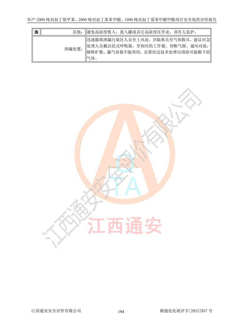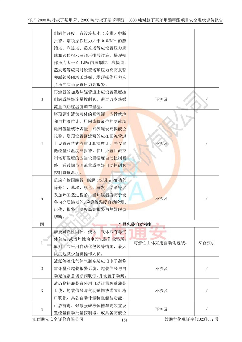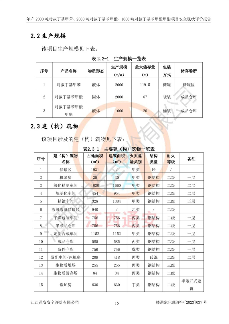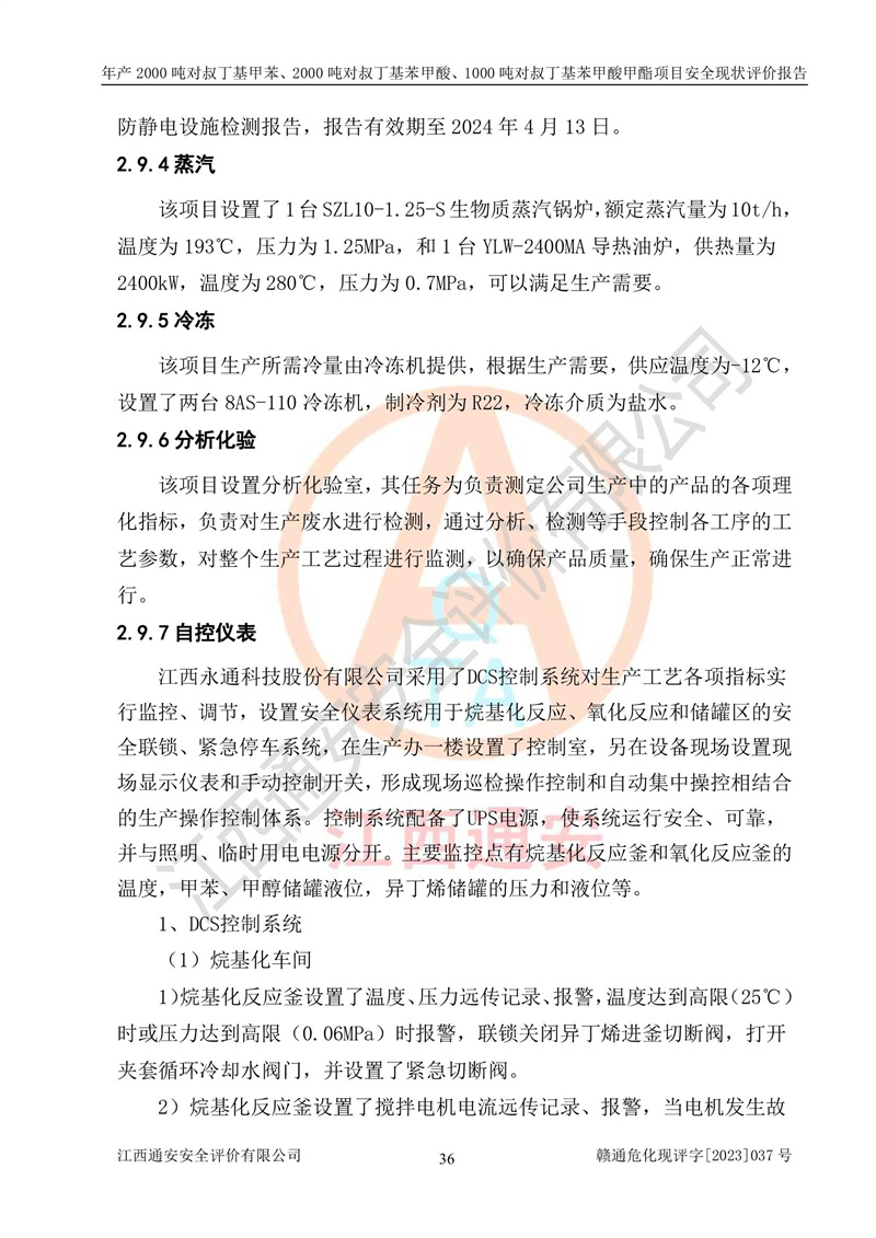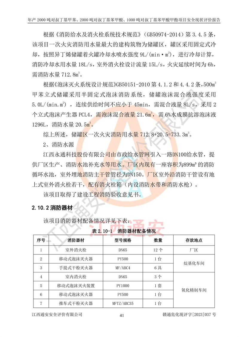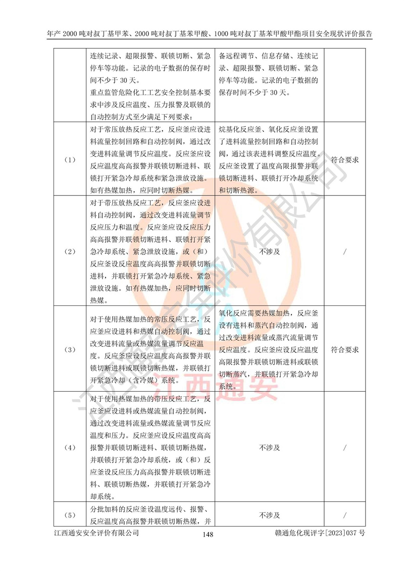 江西永通科技股份有限公司位于江西省贛州市寧都縣工業(yè)園,法定**人為劉忠春,成立于2009年09月25日,注冊資本玖仟陸佰肆拾陸萬陸仟元整,營業(yè)執(zhí)照經(jīng)營范圍為化學(xué)原料藥、醫(yī)藥中間體等研發(fā)、生產(chǎn)、銷售等。 江西永通科技股份有限公司2020年10月26日取得了《安全生產(chǎn)許可證》,許可證編號:(贛)WH安許證字[2011]0642號,許可范圍為對叔丁基甲苯(2kt/a)、對叔丁基苯甲酸(2kt/a)、對叔丁基苯甲酸甲酯(1kt/a),**期:2020年10月26日至2023年10月25日。該公司2021年10月22日取得了安全生產(chǎn)標(biāo)準(zhǔn)化證書,證書編號:贛市AQBWHⅢ[2021]168,**期至2024年10月21日。該公司現(xiàn)有員工133人,其中專職安全管理人員3人。 江西永通科技股份有限公司年產(chǎn)2000噸對叔丁基甲苯、2000噸對叔丁基苯甲酸、1000噸對叔丁基苯甲酸甲酯項(xiàng)目生產(chǎn)過程中涉及的原輔材料為甲苯、異丁烯、液氧(氧氣)、甲醇、濃硫酸、液堿(氫氧化鈉)、活性炭、硅藻土、氧化催化劑和氮?dú)?,產(chǎn)品為對叔丁基甲苯、對叔丁基苯甲酸和對叔丁基苯甲酸甲酯。根據(jù)《危險(xiǎn)化學(xué)品目錄》,該項(xiàng)目涉及的甲苯、異丁烯、液氧(氧氣)、甲醇、濃硫酸、液堿(氫氧化鈉)和氮?dú)鈱儆?/span>危險(xiǎn)化學(xué)品。經(jīng)辨識,甲苯和甲醇屬于重點(diǎn)監(jiān)管的危險(xiǎn)化學(xué)品,甲苯和硫酸屬于第三類易制毒化學(xué)品、甲醇屬于特別管控的危險(xiǎn)化學(xué)品,不涉及監(jiān)控化學(xué)品、易制爆危險(xiǎn)化學(xué)品、劇毒化學(xué)品和高毒物品,儲罐區(qū)構(gòu)成三級重大危險(xiǎn)源,其他生產(chǎn)、儲存單元不構(gòu)成危險(xiǎn)化學(xué)品重大危險(xiǎn)源,涉及的烷基化反應(yīng)和氧化反應(yīng)屬于重點(diǎn)監(jiān)管的危險(xiǎn)化工工藝。根據(jù)《安全生產(chǎn)許可證條例》、《危險(xiǎn)化學(xué)品安全管理?xiàng)l例》和《危險(xiǎn)化學(xué)品生產(chǎn)企業(yè)安全生產(chǎn)許可實(shí)施辦法》的相關(guān)規(guī)定,該項(xiàng)目涉及甲苯回收,需要辦理危險(xiǎn)化學(xué)品安全生產(chǎn)許可證。根據(jù)生產(chǎn)工藝特點(diǎn)及物料的理化特性可知,該項(xiàng)目生產(chǎn)過程中存在火災(zāi)與爆炸、中毒與窒息、觸電、機(jī)械傷害等危險(xiǎn)有害因素。 該公司自2020年10月26日取得安全生產(chǎn)許可證以來,生產(chǎn)運(yùn)行正常,未發(fā)生一般及以上生產(chǎn)安全事故。 |