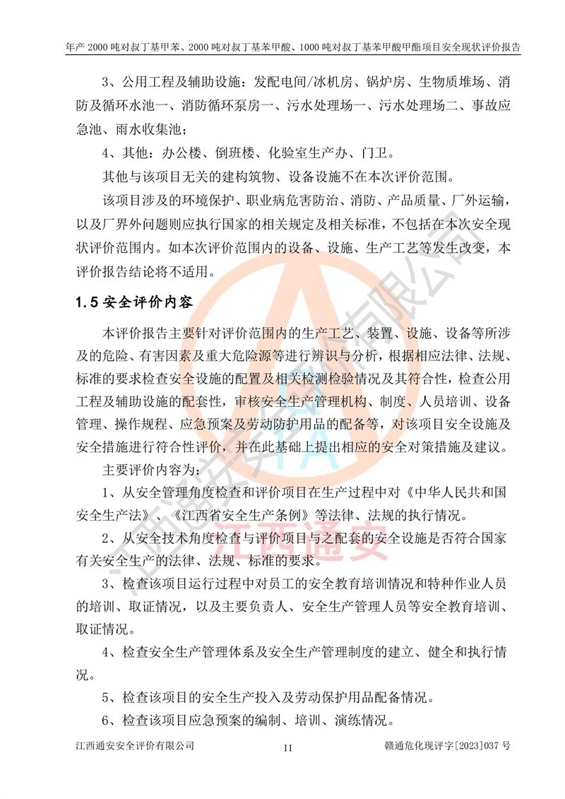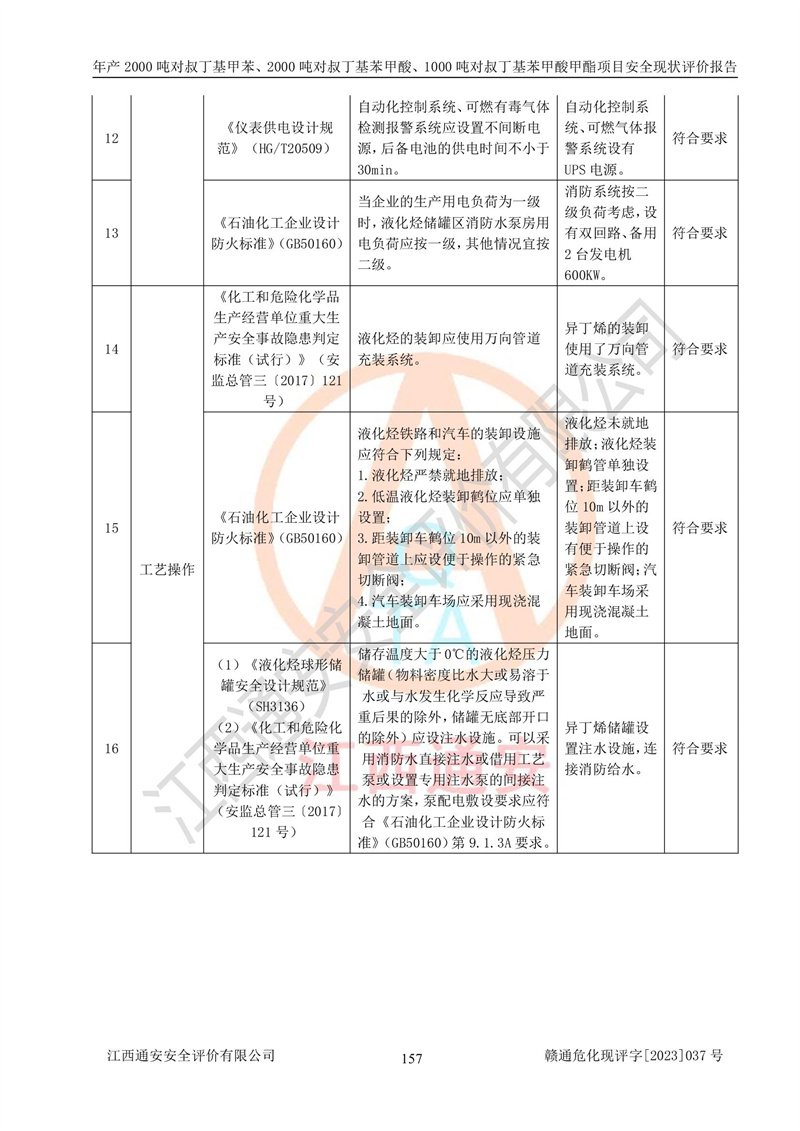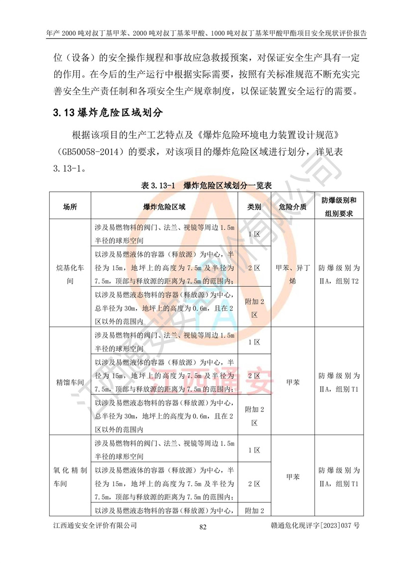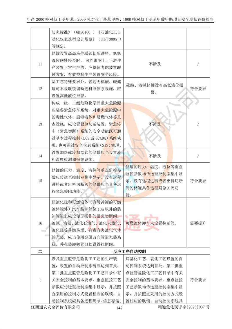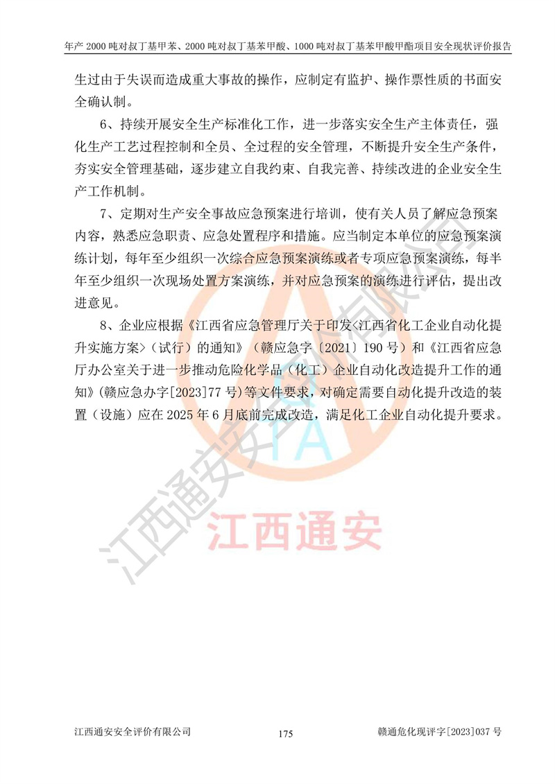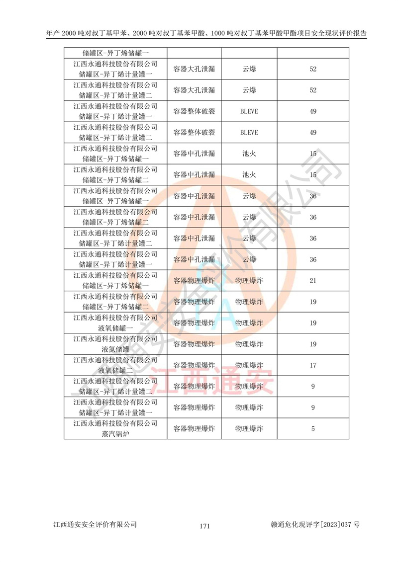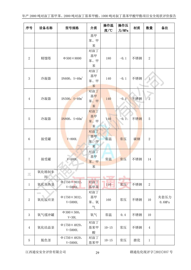 江西永通科技股份有限公司位于江西省贛州市寧都縣工業(yè)園,法定**人為劉忠春,成立于2009年09月25日,注冊資本玖仟陸佰肆拾陸萬陸仟元整,營業(yè)執(zhí)照經(jīng)營范圍為化學(xué)原料藥、醫(yī)藥中間體等研發(fā)、生產(chǎn)、銷售等。 江西永通科技股份有限公司2020年10月26日取得了《安全生產(chǎn)許可證》,許可證編號:(贛)WH安許證字[2011]0642號,許可范圍為對叔丁基甲苯(2kt/a)、對叔丁基苯甲酸(2kt/a)、對叔丁基苯甲酸甲酯(1kt/a),**期:2020年10月26日至2023年10月25日。該公司2021年10月22日取得了安全生產(chǎn)標(biāo)準(zhǔn)化證書,證書編號:贛市AQBWHⅢ[2021]168,**期至2024年10月21日。該公司現(xiàn)有員工133人,其中專職安全管理人員3人。 江西永通科技股份有限公司年產(chǎn)2000噸對叔丁基甲苯、2000噸對叔丁基苯甲酸、1000噸對叔丁基苯甲酸甲酯項(xiàng)目生產(chǎn)過程中涉及的原輔材料為甲苯、異丁烯、液氧(氧氣)、甲醇、濃硫酸、液堿(氫氧化鈉)、活性炭、硅藻土、氧化催化劑和氮?dú)?,產(chǎn)品為對叔丁基甲苯、對叔丁基苯甲酸和對叔丁基苯甲酸甲酯。根據(jù)《危險(xiǎn)化學(xué)品目錄》,該項(xiàng)目涉及的甲苯、異丁烯、液氧(氧氣)、甲醇、濃硫酸、液堿(氫氧化鈉)和氮?dú)鈱儆?/span>危險(xiǎn)化學(xué)品。經(jīng)辨識,甲苯和甲醇屬于重點(diǎn)監(jiān)管的危險(xiǎn)化學(xué)品,甲苯和硫酸屬于第三類易制毒化學(xué)品、甲醇屬于特別管控的危險(xiǎn)化學(xué)品,不涉及監(jiān)控化學(xué)品、易制爆危險(xiǎn)化學(xué)品、劇毒化學(xué)品和高毒物品,儲罐區(qū)構(gòu)成三級重大危險(xiǎn)源,其他生產(chǎn)、儲存單元不構(gòu)成危險(xiǎn)化學(xué)品重大危險(xiǎn)源,涉及的烷基化反應(yīng)和氧化反應(yīng)屬于重點(diǎn)監(jiān)管的危險(xiǎn)化工工藝。根據(jù)《安全生產(chǎn)許可證條例》、《危險(xiǎn)化學(xué)品安全管理?xiàng)l例》和《危險(xiǎn)化學(xué)品生產(chǎn)企業(yè)安全生產(chǎn)許可實(shí)施辦法》的相關(guān)規(guī)定,該項(xiàng)目涉及甲苯回收,需要辦理危險(xiǎn)化學(xué)品安全生產(chǎn)許可證。根據(jù)生產(chǎn)工藝特點(diǎn)及物料的理化特性可知,該項(xiàng)目生產(chǎn)過程中存在火災(zāi)與爆炸、中毒與窒息、觸電、機(jī)械傷害等危險(xiǎn)有害因素。 該公司自2020年10月26日取得安全生產(chǎn)許可證以來,生產(chǎn)運(yùn)行正常,未發(fā)生一般及以上生產(chǎn)安全事故。 |