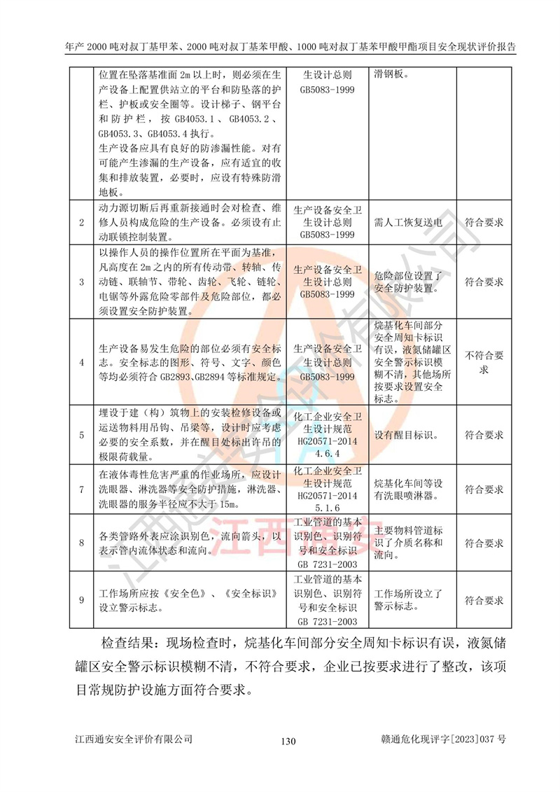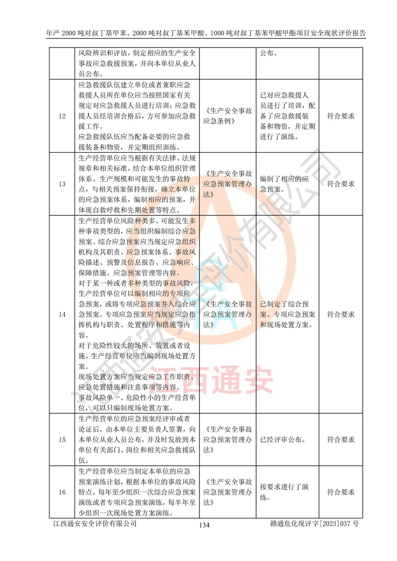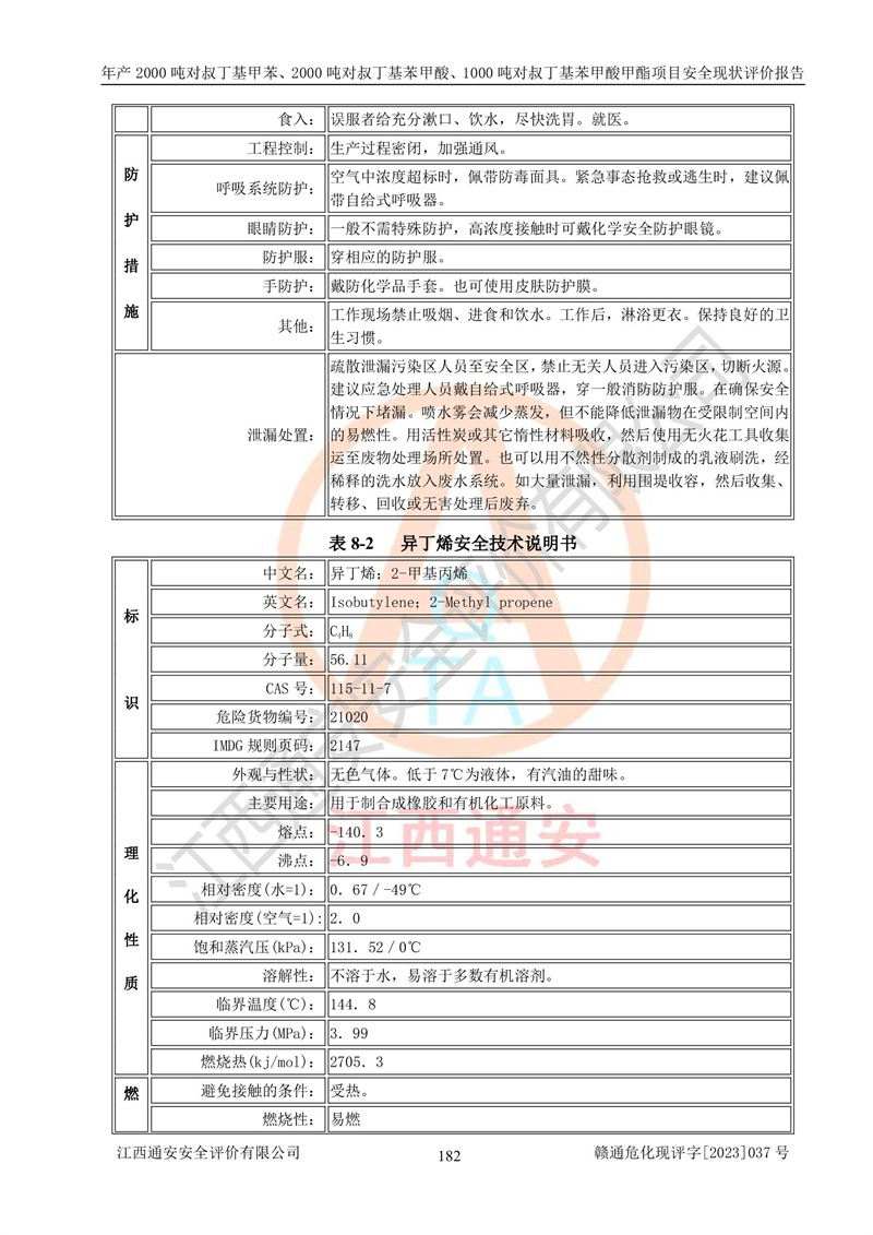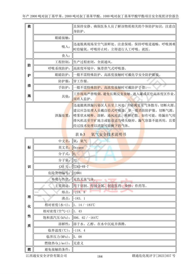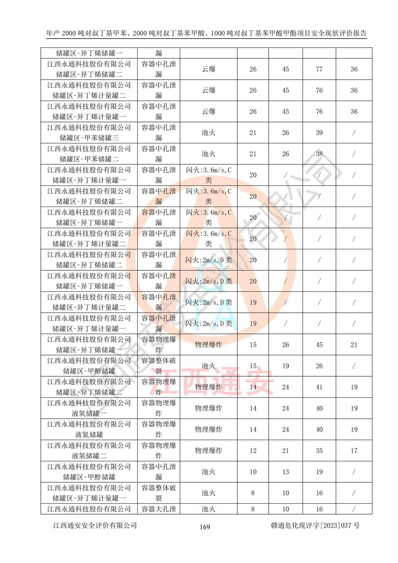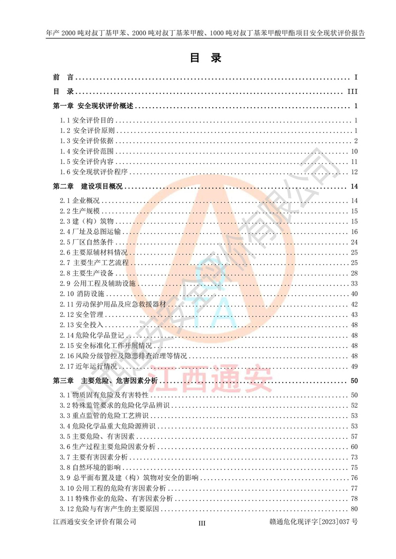 江西永通科技股份有限公司位于江西省贛州市寧都縣工業(yè)園,法定**人為劉忠春,成立于2009年09月25日,注冊資本玖仟陸佰肆拾陸萬陸仟元整,營業(yè)執(zhí)照經(jīng)營范圍為化學(xué)原料藥、醫(yī)藥中間體等研發(fā)、生產(chǎn)、銷售等。 江西永通科技股份有限公司2020年10月26日取得了《安全生產(chǎn)許可證》,許可證編號:(贛)WH安許證字[2011]0642號,許可范圍為對叔丁基甲苯(2kt/a)、對叔丁基苯甲酸(2kt/a)、對叔丁基苯甲酸甲酯(1kt/a),**期:2020年10月26日至2023年10月25日。該公司2021年10月22日取得了安全生產(chǎn)標(biāo)準(zhǔn)化證書,證書編號:贛市AQBWHⅢ[2021]168,**期至2024年10月21日。該公司現(xiàn)有員工133人,其中專職安全管理人員3人。 江西永通科技股份有限公司年產(chǎn)2000噸對叔丁基甲苯、2000噸對叔丁基苯甲酸、1000噸對叔丁基苯甲酸甲酯項(xiàng)目生產(chǎn)過程中涉及的原輔材料為甲苯、異丁烯、液氧(氧氣)、甲醇、濃硫酸、液堿(氫氧化鈉)、活性炭、硅藻土、氧化催化劑和氮?dú)?,產(chǎn)品為對叔丁基甲苯、對叔丁基苯甲酸和對叔丁基苯甲酸甲酯。根據(jù)《危險(xiǎn)化學(xué)品目錄》,該項(xiàng)目涉及的甲苯、異丁烯、液氧(氧氣)、甲醇、濃硫酸、液堿(氫氧化鈉)和氮?dú)鈱儆?/span>危險(xiǎn)化學(xué)品。經(jīng)辨識,甲苯和甲醇屬于重點(diǎn)監(jiān)管的危險(xiǎn)化學(xué)品,甲苯和硫酸屬于第三類易制毒化學(xué)品、甲醇屬于特別管控的危險(xiǎn)化學(xué)品,不涉及監(jiān)控化學(xué)品、易制爆危險(xiǎn)化學(xué)品、劇毒化學(xué)品和高毒物品,儲罐區(qū)構(gòu)成三級重大危險(xiǎn)源,其他生產(chǎn)、儲存單元不構(gòu)成危險(xiǎn)化學(xué)品重大危險(xiǎn)源,涉及的烷基化反應(yīng)和氧化反應(yīng)屬于重點(diǎn)監(jiān)管的危險(xiǎn)化工工藝。根據(jù)《安全生產(chǎn)許可證條例》、《危險(xiǎn)化學(xué)品安全管理?xiàng)l例》和《危險(xiǎn)化學(xué)品生產(chǎn)企業(yè)安全生產(chǎn)許可實(shí)施辦法》的相關(guān)規(guī)定,該項(xiàng)目涉及甲苯回收,需要辦理危險(xiǎn)化學(xué)品安全生產(chǎn)許可證。根據(jù)生產(chǎn)工藝特點(diǎn)及物料的理化特性可知,該項(xiàng)目生產(chǎn)過程中存在火災(zāi)與爆炸、中毒與窒息、觸電、機(jī)械傷害等危險(xiǎn)有害因素。 該公司自2020年10月26日取得安全生產(chǎn)許可證以來,生產(chǎn)運(yùn)行正常,未發(fā)生一般及以上生產(chǎn)安全事故。 |