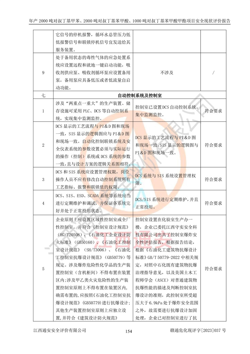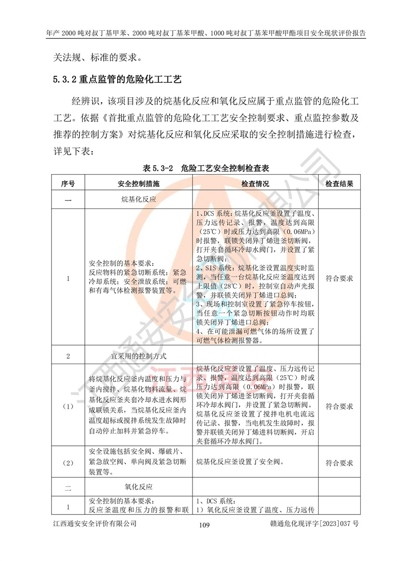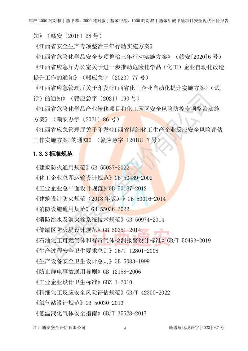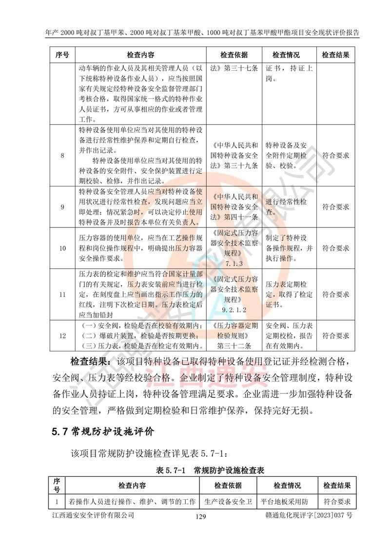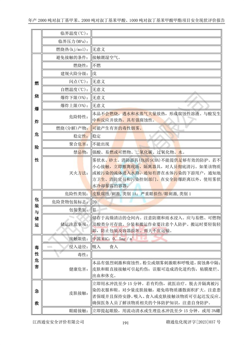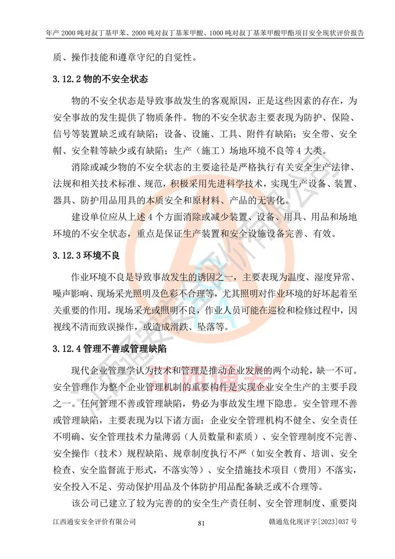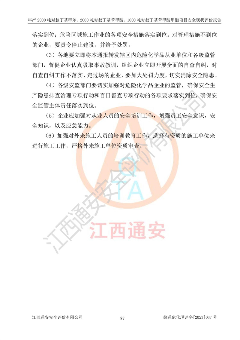 江西永通科技股份有限公司位于江西省贛州市寧都縣工業(yè)園,法定**人為劉忠春,成立于2009年09月25日,注冊資本玖仟陸佰肆拾陸萬陸仟元整,營業(yè)執(zhí)照經(jīng)營范圍為化學(xué)原料藥、醫(yī)藥中間體等研發(fā)、生產(chǎn)、銷售等。 江西永通科技股份有限公司2020年10月26日取得了《安全生產(chǎn)許可證》,許可證編號:(贛)WH安許證字[2011]0642號,許可范圍為對叔丁基甲苯(2kt/a)、對叔丁基苯甲酸(2kt/a)、對叔丁基苯甲酸甲酯(1kt/a),**期:2020年10月26日至2023年10月25日。該公司2021年10月22日取得了安全生產(chǎn)標(biāo)準(zhǔn)化證書,證書編號:贛市AQBWHⅢ[2021]168,**期至2024年10月21日。該公司現(xiàn)有員工133人,其中專職安全管理人員3人。 江西永通科技股份有限公司年產(chǎn)2000噸對叔丁基甲苯、2000噸對叔丁基苯甲酸、1000噸對叔丁基苯甲酸甲酯項(xiàng)目生產(chǎn)過程中涉及的原輔材料為甲苯、異丁烯、液氧(氧氣)、甲醇、濃硫酸、液堿(氫氧化鈉)、活性炭、硅藻土、氧化催化劑和氮?dú)?,產(chǎn)品為對叔丁基甲苯、對叔丁基苯甲酸和對叔丁基苯甲酸甲酯。根據(jù)《危險(xiǎn)化學(xué)品目錄》,該項(xiàng)目涉及的甲苯、異丁烯、液氧(氧氣)、甲醇、濃硫酸、液堿(氫氧化鈉)和氮?dú)鈱儆?/span>危險(xiǎn)化學(xué)品。經(jīng)辨識,甲苯和甲醇屬于重點(diǎn)監(jiān)管的危險(xiǎn)化學(xué)品,甲苯和硫酸屬于第三類易制毒化學(xué)品、甲醇屬于特別管控的危險(xiǎn)化學(xué)品,不涉及監(jiān)控化學(xué)品、易制爆危險(xiǎn)化學(xué)品、劇毒化學(xué)品和高毒物品,儲罐區(qū)構(gòu)成三級重大危險(xiǎn)源,其他生產(chǎn)、儲存單元不構(gòu)成危險(xiǎn)化學(xué)品重大危險(xiǎn)源,涉及的烷基化反應(yīng)和氧化反應(yīng)屬于重點(diǎn)監(jiān)管的危險(xiǎn)化工工藝。根據(jù)《安全生產(chǎn)許可證條例》、《危險(xiǎn)化學(xué)品安全管理?xiàng)l例》和《危險(xiǎn)化學(xué)品生產(chǎn)企業(yè)安全生產(chǎn)許可實(shí)施辦法》的相關(guān)規(guī)定,該項(xiàng)目涉及甲苯回收,需要辦理危險(xiǎn)化學(xué)品安全生產(chǎn)許可證。根據(jù)生產(chǎn)工藝特點(diǎn)及物料的理化特性可知,該項(xiàng)目生產(chǎn)過程中存在火災(zāi)與爆炸、中毒與窒息、觸電、機(jī)械傷害等危險(xiǎn)有害因素。 該公司自2020年10月26日取得安全生產(chǎn)許可證以來,生產(chǎn)運(yùn)行正常,未發(fā)生一般及以上生產(chǎn)安全事故。 |
