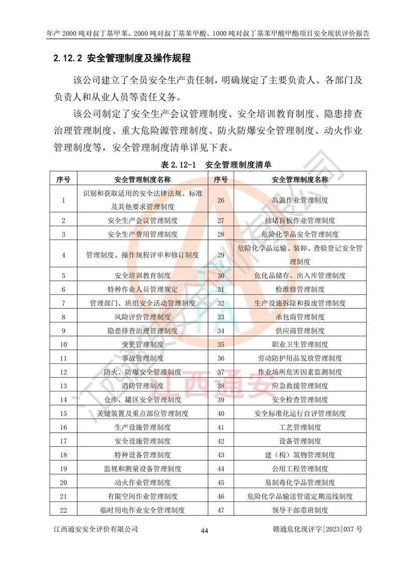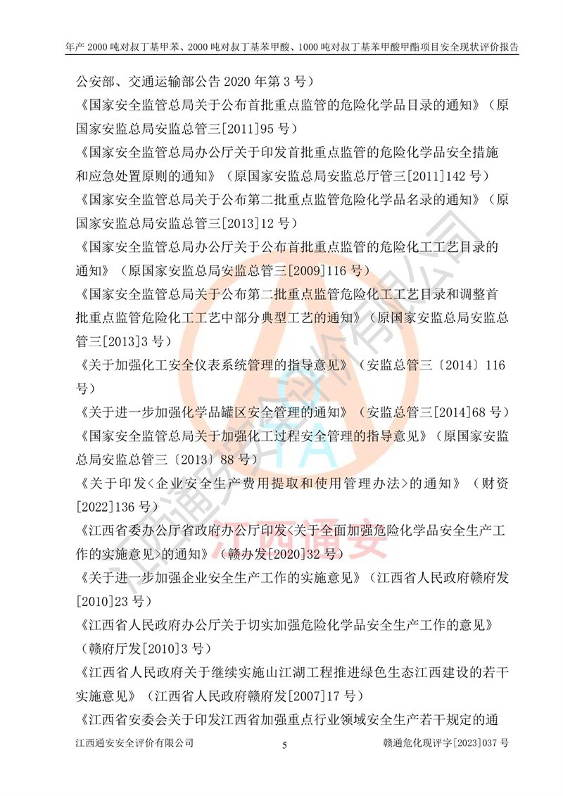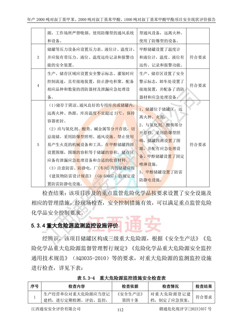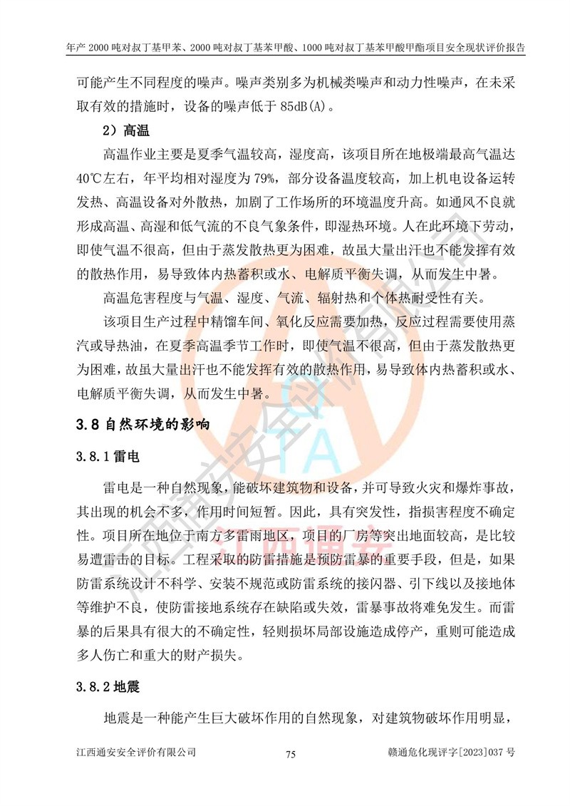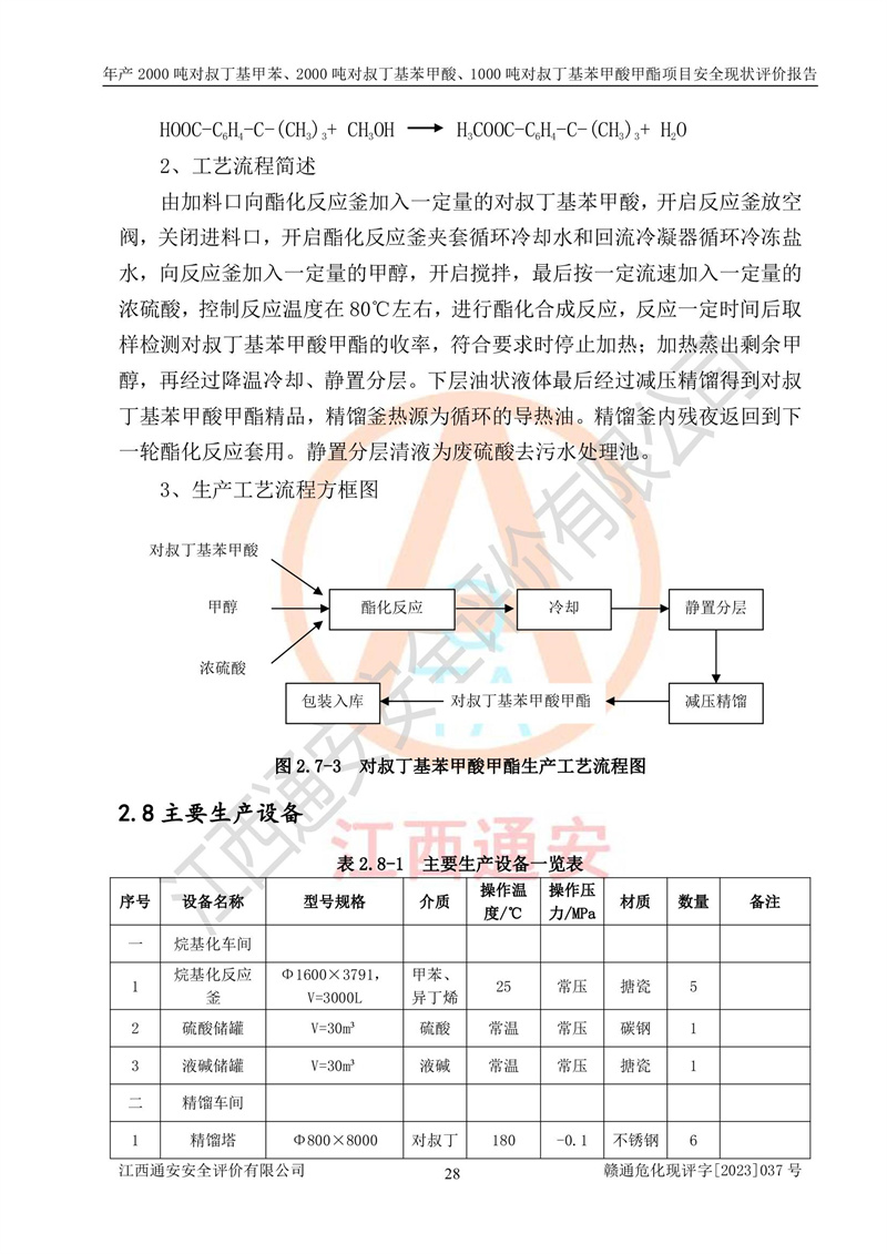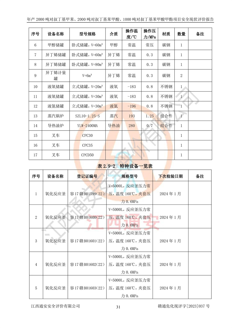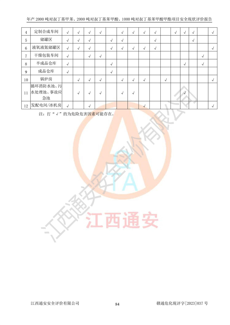 江西永通科技股份有限公司位于江西省贛州市寧都縣工業(yè)園,法定**人為劉忠春,成立于2009年09月25日,注冊資本玖仟陸佰肆拾陸萬陸仟元整,營業(yè)執(zhí)照經(jīng)營范圍為化學(xué)原料藥、醫(yī)藥中間體等研發(fā)、生產(chǎn)、銷售等。 江西永通科技股份有限公司2020年10月26日取得了《安全生產(chǎn)許可證》,許可證編號:(贛)WH安許證字[2011]0642號,許可范圍為對叔丁基甲苯(2kt/a)、對叔丁基苯甲酸(2kt/a)、對叔丁基苯甲酸甲酯(1kt/a),**期:2020年10月26日至2023年10月25日。該公司2021年10月22日取得了安全生產(chǎn)標(biāo)準(zhǔn)化證書,證書編號:贛市AQBWHⅢ[2021]168,**期至2024年10月21日。該公司現(xiàn)有員工133人,其中專職安全管理人員3人。 江西永通科技股份有限公司年產(chǎn)2000噸對叔丁基甲苯、2000噸對叔丁基苯甲酸、1000噸對叔丁基苯甲酸甲酯項(xiàng)目生產(chǎn)過程中涉及的原輔材料為甲苯、異丁烯、液氧(氧氣)、甲醇、濃硫酸、液堿(氫氧化鈉)、活性炭、硅藻土、氧化催化劑和氮?dú)?,產(chǎn)品為對叔丁基甲苯、對叔丁基苯甲酸和對叔丁基苯甲酸甲酯。根據(jù)《危險(xiǎn)化學(xué)品目錄》,該項(xiàng)目涉及的甲苯、異丁烯、液氧(氧氣)、甲醇、濃硫酸、液堿(氫氧化鈉)和氮?dú)鈱儆?/span>危險(xiǎn)化學(xué)品。經(jīng)辨識,甲苯和甲醇屬于重點(diǎn)監(jiān)管的危險(xiǎn)化學(xué)品,甲苯和硫酸屬于第三類易制毒化學(xué)品、甲醇屬于特別管控的危險(xiǎn)化學(xué)品,不涉及監(jiān)控化學(xué)品、易制爆危險(xiǎn)化學(xué)品、劇毒化學(xué)品和高毒物品,儲罐區(qū)構(gòu)成三級重大危險(xiǎn)源,其他生產(chǎn)、儲存單元不構(gòu)成危險(xiǎn)化學(xué)品重大危險(xiǎn)源,涉及的烷基化反應(yīng)和氧化反應(yīng)屬于重點(diǎn)監(jiān)管的危險(xiǎn)化工工藝。根據(jù)《安全生產(chǎn)許可證條例》、《危險(xiǎn)化學(xué)品安全管理?xiàng)l例》和《危險(xiǎn)化學(xué)品生產(chǎn)企業(yè)安全生產(chǎn)許可實(shí)施辦法》的相關(guān)規(guī)定,該項(xiàng)目涉及甲苯回收,需要辦理危險(xiǎn)化學(xué)品安全生產(chǎn)許可證。根據(jù)生產(chǎn)工藝特點(diǎn)及物料的理化特性可知,該項(xiàng)目生產(chǎn)過程中存在火災(zāi)與爆炸、中毒與窒息、觸電、機(jī)械傷害等危險(xiǎn)有害因素。 該公司自2020年10月26日取得安全生產(chǎn)許可證以來,生產(chǎn)運(yùn)行正常,未發(fā)生一般及以上生產(chǎn)安全事故。 |
