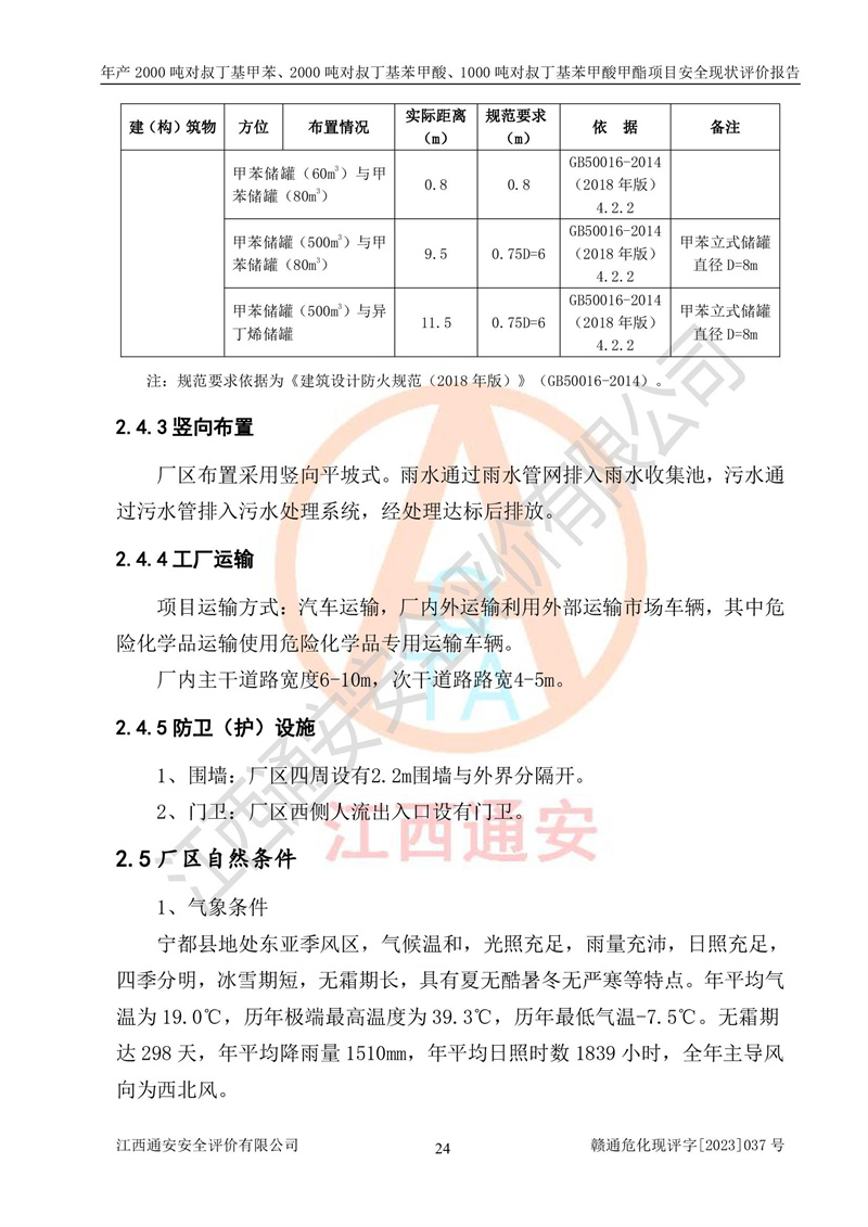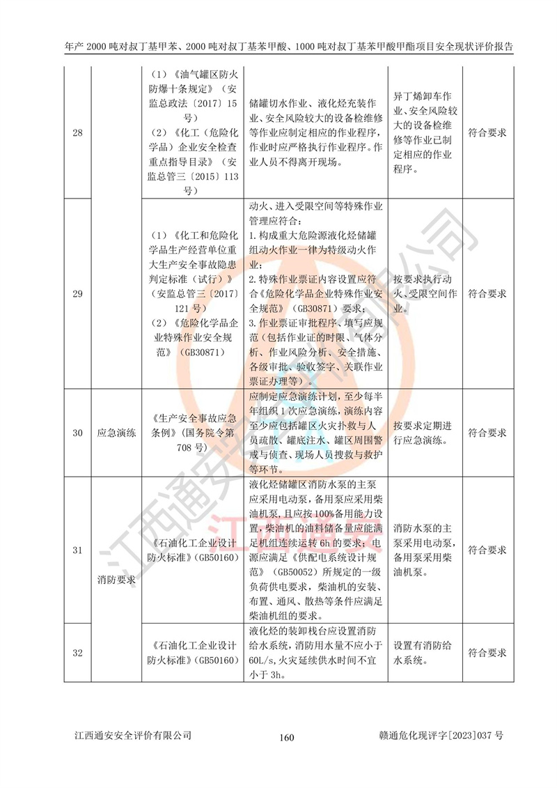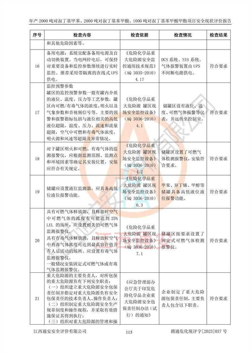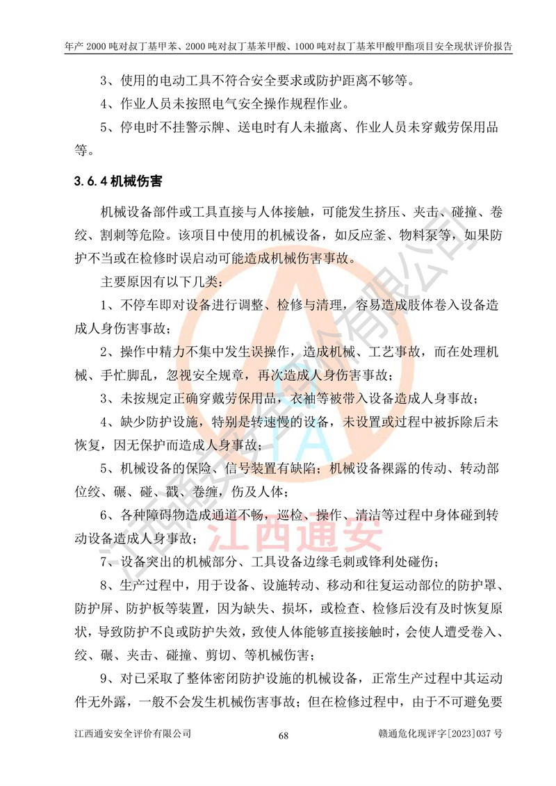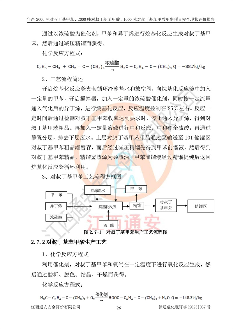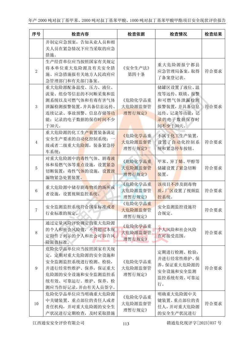 江西永通科技股份有限公司位于江西省贛州市寧都縣工業(yè)園,法定**人為劉忠春,成立于2009年09月25日,注冊資本玖仟陸佰肆拾陸萬陸仟元整,營業(yè)執(zhí)照經(jīng)營范圍為化學(xué)原料藥、醫(yī)藥中間體等研發(fā)、生產(chǎn)、銷售等。 江西永通科技股份有限公司2020年10月26日取得了《安全生產(chǎn)許可證》,許可證編號:(贛)WH安許證字[2011]0642號,許可范圍為對叔丁基甲苯(2kt/a)、對叔丁基苯甲酸(2kt/a)、對叔丁基苯甲酸甲酯(1kt/a),**期:2020年10月26日至2023年10月25日。該公司2021年10月22日取得了安全生產(chǎn)標(biāo)準(zhǔn)化證書,證書編號:贛市AQBWHⅢ[2021]168,**期至2024年10月21日。該公司現(xiàn)有員工133人,其中專職安全管理人員3人。 江西永通科技股份有限公司年產(chǎn)2000噸對叔丁基甲苯、2000噸對叔丁基苯甲酸、1000噸對叔丁基苯甲酸甲酯項(xiàng)目生產(chǎn)過程中涉及的原輔材料為甲苯、異丁烯、液氧(氧氣)、甲醇、濃硫酸、液堿(氫氧化鈉)、活性炭、硅藻土、氧化催化劑和氮?dú)?,產(chǎn)品為對叔丁基甲苯、對叔丁基苯甲酸和對叔丁基苯甲酸甲酯。根據(jù)《危險(xiǎn)化學(xué)品目錄》,該項(xiàng)目涉及的甲苯、異丁烯、液氧(氧氣)、甲醇、濃硫酸、液堿(氫氧化鈉)和氮?dú)鈱儆?/span>危險(xiǎn)化學(xué)品。經(jīng)辨識,甲苯和甲醇屬于重點(diǎn)監(jiān)管的危險(xiǎn)化學(xué)品,甲苯和硫酸屬于第三類易制毒化學(xué)品、甲醇屬于特別管控的危險(xiǎn)化學(xué)品,不涉及監(jiān)控化學(xué)品、易制爆危險(xiǎn)化學(xué)品、劇毒化學(xué)品和高毒物品,儲罐區(qū)構(gòu)成三級重大危險(xiǎn)源,其他生產(chǎn)、儲存單元不構(gòu)成危險(xiǎn)化學(xué)品重大危險(xiǎn)源,涉及的烷基化反應(yīng)和氧化反應(yīng)屬于重點(diǎn)監(jiān)管的危險(xiǎn)化工工藝。根據(jù)《安全生產(chǎn)許可證條例》、《危險(xiǎn)化學(xué)品安全管理?xiàng)l例》和《危險(xiǎn)化學(xué)品生產(chǎn)企業(yè)安全生產(chǎn)許可實(shí)施辦法》的相關(guān)規(guī)定,該項(xiàng)目涉及甲苯回收,需要辦理危險(xiǎn)化學(xué)品安全生產(chǎn)許可證。根據(jù)生產(chǎn)工藝特點(diǎn)及物料的理化特性可知,該項(xiàng)目生產(chǎn)過程中存在火災(zāi)與爆炸、中毒與窒息、觸電、機(jī)械傷害等危險(xiǎn)有害因素。 該公司自2020年10月26日取得安全生產(chǎn)許可證以來,生產(chǎn)運(yùn)行正常,未發(fā)生一般及以上生產(chǎn)安全事故。 |