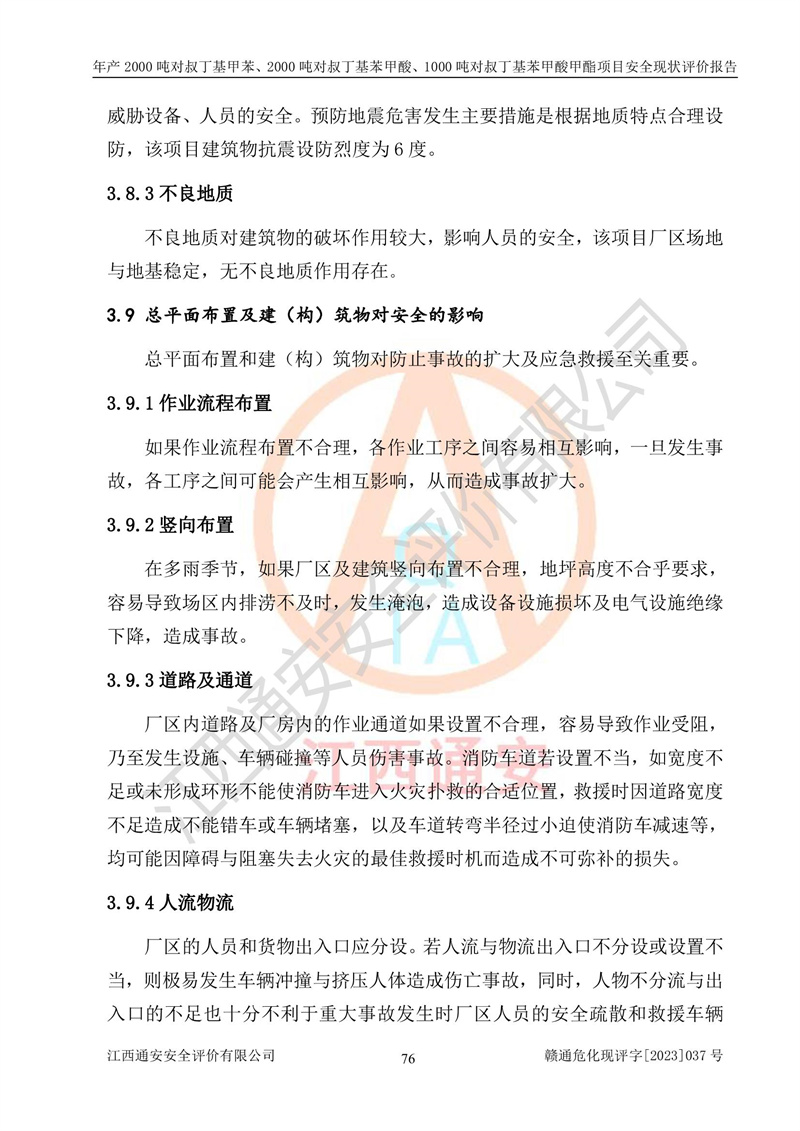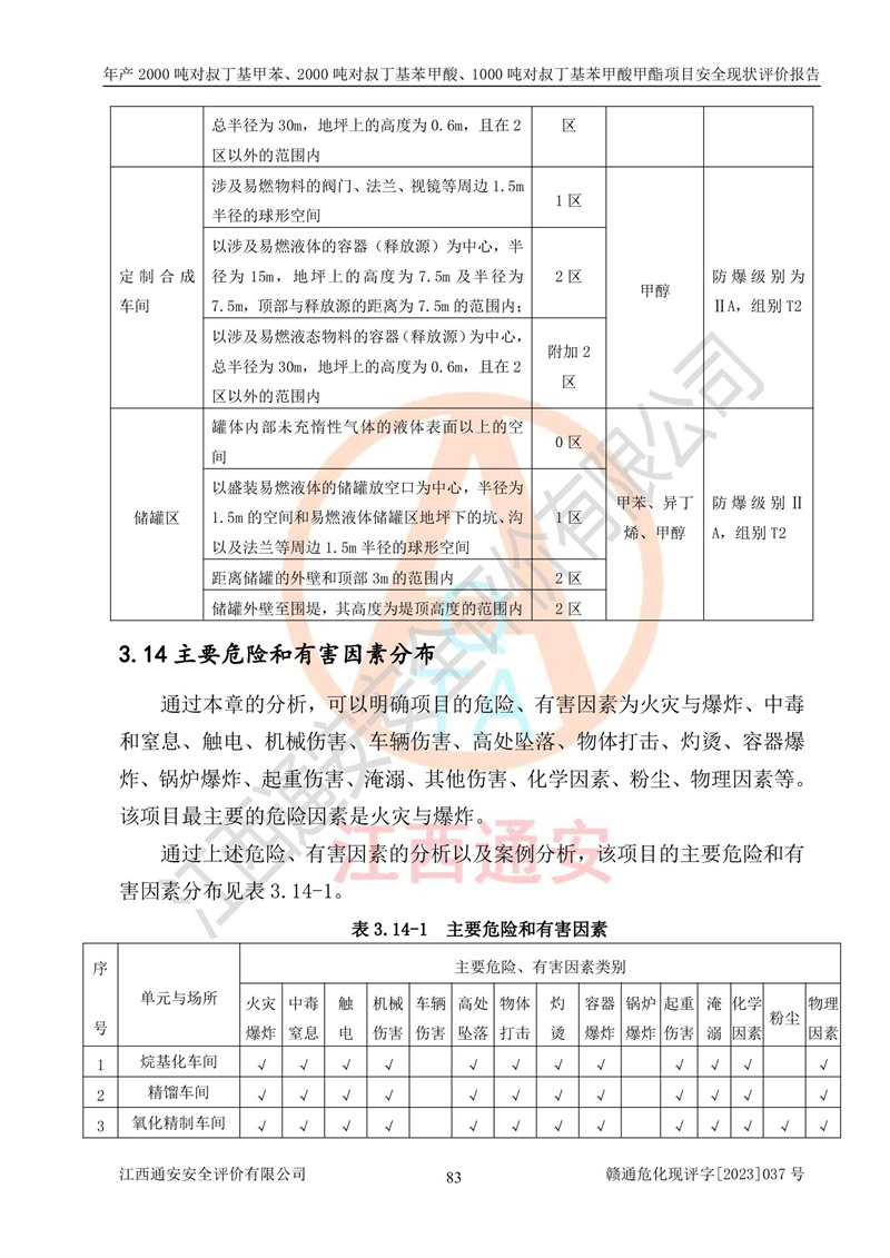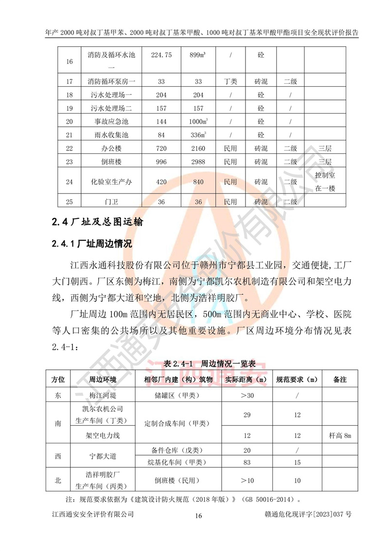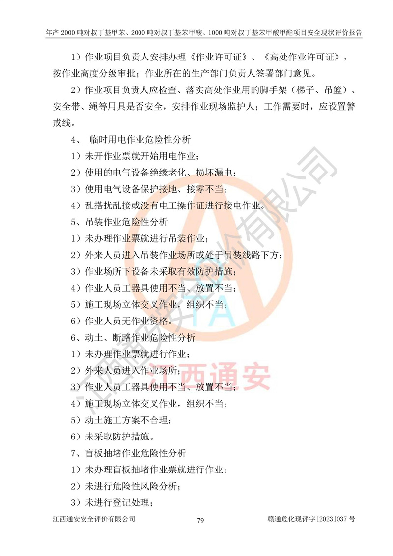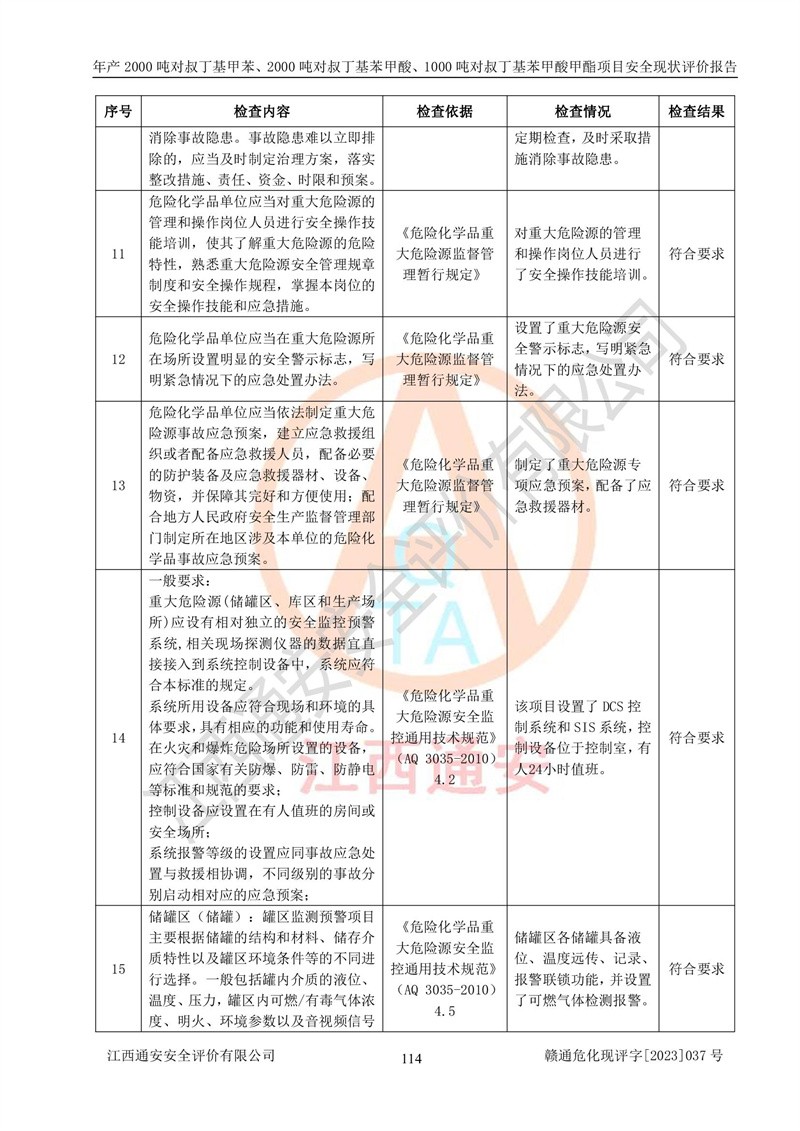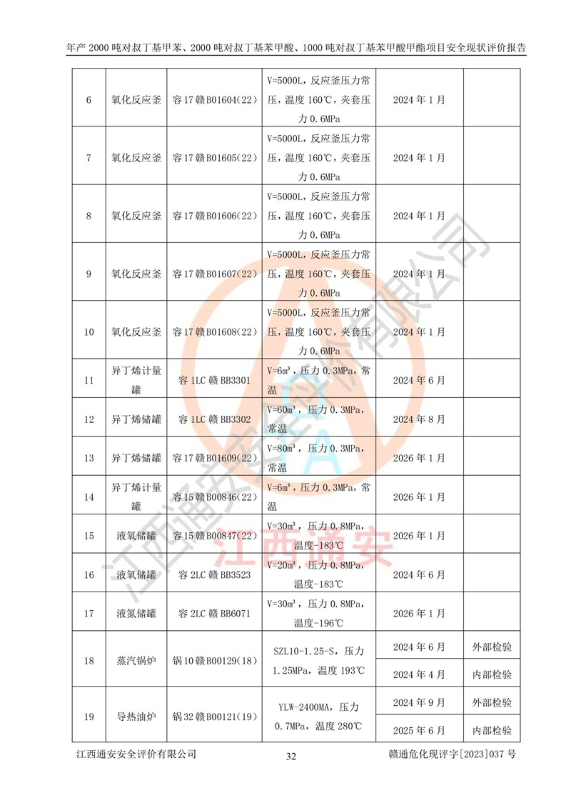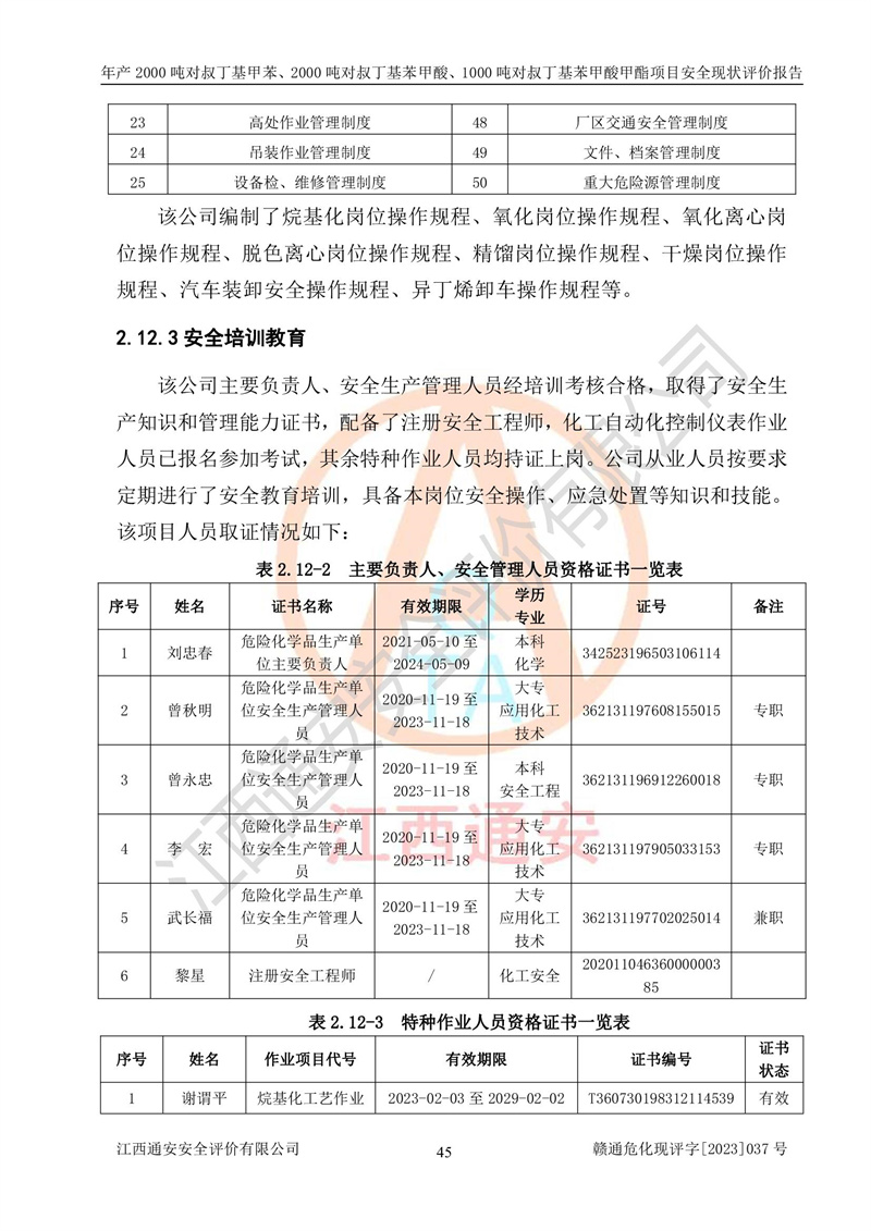 江西永通科技股份有限公司位于江西省贛州市寧都縣工業(yè)園,法定**人為劉忠春,成立于2009年09月25日,注冊資本玖仟陸佰肆拾陸萬陸仟元整,營業(yè)執(zhí)照經(jīng)營范圍為化學(xué)原料藥、醫(yī)藥中間體等研發(fā)、生產(chǎn)、銷售等。 江西永通科技股份有限公司2020年10月26日取得了《安全生產(chǎn)許可證》,許可證編號:(贛)WH安許證字[2011]0642號,許可范圍為對叔丁基甲苯(2kt/a)、對叔丁基苯甲酸(2kt/a)、對叔丁基苯甲酸甲酯(1kt/a),**期:2020年10月26日至2023年10月25日。該公司2021年10月22日取得了安全生產(chǎn)標(biāo)準(zhǔn)化證書,證書編號:贛市AQBWHⅢ[2021]168,**期至2024年10月21日。該公司現(xiàn)有員工133人,其中專職安全管理人員3人。 江西永通科技股份有限公司年產(chǎn)2000噸對叔丁基甲苯、2000噸對叔丁基苯甲酸、1000噸對叔丁基苯甲酸甲酯項(xiàng)目生產(chǎn)過程中涉及的原輔材料為甲苯、異丁烯、液氧(氧氣)、甲醇、濃硫酸、液堿(氫氧化鈉)、活性炭、硅藻土、氧化催化劑和氮?dú)?,產(chǎn)品為對叔丁基甲苯、對叔丁基苯甲酸和對叔丁基苯甲酸甲酯。根據(jù)《危險(xiǎn)化學(xué)品目錄》,該項(xiàng)目涉及的甲苯、異丁烯、液氧(氧氣)、甲醇、濃硫酸、液堿(氫氧化鈉)和氮?dú)鈱儆?/span>危險(xiǎn)化學(xué)品。經(jīng)辨識,甲苯和甲醇屬于重點(diǎn)監(jiān)管的危險(xiǎn)化學(xué)品,甲苯和硫酸屬于第三類易制毒化學(xué)品、甲醇屬于特別管控的危險(xiǎn)化學(xué)品,不涉及監(jiān)控化學(xué)品、易制爆危險(xiǎn)化學(xué)品、劇毒化學(xué)品和高毒物品,儲罐區(qū)構(gòu)成三級重大危險(xiǎn)源,其他生產(chǎn)、儲存單元不構(gòu)成危險(xiǎn)化學(xué)品重大危險(xiǎn)源,涉及的烷基化反應(yīng)和氧化反應(yīng)屬于重點(diǎn)監(jiān)管的危險(xiǎn)化工工藝。根據(jù)《安全生產(chǎn)許可證條例》、《危險(xiǎn)化學(xué)品安全管理?xiàng)l例》和《危險(xiǎn)化學(xué)品生產(chǎn)企業(yè)安全生產(chǎn)許可實(shí)施辦法》的相關(guān)規(guī)定,該項(xiàng)目涉及甲苯回收,需要辦理危險(xiǎn)化學(xué)品安全生產(chǎn)許可證。根據(jù)生產(chǎn)工藝特點(diǎn)及物料的理化特性可知,該項(xiàng)目生產(chǎn)過程中存在火災(zāi)與爆炸、中毒與窒息、觸電、機(jī)械傷害等危險(xiǎn)有害因素。 該公司自2020年10月26日取得安全生產(chǎn)許可證以來,生產(chǎn)運(yùn)行正常,未發(fā)生一般及以上生產(chǎn)安全事故。 |
