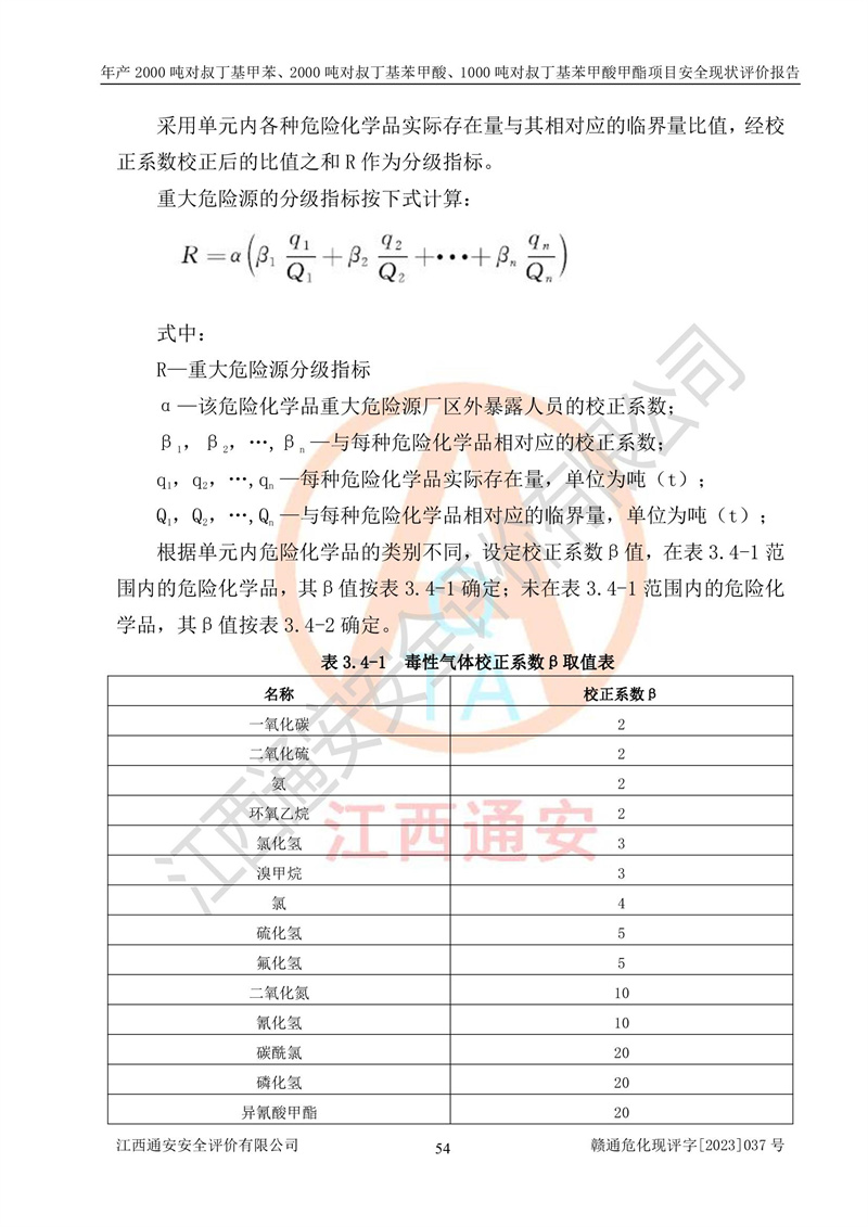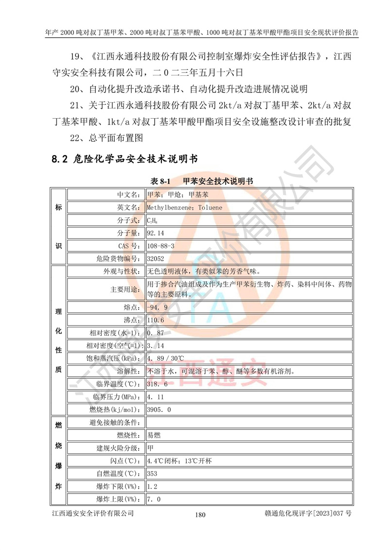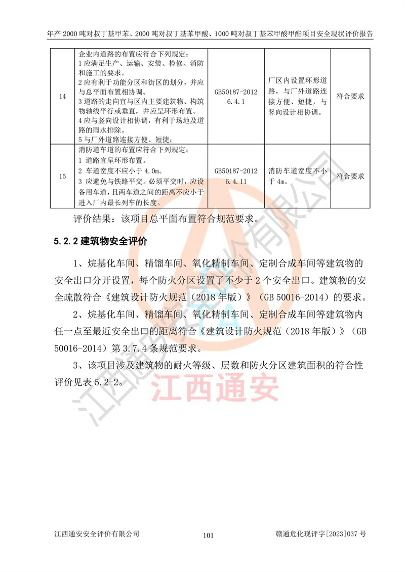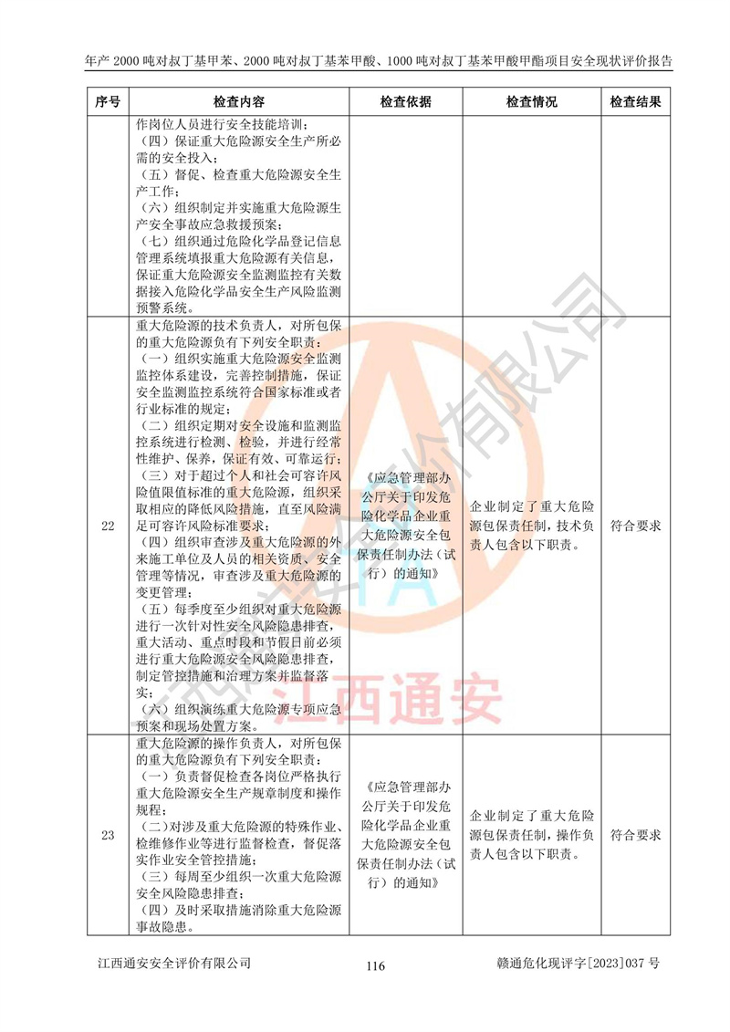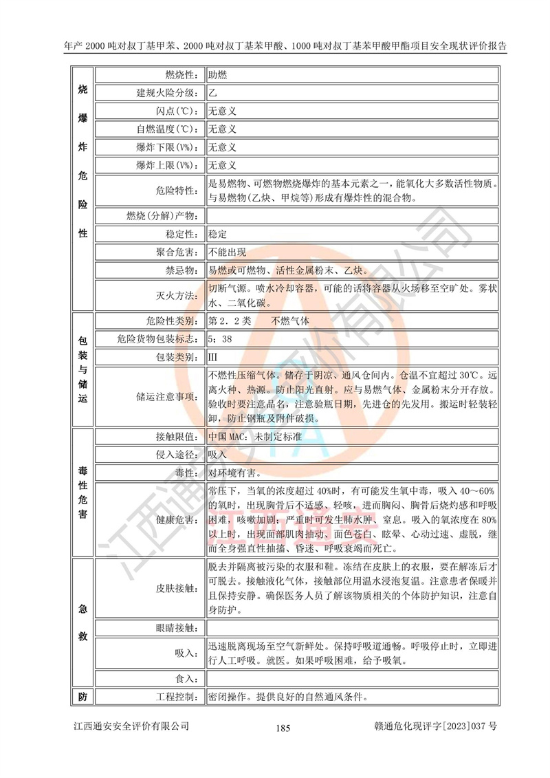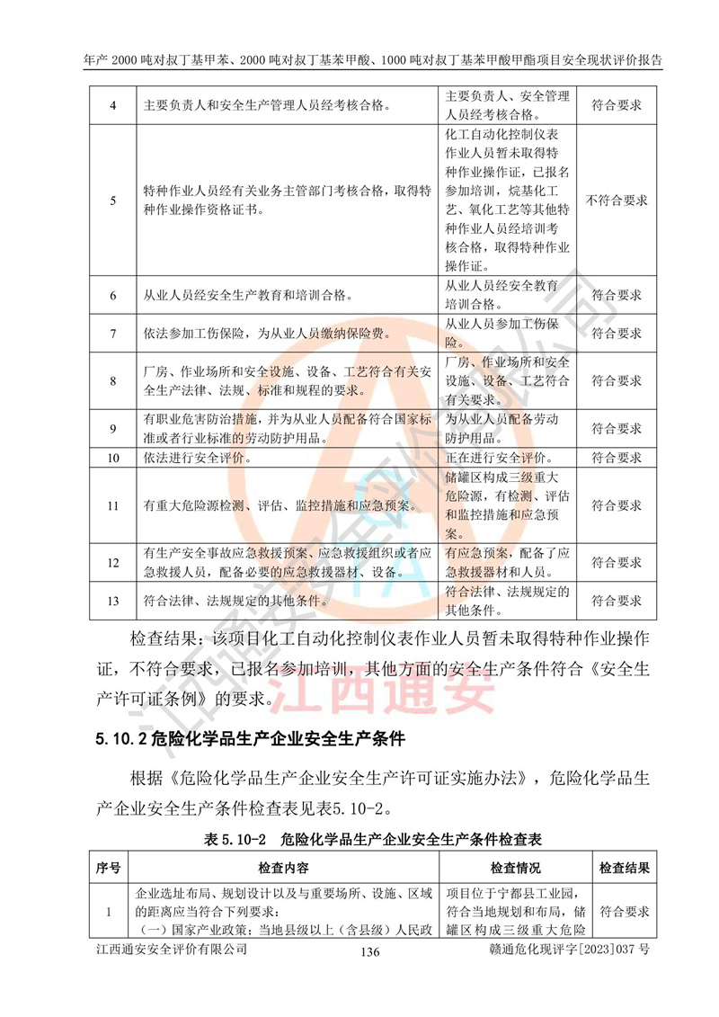 江西永通科技股份有限公司位于江西省贛州市寧都縣工業(yè)園,法定**人為劉忠春,成立于2009年09月25日,注冊資本玖仟陸佰肆拾陸萬陸仟元整,營業(yè)執(zhí)照經(jīng)營范圍為化學(xué)原料藥、醫(yī)藥中間體等研發(fā)、生產(chǎn)、銷售等。 江西永通科技股份有限公司2020年10月26日取得了《安全生產(chǎn)許可證》,許可證編號:(贛)WH安許證字[2011]0642號,許可范圍為對叔丁基甲苯(2kt/a)、對叔丁基苯甲酸(2kt/a)、對叔丁基苯甲酸甲酯(1kt/a),**期:2020年10月26日至2023年10月25日。該公司2021年10月22日取得了安全生產(chǎn)標(biāo)準(zhǔn)化證書,證書編號:贛市AQBWHⅢ[2021]168,**期至2024年10月21日。該公司現(xiàn)有員工133人,其中專職安全管理人員3人。 江西永通科技股份有限公司年產(chǎn)2000噸對叔丁基甲苯、2000噸對叔丁基苯甲酸、1000噸對叔丁基苯甲酸甲酯項(xiàng)目生產(chǎn)過程中涉及的原輔材料為甲苯、異丁烯、液氧(氧氣)、甲醇、濃硫酸、液堿(氫氧化鈉)、活性炭、硅藻土、氧化催化劑和氮?dú)?,產(chǎn)品為對叔丁基甲苯、對叔丁基苯甲酸和對叔丁基苯甲酸甲酯。根據(jù)《危險(xiǎn)化學(xué)品目錄》,該項(xiàng)目涉及的甲苯、異丁烯、液氧(氧氣)、甲醇、濃硫酸、液堿(氫氧化鈉)和氮?dú)鈱儆?/span>危險(xiǎn)化學(xué)品。經(jīng)辨識,甲苯和甲醇屬于重點(diǎn)監(jiān)管的危險(xiǎn)化學(xué)品,甲苯和硫酸屬于第三類易制毒化學(xué)品、甲醇屬于特別管控的危險(xiǎn)化學(xué)品,不涉及監(jiān)控化學(xué)品、易制爆危險(xiǎn)化學(xué)品、劇毒化學(xué)品和高毒物品,儲罐區(qū)構(gòu)成三級重大危險(xiǎn)源,其他生產(chǎn)、儲存單元不構(gòu)成危險(xiǎn)化學(xué)品重大危險(xiǎn)源,涉及的烷基化反應(yīng)和氧化反應(yīng)屬于重點(diǎn)監(jiān)管的危險(xiǎn)化工工藝。根據(jù)《安全生產(chǎn)許可證條例》、《危險(xiǎn)化學(xué)品安全管理?xiàng)l例》和《危險(xiǎn)化學(xué)品生產(chǎn)企業(yè)安全生產(chǎn)許可實(shí)施辦法》的相關(guān)規(guī)定,該項(xiàng)目涉及甲苯回收,需要辦理危險(xiǎn)化學(xué)品安全生產(chǎn)許可證。根據(jù)生產(chǎn)工藝特點(diǎn)及物料的理化特性可知,該項(xiàng)目生產(chǎn)過程中存在火災(zāi)與爆炸、中毒與窒息、觸電、機(jī)械傷害等危險(xiǎn)有害因素。 該公司自2020年10月26日取得安全生產(chǎn)許可證以來,生產(chǎn)運(yùn)行正常,未發(fā)生一般及以上生產(chǎn)安全事故。 |