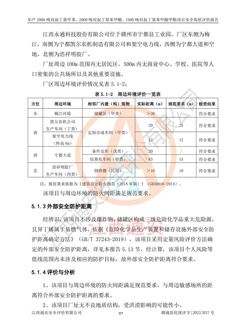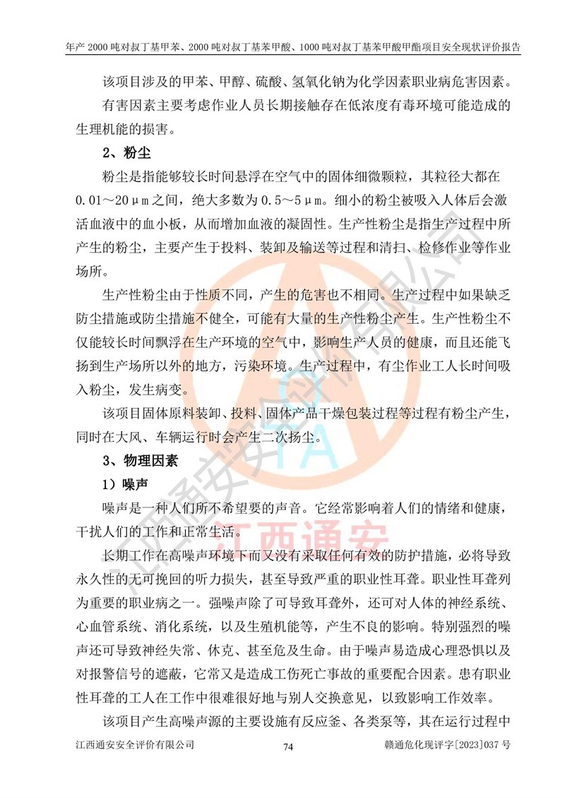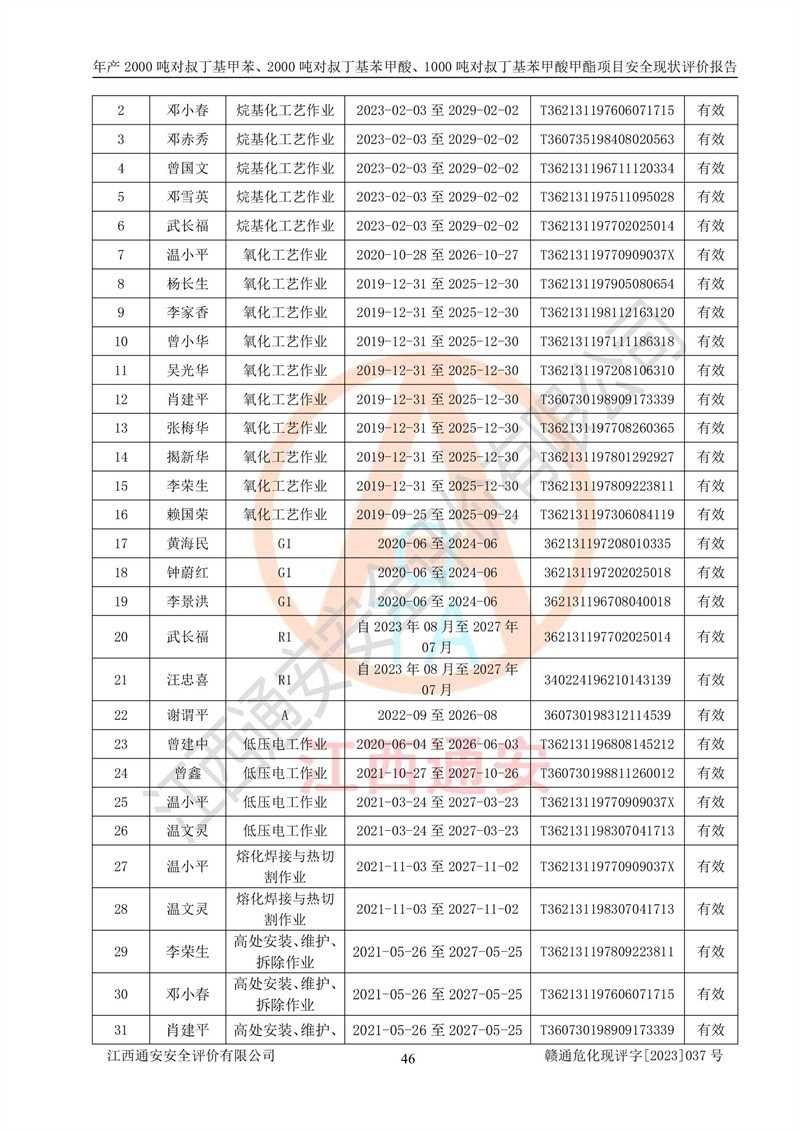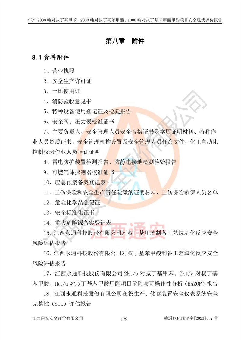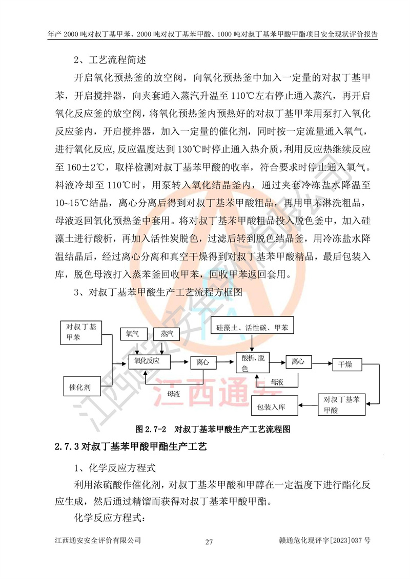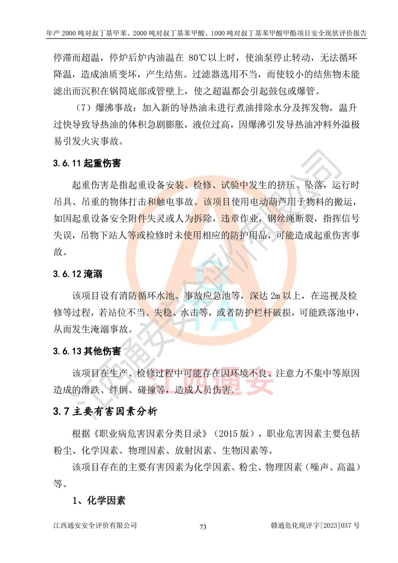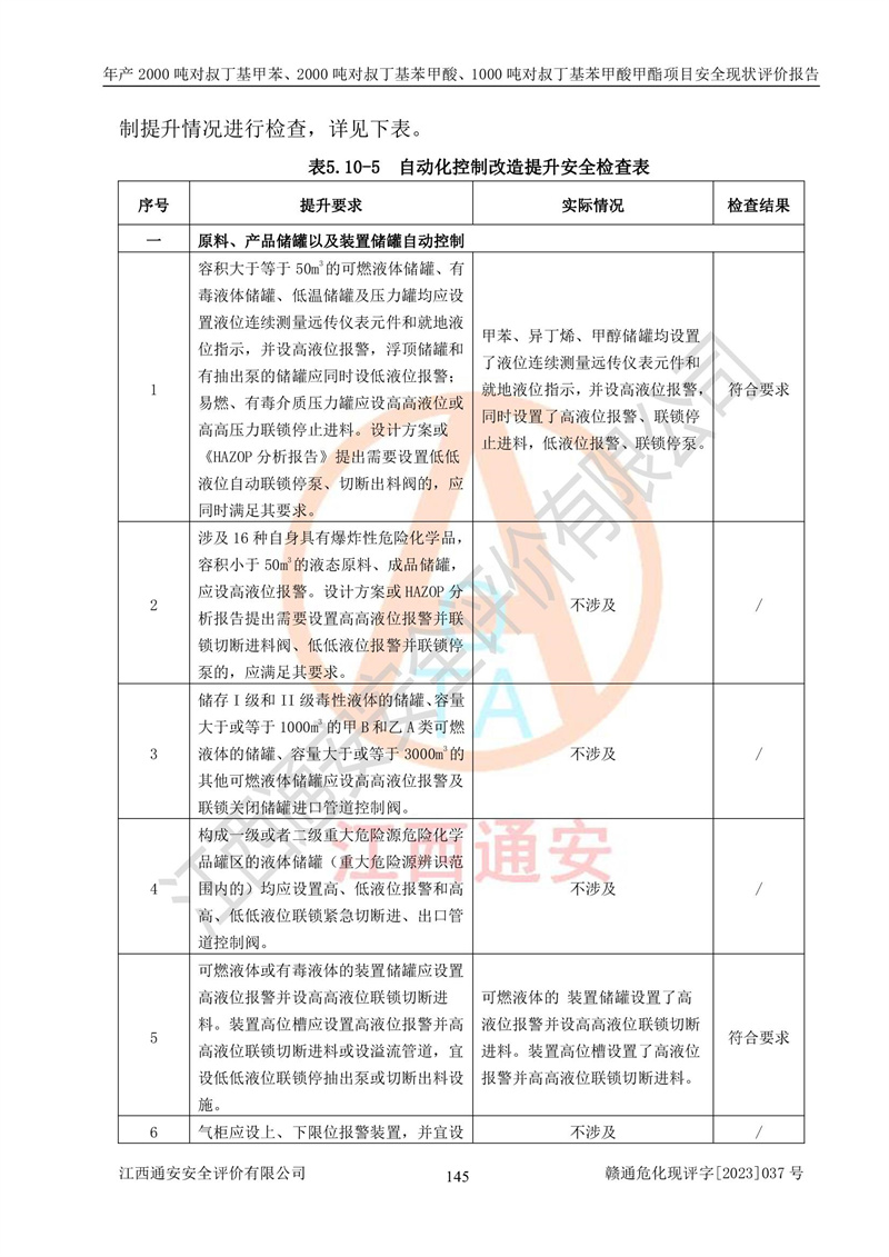 江西永通科技股份有限公司位于江西省贛州市寧都縣工業(yè)園,法定**人為劉忠春,成立于2009年09月25日,注冊資本玖仟陸佰肆拾陸萬陸仟元整,營業(yè)執(zhí)照經(jīng)營范圍為化學(xué)原料藥、醫(yī)藥中間體等研發(fā)、生產(chǎn)、銷售等。 江西永通科技股份有限公司2020年10月26日取得了《安全生產(chǎn)許可證》,許可證編號:(贛)WH安許證字[2011]0642號,許可范圍為對叔丁基甲苯(2kt/a)、對叔丁基苯甲酸(2kt/a)、對叔丁基苯甲酸甲酯(1kt/a),**期:2020年10月26日至2023年10月25日。該公司2021年10月22日取得了安全生產(chǎn)標(biāo)準(zhǔn)化證書,證書編號:贛市AQBWHⅢ[2021]168,**期至2024年10月21日。該公司現(xiàn)有員工133人,其中專職安全管理人員3人。 江西永通科技股份有限公司年產(chǎn)2000噸對叔丁基甲苯、2000噸對叔丁基苯甲酸、1000噸對叔丁基苯甲酸甲酯項(xiàng)目生產(chǎn)過程中涉及的原輔材料為甲苯、異丁烯、液氧(氧氣)、甲醇、濃硫酸、液堿(氫氧化鈉)、活性炭、硅藻土、氧化催化劑和氮?dú)?,產(chǎn)品為對叔丁基甲苯、對叔丁基苯甲酸和對叔丁基苯甲酸甲酯。根據(jù)《危險(xiǎn)化學(xué)品目錄》,該項(xiàng)目涉及的甲苯、異丁烯、液氧(氧氣)、甲醇、濃硫酸、液堿(氫氧化鈉)和氮?dú)鈱儆?/span>危險(xiǎn)化學(xué)品。經(jīng)辨識,甲苯和甲醇屬于重點(diǎn)監(jiān)管的危險(xiǎn)化學(xué)品,甲苯和硫酸屬于第三類易制毒化學(xué)品、甲醇屬于特別管控的危險(xiǎn)化學(xué)品,不涉及監(jiān)控化學(xué)品、易制爆危險(xiǎn)化學(xué)品、劇毒化學(xué)品和高毒物品,儲罐區(qū)構(gòu)成三級重大危險(xiǎn)源,其他生產(chǎn)、儲存單元不構(gòu)成危險(xiǎn)化學(xué)品重大危險(xiǎn)源,涉及的烷基化反應(yīng)和氧化反應(yīng)屬于重點(diǎn)監(jiān)管的危險(xiǎn)化工工藝。根據(jù)《安全生產(chǎn)許可證條例》、《危險(xiǎn)化學(xué)品安全管理?xiàng)l例》和《危險(xiǎn)化學(xué)品生產(chǎn)企業(yè)安全生產(chǎn)許可實(shí)施辦法》的相關(guān)規(guī)定,該項(xiàng)目涉及甲苯回收,需要辦理危險(xiǎn)化學(xué)品安全生產(chǎn)許可證。根據(jù)生產(chǎn)工藝特點(diǎn)及物料的理化特性可知,該項(xiàng)目生產(chǎn)過程中存在火災(zāi)與爆炸、中毒與窒息、觸電、機(jī)械傷害等危險(xiǎn)有害因素。 該公司自2020年10月26日取得安全生產(chǎn)許可證以來,生產(chǎn)運(yùn)行正常,未發(fā)生一般及以上生產(chǎn)安全事故。 |