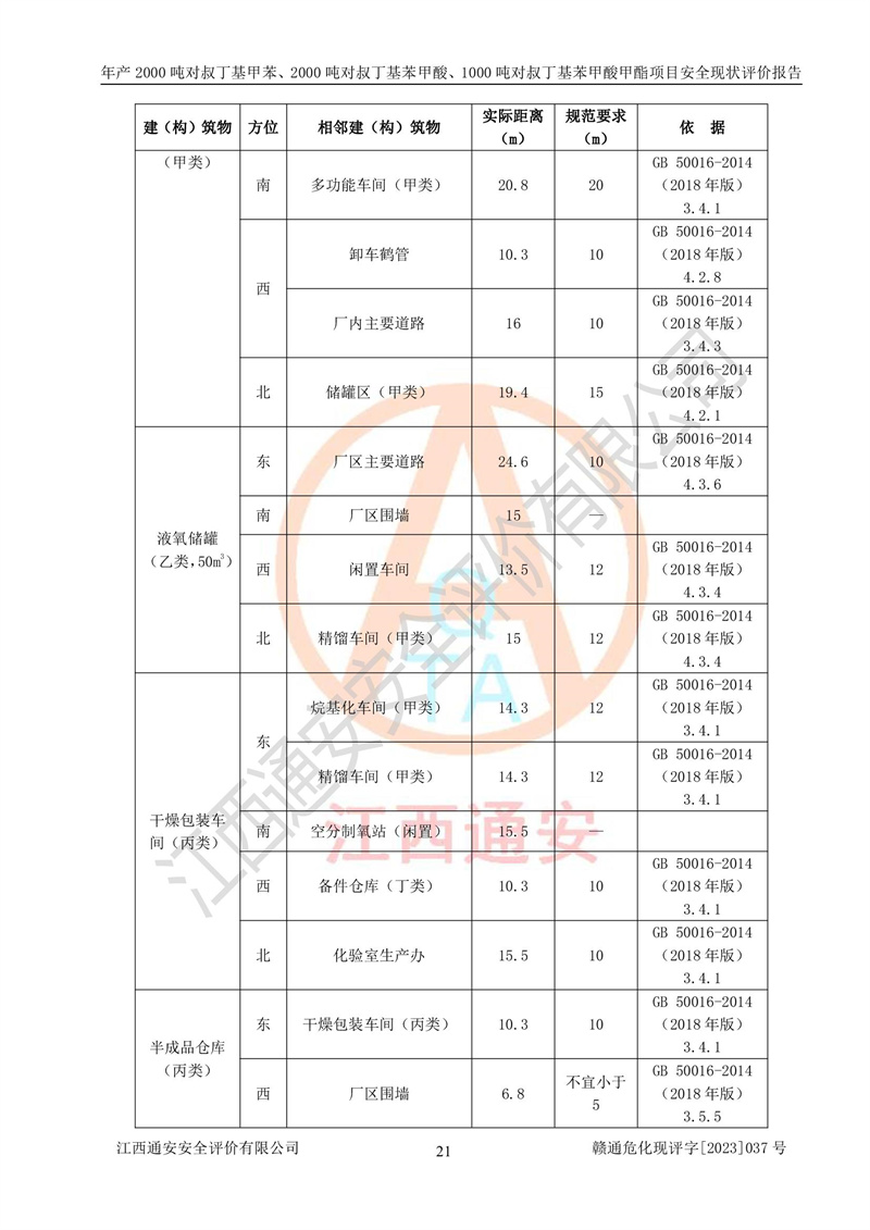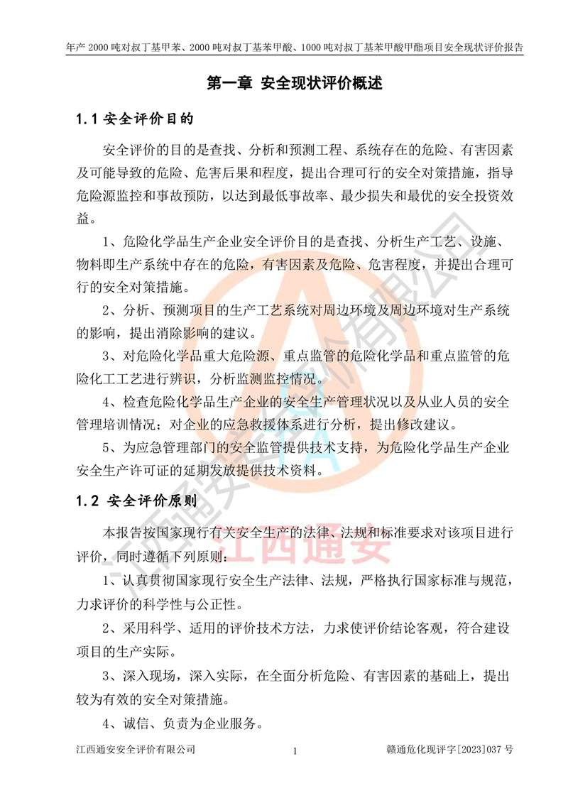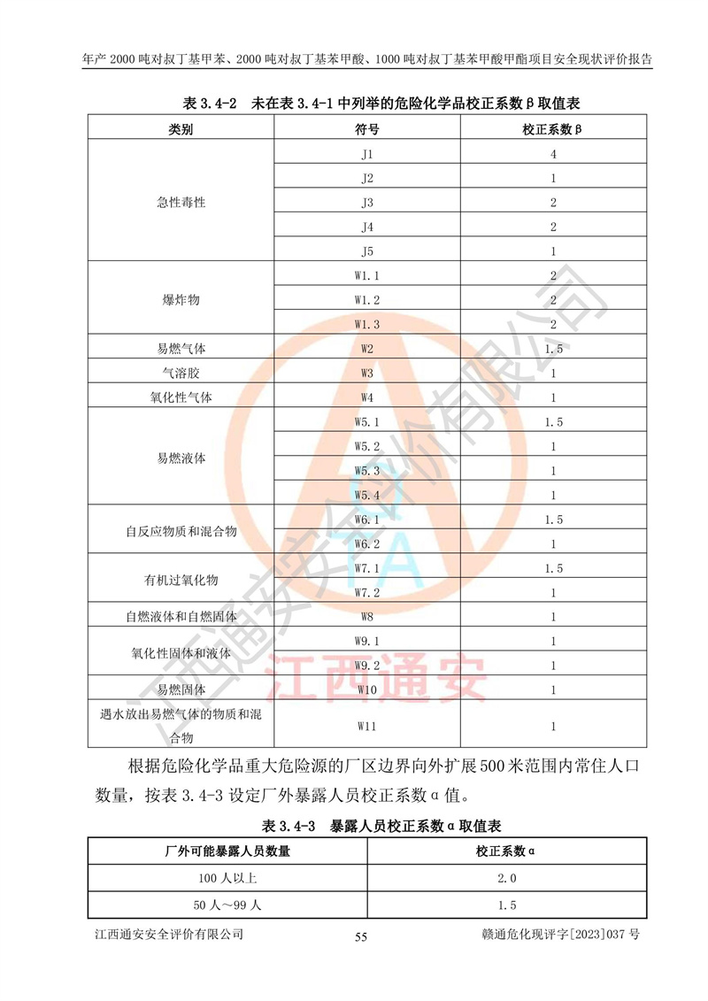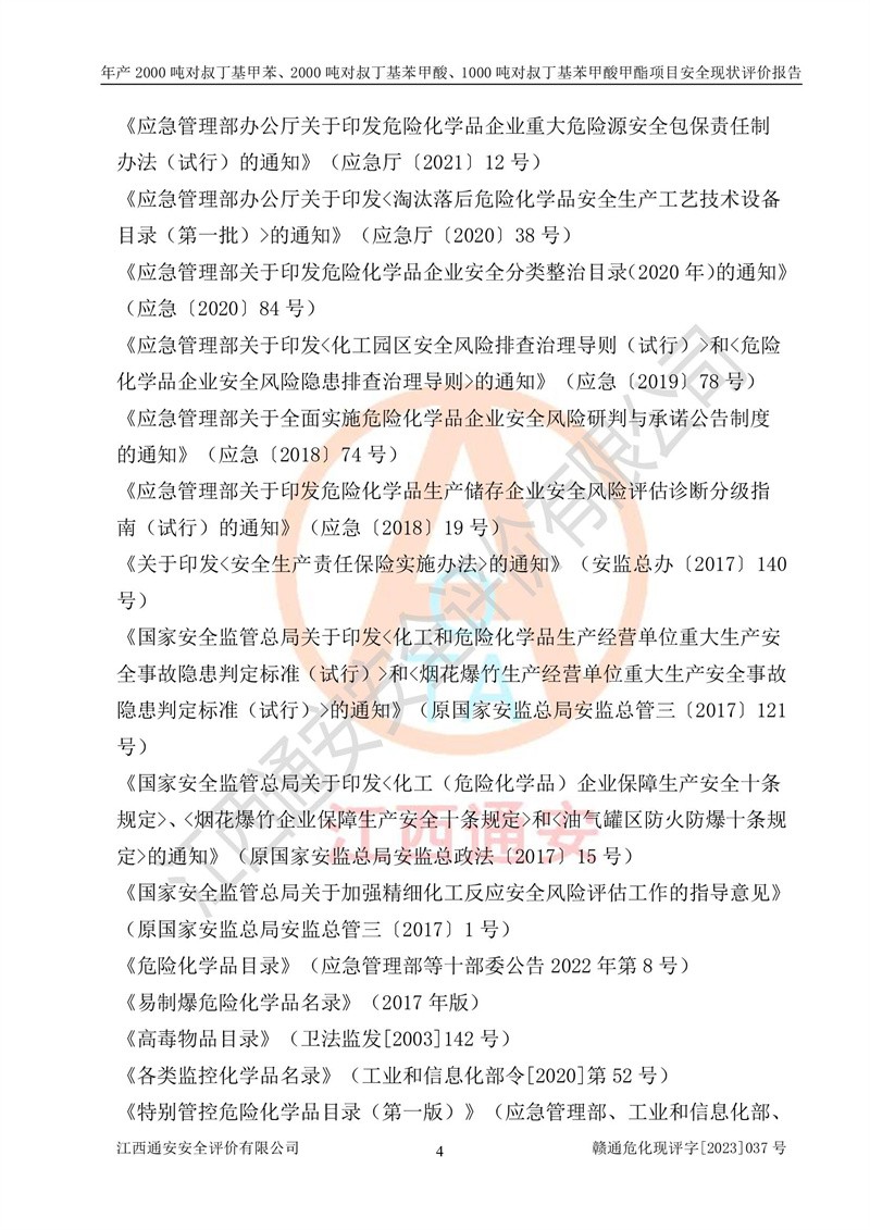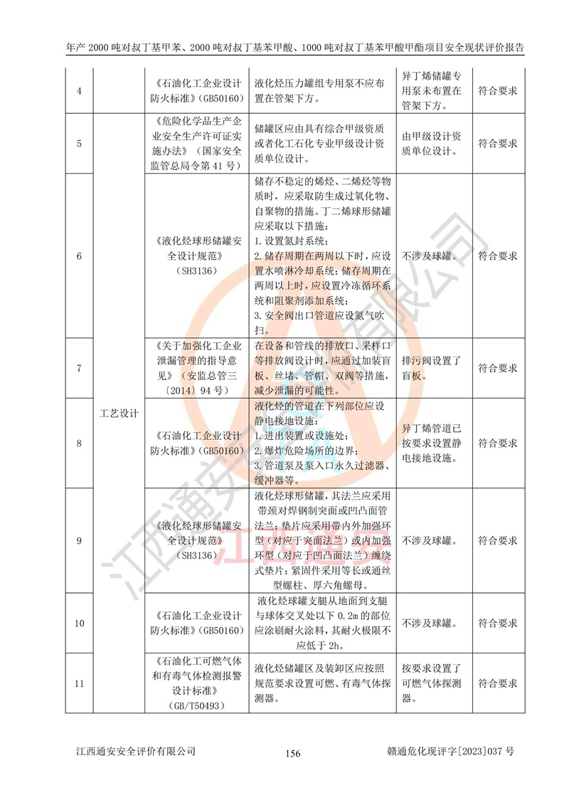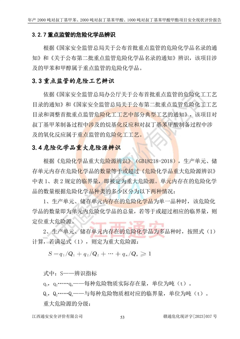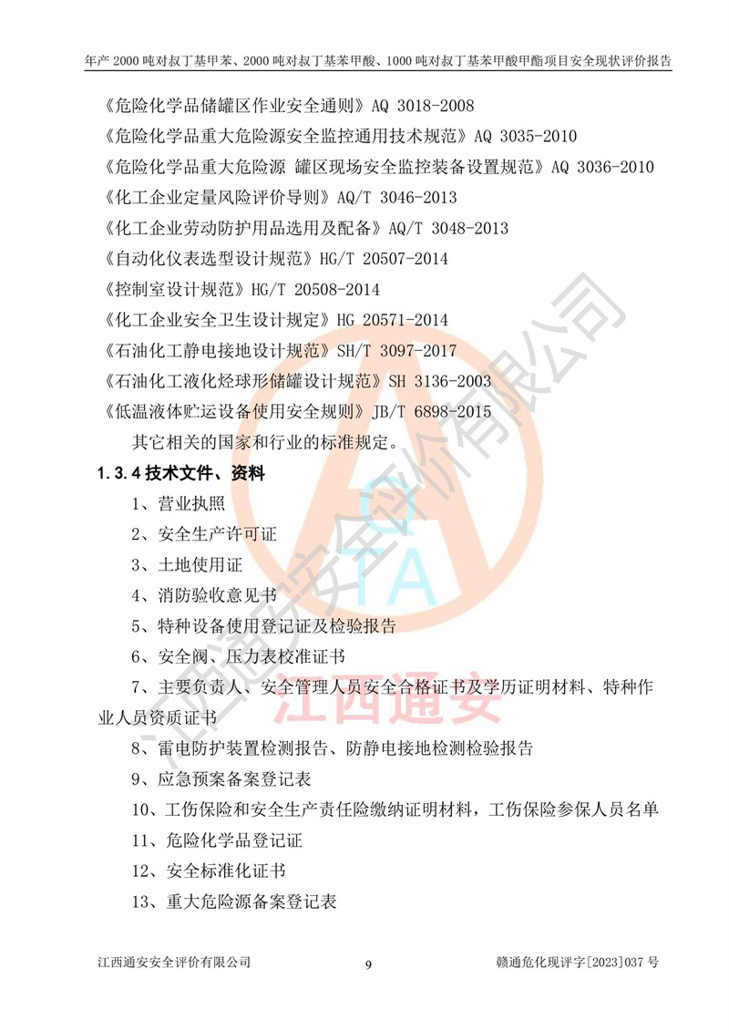 江西永通科技股份有限公司位于江西省贛州市寧都縣工業(yè)園,法定**人為劉忠春,成立于2009年09月25日,注冊資本玖仟陸佰肆拾陸萬陸仟元整,營業(yè)執(zhí)照經(jīng)營范圍為化學(xué)原料藥、醫(yī)藥中間體等研發(fā)、生產(chǎn)、銷售等。 江西永通科技股份有限公司2020年10月26日取得了《安全生產(chǎn)許可證》,許可證編號:(贛)WH安許證字[2011]0642號,許可范圍為對叔丁基甲苯(2kt/a)、對叔丁基苯甲酸(2kt/a)、對叔丁基苯甲酸甲酯(1kt/a),**期:2020年10月26日至2023年10月25日。該公司2021年10月22日取得了安全生產(chǎn)標(biāo)準(zhǔn)化證書,證書編號:贛市AQBWHⅢ[2021]168,**期至2024年10月21日。該公司現(xiàn)有員工133人,其中專職安全管理人員3人。 江西永通科技股份有限公司年產(chǎn)2000噸對叔丁基甲苯、2000噸對叔丁基苯甲酸、1000噸對叔丁基苯甲酸甲酯項(xiàng)目生產(chǎn)過程中涉及的原輔材料為甲苯、異丁烯、液氧(氧氣)、甲醇、濃硫酸、液堿(氫氧化鈉)、活性炭、硅藻土、氧化催化劑和氮?dú)?,產(chǎn)品為對叔丁基甲苯、對叔丁基苯甲酸和對叔丁基苯甲酸甲酯。根據(jù)《危險(xiǎn)化學(xué)品目錄》,該項(xiàng)目涉及的甲苯、異丁烯、液氧(氧氣)、甲醇、濃硫酸、液堿(氫氧化鈉)和氮?dú)鈱儆?/span>危險(xiǎn)化學(xué)品。經(jīng)辨識,甲苯和甲醇屬于重點(diǎn)監(jiān)管的危險(xiǎn)化學(xué)品,甲苯和硫酸屬于第三類易制毒化學(xué)品、甲醇屬于特別管控的危險(xiǎn)化學(xué)品,不涉及監(jiān)控化學(xué)品、易制爆危險(xiǎn)化學(xué)品、劇毒化學(xué)品和高毒物品,儲罐區(qū)構(gòu)成三級重大危險(xiǎn)源,其他生產(chǎn)、儲存單元不構(gòu)成危險(xiǎn)化學(xué)品重大危險(xiǎn)源,涉及的烷基化反應(yīng)和氧化反應(yīng)屬于重點(diǎn)監(jiān)管的危險(xiǎn)化工工藝。根據(jù)《安全生產(chǎn)許可證條例》、《危險(xiǎn)化學(xué)品安全管理?xiàng)l例》和《危險(xiǎn)化學(xué)品生產(chǎn)企業(yè)安全生產(chǎn)許可實(shí)施辦法》的相關(guān)規(guī)定,該項(xiàng)目涉及甲苯回收,需要辦理危險(xiǎn)化學(xué)品安全生產(chǎn)許可證。根據(jù)生產(chǎn)工藝特點(diǎn)及物料的理化特性可知,該項(xiàng)目生產(chǎn)過程中存在火災(zāi)與爆炸、中毒與窒息、觸電、機(jī)械傷害等危險(xiǎn)有害因素。 該公司自2020年10月26日取得安全生產(chǎn)許可證以來,生產(chǎn)運(yùn)行正常,未發(fā)生一般及以上生產(chǎn)安全事故。 |