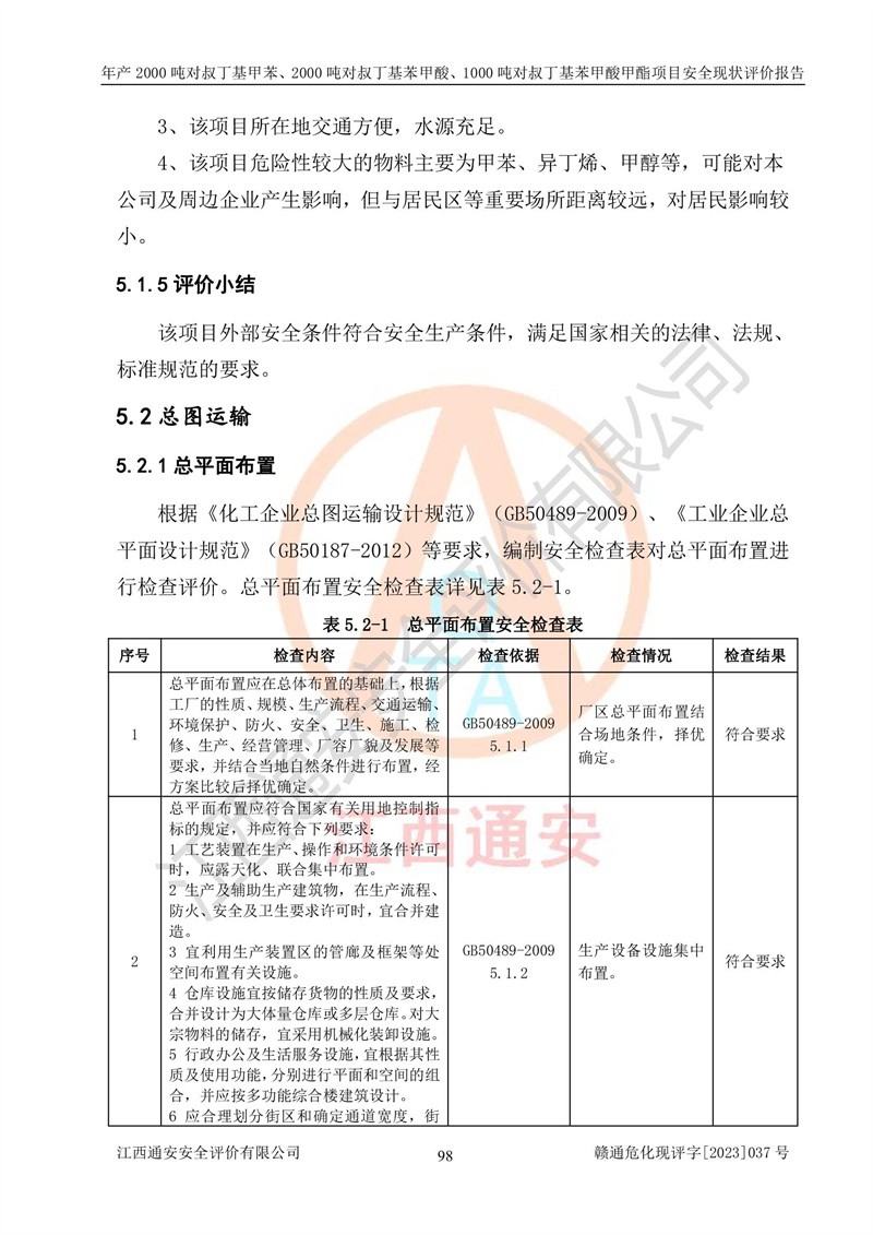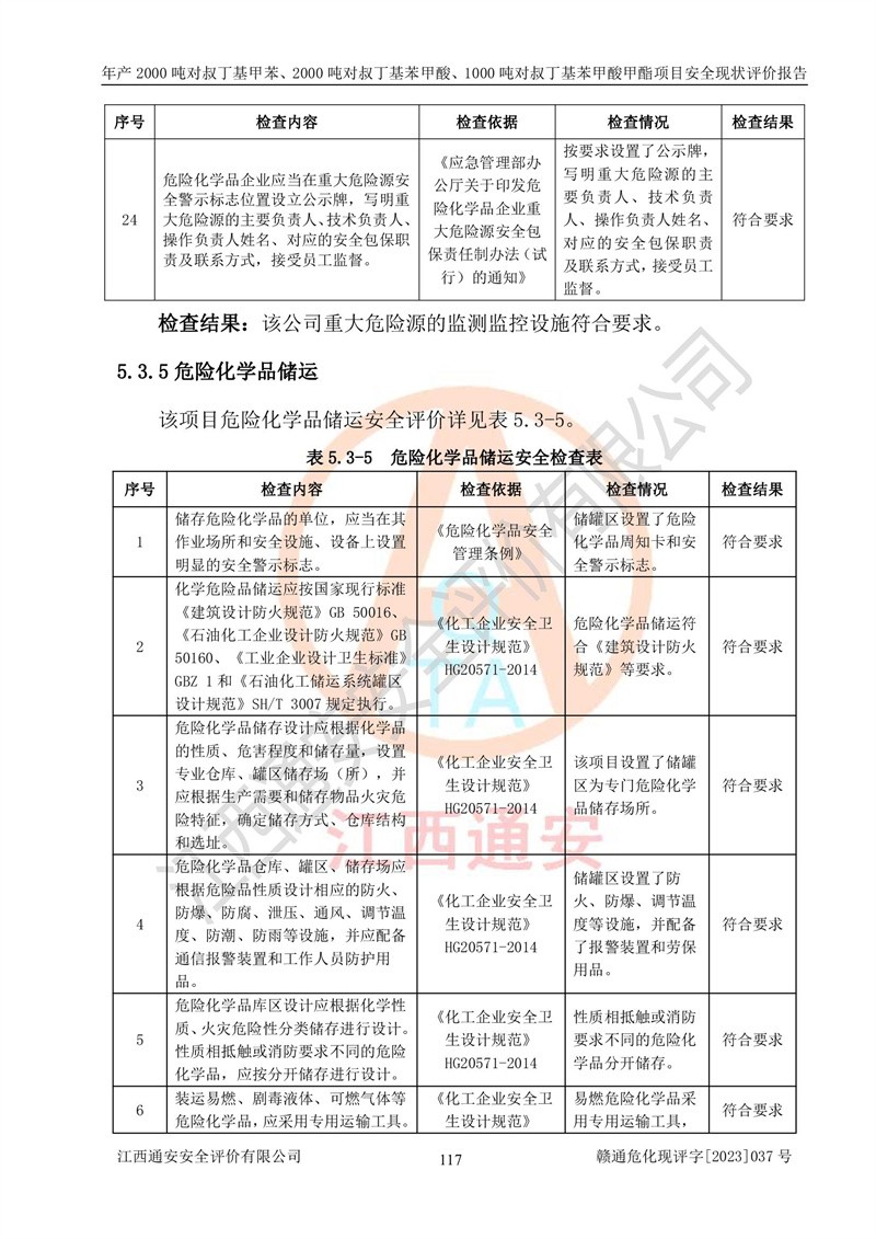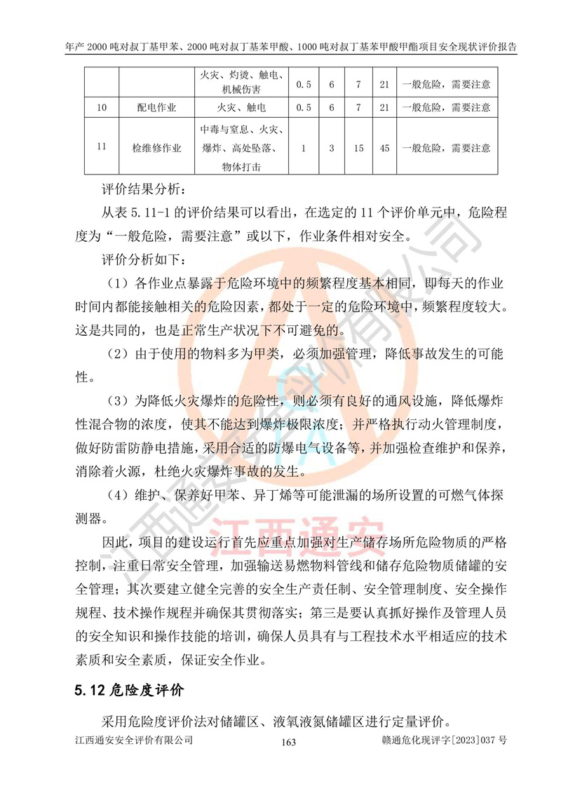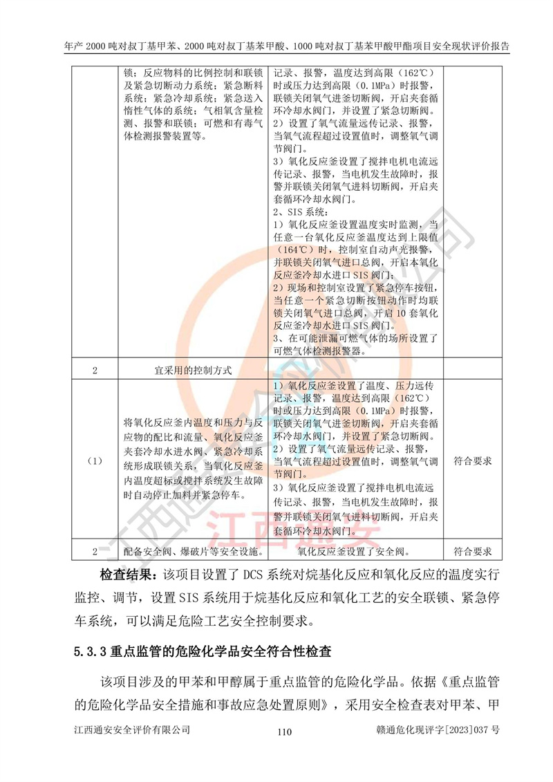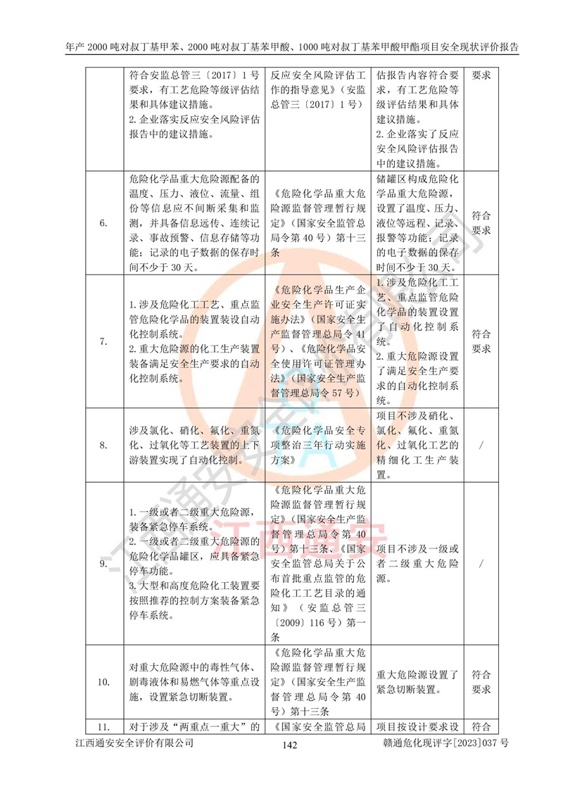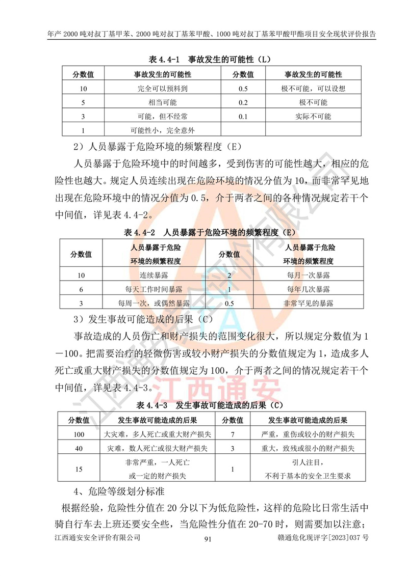 江西永通科技股份有限公司位于江西省贛州市寧都縣工業(yè)園,法定**人為劉忠春,成立于2009年09月25日,注冊資本玖仟陸佰肆拾陸萬陸仟元整,營業(yè)執(zhí)照經(jīng)營范圍為化學(xué)原料藥、醫(yī)藥中間體等研發(fā)、生產(chǎn)、銷售等。 江西永通科技股份有限公司2020年10月26日取得了《安全生產(chǎn)許可證》,許可證編號:(贛)WH安許證字[2011]0642號,許可范圍為對叔丁基甲苯(2kt/a)、對叔丁基苯甲酸(2kt/a)、對叔丁基苯甲酸甲酯(1kt/a),**期:2020年10月26日至2023年10月25日。該公司2021年10月22日取得了安全生產(chǎn)標(biāo)準(zhǔn)化證書,證書編號:贛市AQBWHⅢ[2021]168,**期至2024年10月21日。該公司現(xiàn)有員工133人,其中專職安全管理人員3人。 江西永通科技股份有限公司年產(chǎn)2000噸對叔丁基甲苯、2000噸對叔丁基苯甲酸、1000噸對叔丁基苯甲酸甲酯項(xiàng)目生產(chǎn)過程中涉及的原輔材料為甲苯、異丁烯、液氧(氧氣)、甲醇、濃硫酸、液堿(氫氧化鈉)、活性炭、硅藻土、氧化催化劑和氮?dú)?,產(chǎn)品為對叔丁基甲苯、對叔丁基苯甲酸和對叔丁基苯甲酸甲酯。根據(jù)《危險(xiǎn)化學(xué)品目錄》,該項(xiàng)目涉及的甲苯、異丁烯、液氧(氧氣)、甲醇、濃硫酸、液堿(氫氧化鈉)和氮?dú)鈱儆?/span>危險(xiǎn)化學(xué)品。經(jīng)辨識,甲苯和甲醇屬于重點(diǎn)監(jiān)管的危險(xiǎn)化學(xué)品,甲苯和硫酸屬于第三類易制毒化學(xué)品、甲醇屬于特別管控的危險(xiǎn)化學(xué)品,不涉及監(jiān)控化學(xué)品、易制爆危險(xiǎn)化學(xué)品、劇毒化學(xué)品和高毒物品,儲罐區(qū)構(gòu)成三級重大危險(xiǎn)源,其他生產(chǎn)、儲存單元不構(gòu)成危險(xiǎn)化學(xué)品重大危險(xiǎn)源,涉及的烷基化反應(yīng)和氧化反應(yīng)屬于重點(diǎn)監(jiān)管的危險(xiǎn)化工工藝。根據(jù)《安全生產(chǎn)許可證條例》、《危險(xiǎn)化學(xué)品安全管理?xiàng)l例》和《危險(xiǎn)化學(xué)品生產(chǎn)企業(yè)安全生產(chǎn)許可實(shí)施辦法》的相關(guān)規(guī)定,該項(xiàng)目涉及甲苯回收,需要辦理危險(xiǎn)化學(xué)品安全生產(chǎn)許可證。根據(jù)生產(chǎn)工藝特點(diǎn)及物料的理化特性可知,該項(xiàng)目生產(chǎn)過程中存在火災(zāi)與爆炸、中毒與窒息、觸電、機(jī)械傷害等危險(xiǎn)有害因素。 該公司自2020年10月26日取得安全生產(chǎn)許可證以來,生產(chǎn)運(yùn)行正常,未發(fā)生一般及以上生產(chǎn)安全事故。 |