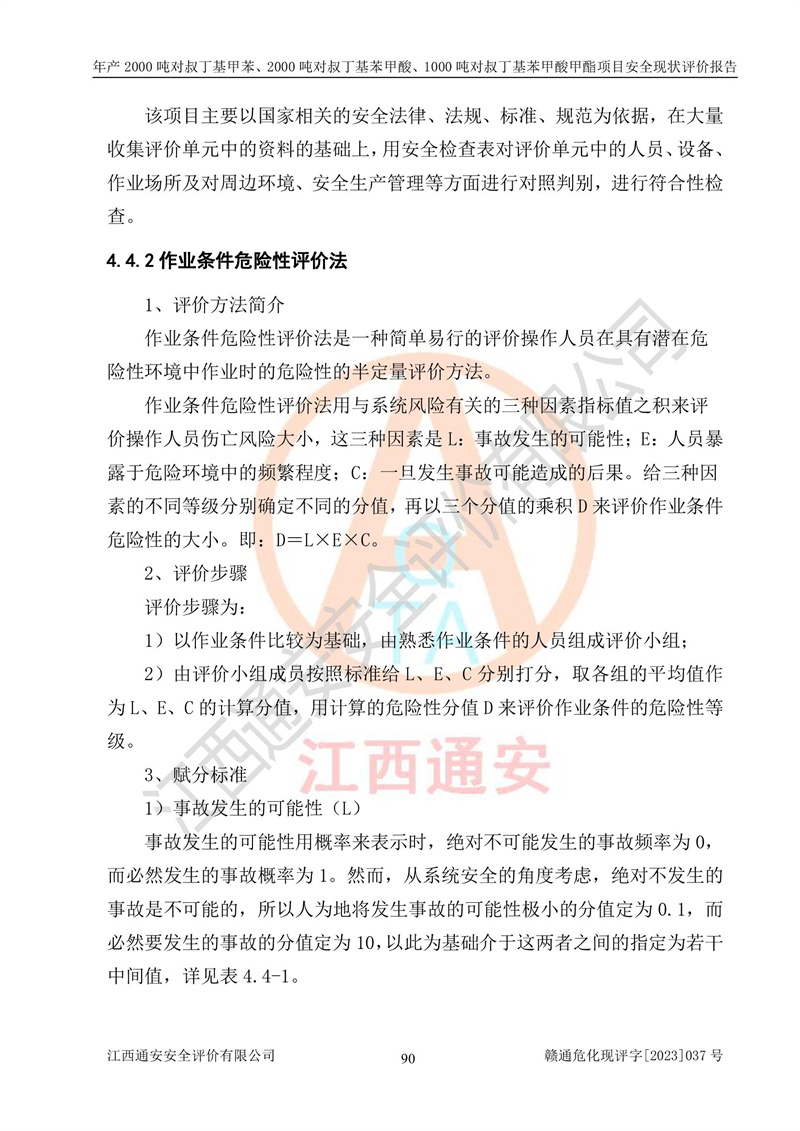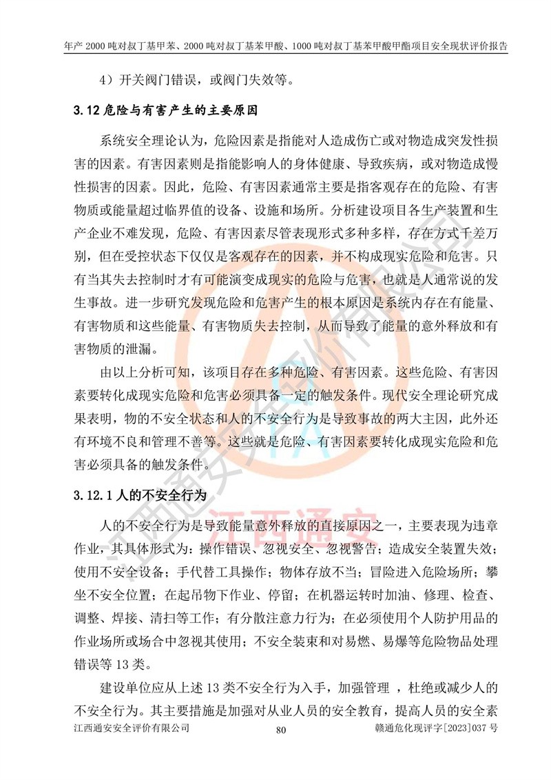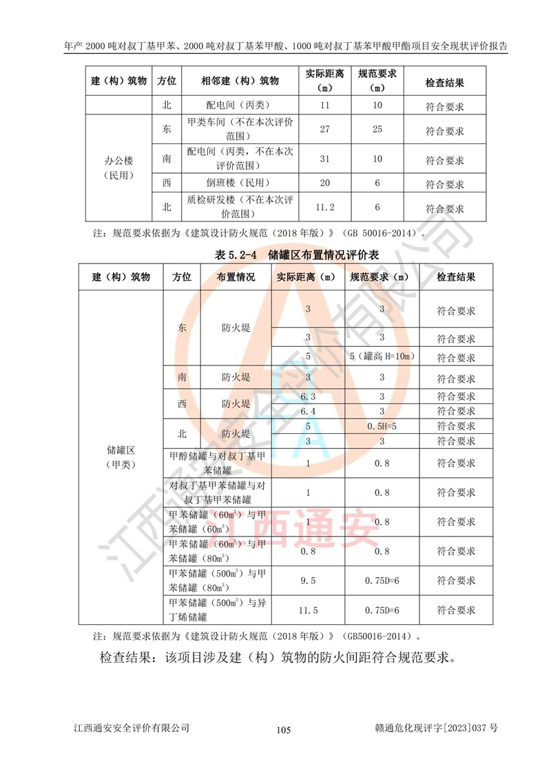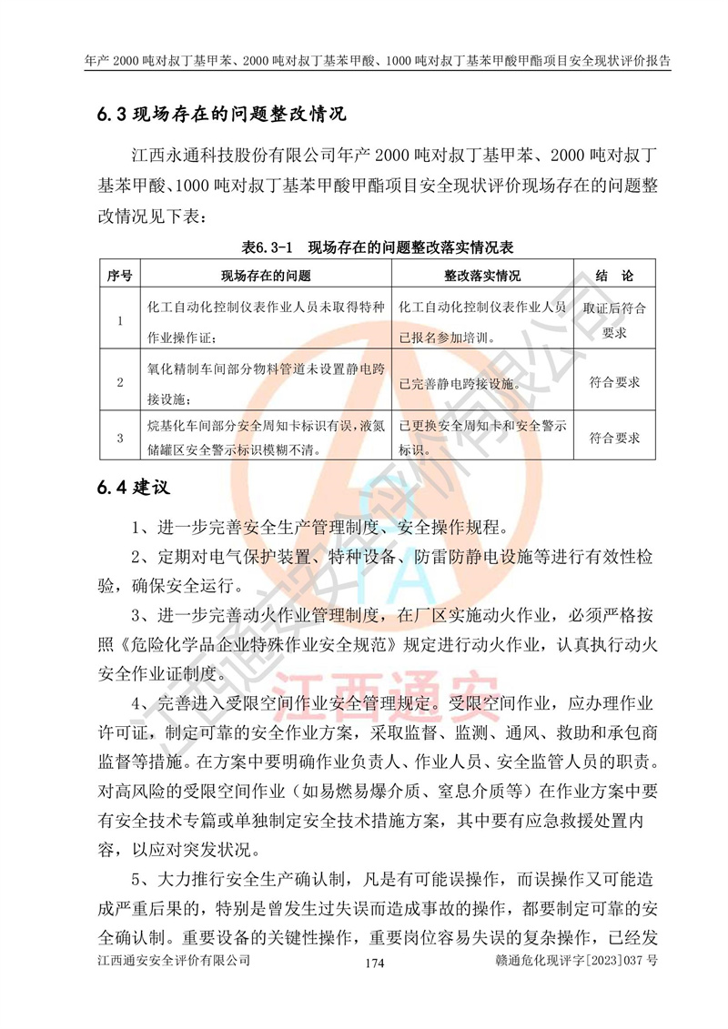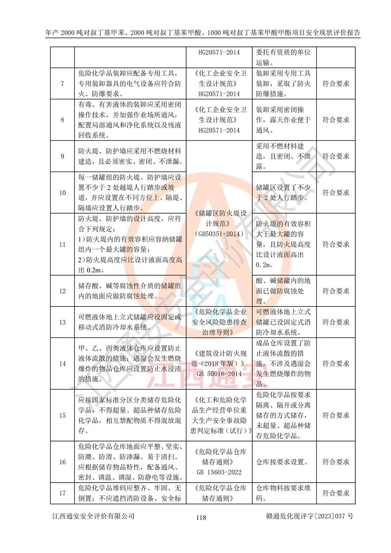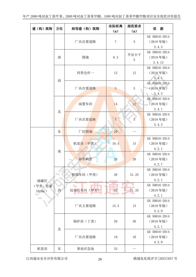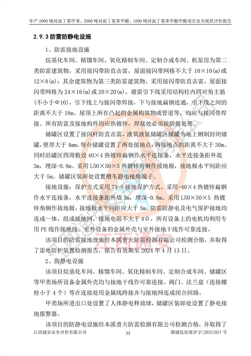 江西永通科技股份有限公司位于江西省贛州市寧都縣工業(yè)園,法定**人為劉忠春,成立于2009年09月25日,注冊資本玖仟陸佰肆拾陸萬陸仟元整,營業(yè)執(zhí)照經(jīng)營范圍為化學(xué)原料藥、醫(yī)藥中間體等研發(fā)、生產(chǎn)、銷售等。 江西永通科技股份有限公司2020年10月26日取得了《安全生產(chǎn)許可證》,許可證編號:(贛)WH安許證字[2011]0642號,許可范圍為對叔丁基甲苯(2kt/a)、對叔丁基苯甲酸(2kt/a)、對叔丁基苯甲酸甲酯(1kt/a),**期:2020年10月26日至2023年10月25日。該公司2021年10月22日取得了安全生產(chǎn)標(biāo)準(zhǔn)化證書,證書編號:贛市AQBWHⅢ[2021]168,**期至2024年10月21日。該公司現(xiàn)有員工133人,其中專職安全管理人員3人。 江西永通科技股份有限公司年產(chǎn)2000噸對叔丁基甲苯、2000噸對叔丁基苯甲酸、1000噸對叔丁基苯甲酸甲酯項(xiàng)目生產(chǎn)過程中涉及的原輔材料為甲苯、異丁烯、液氧(氧氣)、甲醇、濃硫酸、液堿(氫氧化鈉)、活性炭、硅藻土、氧化催化劑和氮?dú)?,產(chǎn)品為對叔丁基甲苯、對叔丁基苯甲酸和對叔丁基苯甲酸甲酯。根據(jù)《危險(xiǎn)化學(xué)品目錄》,該項(xiàng)目涉及的甲苯、異丁烯、液氧(氧氣)、甲醇、濃硫酸、液堿(氫氧化鈉)和氮?dú)鈱儆?/span>危險(xiǎn)化學(xué)品。經(jīng)辨識,甲苯和甲醇屬于重點(diǎn)監(jiān)管的危險(xiǎn)化學(xué)品,甲苯和硫酸屬于第三類易制毒化學(xué)品、甲醇屬于特別管控的危險(xiǎn)化學(xué)品,不涉及監(jiān)控化學(xué)品、易制爆危險(xiǎn)化學(xué)品、劇毒化學(xué)品和高毒物品,儲罐區(qū)構(gòu)成三級重大危險(xiǎn)源,其他生產(chǎn)、儲存單元不構(gòu)成危險(xiǎn)化學(xué)品重大危險(xiǎn)源,涉及的烷基化反應(yīng)和氧化反應(yīng)屬于重點(diǎn)監(jiān)管的危險(xiǎn)化工工藝。根據(jù)《安全生產(chǎn)許可證條例》、《危險(xiǎn)化學(xué)品安全管理?xiàng)l例》和《危險(xiǎn)化學(xué)品生產(chǎn)企業(yè)安全生產(chǎn)許可實(shí)施辦法》的相關(guān)規(guī)定,該項(xiàng)目涉及甲苯回收,需要辦理危險(xiǎn)化學(xué)品安全生產(chǎn)許可證。根據(jù)生產(chǎn)工藝特點(diǎn)及物料的理化特性可知,該項(xiàng)目生產(chǎn)過程中存在火災(zāi)與爆炸、中毒與窒息、觸電、機(jī)械傷害等危險(xiǎn)有害因素。 該公司自2020年10月26日取得安全生產(chǎn)許可證以來,生產(chǎn)運(yùn)行正常,未發(fā)生一般及以上生產(chǎn)安全事故。 |