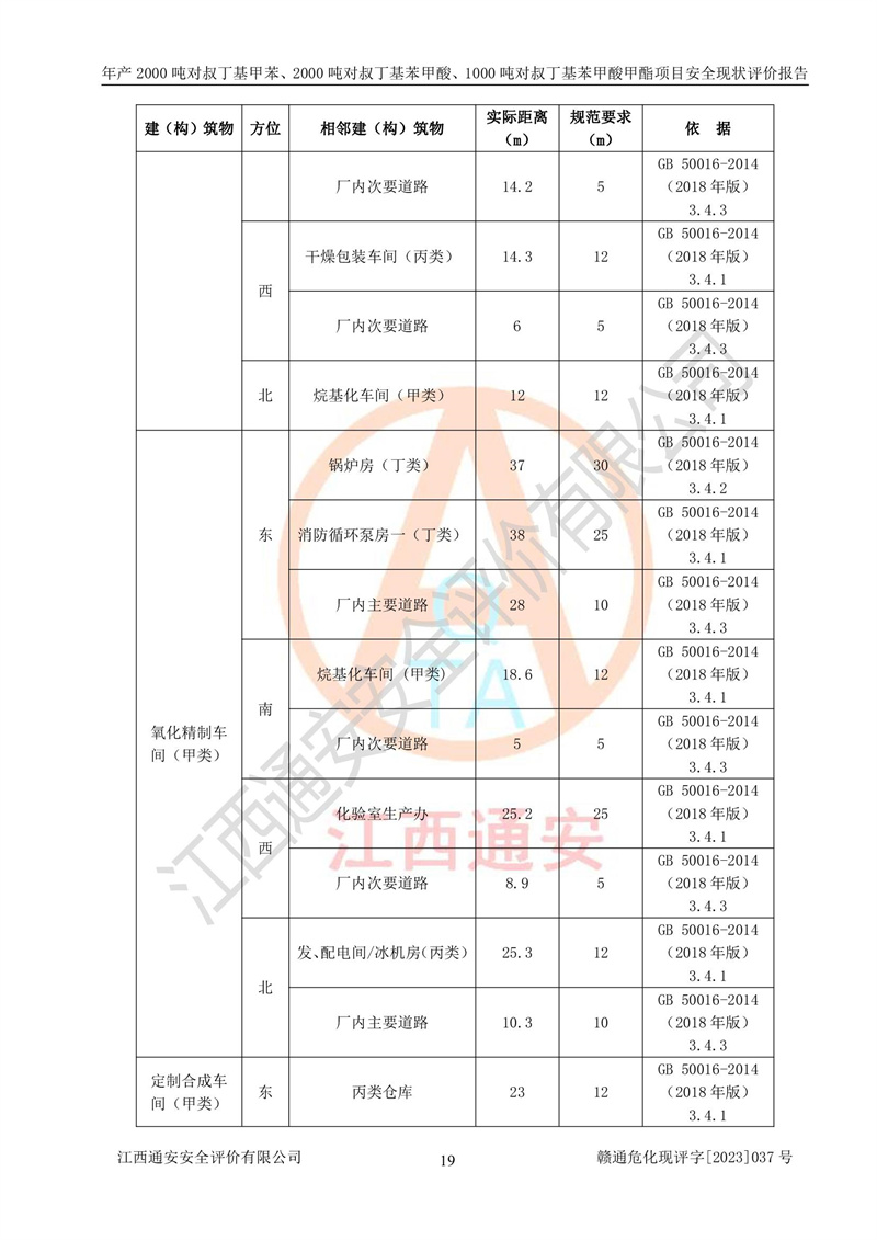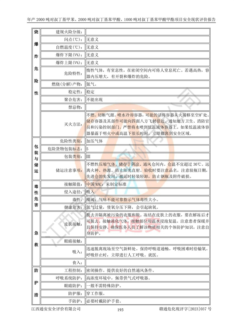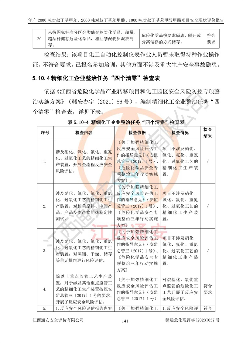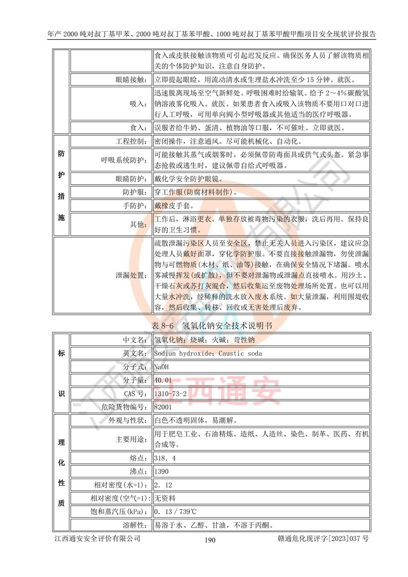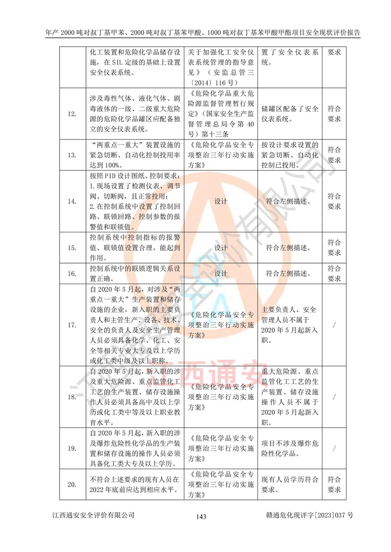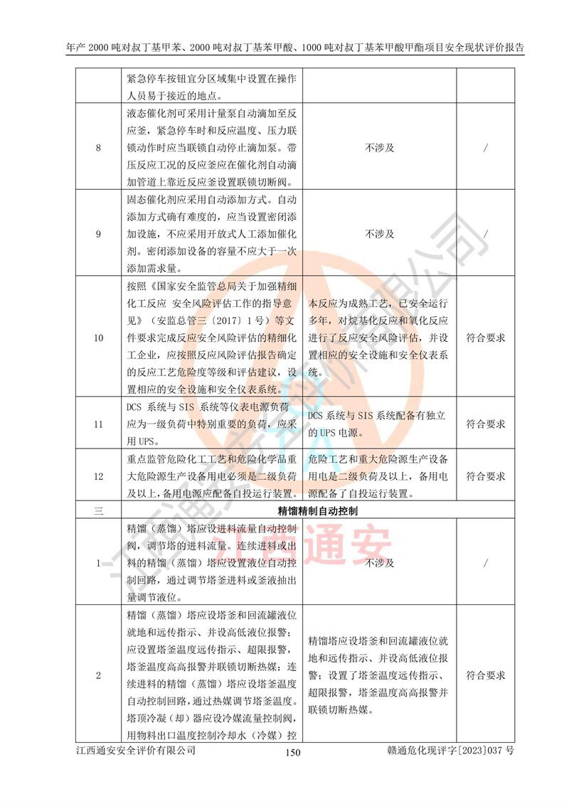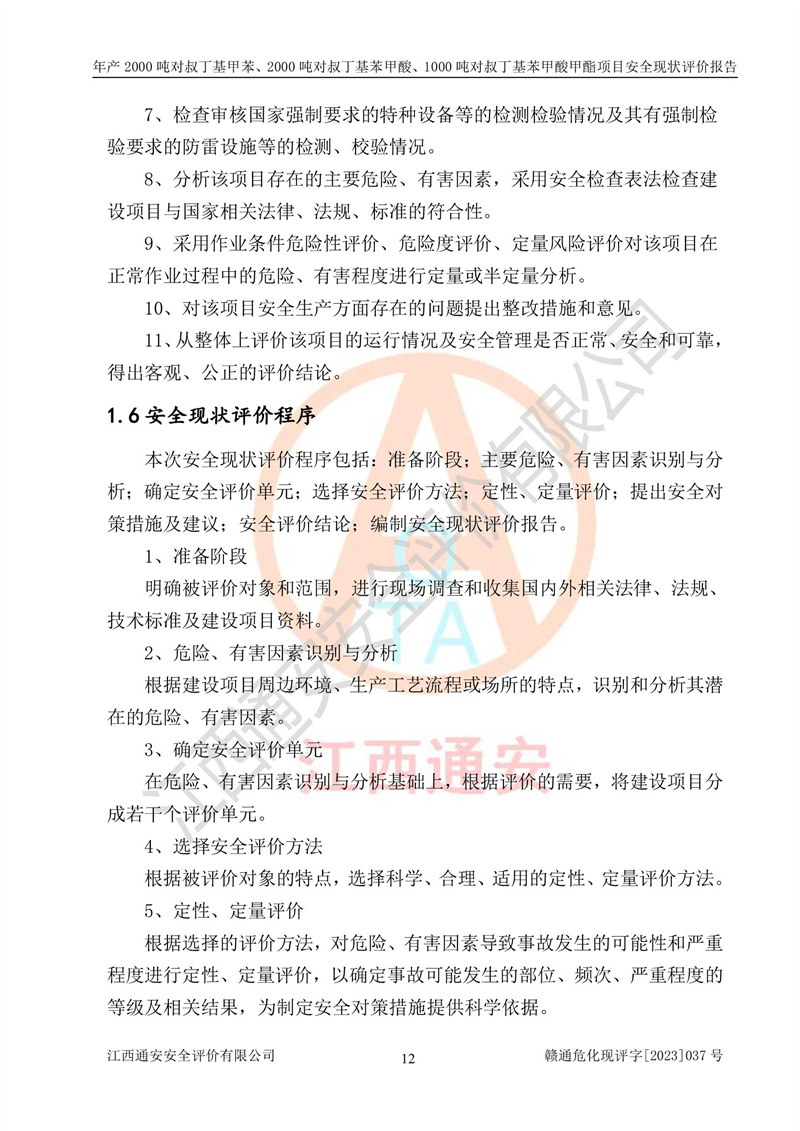 江西永通科技股份有限公司位于江西省贛州市寧都縣工業(yè)園,法定**人為劉忠春,成立于2009年09月25日,注冊資本玖仟陸佰肆拾陸萬陸仟元整,營業(yè)執(zhí)照經(jīng)營范圍為化學(xué)原料藥、醫(yī)藥中間體等研發(fā)、生產(chǎn)、銷售等。 江西永通科技股份有限公司2020年10月26日取得了《安全生產(chǎn)許可證》,許可證編號:(贛)WH安許證字[2011]0642號,許可范圍為對叔丁基甲苯(2kt/a)、對叔丁基苯甲酸(2kt/a)、對叔丁基苯甲酸甲酯(1kt/a),**期:2020年10月26日至2023年10月25日。該公司2021年10月22日取得了安全生產(chǎn)標(biāo)準(zhǔn)化證書,證書編號:贛市AQBWHⅢ[2021]168,**期至2024年10月21日。該公司現(xiàn)有員工133人,其中專職安全管理人員3人。 江西永通科技股份有限公司年產(chǎn)2000噸對叔丁基甲苯、2000噸對叔丁基苯甲酸、1000噸對叔丁基苯甲酸甲酯項(xiàng)目生產(chǎn)過程中涉及的原輔材料為甲苯、異丁烯、液氧(氧氣)、甲醇、濃硫酸、液堿(氫氧化鈉)、活性炭、硅藻土、氧化催化劑和氮?dú)?,產(chǎn)品為對叔丁基甲苯、對叔丁基苯甲酸和對叔丁基苯甲酸甲酯。根據(jù)《危險(xiǎn)化學(xué)品目錄》,該項(xiàng)目涉及的甲苯、異丁烯、液氧(氧氣)、甲醇、濃硫酸、液堿(氫氧化鈉)和氮?dú)鈱儆?/span>危險(xiǎn)化學(xué)品。經(jīng)辨識,甲苯和甲醇屬于重點(diǎn)監(jiān)管的危險(xiǎn)化學(xué)品,甲苯和硫酸屬于第三類易制毒化學(xué)品、甲醇屬于特別管控的危險(xiǎn)化學(xué)品,不涉及監(jiān)控化學(xué)品、易制爆危險(xiǎn)化學(xué)品、劇毒化學(xué)品和高毒物品,儲罐區(qū)構(gòu)成三級重大危險(xiǎn)源,其他生產(chǎn)、儲存單元不構(gòu)成危險(xiǎn)化學(xué)品重大危險(xiǎn)源,涉及的烷基化反應(yīng)和氧化反應(yīng)屬于重點(diǎn)監(jiān)管的危險(xiǎn)化工工藝。根據(jù)《安全生產(chǎn)許可證條例》、《危險(xiǎn)化學(xué)品安全管理?xiàng)l例》和《危險(xiǎn)化學(xué)品生產(chǎn)企業(yè)安全生產(chǎn)許可實(shí)施辦法》的相關(guān)規(guī)定,該項(xiàng)目涉及甲苯回收,需要辦理危險(xiǎn)化學(xué)品安全生產(chǎn)許可證。根據(jù)生產(chǎn)工藝特點(diǎn)及物料的理化特性可知,該項(xiàng)目生產(chǎn)過程中存在火災(zāi)與爆炸、中毒與窒息、觸電、機(jī)械傷害等危險(xiǎn)有害因素。 該公司自2020年10月26日取得安全生產(chǎn)許可證以來,生產(chǎn)運(yùn)行正常,未發(fā)生一般及以上生產(chǎn)安全事故。 |