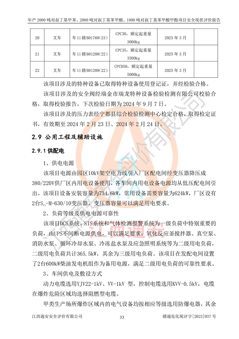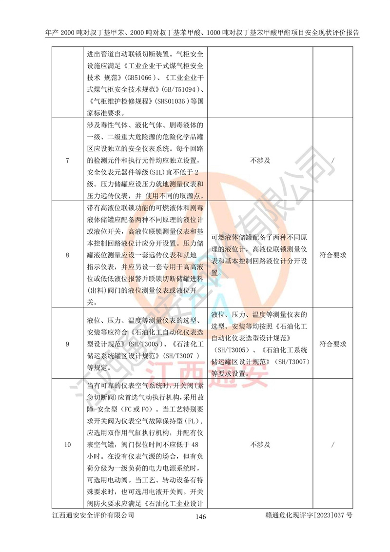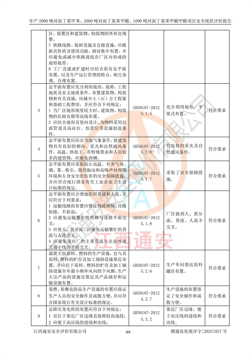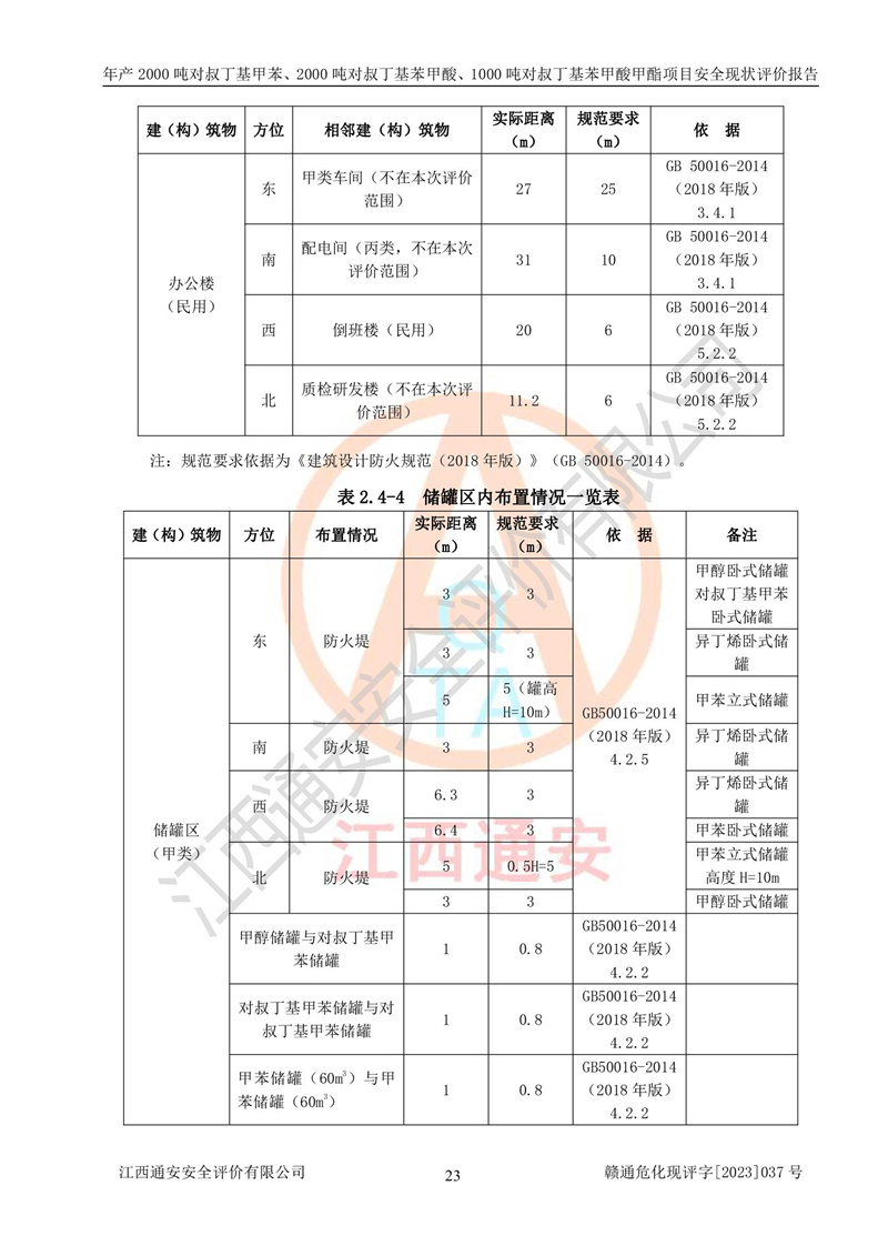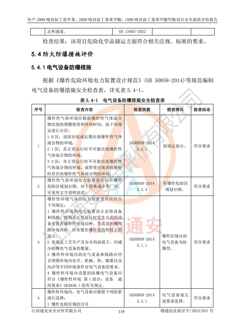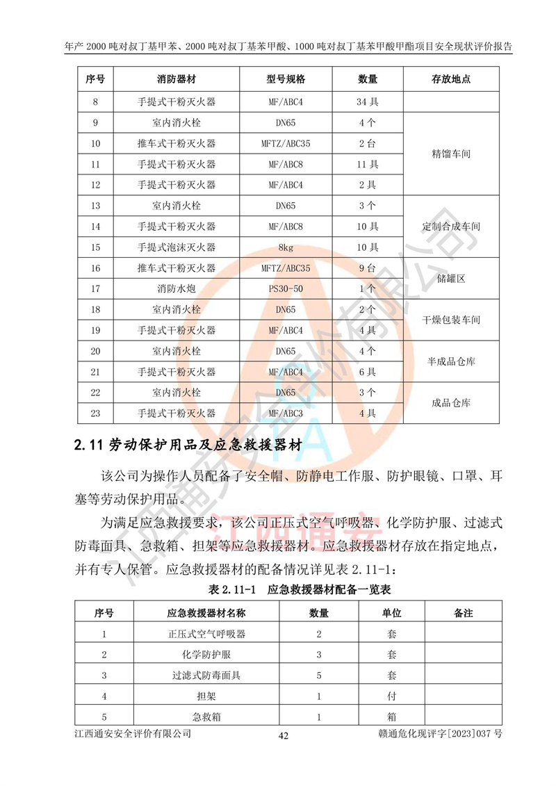 江西永通科技股份有限公司位于江西省贛州市寧都縣工業(yè)園,法定**人為劉忠春,成立于2009年09月25日,注冊資本玖仟陸佰肆拾陸萬陸仟元整,營業(yè)執(zhí)照經(jīng)營范圍為化學(xué)原料藥、醫(yī)藥中間體等研發(fā)、生產(chǎn)、銷售等。 江西永通科技股份有限公司2020年10月26日取得了《安全生產(chǎn)許可證》,許可證編號:(贛)WH安許證字[2011]0642號,許可范圍為對叔丁基甲苯(2kt/a)、對叔丁基苯甲酸(2kt/a)、對叔丁基苯甲酸甲酯(1kt/a),**期:2020年10月26日至2023年10月25日。該公司2021年10月22日取得了安全生產(chǎn)標(biāo)準(zhǔn)化證書,證書編號:贛市AQBWHⅢ[2021]168,**期至2024年10月21日。該公司現(xiàn)有員工133人,其中專職安全管理人員3人。 江西永通科技股份有限公司年產(chǎn)2000噸對叔丁基甲苯、2000噸對叔丁基苯甲酸、1000噸對叔丁基苯甲酸甲酯項(xiàng)目生產(chǎn)過程中涉及的原輔材料為甲苯、異丁烯、液氧(氧氣)、甲醇、濃硫酸、液堿(氫氧化鈉)、活性炭、硅藻土、氧化催化劑和氮?dú)?,產(chǎn)品為對叔丁基甲苯、對叔丁基苯甲酸和對叔丁基苯甲酸甲酯。根據(jù)《危險(xiǎn)化學(xué)品目錄》,該項(xiàng)目涉及的甲苯、異丁烯、液氧(氧氣)、甲醇、濃硫酸、液堿(氫氧化鈉)和氮?dú)鈱儆?/span>危險(xiǎn)化學(xué)品。經(jīng)辨識,甲苯和甲醇屬于重點(diǎn)監(jiān)管的危險(xiǎn)化學(xué)品,甲苯和硫酸屬于第三類易制毒化學(xué)品、甲醇屬于特別管控的危險(xiǎn)化學(xué)品,不涉及監(jiān)控化學(xué)品、易制爆危險(xiǎn)化學(xué)品、劇毒化學(xué)品和高毒物品,儲罐區(qū)構(gòu)成三級重大危險(xiǎn)源,其他生產(chǎn)、儲存單元不構(gòu)成危險(xiǎn)化學(xué)品重大危險(xiǎn)源,涉及的烷基化反應(yīng)和氧化反應(yīng)屬于重點(diǎn)監(jiān)管的危險(xiǎn)化工工藝。根據(jù)《安全生產(chǎn)許可證條例》、《危險(xiǎn)化學(xué)品安全管理?xiàng)l例》和《危險(xiǎn)化學(xué)品生產(chǎn)企業(yè)安全生產(chǎn)許可實(shí)施辦法》的相關(guān)規(guī)定,該項(xiàng)目涉及甲苯回收,需要辦理危險(xiǎn)化學(xué)品安全生產(chǎn)許可證。根據(jù)生產(chǎn)工藝特點(diǎn)及物料的理化特性可知,該項(xiàng)目生產(chǎn)過程中存在火災(zāi)與爆炸、中毒與窒息、觸電、機(jī)械傷害等危險(xiǎn)有害因素。 該公司自2020年10月26日取得安全生產(chǎn)許可證以來,生產(chǎn)運(yùn)行正常,未發(fā)生一般及以上生產(chǎn)安全事故。 |