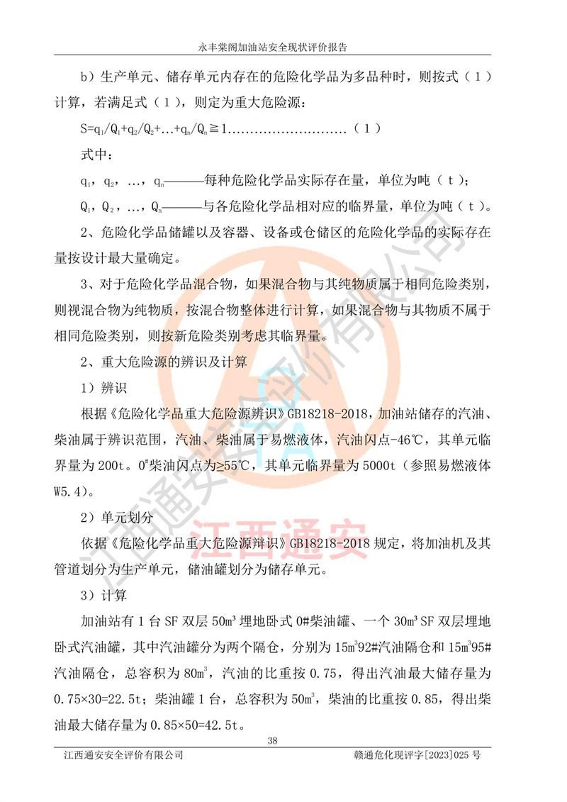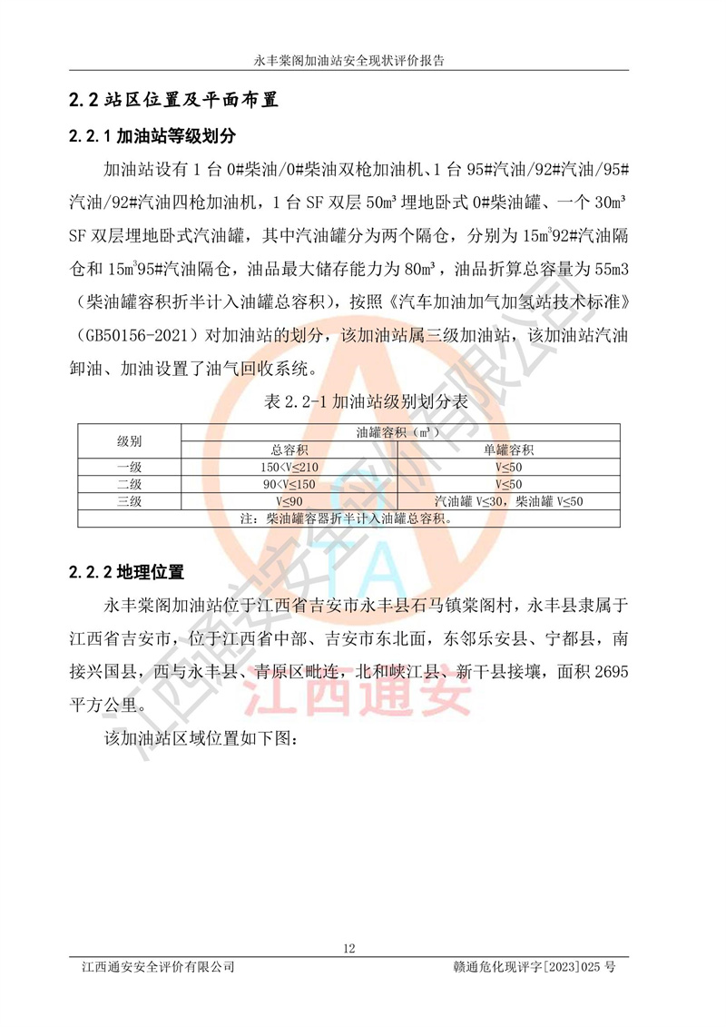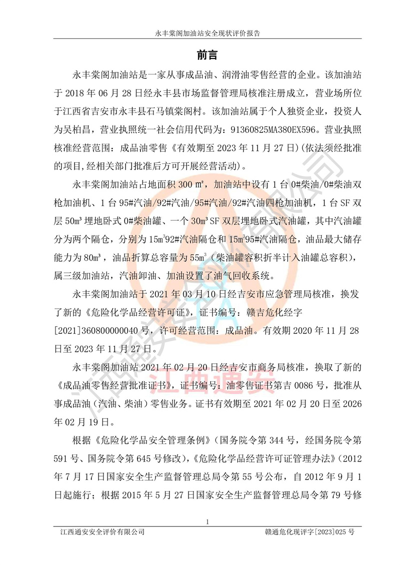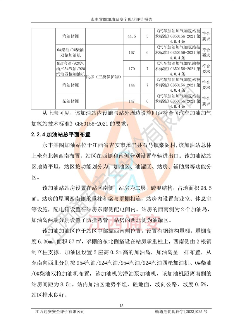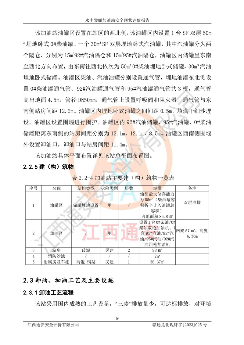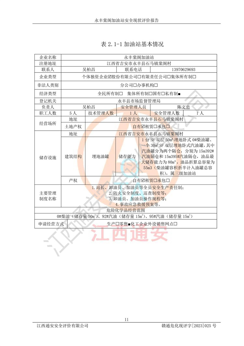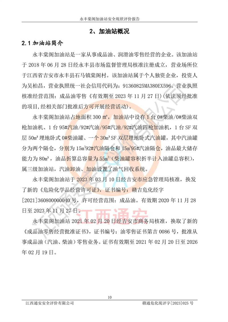 永豐棠閣加油站是一家從事成品油、潤滑油零售經(jīng)營的企業(yè)。該加油站于2018年06月28日經(jīng)永豐縣市場監(jiān)督管理局核準(zhǔn)注冊成立,營業(yè)場所位于江西省吉安市永豐縣石馬鎮(zhèn)棠閣村。該加油站屬于個人獨(dú)資企業(yè),投資人為吳柏昌,營業(yè)執(zhí)照統(tǒng)一社會信用代碼為:91360825MA380EX596。營業(yè)執(zhí)照核準(zhǔn)經(jīng)營范圍:成品油零售《**期至2023年11月27日)(依法須經(jīng)批準(zhǔn)的項(xiàng)目,經(jīng)相關(guān)部門批準(zhǔn)后方可開展經(jīng)營活動)。 永豐棠閣加油站占地面積300㎡,加油站中設(shè)有1臺0#柴油/0#柴油雙槍加油機(jī)、1臺95#汽油/92#汽油/95#汽油/92#汽油四槍加油機(jī),1臺SF雙層50m3埋地臥式0#柴油罐、一個30m3SF雙層埋地臥式汽油罐,其中汽油罐分為兩個隔倉,分別為15m392#汽油隔倉和15m395#汽油隔倉,油品*大儲存能力為80m3,油品折算總?cè)萘繛?5m3(柴油罐容積折半計(jì)入油罐總?cè)莘e),屬三級加油站,汽油卸油、加油設(shè)置了油氣回收系統(tǒng)。 |