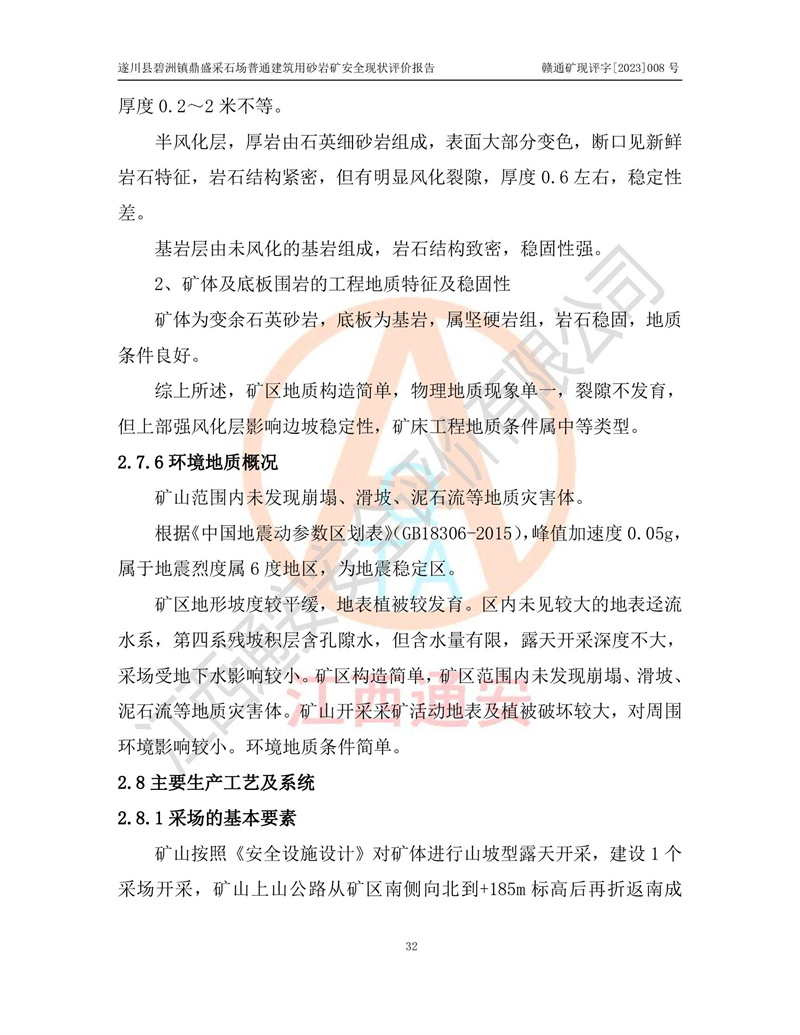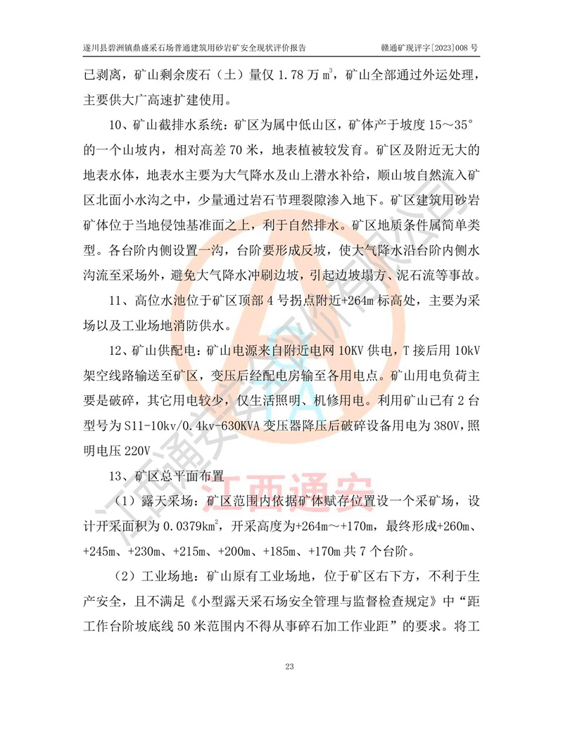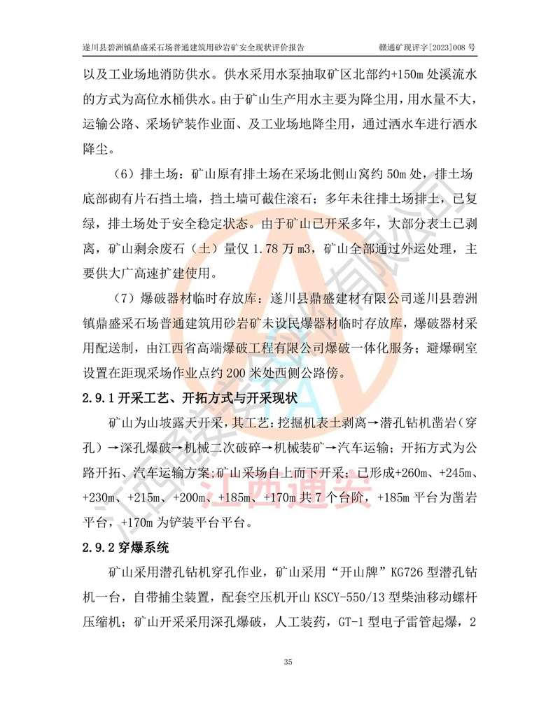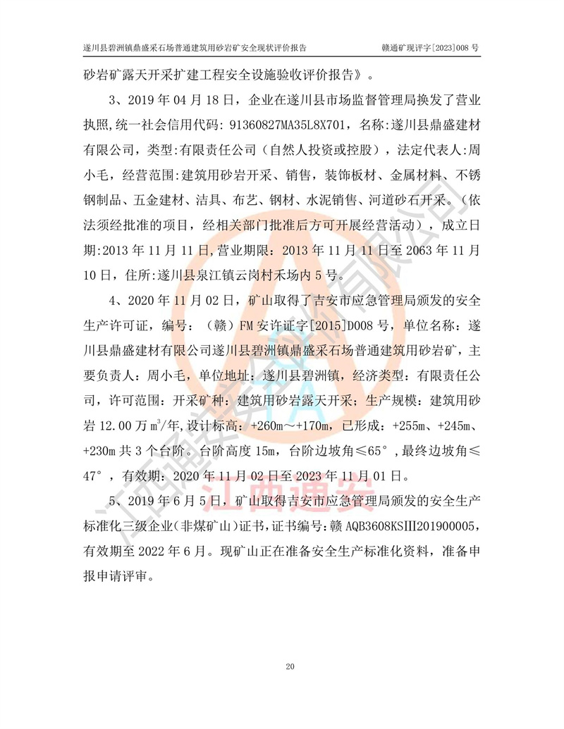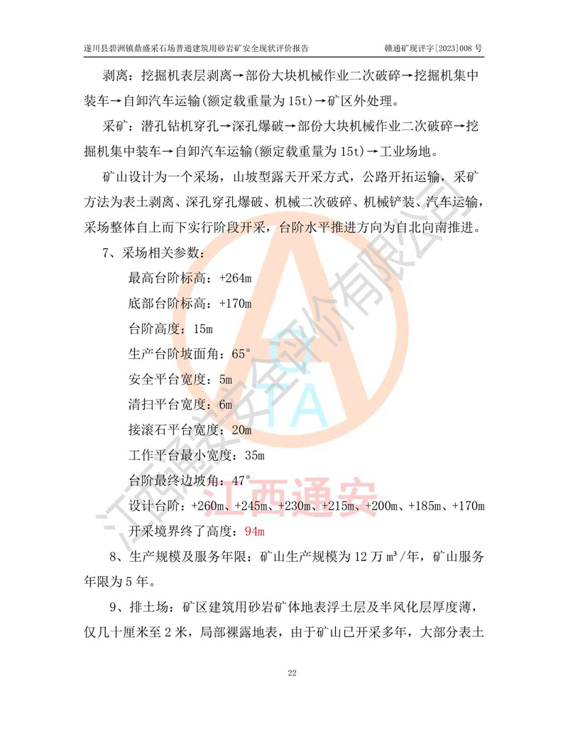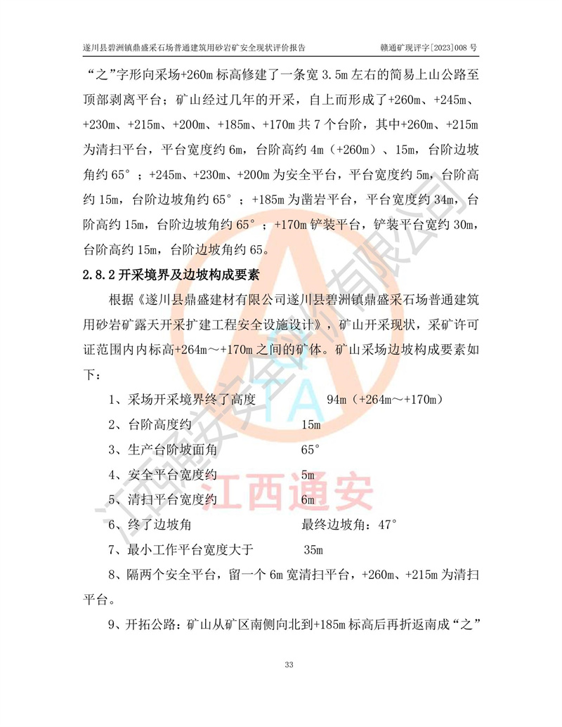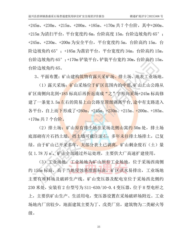遂川縣鼎盛建材有限公司遂川縣碧洲鎮(zhèn)鼎盛采石場(chǎng)普通建筑用砂巖礦礦,屬有限責(zé)任公司。遂川縣鼎盛建材有限公司遂川縣碧洲鎮(zhèn)鼎盛采石場(chǎng)普通建筑用砂巖礦屬露天開(kāi)采礦山企業(yè),主要產(chǎn)品為建筑砂巖礦開(kāi)采、加工、銷售。礦區(qū)位于遂川縣城區(qū)88o方位直距約17**處。礦區(qū)位置地理坐標(biāo):東經(jīng)114°41′05″~114°41′12″,北緯26°19′49″~26°19′58″。礦區(qū)中心地理坐標(biāo):東經(jīng)114°41′08″,北緯26°19′54″。行政區(qū)劃屬碧洲鎮(zhèn)管轄。碧洲鎮(zhèn)有S554省道通達(dá)遂川縣城,交通方便。 礦山采用開(kāi)拓公路、礦山上山公路從礦區(qū)南側(cè)向北到+185m標(biāo)高后再折返南成“之”字形向采場(chǎng)+260m標(biāo)高修建了一條寬3.5m左右的簡(jiǎn)易上山公路至頂部剝離平臺(tái);礦山經(jīng)過(guò)多年的開(kāi)采,自上而形成了+260m、+245m、+230m、+215m、+200m、+185m、+170m共7個(gè)臺(tái)階,其中+260m、+215m為清掃平臺(tái),平臺(tái)寬度約6m,臺(tái)階**15m,臺(tái)階邊坡角約65°;+245m、+230m、+200m為安全平臺(tái),平臺(tái)寬度約5m,臺(tái)階高約15m,臺(tái)階邊坡角約65°;+185m為鑿巖平臺(tái),平臺(tái)寬度約34m,臺(tái)階高約15m,臺(tái)階邊坡角約65°;+170m鏟裝平臺(tái),鏟裝平臺(tái)寬約30m,臺(tái)階高約15m,臺(tái)階邊坡角約65。 2019年6月5日,礦山取得吉安市應(yīng)急管理局頒發(fā)的安全生產(chǎn)標(biāo)準(zhǔn)化三級(jí)企業(yè)(非煤礦山)證書,證書編號(hào):贛AQB3608KSⅢ201900005,**期至2022年6月?,F(xiàn)礦山正在準(zhǔn)備安全生產(chǎn)標(biāo)準(zhǔn)化資料,準(zhǔn)備申報(bào)申請(qǐng)?jiān)u審。 |