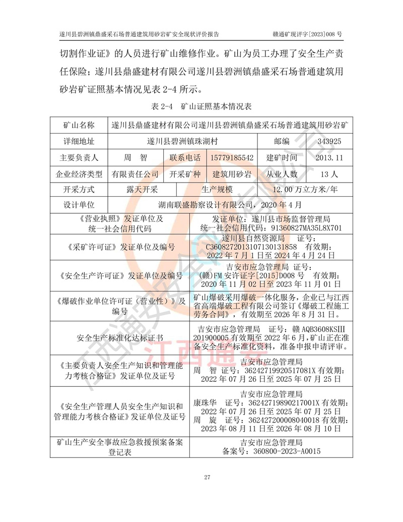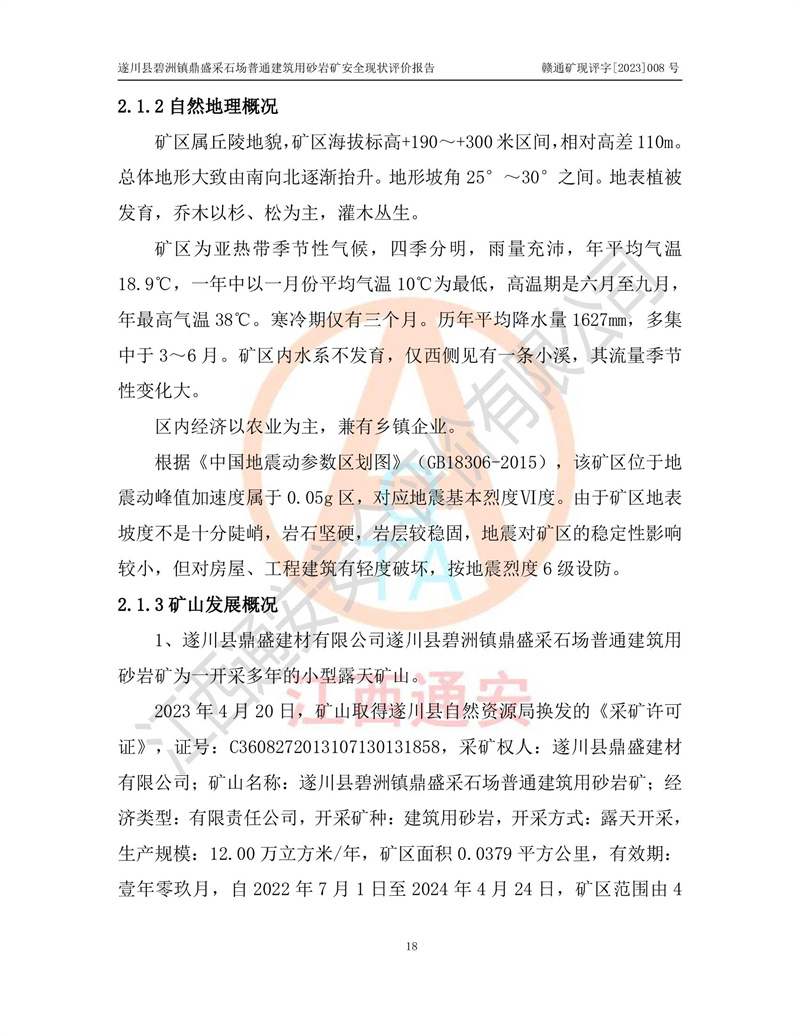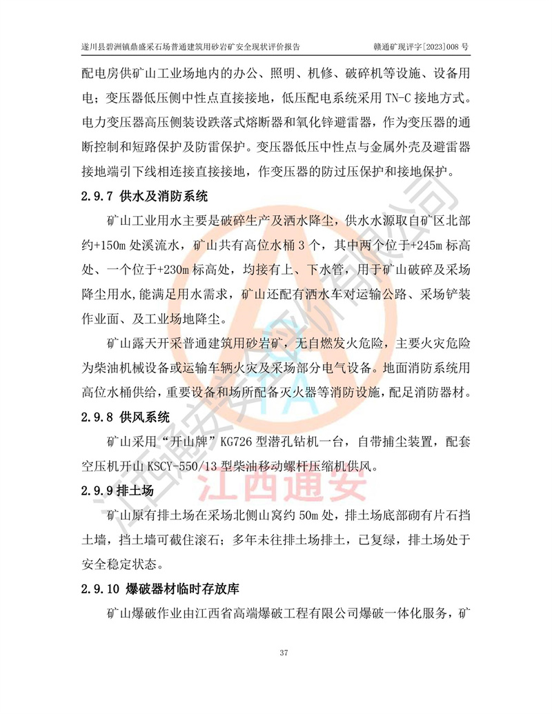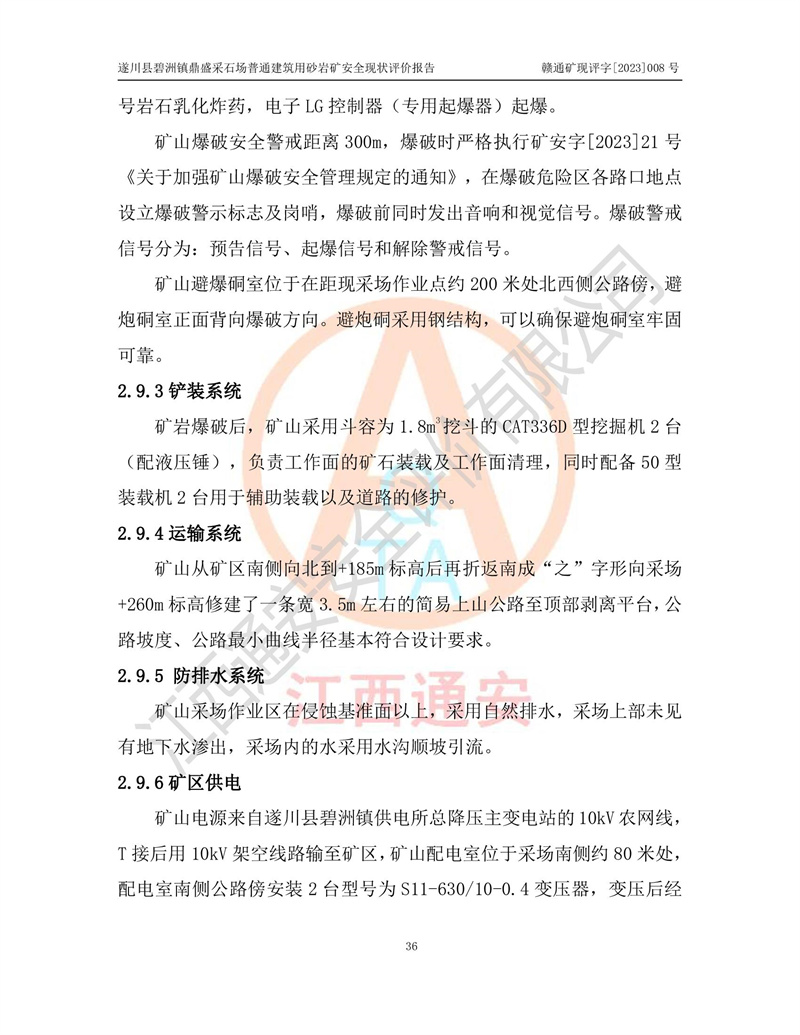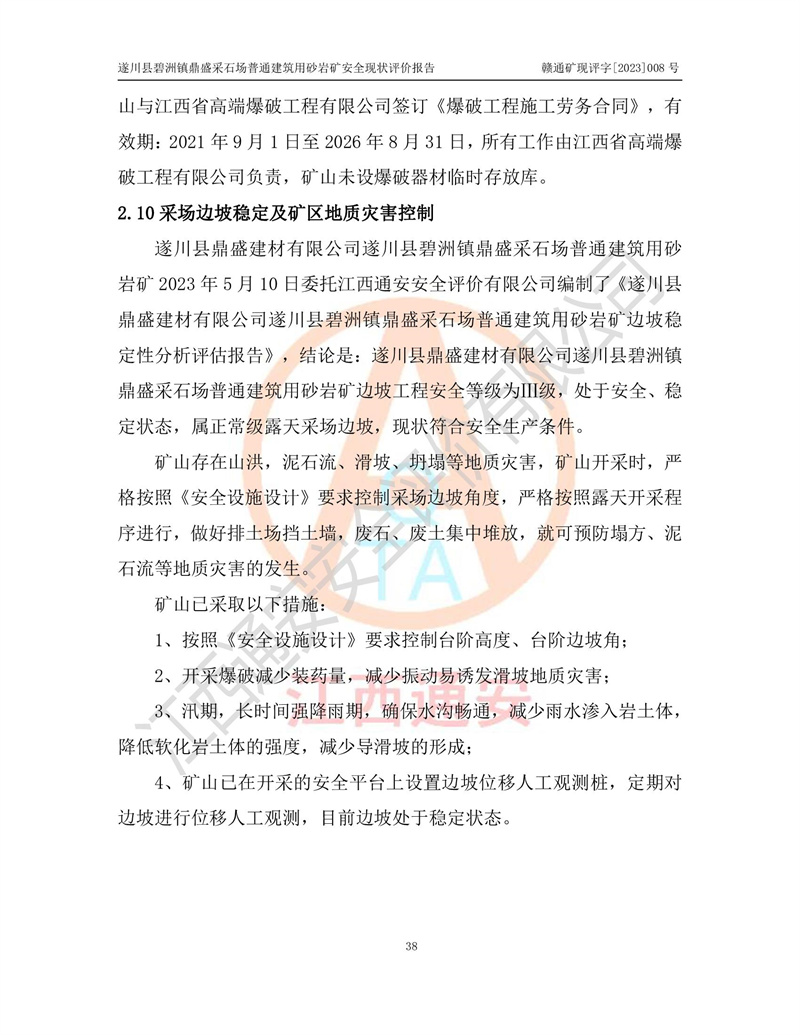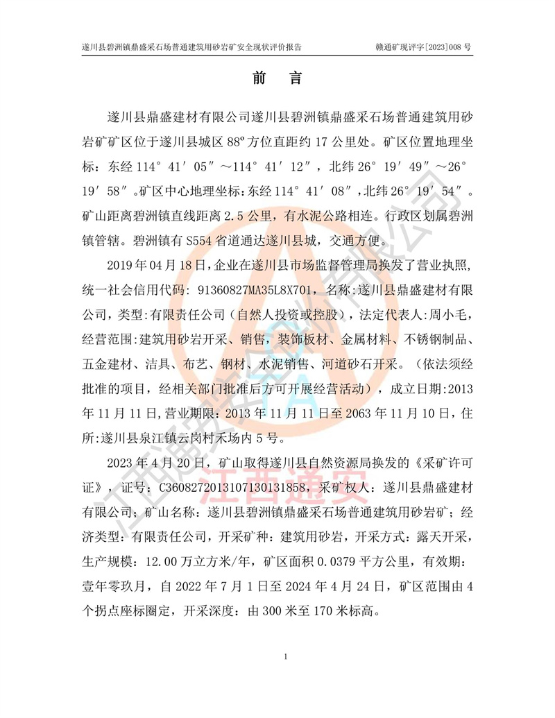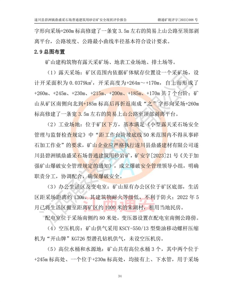 遂川縣鼎盛建材有限公司遂川縣碧洲鎮(zhèn)鼎盛采石場(chǎng)普通建筑用砂巖礦礦,屬有限責(zé)任公司。遂川縣鼎盛建材有限公司遂川縣碧洲鎮(zhèn)鼎盛采石場(chǎng)普通建筑用砂巖礦屬露天開(kāi)采礦山企業(yè),主要產(chǎn)品為建筑砂巖礦開(kāi)采、加工、銷售。礦區(qū)位于遂川縣城區(qū)88o方位直距約17**處。礦區(qū)位置地理坐標(biāo):東經(jīng)114°41′05″~114°41′12″,北緯26°19′49″~26°19′58″。礦區(qū)中心地理坐標(biāo):東經(jīng)114°41′08″,北緯26°19′54″。行政區(qū)劃屬碧洲鎮(zhèn)管轄。碧洲鎮(zhèn)有S554省道通達(dá)遂川縣城,交通方便。 礦山采用開(kāi)拓公路、礦山上山公路從礦區(qū)南側(cè)向北到+185m標(biāo)高后再折返南成“之”字形向采場(chǎng)+260m標(biāo)高修建了一條寬3.5m左右的簡(jiǎn)易上山公路至頂部剝離平臺(tái);礦山經(jīng)過(guò)多年的開(kāi)采,自上而形成了+260m、+245m、+230m、+215m、+200m、+185m、+170m共7個(gè)臺(tái)階,其中+260m、+215m為清掃平臺(tái),平臺(tái)寬度約6m,臺(tái)階**15m,臺(tái)階邊坡角約65°;+245m、+230m、+200m為安全平臺(tái),平臺(tái)寬度約5m,臺(tái)階高約15m,臺(tái)階邊坡角約65°;+185m為鑿巖平臺(tái),平臺(tái)寬度約34m,臺(tái)階高約15m,臺(tái)階邊坡角約65°;+170m鏟裝平臺(tái),鏟裝平臺(tái)寬約30m,臺(tái)階高約15m,臺(tái)階邊坡角約65。 2019年6月5日,礦山取得吉安市應(yīng)急管理局頒發(fā)的安全生產(chǎn)標(biāo)準(zhǔn)化三級(jí)企業(yè)(非煤礦山)證書,證書編號(hào):贛AQB3608KSⅢ201900005,**期至2022年6月?,F(xiàn)礦山正在準(zhǔn)備安全生產(chǎn)標(biāo)準(zhǔn)化資料,準(zhǔn)備申報(bào)申請(qǐng)?jiān)u審。 |
