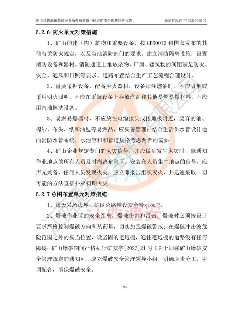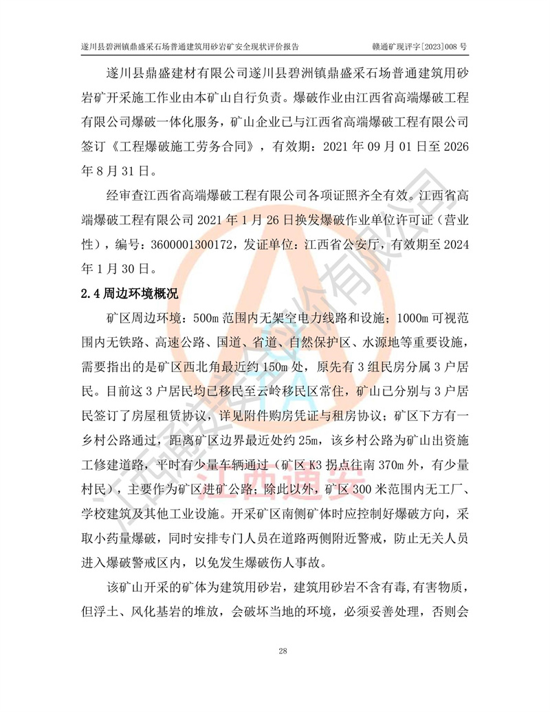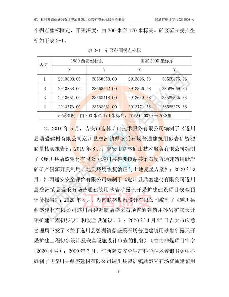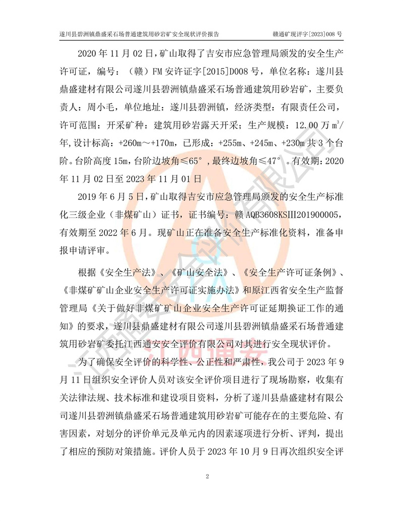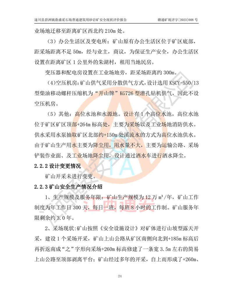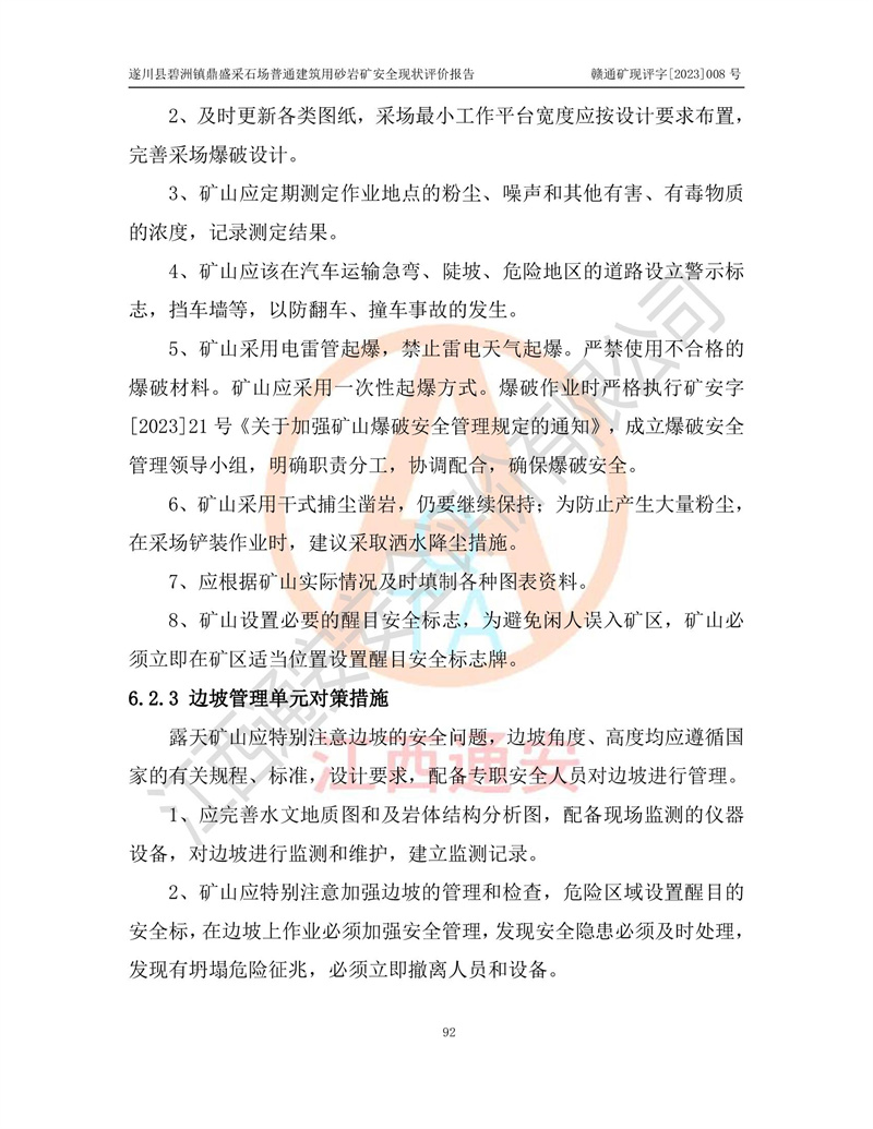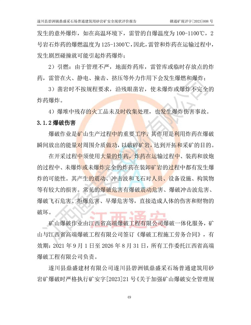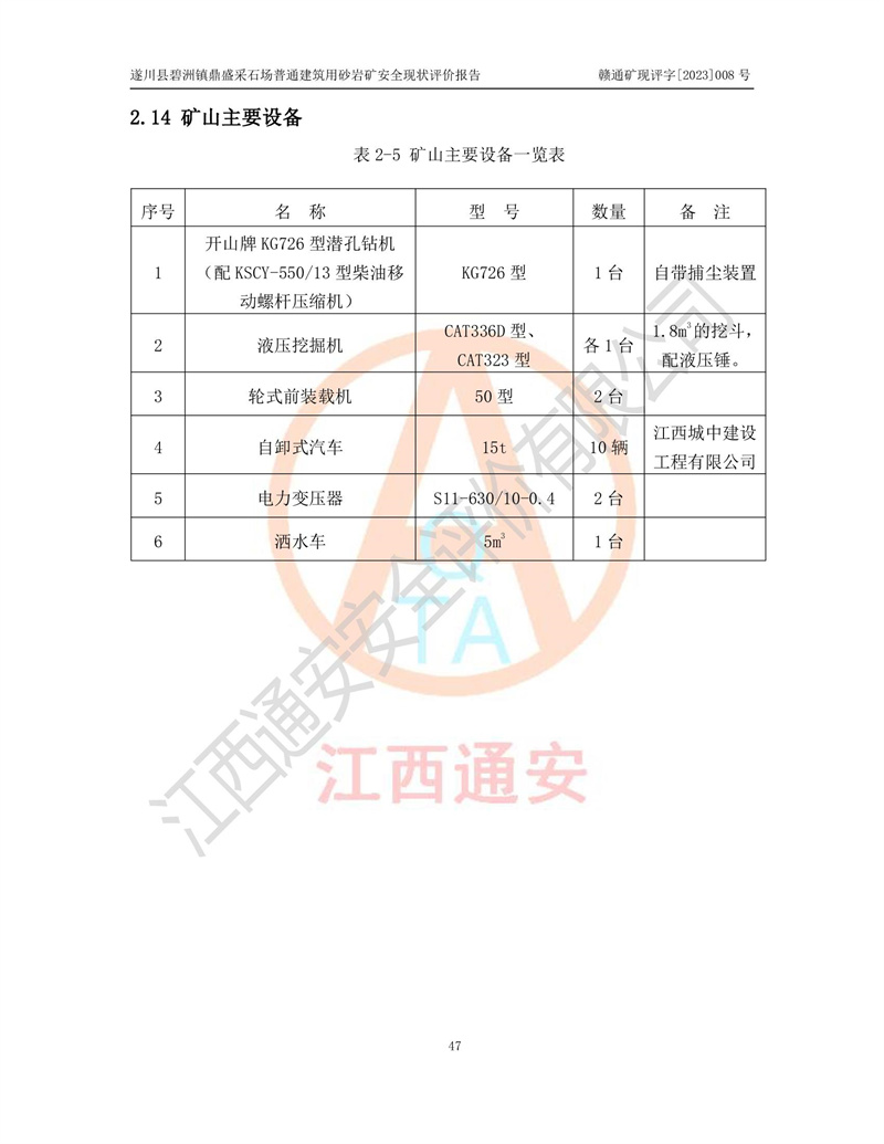 遂川縣鼎盛建材有限公司遂川縣碧洲鎮(zhèn)鼎盛采石場(chǎng)普通建筑用砂巖礦礦,屬有限責(zé)任公司。遂川縣鼎盛建材有限公司遂川縣碧洲鎮(zhèn)鼎盛采石場(chǎng)普通建筑用砂巖礦屬露天開(kāi)采礦山企業(yè),主要產(chǎn)品為建筑砂巖礦開(kāi)采、加工、銷售。礦區(qū)位于遂川縣城區(qū)88o方位直距約17**處。礦區(qū)位置地理坐標(biāo):東經(jīng)114°41′05″~114°41′12″,北緯26°19′49″~26°19′58″。礦區(qū)中心地理坐標(biāo):東經(jīng)114°41′08″,北緯26°19′54″。行政區(qū)劃屬碧洲鎮(zhèn)管轄。碧洲鎮(zhèn)有S554省道通達(dá)遂川縣城,交通方便。 礦山采用開(kāi)拓公路、礦山上山公路從礦區(qū)南側(cè)向北到+185m標(biāo)高后再折返南成“之”字形向采場(chǎng)+260m標(biāo)高修建了一條寬3.5m左右的簡(jiǎn)易上山公路至頂部剝離平臺(tái);礦山經(jīng)過(guò)多年的開(kāi)采,自上而形成了+260m、+245m、+230m、+215m、+200m、+185m、+170m共7個(gè)臺(tái)階,其中+260m、+215m為清掃平臺(tái),平臺(tái)寬度約6m,臺(tái)階**15m,臺(tái)階邊坡角約65°;+245m、+230m、+200m為安全平臺(tái),平臺(tái)寬度約5m,臺(tái)階高約15m,臺(tái)階邊坡角約65°;+185m為鑿巖平臺(tái),平臺(tái)寬度約34m,臺(tái)階高約15m,臺(tái)階邊坡角約65°;+170m鏟裝平臺(tái),鏟裝平臺(tái)寬約30m,臺(tái)階高約15m,臺(tái)階邊坡角約65。 2019年6月5日,礦山取得吉安市應(yīng)急管理局頒發(fā)的安全生產(chǎn)標(biāo)準(zhǔn)化三級(jí)企業(yè)(非煤礦山)證書,證書編號(hào):贛AQB3608KSⅢ201900005,**期至2022年6月?,F(xiàn)礦山正在準(zhǔn)備安全生產(chǎn)標(biāo)準(zhǔn)化資料,準(zhǔn)備申報(bào)申請(qǐng)?jiān)u審。 |