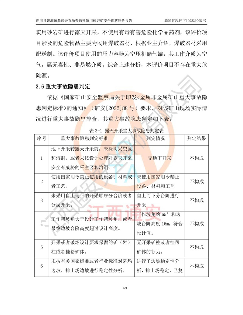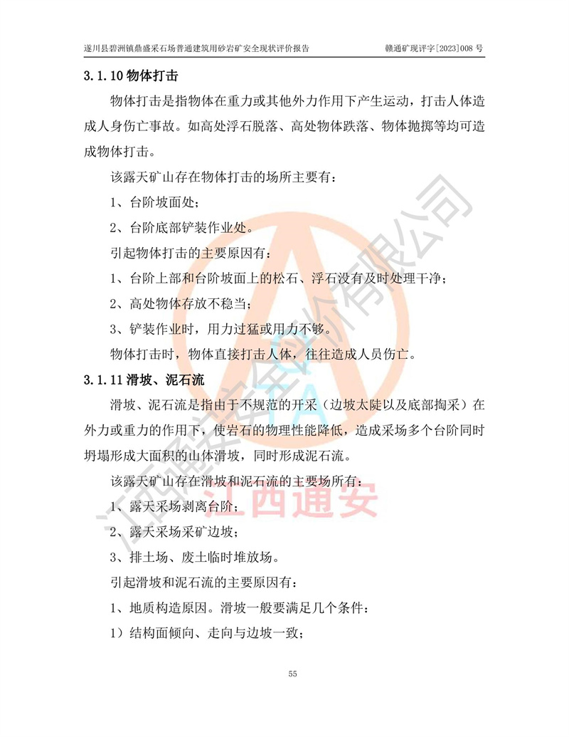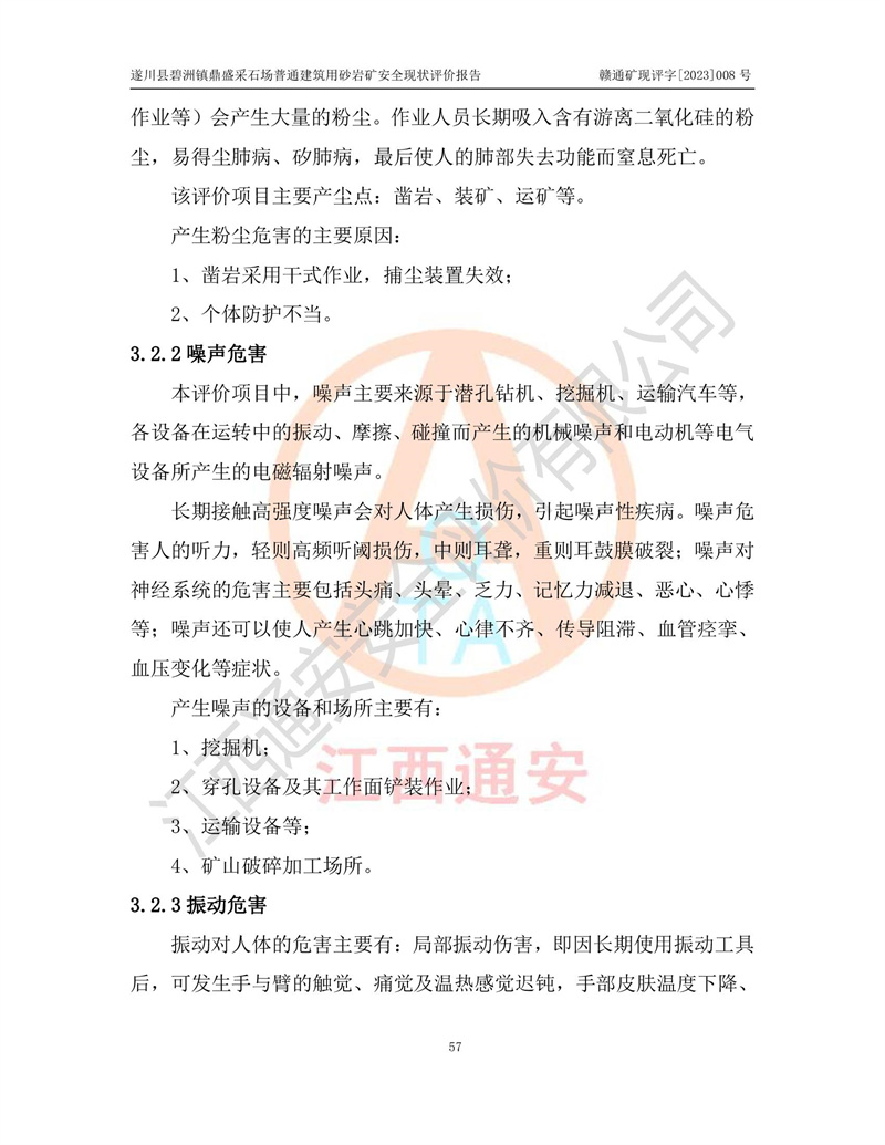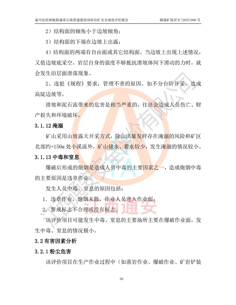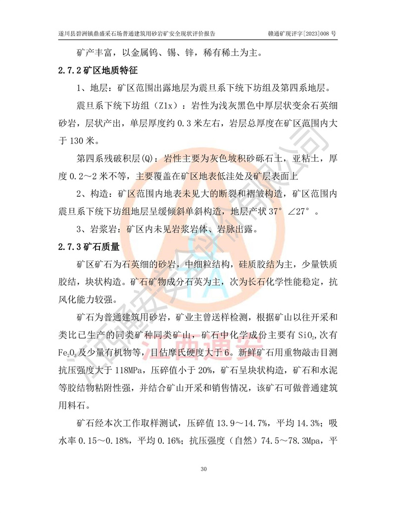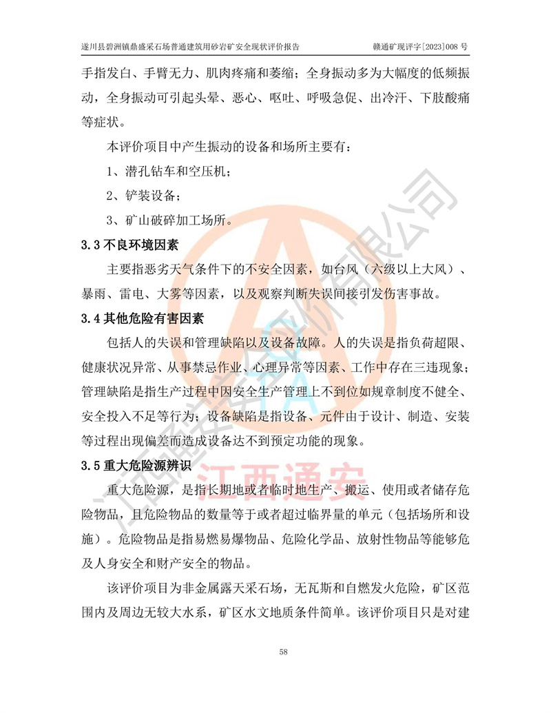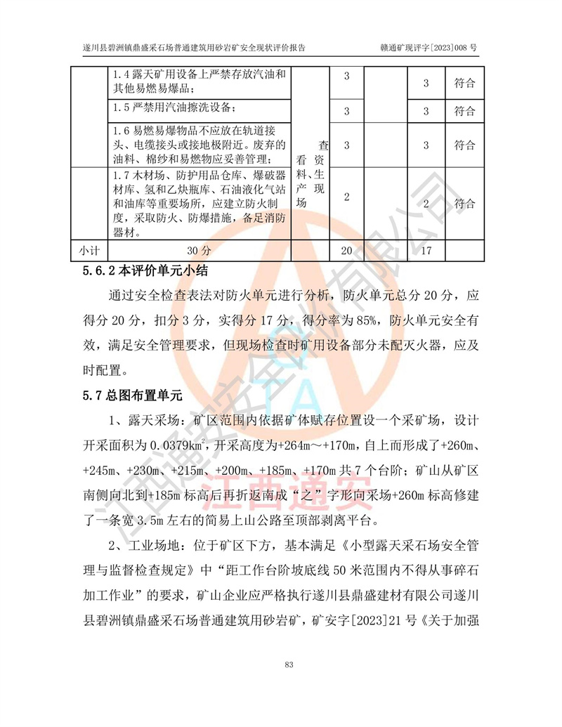 遂川縣鼎盛建材有限公司遂川縣碧洲鎮(zhèn)鼎盛采石場(chǎng)普通建筑用砂巖礦礦,屬有限責(zé)任公司。遂川縣鼎盛建材有限公司遂川縣碧洲鎮(zhèn)鼎盛采石場(chǎng)普通建筑用砂巖礦屬露天開(kāi)采礦山企業(yè),主要產(chǎn)品為建筑砂巖礦開(kāi)采、加工、銷售。礦區(qū)位于遂川縣城區(qū)88o方位直距約17**處。礦區(qū)位置地理坐標(biāo):東經(jīng)114°41′05″~114°41′12″,北緯26°19′49″~26°19′58″。礦區(qū)中心地理坐標(biāo):東經(jīng)114°41′08″,北緯26°19′54″。行政區(qū)劃屬碧洲鎮(zhèn)管轄。碧洲鎮(zhèn)有S554省道通達(dá)遂川縣城,交通方便。 礦山采用開(kāi)拓公路、礦山上山公路從礦區(qū)南側(cè)向北到+185m標(biāo)高后再折返南成“之”字形向采場(chǎng)+260m標(biāo)高修建了一條寬3.5m左右的簡(jiǎn)易上山公路至頂部剝離平臺(tái);礦山經(jīng)過(guò)多年的開(kāi)采,自上而形成了+260m、+245m、+230m、+215m、+200m、+185m、+170m共7個(gè)臺(tái)階,其中+260m、+215m為清掃平臺(tái),平臺(tái)寬度約6m,臺(tái)階**15m,臺(tái)階邊坡角約65°;+245m、+230m、+200m為安全平臺(tái),平臺(tái)寬度約5m,臺(tái)階高約15m,臺(tái)階邊坡角約65°;+185m為鑿巖平臺(tái),平臺(tái)寬度約34m,臺(tái)階高約15m,臺(tái)階邊坡角約65°;+170m鏟裝平臺(tái),鏟裝平臺(tái)寬約30m,臺(tái)階高約15m,臺(tái)階邊坡角約65。 2019年6月5日,礦山取得吉安市應(yīng)急管理局頒發(fā)的安全生產(chǎn)標(biāo)準(zhǔn)化三級(jí)企業(yè)(非煤礦山)證書,證書編號(hào):贛AQB3608KSⅢ201900005,**期至2022年6月?,F(xiàn)礦山正在準(zhǔn)備安全生產(chǎn)標(biāo)準(zhǔn)化資料,準(zhǔn)備申報(bào)申請(qǐng)?jiān)u審。 |
