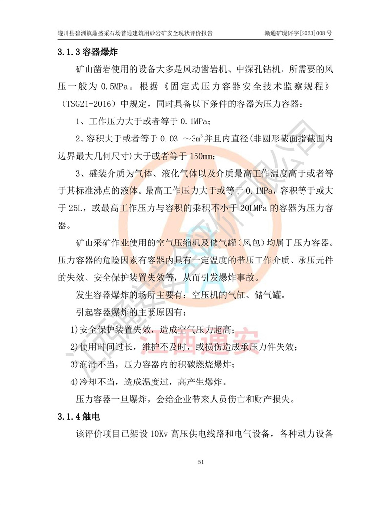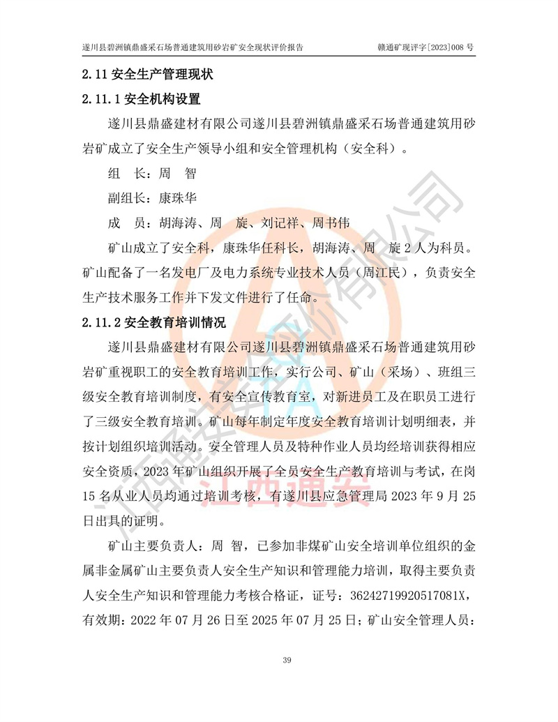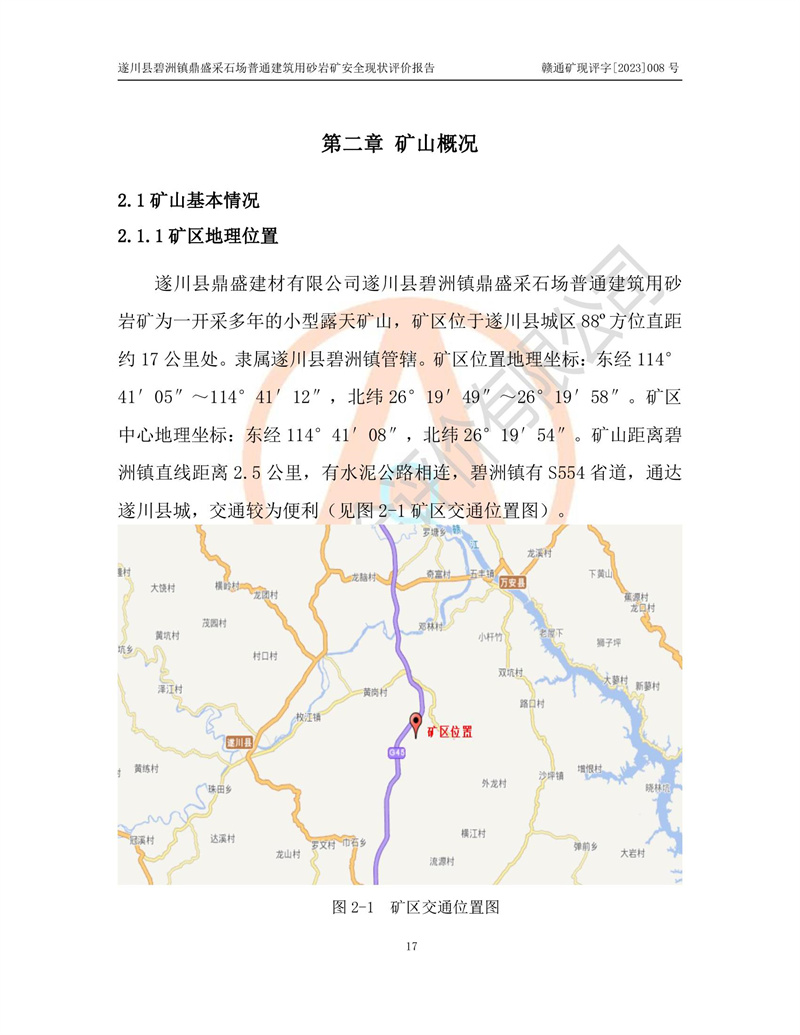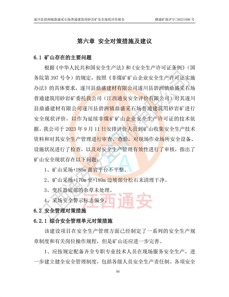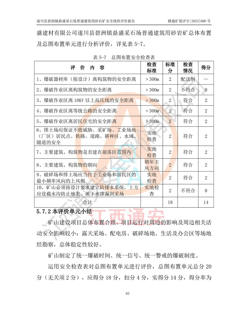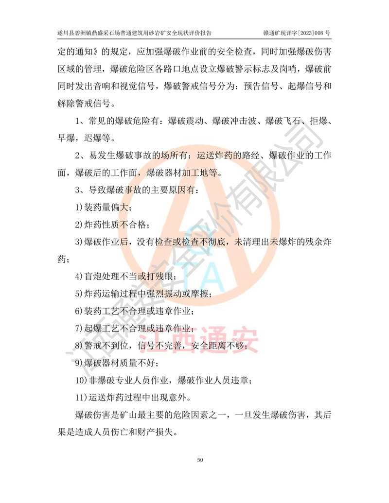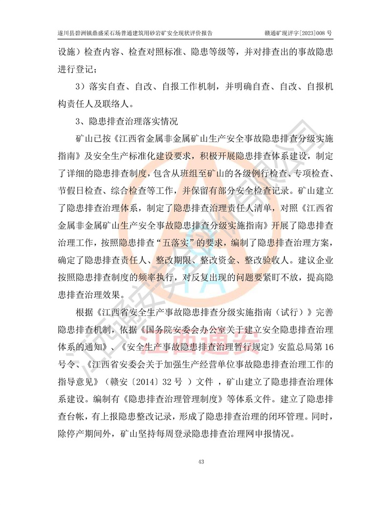 遂川縣鼎盛建材有限公司遂川縣碧洲鎮(zhèn)鼎盛采石場(chǎng)普通建筑用砂巖礦礦,屬有限責(zé)任公司。遂川縣鼎盛建材有限公司遂川縣碧洲鎮(zhèn)鼎盛采石場(chǎng)普通建筑用砂巖礦屬露天開(kāi)采礦山企業(yè),主要產(chǎn)品為建筑砂巖礦開(kāi)采、加工、銷售。礦區(qū)位于遂川縣城區(qū)88o方位直距約17**處。礦區(qū)位置地理坐標(biāo):東經(jīng)114°41′05″~114°41′12″,北緯26°19′49″~26°19′58″。礦區(qū)中心地理坐標(biāo):東經(jīng)114°41′08″,北緯26°19′54″。行政區(qū)劃屬碧洲鎮(zhèn)管轄。碧洲鎮(zhèn)有S554省道通達(dá)遂川縣城,交通方便。 礦山采用開(kāi)拓公路、礦山上山公路從礦區(qū)南側(cè)向北到+185m標(biāo)高后再折返南成“之”字形向采場(chǎng)+260m標(biāo)高修建了一條寬3.5m左右的簡(jiǎn)易上山公路至頂部剝離平臺(tái);礦山經(jīng)過(guò)多年的開(kāi)采,自上而形成了+260m、+245m、+230m、+215m、+200m、+185m、+170m共7個(gè)臺(tái)階,其中+260m、+215m為清掃平臺(tái),平臺(tái)寬度約6m,臺(tái)階**15m,臺(tái)階邊坡角約65°;+245m、+230m、+200m為安全平臺(tái),平臺(tái)寬度約5m,臺(tái)階高約15m,臺(tái)階邊坡角約65°;+185m為鑿巖平臺(tái),平臺(tái)寬度約34m,臺(tái)階高約15m,臺(tái)階邊坡角約65°;+170m鏟裝平臺(tái),鏟裝平臺(tái)寬約30m,臺(tái)階高約15m,臺(tái)階邊坡角約65。 2019年6月5日,礦山取得吉安市應(yīng)急管理局頒發(fā)的安全生產(chǎn)標(biāo)準(zhǔn)化三級(jí)企業(yè)(非煤礦山)證書,證書編號(hào):贛AQB3608KSⅢ201900005,**期至2022年6月?,F(xiàn)礦山正在準(zhǔn)備安全生產(chǎn)標(biāo)準(zhǔn)化資料,準(zhǔn)備申報(bào)申請(qǐng)?jiān)u審。 |