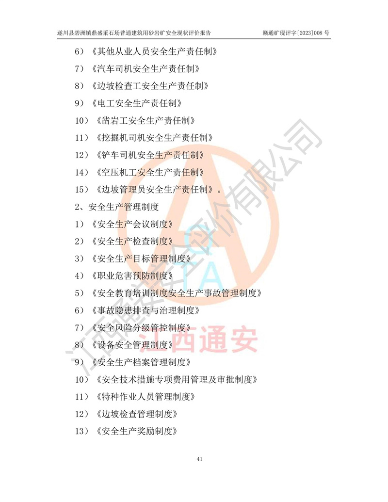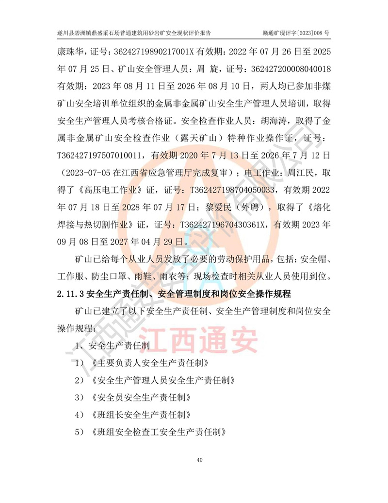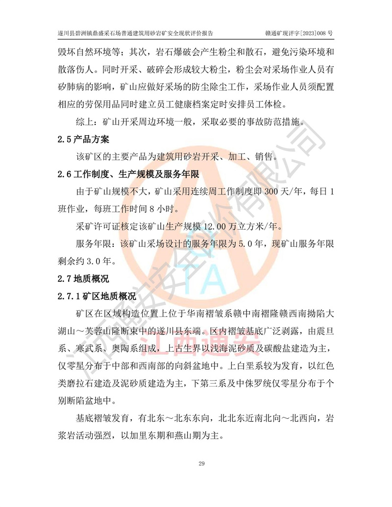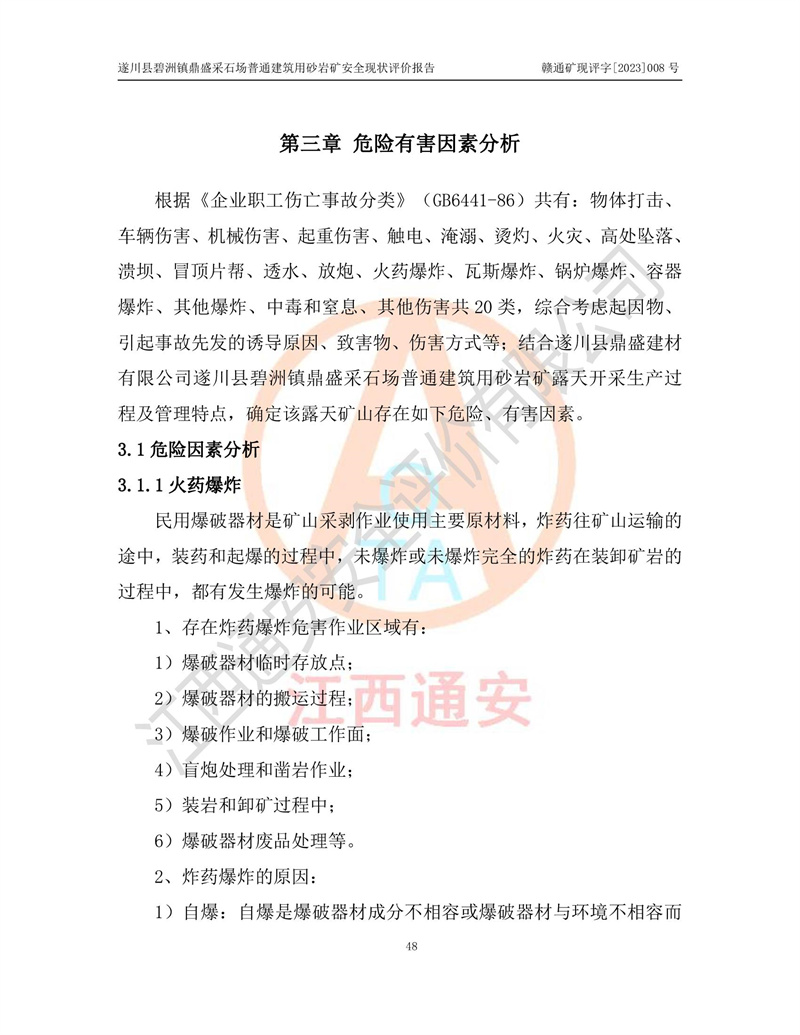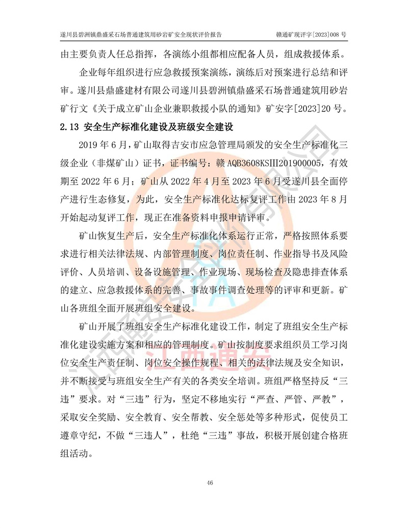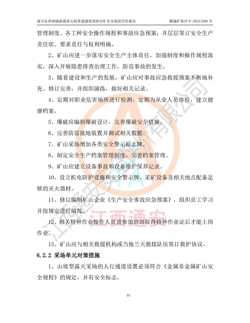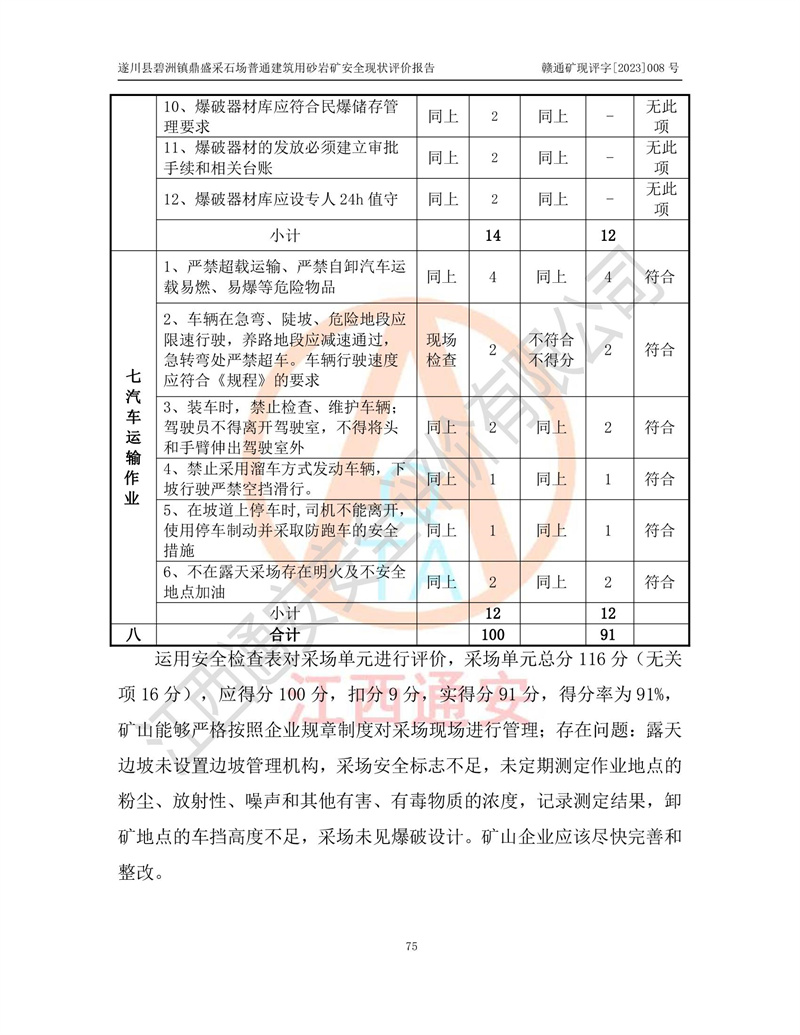遂川縣鼎盛建材有限公司遂川縣碧洲鎮(zhèn)鼎盛采石場(chǎng)普通建筑用砂巖礦礦,屬有限責(zé)任公司。遂川縣鼎盛建材有限公司遂川縣碧洲鎮(zhèn)鼎盛采石場(chǎng)普通建筑用砂巖礦屬露天開(kāi)采礦山企業(yè),主要產(chǎn)品為建筑砂巖礦開(kāi)采、加工、銷售。礦區(qū)位于遂川縣城區(qū)88o方位直距約17**處。礦區(qū)位置地理坐標(biāo):東經(jīng)114°41′05″~114°41′12″,北緯26°19′49″~26°19′58″。礦區(qū)中心地理坐標(biāo):東經(jīng)114°41′08″,北緯26°19′54″。行政區(qū)劃屬碧洲鎮(zhèn)管轄。碧洲鎮(zhèn)有S554省道通達(dá)遂川縣城,交通方便。 礦山采用開(kāi)拓公路、礦山上山公路從礦區(qū)南側(cè)向北到+185m標(biāo)高后再折返南成“之”字形向采場(chǎng)+260m標(biāo)高修建了一條寬3.5m左右的簡(jiǎn)易上山公路至頂部剝離平臺(tái);礦山經(jīng)過(guò)多年的開(kāi)采,自上而形成了+260m、+245m、+230m、+215m、+200m、+185m、+170m共7個(gè)臺(tái)階,其中+260m、+215m為清掃平臺(tái),平臺(tái)寬度約6m,臺(tái)階**15m,臺(tái)階邊坡角約65°;+245m、+230m、+200m為安全平臺(tái),平臺(tái)寬度約5m,臺(tái)階高約15m,臺(tái)階邊坡角約65°;+185m為鑿巖平臺(tái),平臺(tái)寬度約34m,臺(tái)階高約15m,臺(tái)階邊坡角約65°;+170m鏟裝平臺(tái),鏟裝平臺(tái)寬約30m,臺(tái)階高約15m,臺(tái)階邊坡角約65。 2019年6月5日,礦山取得吉安市應(yīng)急管理局頒發(fā)的安全生產(chǎn)標(biāo)準(zhǔn)化三級(jí)企業(yè)(非煤礦山)證書,證書編號(hào):贛AQB3608KSⅢ201900005,**期至2022年6月?,F(xiàn)礦山正在準(zhǔn)備安全生產(chǎn)標(biāo)準(zhǔn)化資料,準(zhǔn)備申報(bào)申請(qǐng)?jiān)u審。 |