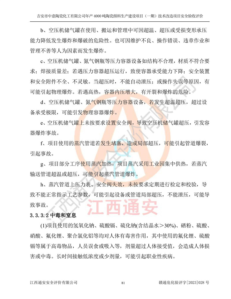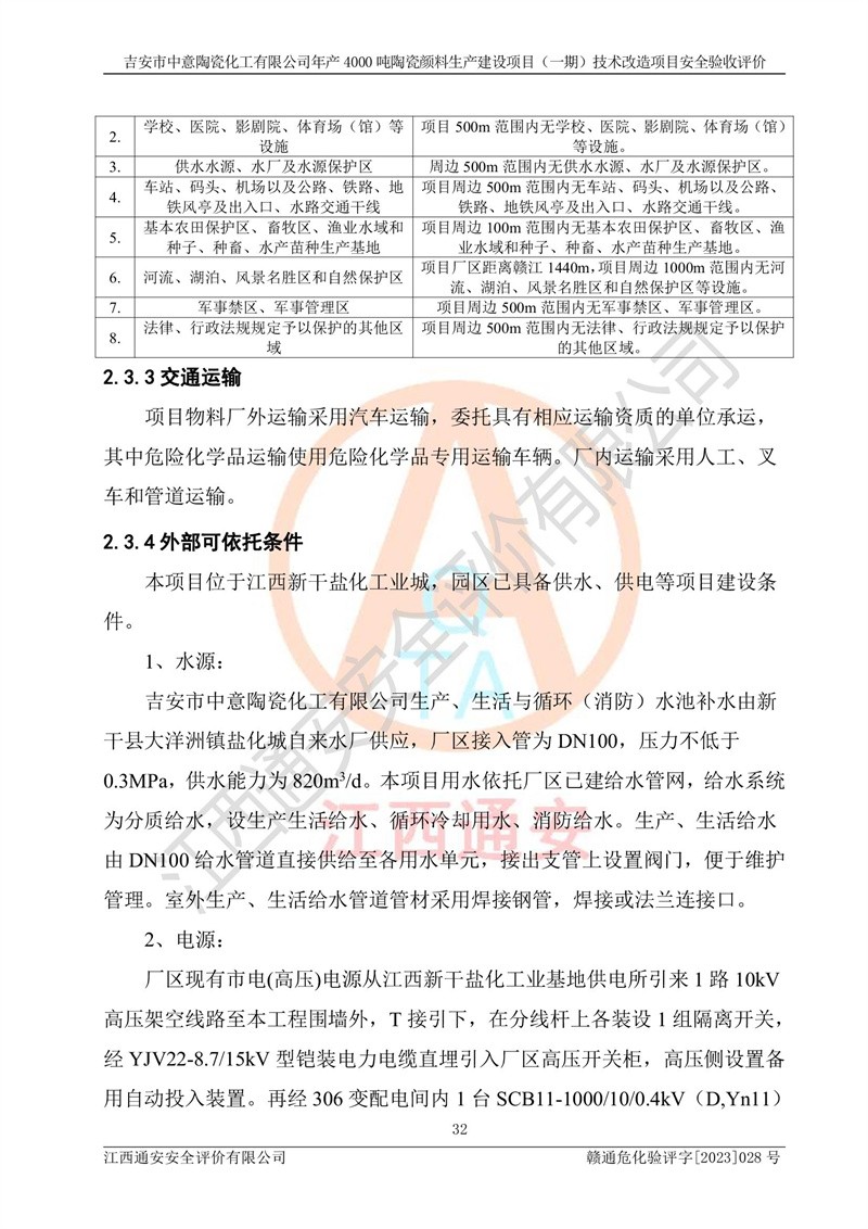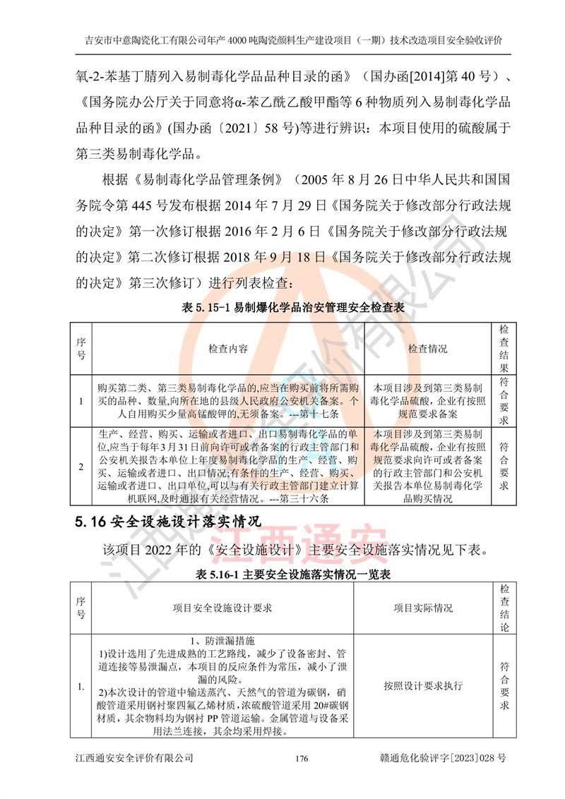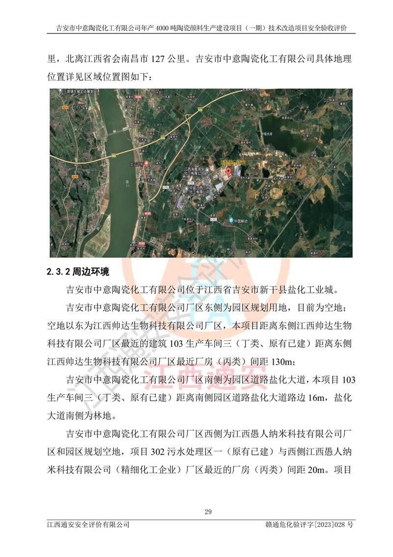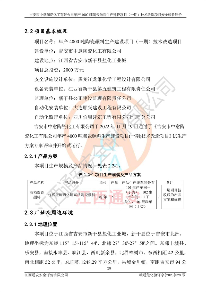 項(xiàng)目簡(jiǎn)介 | 吉安市中意陶瓷化工有限公司(以下簡(jiǎn)稱“公司”)位于江西省吉安市新干縣鹽化工業(yè)城,于2011年08月15日注冊(cè)成立,注冊(cè)資金2666萬(wàn)元,統(tǒng)一社會(huì)信用代碼:91360800578791603W,法人**李愛(ài)飛,屬有限責(zé)任公司(自然人投資或控股),經(jīng)營(yíng)范圍:陶瓷化工產(chǎn)品生產(chǎn)銷售。(涉及許可的憑許可證生產(chǎn)經(jīng)營(yíng);**法律、法規(guī)另有規(guī)定的除外;涉及《外商投資產(chǎn)業(yè)指導(dǎo)目錄》限制類、禁止類項(xiàng)目除外)。 公司于2022年03月17日取得新干縣工業(yè)和信息化局印發(fā)的《江西省工業(yè)企業(yè)技術(shù)改造項(xiàng)目備案通知書》(統(tǒng)一項(xiàng)目代碼:2203-360824-07-02-853961),項(xiàng)目名稱:吉安市中意陶瓷化工有限公司年產(chǎn)4000噸陶瓷顏料生產(chǎn)建設(shè)項(xiàng)目(一期)技術(shù)改造項(xiàng)目。 公司于2022年3月編制了《吉安市中意陶瓷化工有限公司年產(chǎn)4000噸陶瓷顏料生產(chǎn)建設(shè)項(xiàng)目(一期)技術(shù)改造項(xiàng)目安全生產(chǎn)條件和設(shè)施綜合分析報(bào)告》。 公司于2022年6月委托黑龍江龍維化學(xué)工程設(shè)計(jì)有限公司編制《吉安市中意陶瓷化工有限公司年產(chǎn)4000噸陶瓷顏料生產(chǎn)建設(shè)項(xiàng)目(一期)技術(shù)改造項(xiàng)目安全設(shè)施設(shè)計(jì)》并于2022年6月22日通過(guò)了安全設(shè)施設(shè)計(jì)專家評(píng)審; | |||