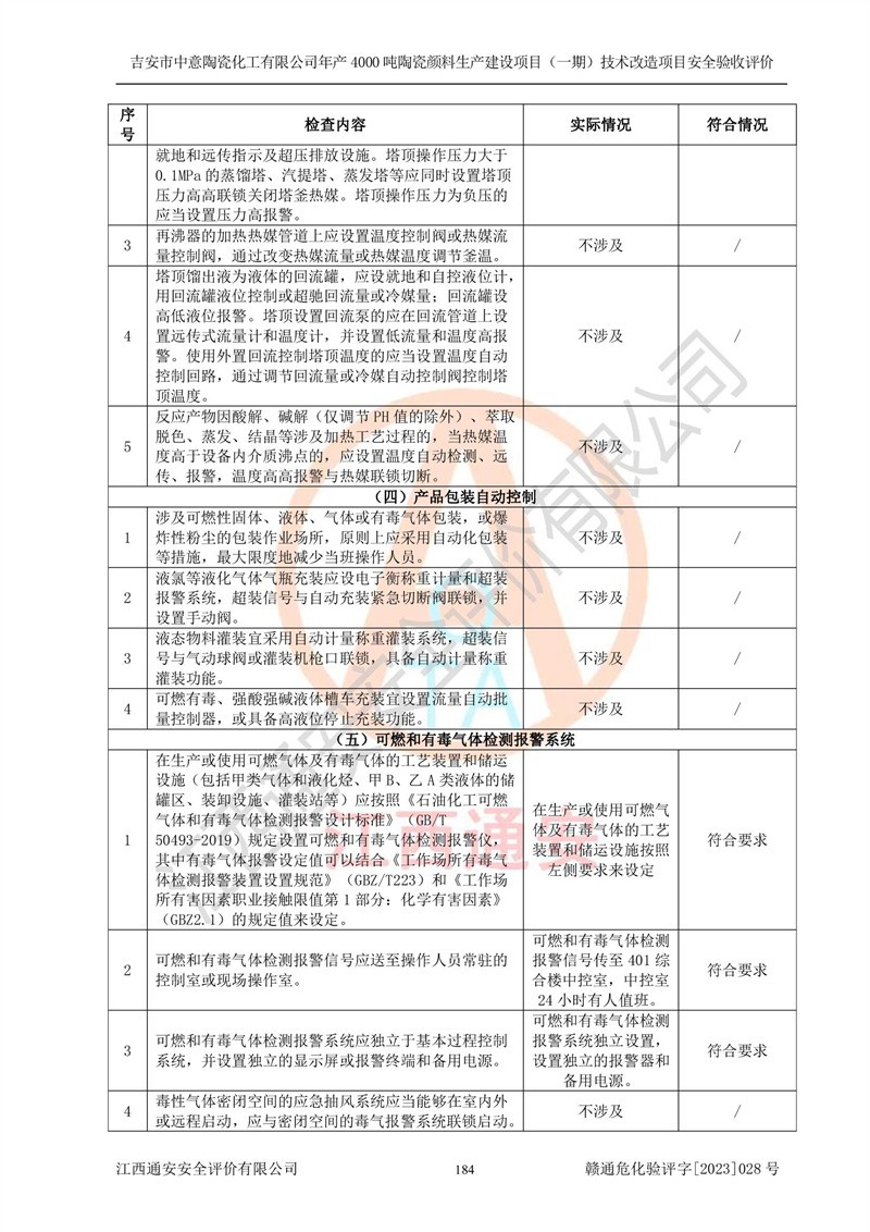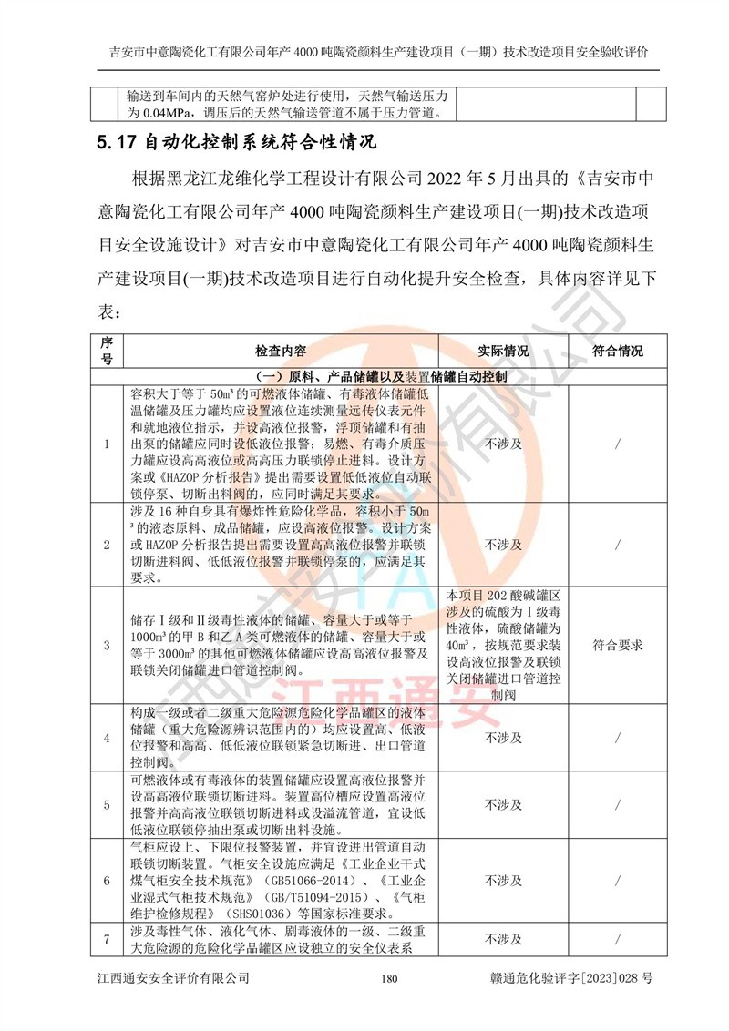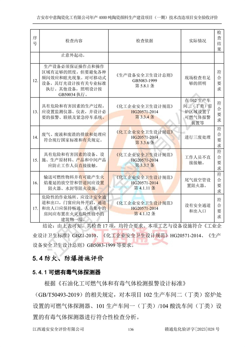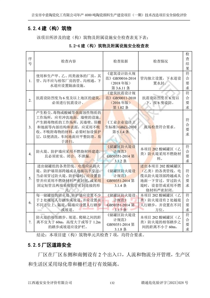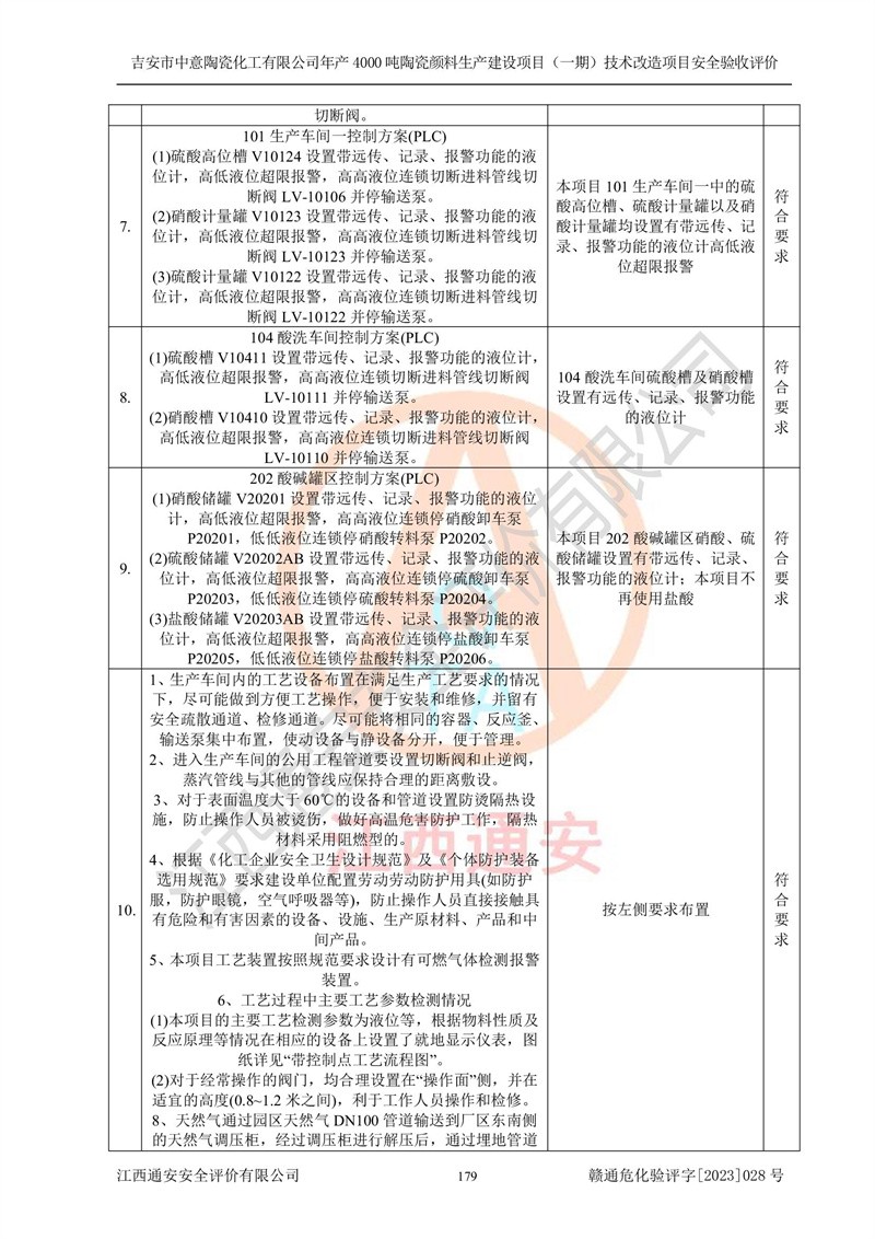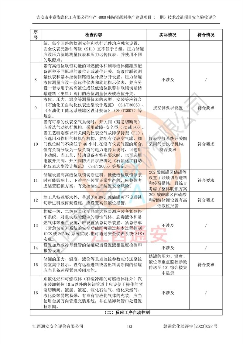 評(píng)價(jià)結(jié)論 | 吉安市中意陶瓷化工有限公司年產(chǎn)4000噸陶瓷顏料生產(chǎn)建設(shè)項(xiàng)目(一期)技術(shù)改造項(xiàng)目符合新干縣鹽化工業(yè)城發(fā)展規(guī)劃的布局;總平面布置符合《建筑設(shè)計(jì)防火規(guī)范》GB50016-2014(2018年版)等標(biāo)準(zhǔn)、規(guī)范的要求;該公司采用成熟的生產(chǎn)工藝和設(shè)備,本質(zhì)安全程度較高;該公司對(duì)生產(chǎn)過(guò)程中存在事故危險(xiǎn)的設(shè)施和場(chǎng)所采取了一系列的合理可行的防護(hù)措施和科學(xué)的管理,近期通過(guò)對(duì)存在的安全問(wèn)題進(jìn)行了整改,主要安全缺陷基本消除,使生產(chǎn)過(guò)程中的危險(xiǎn)有害因素能得到**控制。建設(shè)項(xiàng)目安全設(shè)施符合**現(xiàn)行有關(guān)法律、法規(guī)、標(biāo)準(zhǔn)的要求。 評(píng)價(jià)結(jié)論:本報(bào)告認(rèn)為,吉安市中意陶瓷化工有限公司年產(chǎn)4000噸陶瓷顏料生產(chǎn)建設(shè)項(xiàng)目(一期)技術(shù)改造項(xiàng)目生產(chǎn)裝置現(xiàn)場(chǎng)情況與設(shè)計(jì)圖紙一致,安全設(shè)施正常投用并運(yùn)行正常,自動(dòng)控制設(shè)置滿足《江西省應(yīng)急管理廳關(guān)于印發(fā)《江西省化工企業(yè)自動(dòng)化提升實(shí)施方案》(試行)的通知》贛應(yīng)急字[2021]190號(hào)的要求,安全設(shè)施及安全管理符合**及有關(guān)部門關(guān)于安全生產(chǎn)法律、法規(guī)、標(biāo)準(zhǔn)的要求,安全風(fēng)險(xiǎn)程度是可以接受的,安全風(fēng)險(xiǎn)可控,符合安全生產(chǎn)條件,能夠滿足安全生產(chǎn)的要求,具備安全設(shè)施“三同時(shí)”驗(yàn)收條件。 | |||