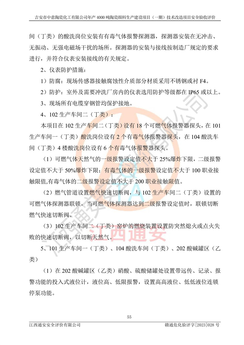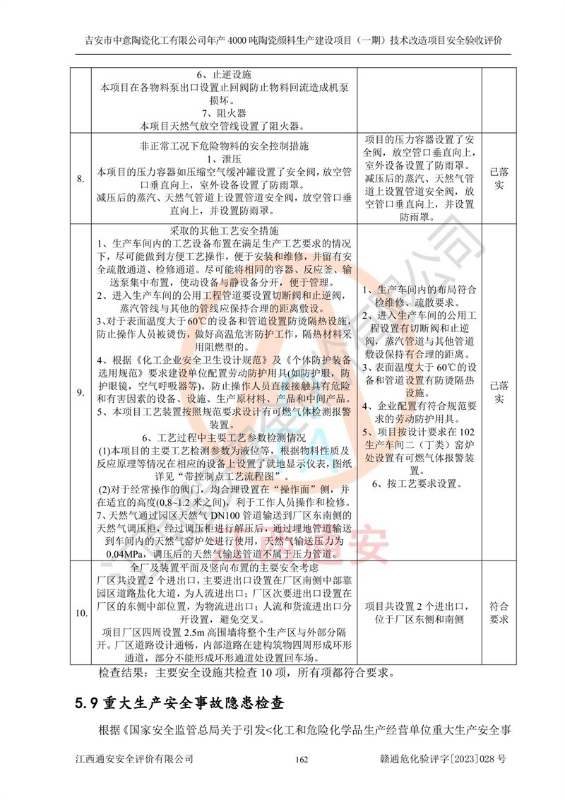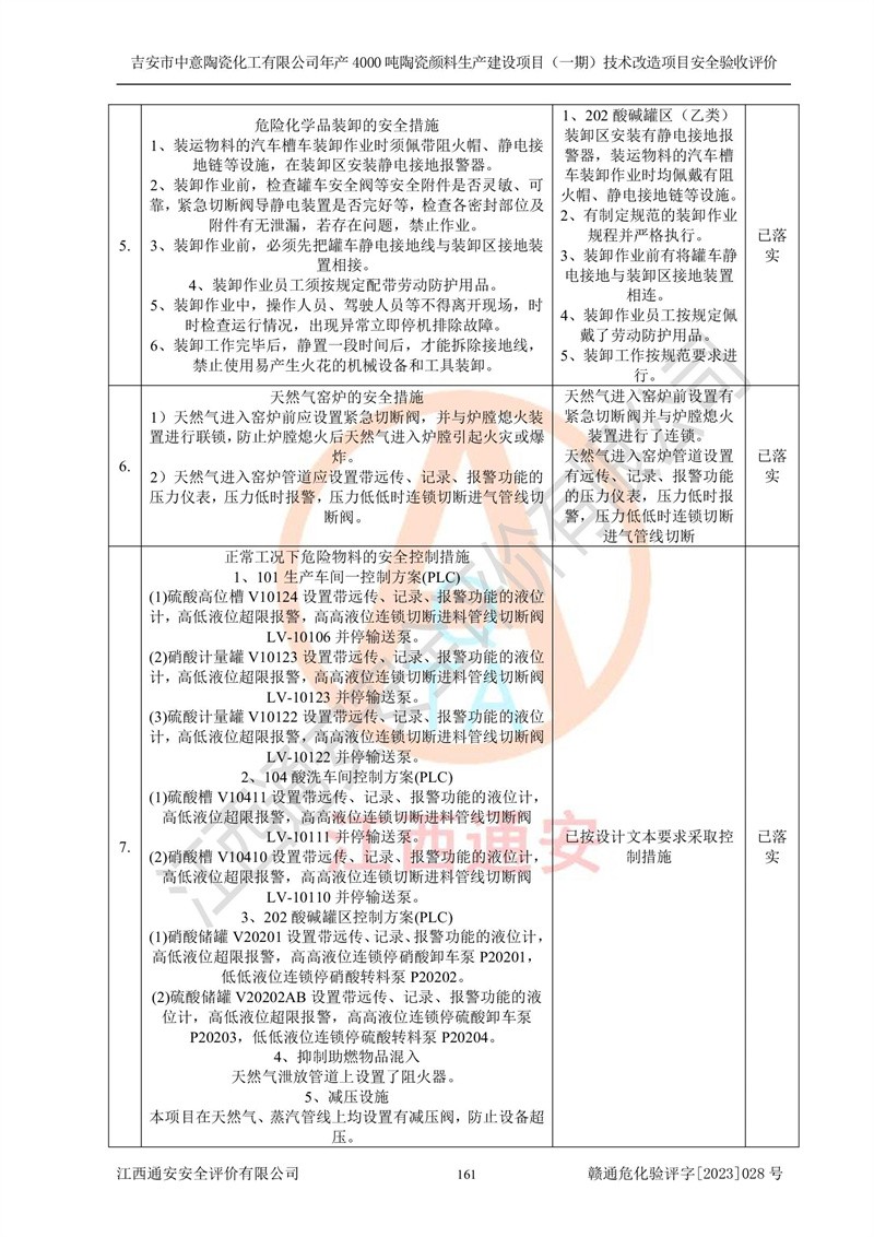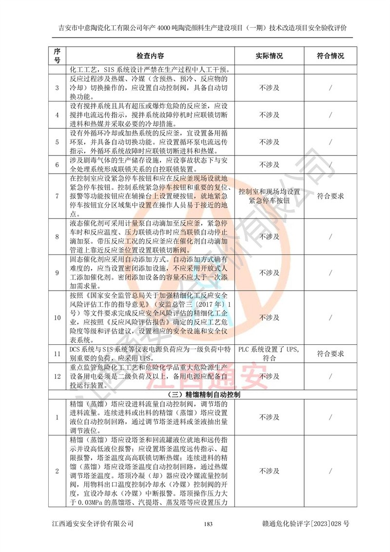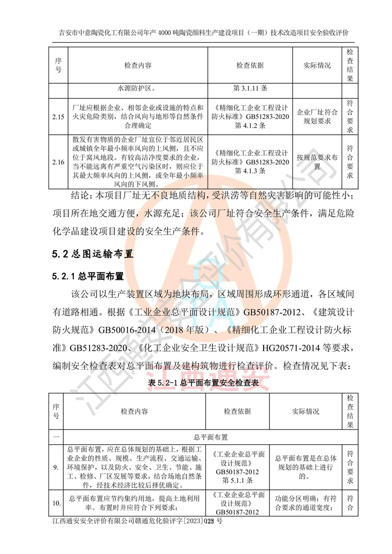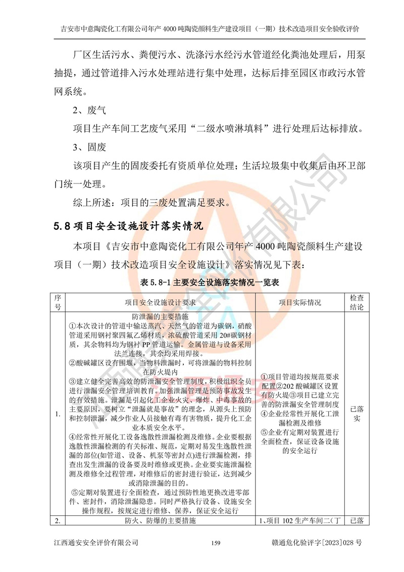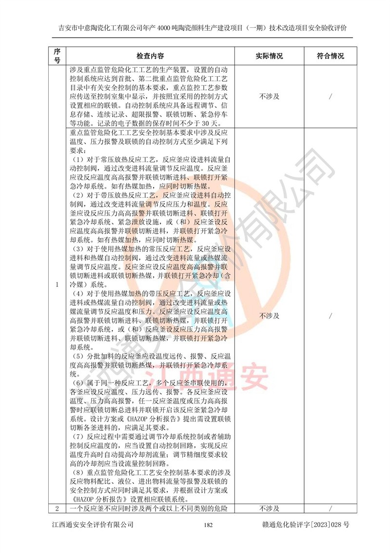 評(píng)價(jià)結(jié)論 | 吉安市中意陶瓷化工有限公司年產(chǎn)4000噸陶瓷顏料生產(chǎn)建設(shè)項(xiàng)目(一期)技術(shù)改造項(xiàng)目符合新干縣鹽化工業(yè)城發(fā)展規(guī)劃的布局;總平面布置符合《建筑設(shè)計(jì)防火規(guī)范》GB50016-2014(2018年版)等標(biāo)準(zhǔn)、規(guī)范的要求;該公司采用成熟的生產(chǎn)工藝和設(shè)備,本質(zhì)安全程度較高;該公司對(duì)生產(chǎn)過(guò)程中存在事故危險(xiǎn)的設(shè)施和場(chǎng)所采取了一系列的合理可行的防護(hù)措施和科學(xué)的管理,近期通過(guò)對(duì)存在的安全問(wèn)題進(jìn)行了整改,主要安全缺陷基本消除,使生產(chǎn)過(guò)程中的危險(xiǎn)有害因素能得到**控制。建設(shè)項(xiàng)目安全設(shè)施符合**現(xiàn)行有關(guān)法律、法規(guī)、標(biāo)準(zhǔn)的要求。 評(píng)價(jià)結(jié)論:本報(bào)告認(rèn)為,吉安市中意陶瓷化工有限公司年產(chǎn)4000噸陶瓷顏料生產(chǎn)建設(shè)項(xiàng)目(一期)技術(shù)改造項(xiàng)目生產(chǎn)裝置現(xiàn)場(chǎng)情況與設(shè)計(jì)圖紙一致,安全設(shè)施正常投用并運(yùn)行正常,自動(dòng)控制設(shè)置滿足《江西省應(yīng)急管理廳關(guān)于印發(fā)《江西省化工企業(yè)自動(dòng)化提升實(shí)施方案》(試行)的通知》贛應(yīng)急字[2021]190號(hào)的要求,安全設(shè)施及安全管理符合**及有關(guān)部門關(guān)于安全生產(chǎn)法律、法規(guī)、標(biāo)準(zhǔn)的要求,安全風(fēng)險(xiǎn)程度是可以接受的,安全風(fēng)險(xiǎn)可控,符合安全生產(chǎn)條件,能夠滿足安全生產(chǎn)的要求,具備安全設(shè)施“三同時(shí)”驗(yàn)收條件。 | |||