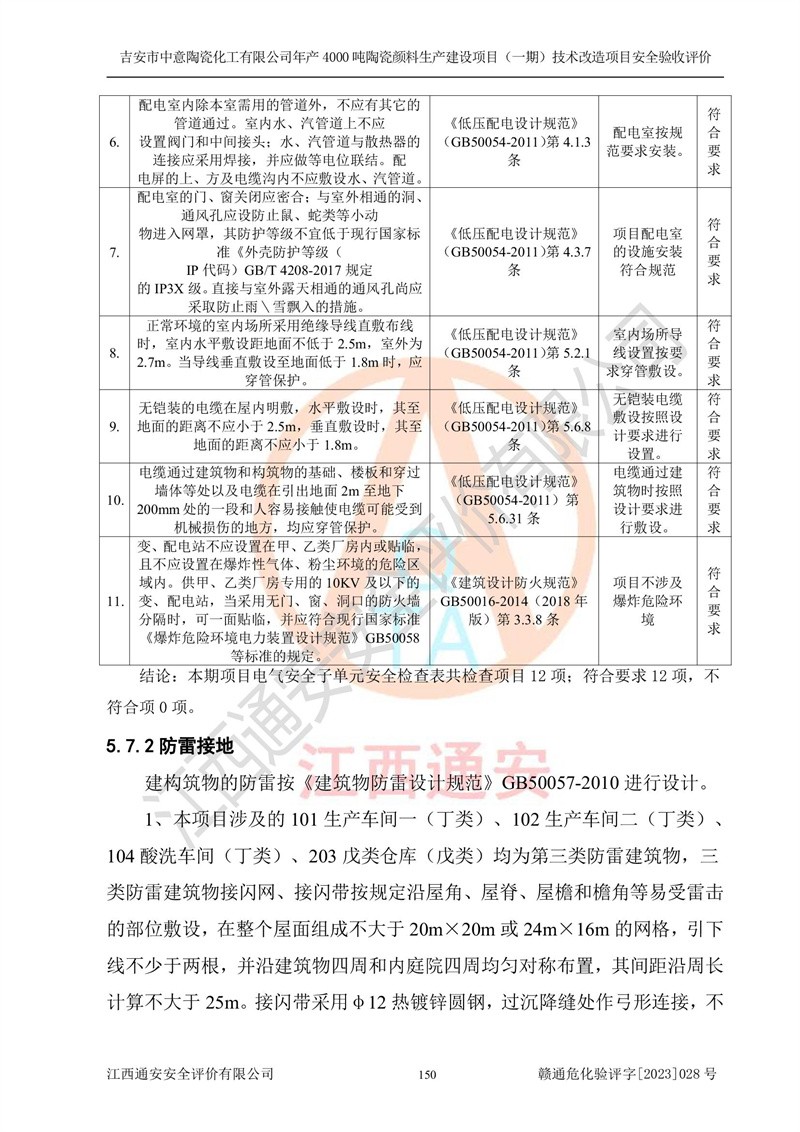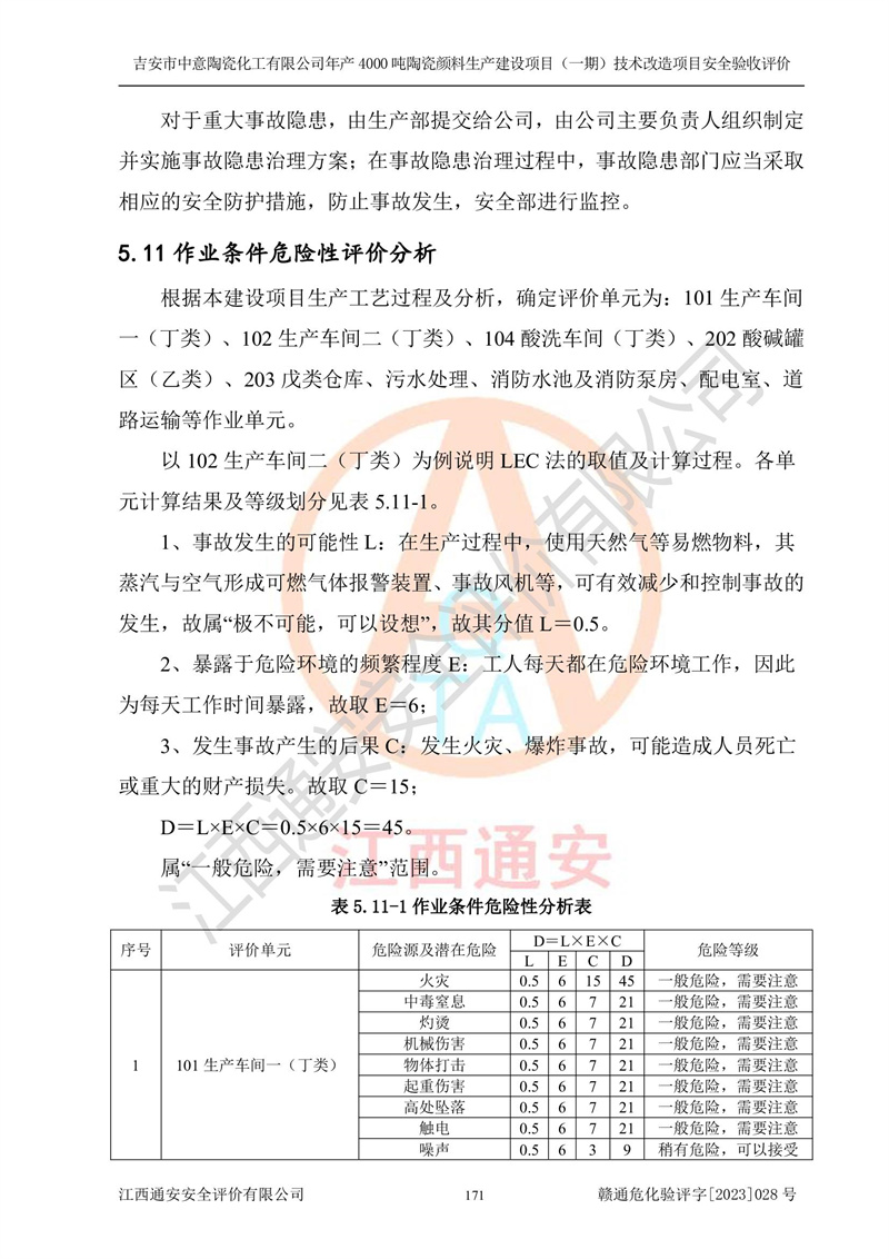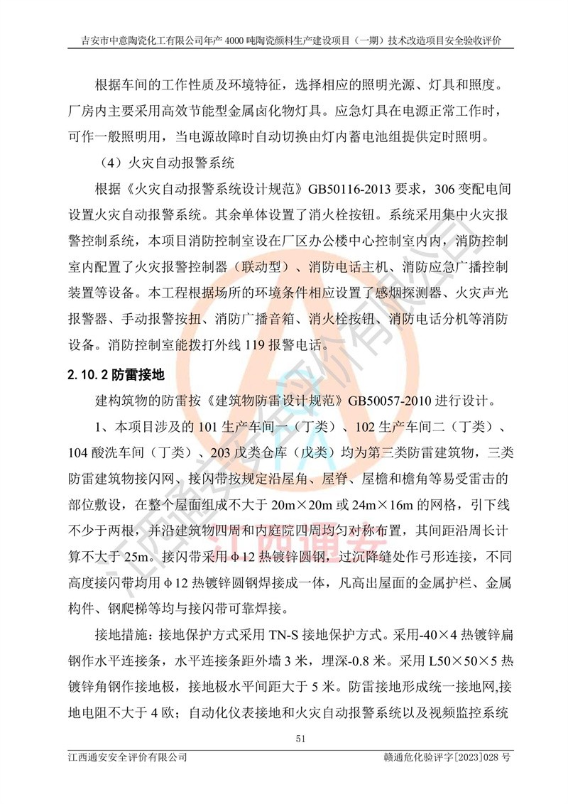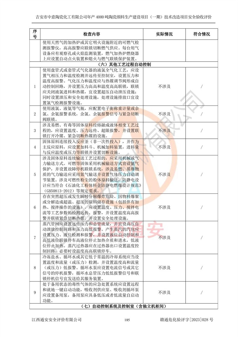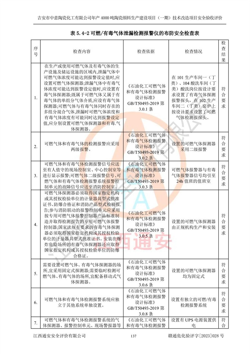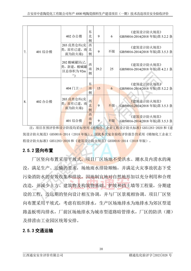 評(píng)價(jià)結(jié)論 | 吉安市中意陶瓷化工有限公司年產(chǎn)4000噸陶瓷顏料生產(chǎn)建設(shè)項(xiàng)目(一期)技術(shù)改造項(xiàng)目符合新干縣鹽化工業(yè)城發(fā)展規(guī)劃的布局;總平面布置符合《建筑設(shè)計(jì)防火規(guī)范》GB50016-2014(2018年版)等標(biāo)準(zhǔn)、規(guī)范的要求;該公司采用成熟的生產(chǎn)工藝和設(shè)備,本質(zhì)安全程度較高;該公司對(duì)生產(chǎn)過(guò)程中存在事故危險(xiǎn)的設(shè)施和場(chǎng)所采取了一系列的合理可行的防護(hù)措施和科學(xué)的管理,近期通過(guò)對(duì)存在的安全問(wèn)題進(jìn)行了整改,主要安全缺陷基本消除,使生產(chǎn)過(guò)程中的危險(xiǎn)有害因素能得到**控制。建設(shè)項(xiàng)目安全設(shè)施符合**現(xiàn)行有關(guān)法律、法規(guī)、標(biāo)準(zhǔn)的要求。 評(píng)價(jià)結(jié)論:本報(bào)告認(rèn)為,吉安市中意陶瓷化工有限公司年產(chǎn)4000噸陶瓷顏料生產(chǎn)建設(shè)項(xiàng)目(一期)技術(shù)改造項(xiàng)目生產(chǎn)裝置現(xiàn)場(chǎng)情況與設(shè)計(jì)圖紙一致,安全設(shè)施正常投用并運(yùn)行正常,自動(dòng)控制設(shè)置滿足《江西省應(yīng)急管理廳關(guān)于印發(fā)《江西省化工企業(yè)自動(dòng)化提升實(shí)施方案》(試行)的通知》贛應(yīng)急字[2021]190號(hào)的要求,安全設(shè)施及安全管理符合**及有關(guān)部門關(guān)于安全生產(chǎn)法律、法規(guī)、標(biāo)準(zhǔn)的要求,安全風(fēng)險(xiǎn)程度是可以接受的,安全風(fēng)險(xiǎn)可控,符合安全生產(chǎn)條件,能夠滿足安全生產(chǎn)的要求,具備安全設(shè)施“三同時(shí)”驗(yàn)收條件。 | |||