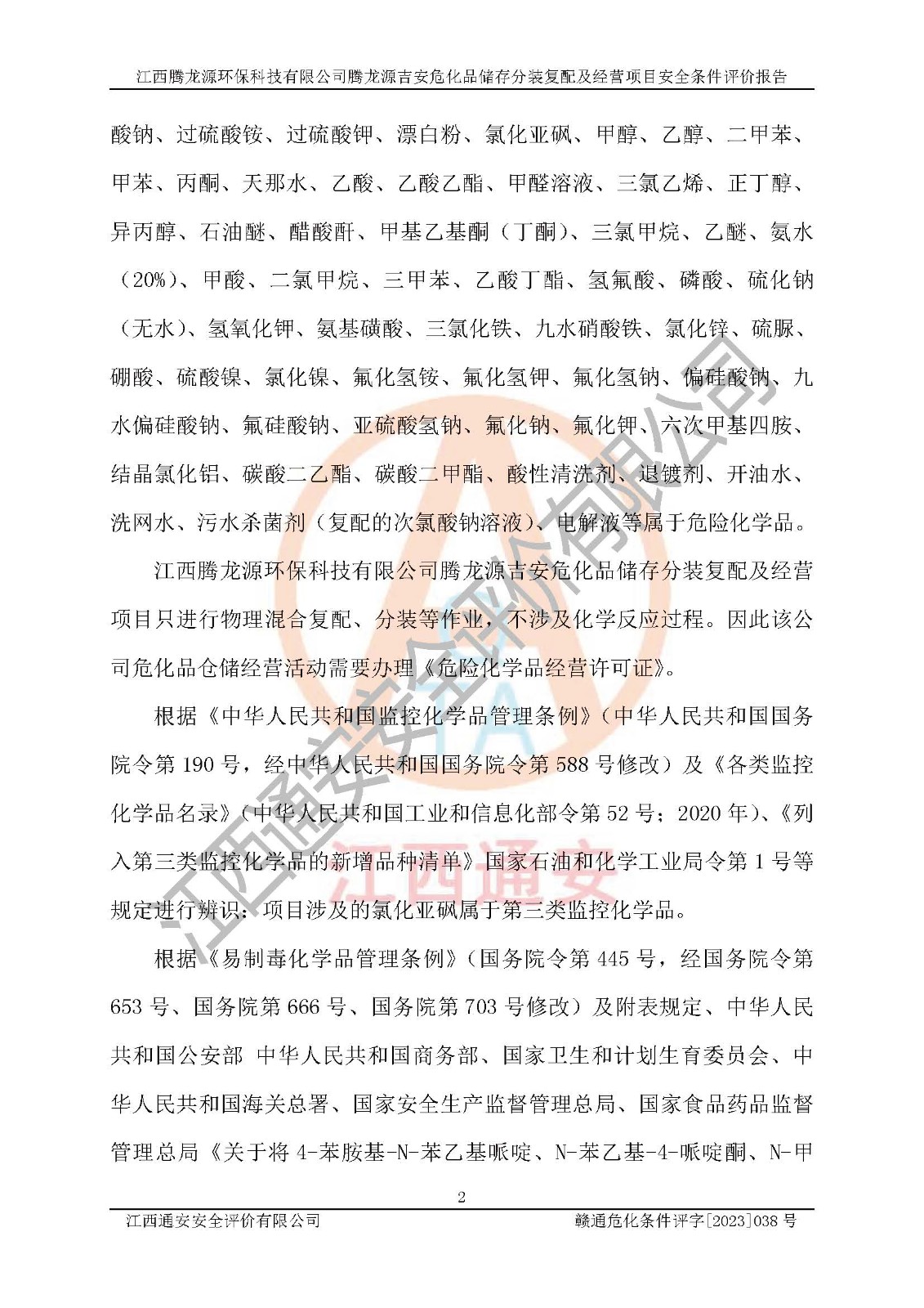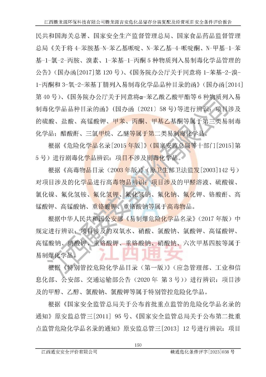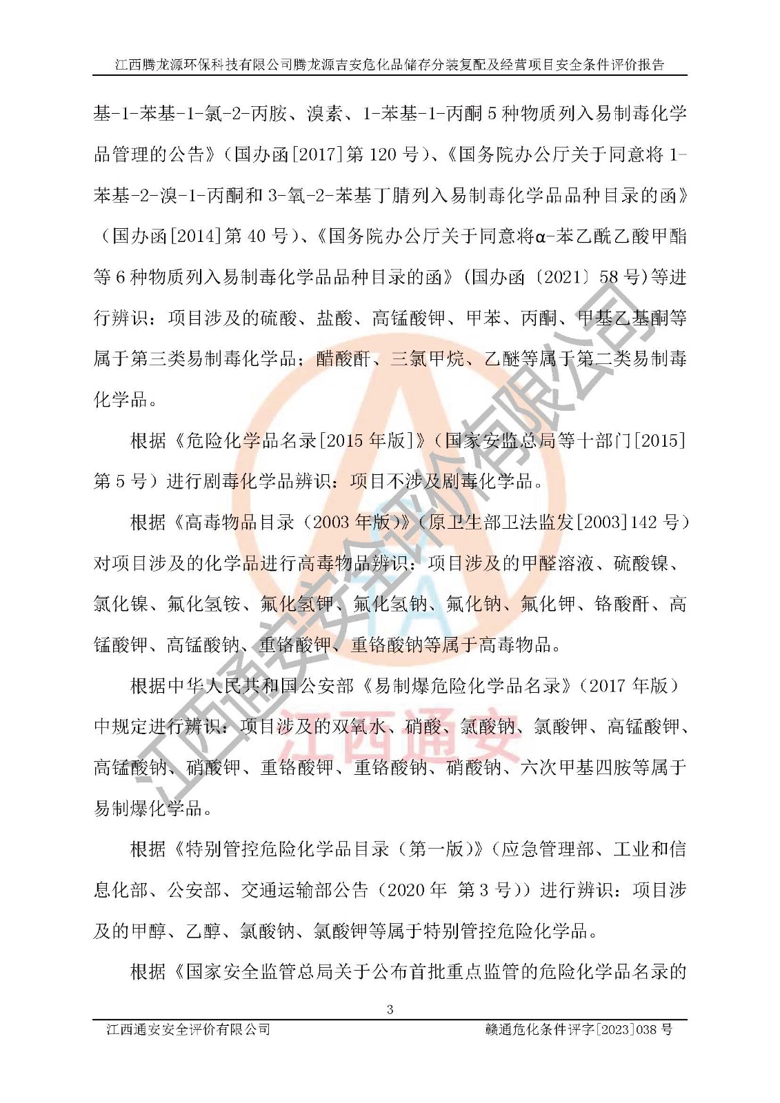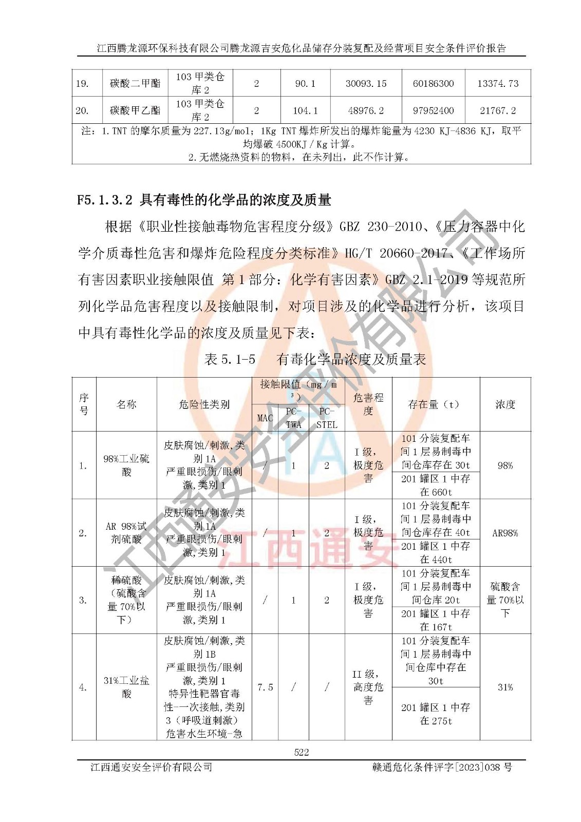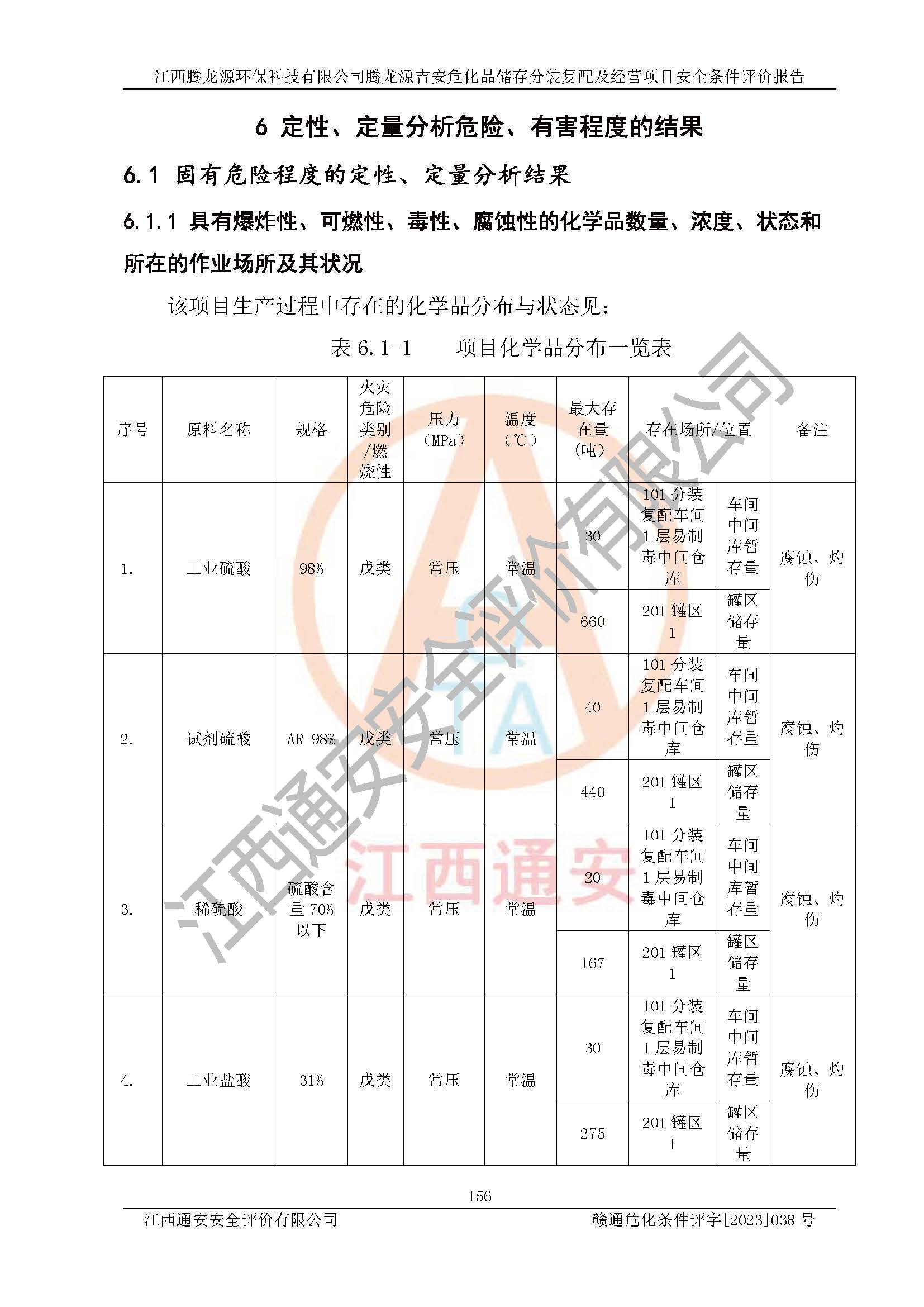 項(xiàng)目簡介 | 江西騰龍?jiān)?*科技有限公司成立于2022年6月20日,并取得吉水縣市場監(jiān)督管理局頒發(fā)的《營業(yè)執(zhí)照》,營業(yè)執(zhí)照統(tǒng)一社會信用代碼:91360822MABQK5GB5P。公司注冊住所:江西省吉安市吉水縣城西工業(yè)園區(qū)二期金龍路。法定**人:吳詩明。注冊資本壹仟萬元整。企業(yè)性質(zhì)為有限責(zé)任公司(自然人投資或控股)。營業(yè)執(zhí)照許可經(jīng)營范圍:一般項(xiàng)目:化工產(chǎn)品銷售(不含許可類化工產(chǎn)品)(除許可業(yè)務(wù)外,可自主依法經(jīng)營法律法規(guī)非禁止或限制的項(xiàng)目)。 江西騰龍?jiān)?*科技有限公司2023年2月24日取得吉水縣發(fā)展和改革委員會頒發(fā)的《江西省企業(yè)投資項(xiàng)目備案通知書》,備案項(xiàng)目名稱為:騰龍?jiān)醇参;穬Υ娣盅b復(fù)配及經(jīng)營項(xiàng)目。項(xiàng)目統(tǒng)一代碼為:2302-360822-04-01-318980。項(xiàng)目總投資20000萬元,項(xiàng)目總占地面積31.34畝。 根據(jù)《危險(xiǎn)化學(xué)品目錄(2015版)》(**安監(jiān)總局等十部門公告[2015]第5號)及應(yīng)急管理部、工業(yè)和信息化部、公安部、生態(tài)環(huán)境部、交通運(yùn)輸部、農(nóng)業(yè)農(nóng)村部、衛(wèi)生健康委、市場監(jiān)管總局、鐵路局、民航局決定調(diào)整《危險(xiǎn)化學(xué)品目錄(2015版)》(應(yīng)急管理部、工業(yè)和信息化部、公安部、生態(tài)環(huán)境部、交通運(yùn)輸部、農(nóng)業(yè)農(nóng)村部、衛(wèi)生健康委、市場監(jiān)管總局、鐵路局、民航局公告2022年第8號)等文件對該項(xiàng)目生產(chǎn)過程中所涉及的化學(xué)品進(jìn)行辨識:項(xiàng)目涉及的硫酸、鹽酸、雙氧水、硝酸、氫氧化鈉(固體和溶液)、次氯酸鈉溶液、氯酸鈉、氯酸鉀、鉻酸酐、高錳酸鈉、高錳酸鉀、硝酸鉀、重鉻酸鉀、重鉻酸鈉、硝酸鈉、亞硝酸鈉、過硫酸鈉、過硫酸銨、過硫酸鉀、漂白粉、氯化亞砜、甲醇、乙醇、二甲苯、甲苯、**、天那水、乙酸、乙酸乙酯、甲醛溶液、三氯乙烯、正丁醇、異丙醇、石油醚、醋酸酐、甲基乙基酮(丁酮)、三氯甲烷、乙醚、氨水(20%)、甲酸、二氯甲烷、**苯、乙酸丁酯、氫氟酸、磷酸、硫化鈉(無水)、氫氧化鉀、氨基磺酸、三氯化鐵、九水硝酸鐵、氯化鋅、硫脲、硼酸、硫酸鎳、氯化鎳、氟化氫銨、氟化氫鉀、氟化氫鈉、偏硅酸鈉、九水偏硅酸鈉、氟硅酸鈉、亞硫酸氫鈉、氟化鈉、氟化鉀、六次甲基四胺、結(jié)晶氯化鋁、碳酸二乙酯、碳酸二甲酯、酸性清洗劑、退鍍劑、開油水、洗網(wǎng)水、污水殺菌劑(復(fù)配的次氯酸鈉溶液)、電解液等屬于危險(xiǎn)化學(xué)品。 江西騰龍?jiān)?*科技有限公司騰龍?jiān)醇参;穬Υ娣盅b復(fù)配及經(jīng)營項(xiàng)目只進(jìn)行物理混合復(fù)配、分裝等作業(yè),不涉及化學(xué)反應(yīng)過程。因此該公司?;穫}儲經(jīng)營活動需要辦理《危險(xiǎn)化學(xué)品經(jīng)營許可證》。 根據(jù)《中華人民共和國監(jiān)控化學(xué)品管理?xiàng)l例》(中華人民共和國***令**90號,經(jīng)中華人民共和國***令第588號修改)及《各類監(jiān)控化學(xué)品名錄》(中華人民共和國工業(yè)和信息化部令第52號;2020年)、《列入第三類監(jiān)控化學(xué)品的新增品種清單》**石油和化學(xué)工業(yè)局令**號等規(guī)定進(jìn)行辨識:項(xiàng)目涉及的氯化亞砜屬于第三類監(jiān)控化學(xué)品。 根據(jù)《易制毒化學(xué)品管理?xiàng)l例》(***令第445號,經(jīng)***令第653號、***第666號、***第703號修改)及附表規(guī)定、中華人民共和國公安部 中華人民共和國商務(wù)部、**衛(wèi)生和計(jì)劃生育委員會、中華人民共和國海關(guān)總署、**安全生產(chǎn)監(jiān)督管理總局、**食品藥品監(jiān)督管理總局《關(guān)于將4-苯胺基-N-苯乙基哌啶、N-苯乙基-4-哌啶酮、N-甲基-1-苯基-1-氯-2-丙胺、溴素、1-苯基-1-**5種物質(zhì)列入易制毒化學(xué)品管理的公告》(國辦函[2017]**20號)、《***辦公廳關(guān)于同意將1-苯基-2-溴-1-**和3-氧-2-苯基丁腈列入易制毒化學(xué)品品種目錄的函》(國辦函[2014]第40號)、《***辦公廳關(guān)于同意將α-苯乙酰乙酸甲酯等6種物質(zhì)列入易制毒化學(xué)品品種目錄的函》(國辦函〔2021〕58號)等進(jìn)行辨識:項(xiàng)目涉及的硫酸、鹽酸、高錳酸鉀、甲苯、**、甲基乙基酮等屬于第三類易制毒化學(xué)品;醋酸酐、三氯甲烷、乙醚等屬于第二類易制毒化學(xué)品。 根據(jù)《危險(xiǎn)化學(xué)品名錄[2015年版]》(**安監(jiān)總局等十部門[2015]第5號)進(jìn)行劇毒化學(xué)品辨識:項(xiàng)目不涉及劇毒化學(xué)品。 根據(jù)《高毒物品目錄(2003年版)》(原衛(wèi)生部衛(wèi)法監(jiān)發(fā)[2003]142號)對項(xiàng)目涉及的化學(xué)品進(jìn)行高毒物品辨識:項(xiàng)目涉及的甲醛溶液、硫酸鎳、氯化鎳、氟化氫銨、氟化氫鉀、氟化氫鈉、氟化鈉、氟化鉀、鉻酸酐、高錳酸鉀、高錳酸鈉、重鉻酸鉀、重鉻酸鈉等屬于高毒物品。 根據(jù)中華人民共和國公安部《易制爆危險(xiǎn)化學(xué)品名錄》(2017年版)中規(guī)定進(jìn)行辨識:項(xiàng)目涉及的雙氧水、硝酸、氯酸鈉、氯酸鉀、高錳酸鉀、高錳酸鈉、硝酸鉀、重鉻酸鉀、重鉻酸鈉、硝酸鈉、六次甲基四胺等屬于易