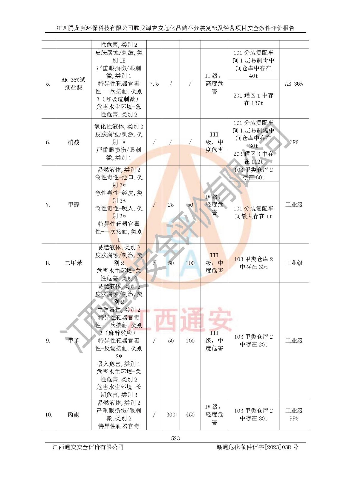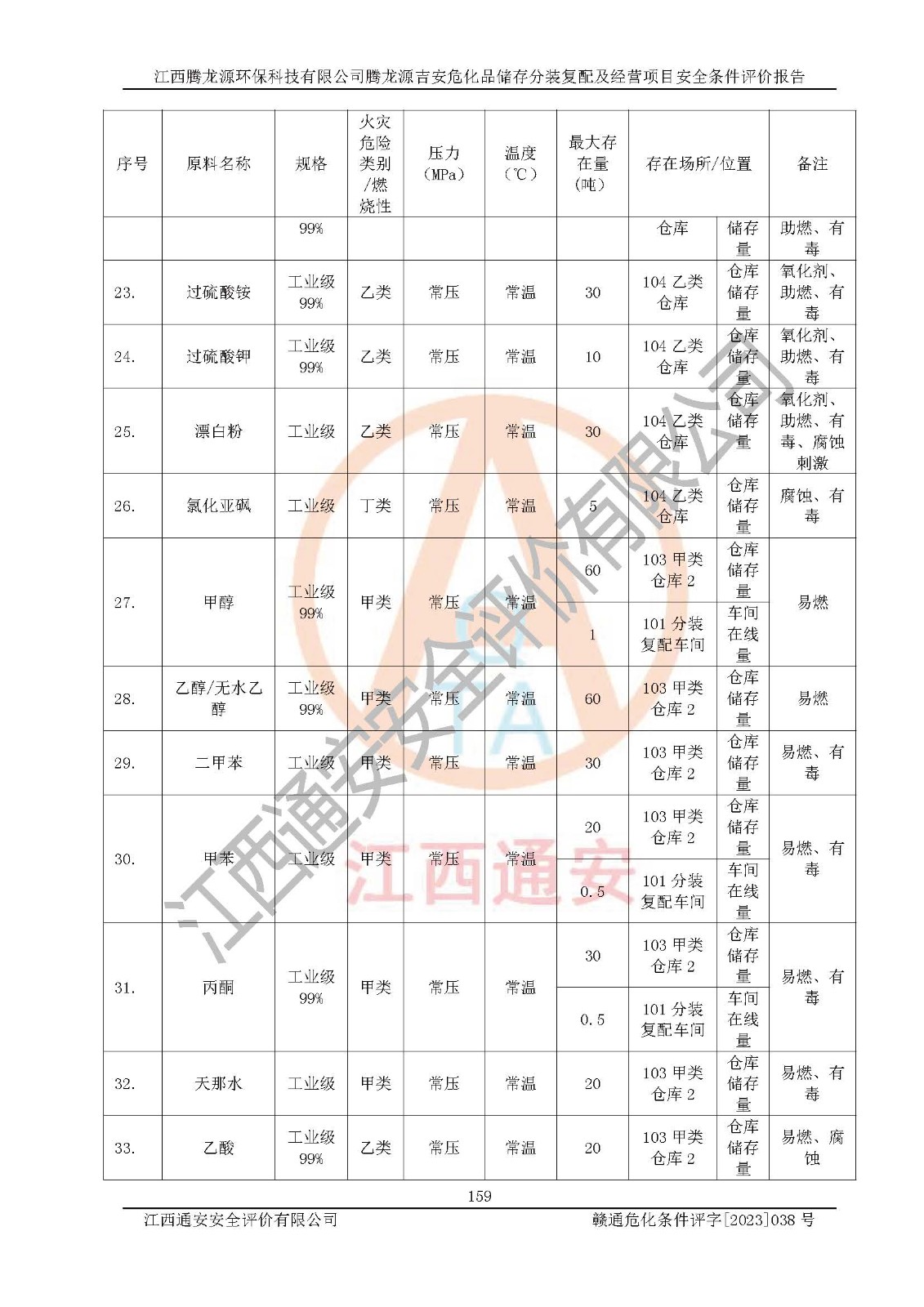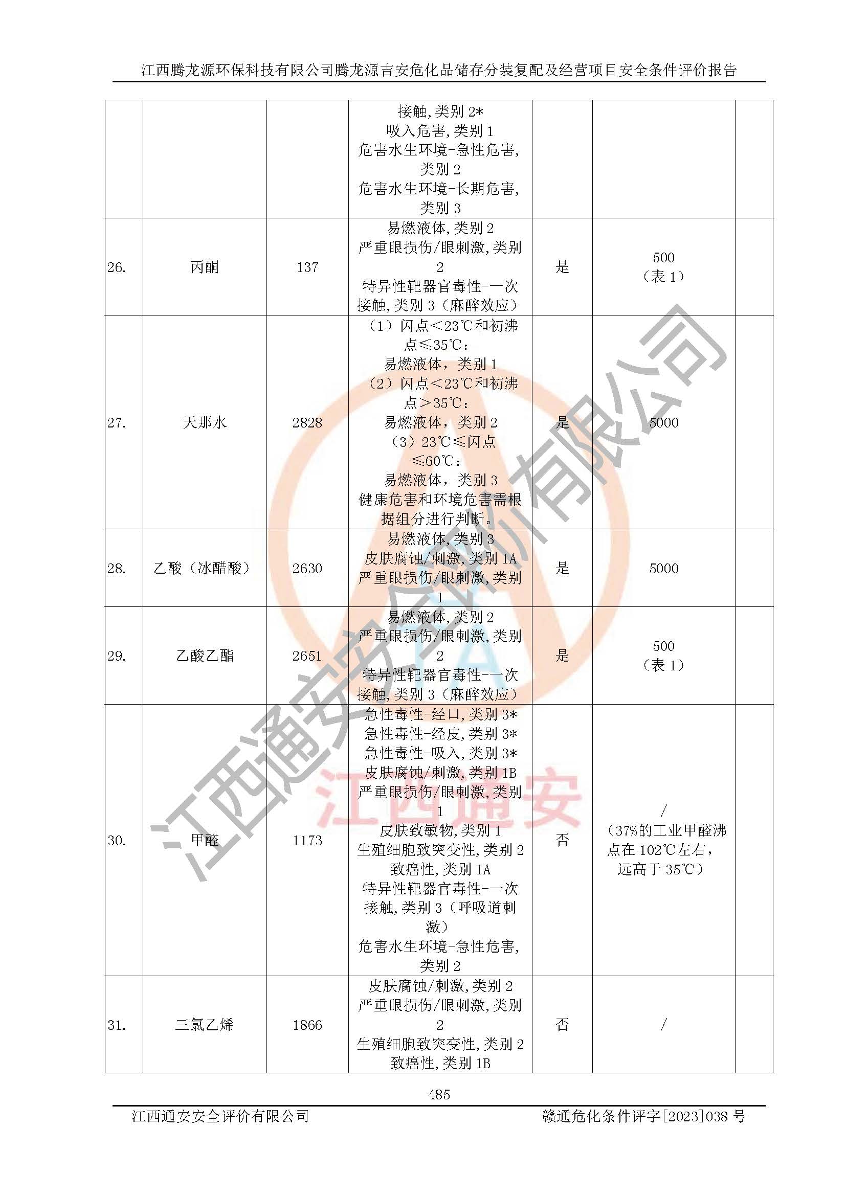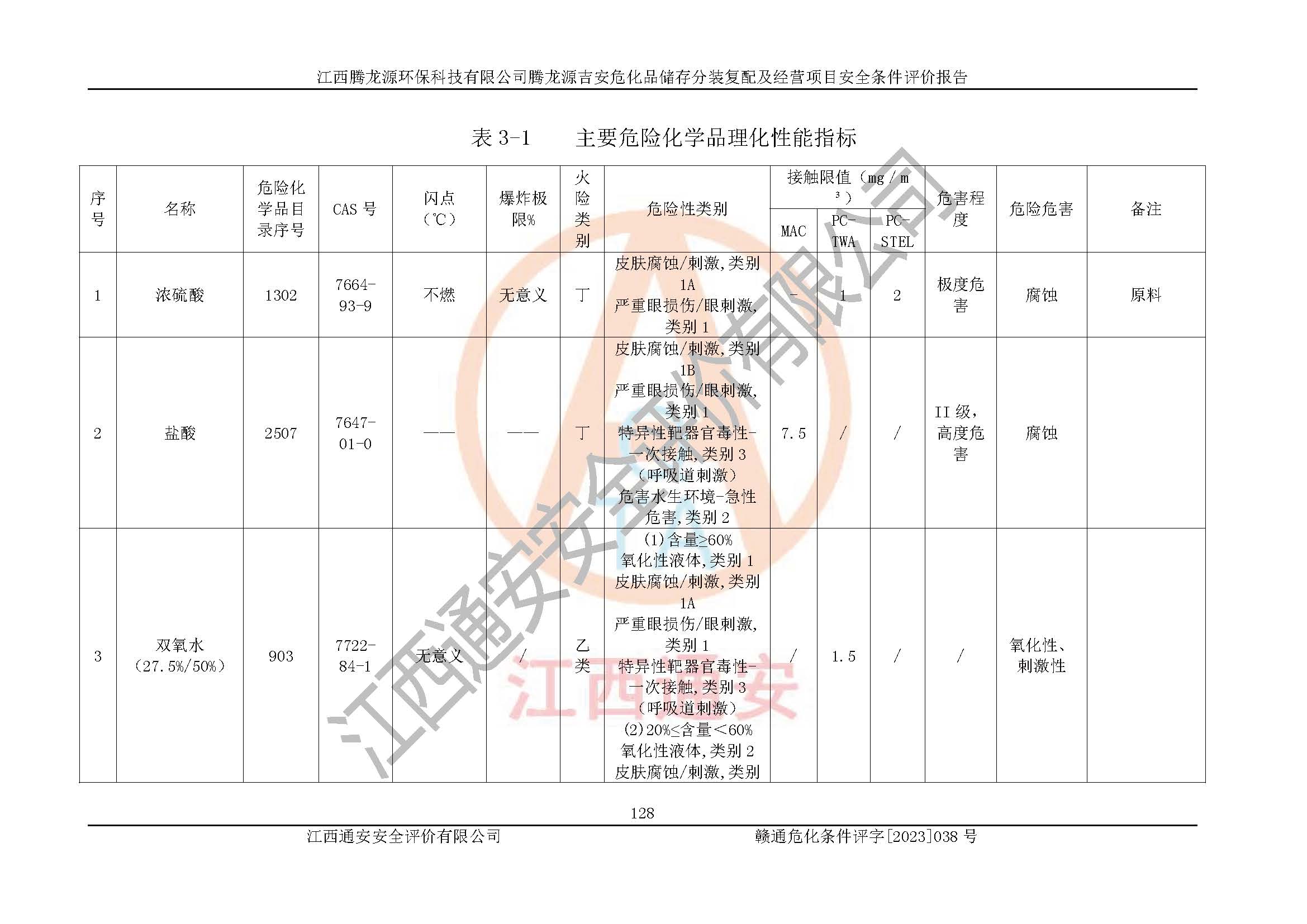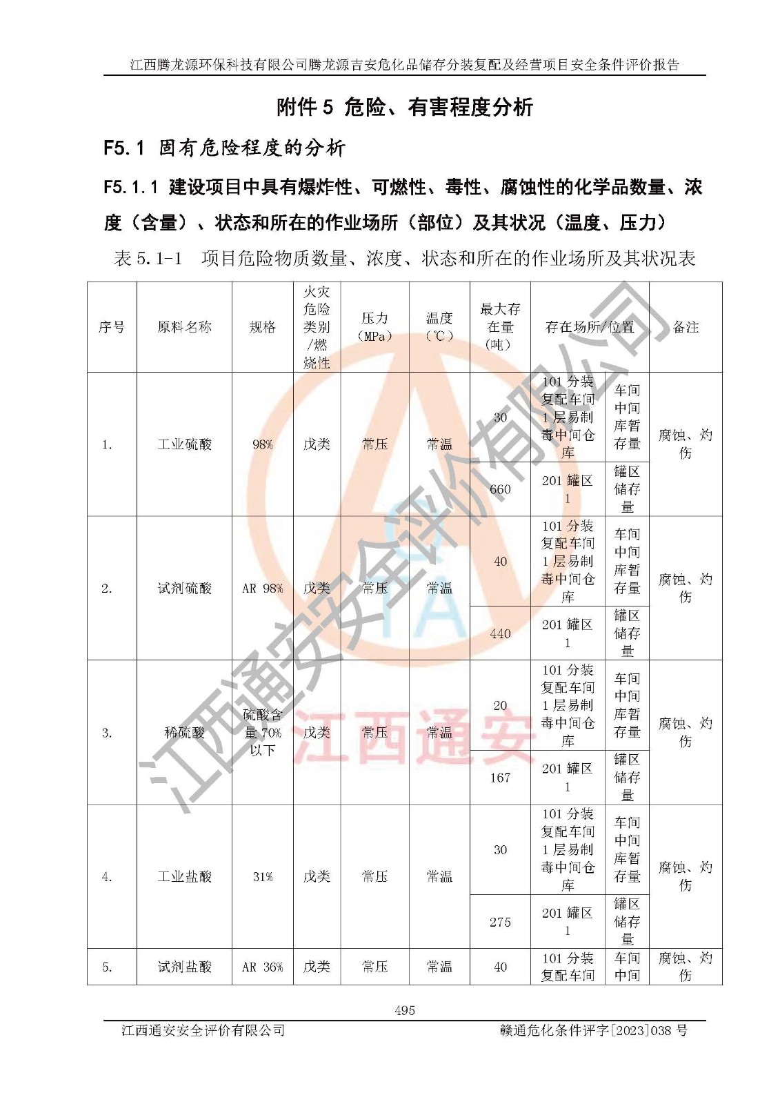 項(xiàng)目簡介 | 江西騰龍?jiān)?*科技有限公司成立于2022年6月20日,并取得吉水縣市場監(jiān)督管理局頒發(fā)的《營業(yè)執(zhí)照》,營業(yè)執(zhí)照統(tǒng)一社會信用代碼:91360822MABQK5GB5P。公司注冊住所:江西省吉安市吉水縣城西工業(yè)園區(qū)二期金龍路。法定**人:吳詩明。注冊資本壹仟萬元整。企業(yè)性質(zhì)為有限責(zé)任公司(自然人投資或控股)。營業(yè)執(zhí)照許可經(jīng)營范圍:一般項(xiàng)目:化工產(chǎn)品銷售(不含許可類化工產(chǎn)品)(除許可業(yè)務(wù)外,可自主依法經(jīng)營法律法規(guī)非禁止或限制的項(xiàng)目)。 江西騰龍?jiān)?*科技有限公司2023年2月24日取得吉水縣發(fā)展和改革委員會頒發(fā)的《江西省企業(yè)投資項(xiàng)目備案通知書》,備案項(xiàng)目名稱為:騰龍?jiān)醇参;穬Υ娣盅b復(fù)配及經(jīng)營項(xiàng)目。項(xiàng)目統(tǒng)一代碼為:2302-360822-04-01-318980。項(xiàng)目總投資20000萬元,項(xiàng)目總占地面積31.34畝。 根據(jù)《危險(xiǎn)化學(xué)品目錄(2015版)》(**安監(jiān)總局等十部門公告[2015]第5號)及應(yīng)急管理部、工業(yè)和信息化部、公安部、生態(tài)環(huán)境部、交通運(yùn)輸部、農(nóng)業(yè)農(nóng)村部、衛(wèi)生健康委、市場監(jiān)管總局、鐵路局、民航局決定調(diào)整《危險(xiǎn)化學(xué)品目錄(2015版)》(應(yīng)急管理部、工業(yè)和信息化部、公安部、生態(tài)環(huán)境部、交通運(yùn)輸部、農(nóng)業(yè)農(nóng)村部、衛(wèi)生健康委、市場監(jiān)管總局、鐵路局、民航局公告2022年第8號)等文件對該項(xiàng)目生產(chǎn)過程中所涉及的化學(xué)品進(jìn)行辨識:項(xiàng)目涉及的硫酸、鹽酸、雙氧水、硝酸、氫氧化鈉(固體和溶液)、次氯酸鈉溶液、氯酸鈉、氯酸鉀、鉻酸酐、高錳酸鈉、高錳酸鉀、硝酸鉀、重鉻酸鉀、重鉻酸鈉、硝酸鈉、亞硝酸鈉、過硫酸鈉、過硫酸銨、過硫酸鉀、漂白粉、氯化亞砜、甲醇、乙醇、二甲苯、甲苯、**、天那水、乙酸、乙酸乙酯、甲醛溶液、三氯乙烯、正丁醇、異丙醇、石油醚、醋酸酐、甲基乙基酮(丁酮)、三氯甲烷、乙醚、氨水(20%)、甲酸、二氯甲烷、**苯、乙酸丁酯、氫氟酸、磷酸、硫化鈉(無水)、氫氧化鉀、氨基磺酸、三氯化鐵、九水硝酸鐵、氯化鋅、硫脲、硼酸、硫酸鎳、氯化鎳、氟化氫銨、氟化氫鉀、氟化氫鈉、偏硅酸鈉、九水偏硅酸鈉、氟硅酸鈉、亞硫酸氫鈉、氟化鈉、氟化鉀、六次甲基四胺、結(jié)晶氯化鋁、碳酸二乙酯、碳酸二甲酯、酸性清洗劑、退鍍劑、開油水、洗網(wǎng)水、污水殺菌劑(復(fù)配的次氯酸鈉溶液)、電解液等屬于危險(xiǎn)化學(xué)品。 江西騰龍?jiān)?*科技有限公司騰龍?jiān)醇参;穬Υ娣盅b復(fù)配及經(jīng)營項(xiàng)目只進(jìn)行物理混合復(fù)配、分裝等作業(yè),不涉及化學(xué)反應(yīng)過程。因此該公司?;穫}儲經(jīng)營活動需要辦理《危險(xiǎn)化學(xué)品經(jīng)營許可證》。 根據(jù)《中華人民共和國監(jiān)控化學(xué)品管理?xiàng)l例》(中華人民共和國***令**90號,經(jīng)中華人民共和國***令第588號修改)及《各類監(jiān)控化學(xué)品名錄》(中華人民共和國工業(yè)和信息化部令第52號;2020年)、《列入第三類監(jiān)控化學(xué)品的新增品種清單》**石油和化學(xué)工業(yè)局令**號等規(guī)定進(jìn)行辨識:項(xiàng)目涉及的氯化亞砜屬于第三類監(jiān)控化學(xué)品。 根據(jù)《易制毒化學(xué)品管理?xiàng)l例》(***令第445號,經(jīng)***令第653號、***第666號、***第703號修改)及附表規(guī)定、中華人民共和國公安部 中華人民共和國商務(wù)部、**衛(wèi)生和計(jì)劃生育委員會、中華人民共和國海關(guān)總署、**安全生產(chǎn)監(jiān)督管理總局、**食品藥品監(jiān)督管理總局《關(guān)于將4-苯胺基-N-苯乙基哌啶、N-苯乙基-4-哌啶酮、N-甲基-1-苯基-1-氯-2-丙胺、溴素、1-苯基-1-**5種物質(zhì)列入易制毒化學(xué)品管理的公告》(國辦函[2017]**20號)、《***辦公廳關(guān)于同意將1-苯基-2-溴-1-**和3-氧-2-苯基丁腈列入易制毒化學(xué)品品種目錄的函》(國辦函[2014]第40號)、《***辦公廳關(guān)于同意將α-苯乙酰乙酸甲酯等6種物質(zhì)列入易制毒化學(xué)品品種目錄的函》(國辦函〔2021〕58號)等進(jìn)行辨識:項(xiàng)目涉及的硫酸、鹽酸、高錳酸鉀、甲苯、**、甲基乙基酮等屬于第三類易制毒化學(xué)品;醋酸酐、三氯甲烷、乙醚等屬于第二類易制毒化學(xué)品。 根據(jù)《危險(xiǎn)化學(xué)品名錄[2015年版]》(**安監(jiān)總局等十部門[2015]第5號)進(jìn)行劇毒化學(xué)品辨識:項(xiàng)目不涉及劇毒化學(xué)品。 根據(jù)《高毒物品目錄(2003年版)》(原衛(wèi)生部衛(wèi)法監(jiān)發(fā)[2003]142號)對項(xiàng)目涉及的化學(xué)品進(jìn)行高毒物品辨識:項(xiàng)目涉及的甲醛溶液、硫酸鎳、氯化鎳、氟化氫銨、氟化氫鉀、氟化氫鈉、氟化鈉、氟化鉀、鉻酸酐、高錳酸鉀、高錳酸鈉、重鉻酸鉀、重鉻酸鈉等屬于高毒物品。 根據(jù)中華人民共和國公安部《易制爆危險(xiǎn)化學(xué)品名錄》(2017年版)中規(guī)定進(jìn)行辨識:項(xiàng)目涉及的雙氧水、硝酸、氯酸鈉、氯酸鉀、高錳酸鉀、高錳酸鈉、硝酸鉀、重鉻酸鉀、重鉻酸鈉、硝酸鈉、六次甲基四胺等屬于易
