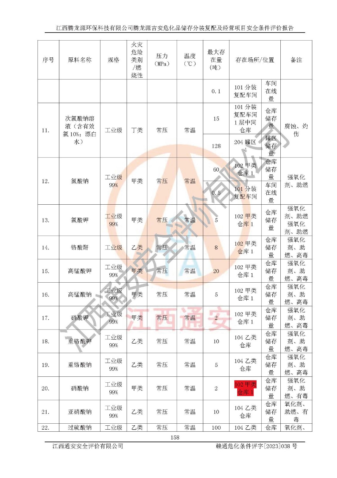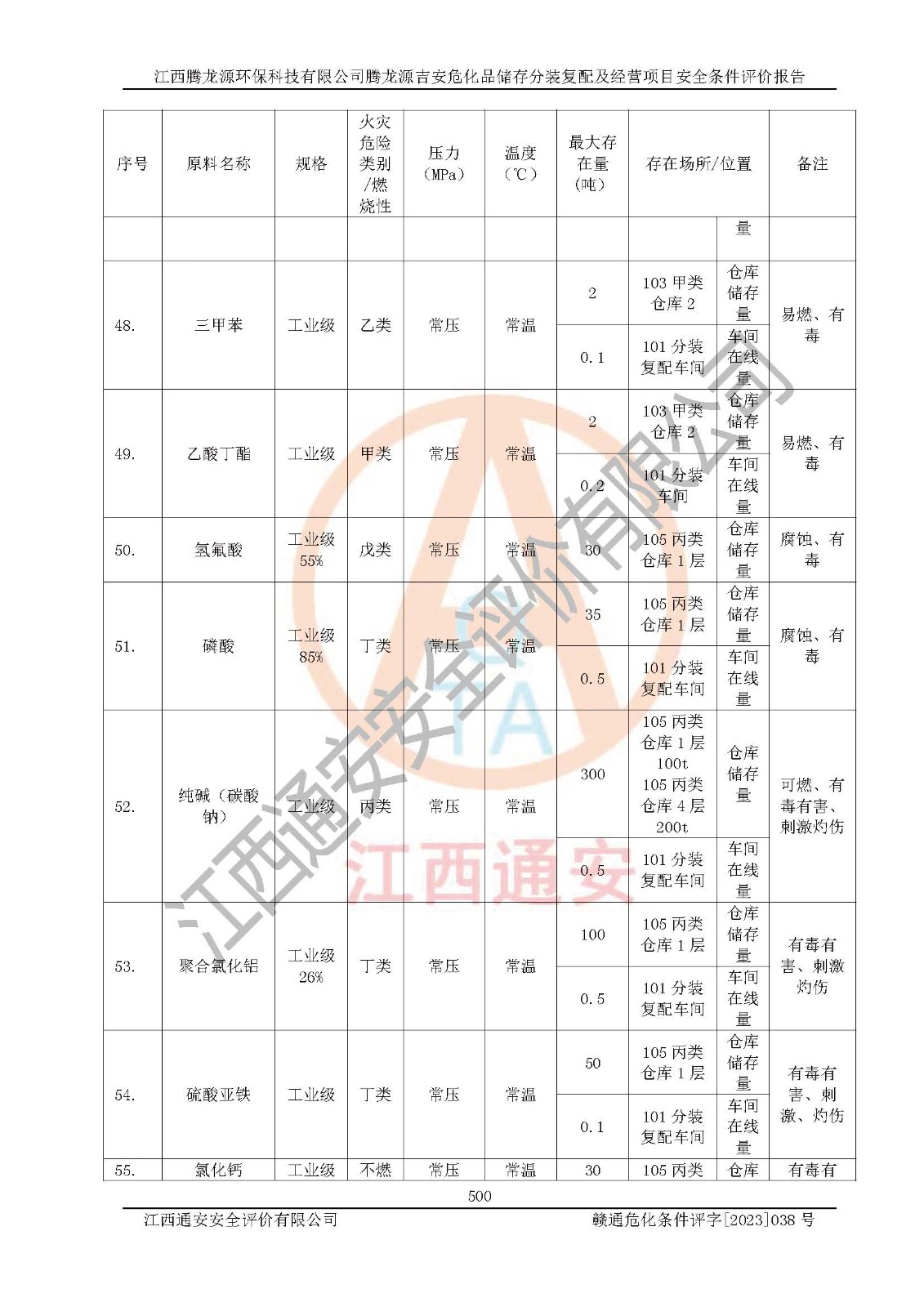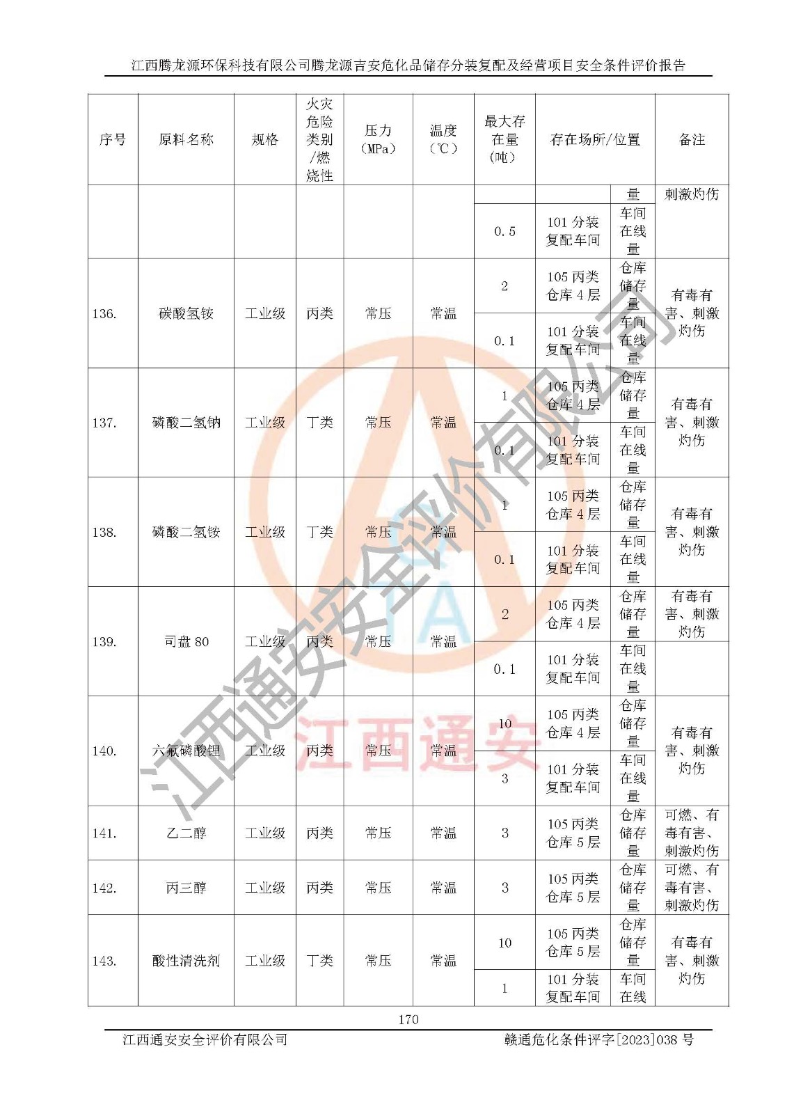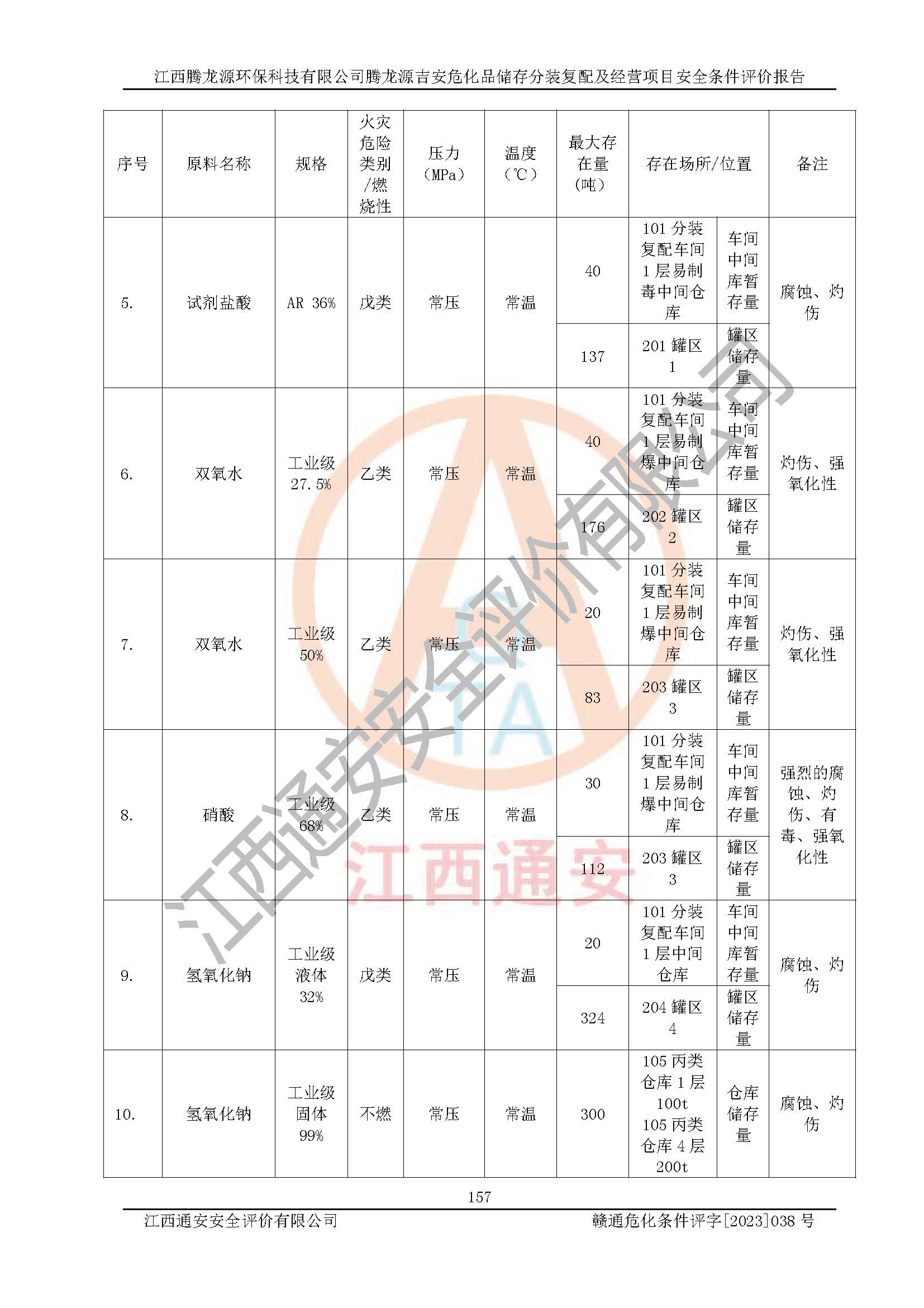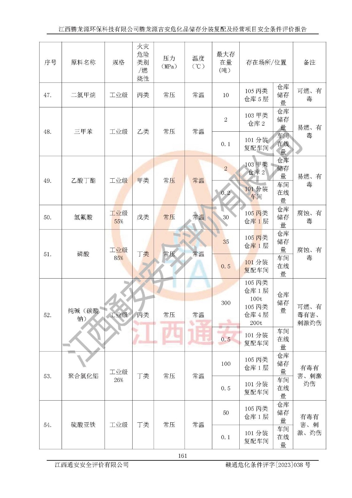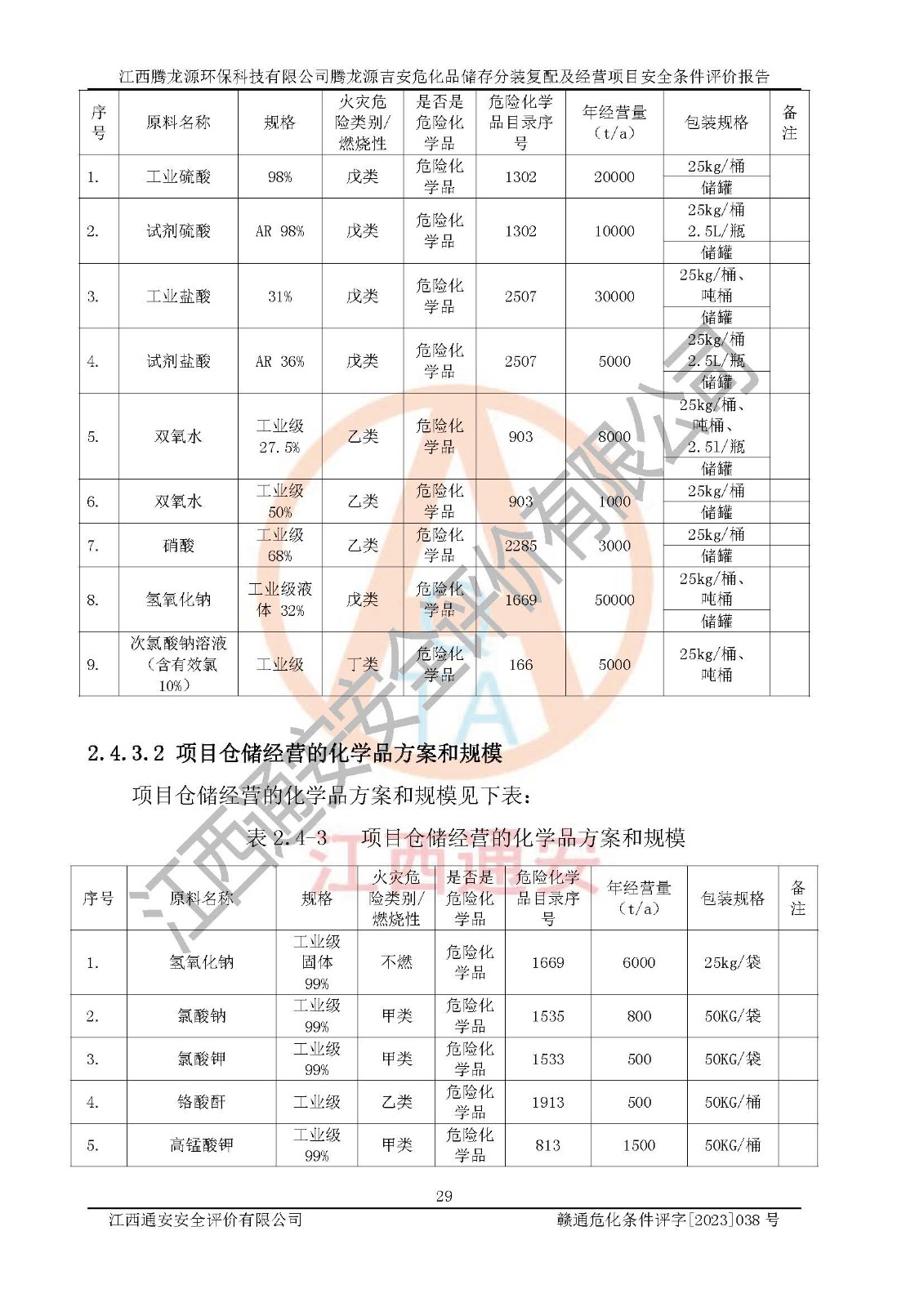 項(xiàng)目簡介 | 江西騰龍?jiān)?*科技有限公司成立于2022年6月20日,并取得吉水縣市場監(jiān)督管理局頒發(fā)的《營業(yè)執(zhí)照》,營業(yè)執(zhí)照統(tǒng)一社會信用代碼:91360822MABQK5GB5P。公司注冊住所:江西省吉安市吉水縣城西工業(yè)園區(qū)二期金龍路。法定**人:吳詩明。注冊資本壹仟萬元整。企業(yè)性質(zhì)為有限責(zé)任公司(自然人投資或控股)。營業(yè)執(zhí)照許可經(jīng)營范圍:一般項(xiàng)目:化工產(chǎn)品銷售(不含許可類化工產(chǎn)品)(除許可業(yè)務(wù)外,可自主依法經(jīng)營法律法規(guī)非禁止或限制的項(xiàng)目)。 江西騰龍?jiān)?*科技有限公司2023年2月24日取得吉水縣發(fā)展和改革委員會頒發(fā)的《江西省企業(yè)投資項(xiàng)目備案通知書》,備案項(xiàng)目名稱為:騰龍?jiān)醇参;穬Υ娣盅b復(fù)配及經(jīng)營項(xiàng)目。項(xiàng)目統(tǒng)一代碼為:2302-360822-04-01-318980。項(xiàng)目總投資20000萬元,項(xiàng)目總占地面積31.34畝。 根據(jù)《危險(xiǎn)化學(xué)品目錄(2015版)》(**安監(jiān)總局等十部門公告[2015]第5號)及應(yīng)急管理部、工業(yè)和信息化部、公安部、生態(tài)環(huán)境部、交通運(yùn)輸部、農(nóng)業(yè)農(nóng)村部、衛(wèi)生健康委、市場監(jiān)管總局、鐵路局、民航局決定調(diào)整《危險(xiǎn)化學(xué)品目錄(2015版)》(應(yīng)急管理部、工業(yè)和信息化部、公安部、生態(tài)環(huán)境部、交通運(yùn)輸部、農(nóng)業(yè)農(nóng)村部、衛(wèi)生健康委、市場監(jiān)管總局、鐵路局、民航局公告2022年第8號)等文件對該項(xiàng)目生產(chǎn)過程中所涉及的化學(xué)品進(jìn)行辨識:項(xiàng)目涉及的硫酸、鹽酸、雙氧水、硝酸、氫氧化鈉(固體和溶液)、次氯酸鈉溶液、氯酸鈉、氯酸鉀、鉻酸酐、高錳酸鈉、高錳酸鉀、硝酸鉀、重鉻酸鉀、重鉻酸鈉、硝酸鈉、亞硝酸鈉、過硫酸鈉、過硫酸銨、過硫酸鉀、漂白粉、氯化亞砜、甲醇、乙醇、二甲苯、甲苯、**、天那水、乙酸、乙酸乙酯、甲醛溶液、三氯乙烯、正丁醇、異丙醇、石油醚、醋酸酐、甲基乙基酮(丁酮)、三氯甲烷、乙醚、氨水(20%)、甲酸、二氯甲烷、**苯、乙酸丁酯、氫氟酸、磷酸、硫化鈉(無水)、氫氧化鉀、氨基磺酸、三氯化鐵、九水硝酸鐵、氯化鋅、硫脲、硼酸、硫酸鎳、氯化鎳、氟化氫銨、氟化氫鉀、氟化氫鈉、偏硅酸鈉、九水偏硅酸鈉、氟硅酸鈉、亞硫酸氫鈉、氟化鈉、氟化鉀、六次甲基四胺、結(jié)晶氯化鋁、碳酸二乙酯、碳酸二甲酯、酸性清洗劑、退鍍劑、開油水、洗網(wǎng)水、污水殺菌劑(復(fù)配的次氯酸鈉溶液)、電解液等屬于危險(xiǎn)化學(xué)品。 江西騰龍?jiān)?*科技有限公司騰龍?jiān)醇参;穬Υ娣盅b復(fù)配及經(jīng)營項(xiàng)目只進(jìn)行物理混合復(fù)配、分裝等作業(yè),不涉及化學(xué)反應(yīng)過程。因此該公司?;穫}儲經(jīng)營活動需要辦理《危險(xiǎn)化學(xué)品經(jīng)營許可證》。 根據(jù)《中華人民共和國監(jiān)控化學(xué)品管理?xiàng)l例》(中華人民共和國***令**90號,經(jīng)中華人民共和國***令第588號修改)及《各類監(jiān)控化學(xué)品名錄》(中華人民共和國工業(yè)和信息化部令第52號;2020年)、《列入第三類監(jiān)控化學(xué)品的新增品種清單》**石油和化學(xué)工業(yè)局令**號等規(guī)定進(jìn)行辨識:項(xiàng)目涉及的氯化亞砜屬于第三類監(jiān)控化學(xué)品。 根據(jù)《易制毒化學(xué)品管理?xiàng)l例》(***令第445號,經(jīng)***令第653號、***第666號、***第703號修改)及附表規(guī)定、中華人民共和國公安部 中華人民共和國商務(wù)部、**衛(wèi)生和計(jì)劃生育委員會、中華人民共和國海關(guān)總署、**安全生產(chǎn)監(jiān)督管理總局、**食品藥品監(jiān)督管理總局《關(guān)于將4-苯胺基-N-苯乙基哌啶、N-苯乙基-4-哌啶酮、N-甲基-1-苯基-1-氯-2-丙胺、溴素、1-苯基-1-**5種物質(zhì)列入易制毒化學(xué)品管理的公告》(國辦函[2017]**20號)、《***辦公廳關(guān)于同意將1-苯基-2-溴-1-**和3-氧-2-苯基丁腈列入易制毒化學(xué)品品種目錄的函》(國辦函[2014]第40號)、《***辦公廳關(guān)于同意將α-苯乙酰乙酸甲酯等6種物質(zhì)列入易制毒化學(xué)品品種目錄的函》(國辦函〔2021〕58號)等進(jìn)行辨識:項(xiàng)目涉及的硫酸、鹽酸、高錳酸鉀、甲苯、**、甲基乙基酮等屬于第三類易制毒化學(xué)品;醋酸酐、三氯甲烷、乙醚等屬于第二類易制毒化學(xué)品。 根據(jù)《危險(xiǎn)化學(xué)品名錄[2015年版]》(**安監(jiān)總局等十部門[2015]第5號)進(jìn)行劇毒化學(xué)品辨識:項(xiàng)目不涉及劇毒化學(xué)品。 根據(jù)《高毒物品目錄(2003年版)》(原衛(wèi)生部衛(wèi)法監(jiān)發(fā)[2003]142號)對項(xiàng)目涉及的化學(xué)品進(jìn)行高毒物品辨識:項(xiàng)目涉及的甲醛溶液、硫酸鎳、氯化鎳、氟化氫銨、氟化氫鉀、氟化氫鈉、氟化鈉、氟化鉀、鉻酸酐、高錳酸鉀、高錳酸鈉、重鉻酸鉀、重鉻酸鈉等屬于高毒物品。 根據(jù)中華人民共和國公安部《易制爆危險(xiǎn)化學(xué)品名錄》(2017年版)中規(guī)定進(jìn)行辨識:項(xiàng)目涉及的雙氧水、硝酸、氯酸鈉、氯酸鉀、高錳酸鉀、高錳酸鈉、硝酸鉀、重鉻酸鉀、重鉻酸鈉、硝酸鈉、六次甲基四胺等屬于易
