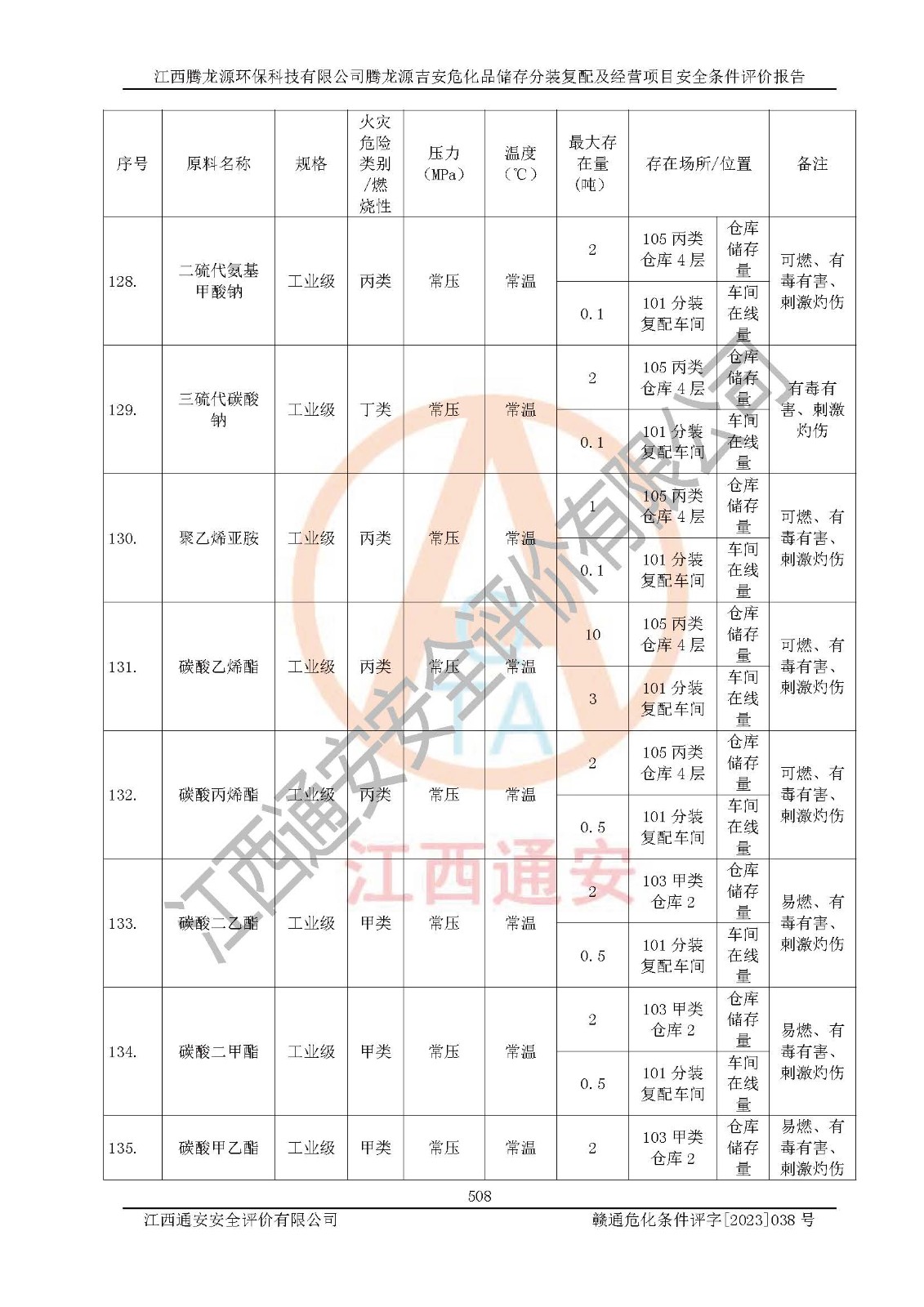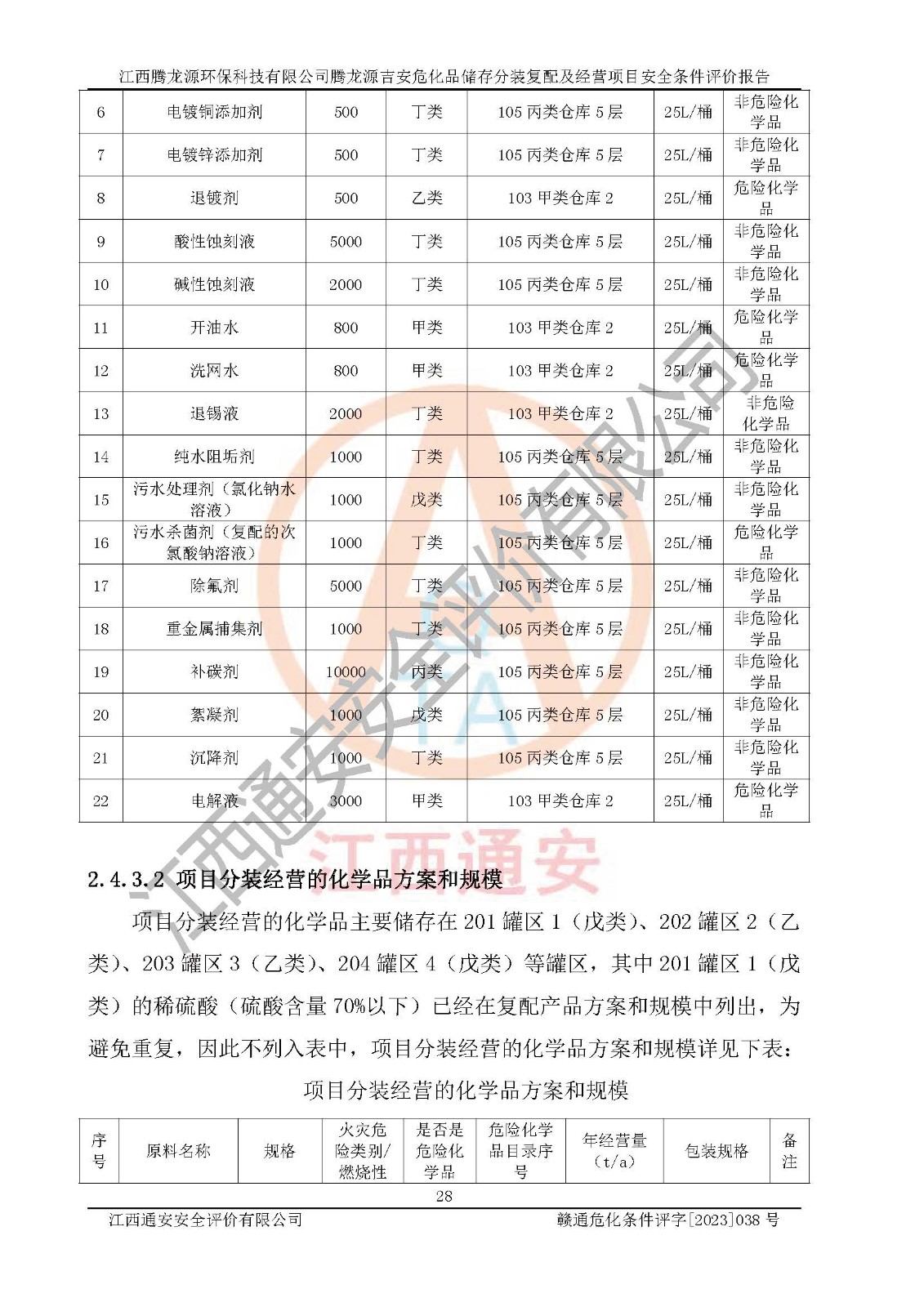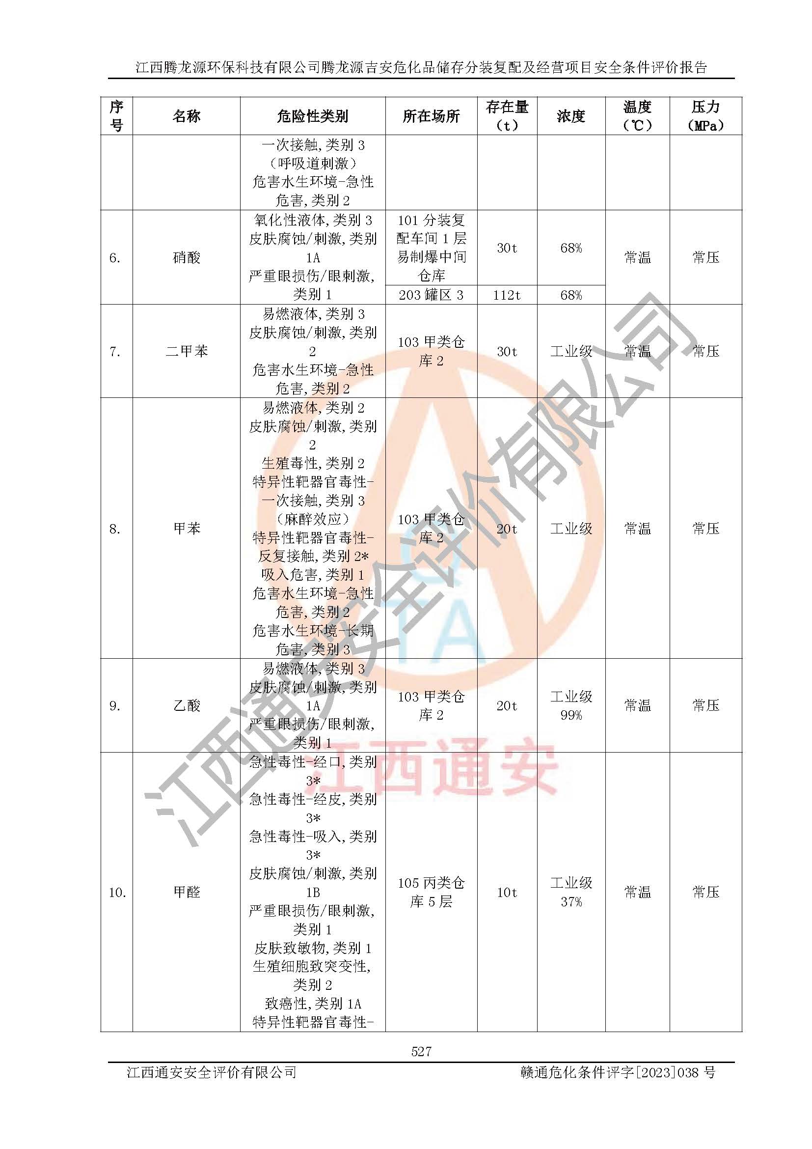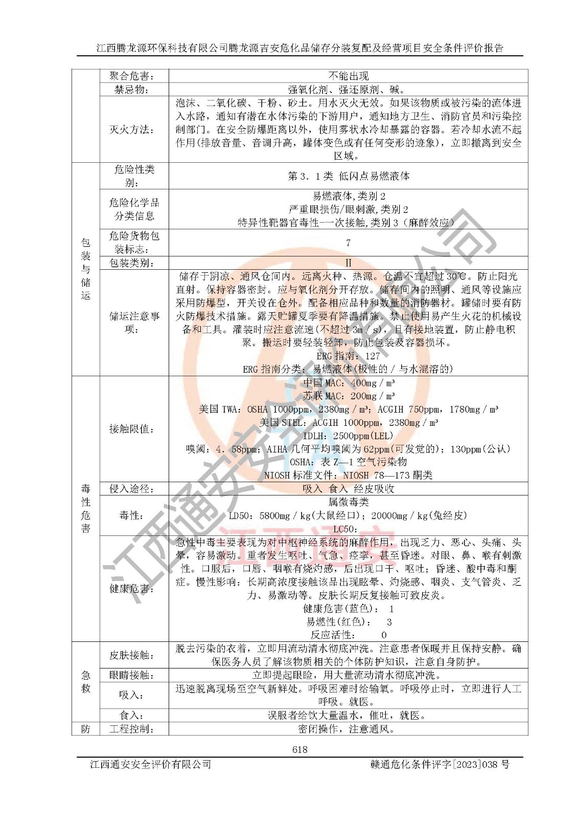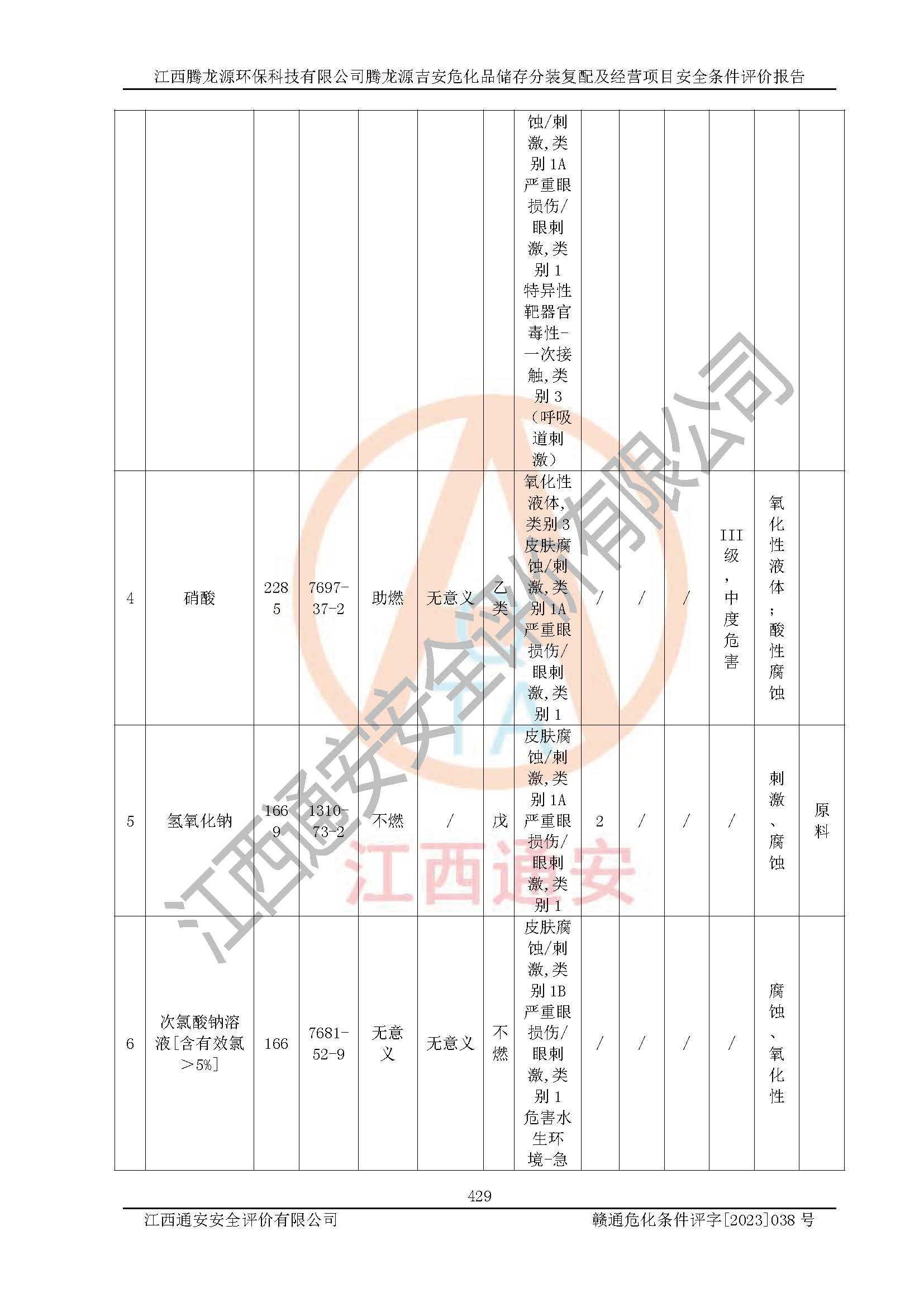 項(xiàng)目簡介 | 江西騰龍?jiān)?*科技有限公司成立于2022年6月20日,并取得吉水縣市場監(jiān)督管理局頒發(fā)的《營業(yè)執(zhí)照》,營業(yè)執(zhí)照統(tǒng)一社會信用代碼:91360822MABQK5GB5P。公司注冊住所:江西省吉安市吉水縣城西工業(yè)園區(qū)二期金龍路。法定**人:吳詩明。注冊資本壹仟萬元整。企業(yè)性質(zhì)為有限責(zé)任公司(自然人投資或控股)。營業(yè)執(zhí)照許可經(jīng)營范圍:一般項(xiàng)目:化工產(chǎn)品銷售(不含許可類化工產(chǎn)品)(除許可業(yè)務(wù)外,可自主依法經(jīng)營法律法規(guī)非禁止或限制的項(xiàng)目)。 江西騰龍?jiān)?*科技有限公司2023年2月24日取得吉水縣發(fā)展和改革委員會頒發(fā)的《江西省企業(yè)投資項(xiàng)目備案通知書》,備案項(xiàng)目名稱為:騰龍?jiān)醇参;穬Υ娣盅b復(fù)配及經(jīng)營項(xiàng)目。項(xiàng)目統(tǒng)一代碼為:2302-360822-04-01-318980。項(xiàng)目總投資20000萬元,項(xiàng)目總占地面積31.34畝。 根據(jù)《危險(xiǎn)化學(xué)品目錄(2015版)》(**安監(jiān)總局等十部門公告[2015]第5號)及應(yīng)急管理部、工業(yè)和信息化部、公安部、生態(tài)環(huán)境部、交通運(yùn)輸部、農(nóng)業(yè)農(nóng)村部、衛(wèi)生健康委、市場監(jiān)管總局、鐵路局、民航局決定調(diào)整《危險(xiǎn)化學(xué)品目錄(2015版)》(應(yīng)急管理部、工業(yè)和信息化部、公安部、生態(tài)環(huán)境部、交通運(yùn)輸部、農(nóng)業(yè)農(nóng)村部、衛(wèi)生健康委、市場監(jiān)管總局、鐵路局、民航局公告2022年第8號)等文件對該項(xiàng)目生產(chǎn)過程中所涉及的化學(xué)品進(jìn)行辨識:項(xiàng)目涉及的硫酸、鹽酸、雙氧水、硝酸、氫氧化鈉(固體和溶液)、次氯酸鈉溶液、氯酸鈉、氯酸鉀、鉻酸酐、高錳酸鈉、高錳酸鉀、硝酸鉀、重鉻酸鉀、重鉻酸鈉、硝酸鈉、亞硝酸鈉、過硫酸鈉、過硫酸銨、過硫酸鉀、漂白粉、氯化亞砜、甲醇、乙醇、二甲苯、甲苯、**、天那水、乙酸、乙酸乙酯、甲醛溶液、三氯乙烯、正丁醇、異丙醇、石油醚、醋酸酐、甲基乙基酮(丁酮)、三氯甲烷、乙醚、氨水(20%)、甲酸、二氯甲烷、**苯、乙酸丁酯、氫氟酸、磷酸、硫化鈉(無水)、氫氧化鉀、氨基磺酸、三氯化鐵、九水硝酸鐵、氯化鋅、硫脲、硼酸、硫酸鎳、氯化鎳、氟化氫銨、氟化氫鉀、氟化氫鈉、偏硅酸鈉、九水偏硅酸鈉、氟硅酸鈉、亞硫酸氫鈉、氟化鈉、氟化鉀、六次甲基四胺、結(jié)晶氯化鋁、碳酸二乙酯、碳酸二甲酯、酸性清洗劑、退鍍劑、開油水、洗網(wǎng)水、污水殺菌劑(復(fù)配的次氯酸鈉溶液)、電解液等屬于危險(xiǎn)化學(xué)品。 江西騰龍?jiān)?*科技有限公司騰龍?jiān)醇参;穬Υ娣盅b復(fù)配及經(jīng)營項(xiàng)目只進(jìn)行物理混合復(fù)配、分裝等作業(yè),不涉及化學(xué)反應(yīng)過程。因此該公司?;穫}儲經(jīng)營活動需要辦理《危險(xiǎn)化學(xué)品經(jīng)營許可證》。 根據(jù)《中華人民共和國監(jiān)控化學(xué)品管理?xiàng)l例》(中華人民共和國***令**90號,經(jīng)中華人民共和國***令第588號修改)及《各類監(jiān)控化學(xué)品名錄》(中華人民共和國工業(yè)和信息化部令第52號;2020年)、《列入第三類監(jiān)控化學(xué)品的新增品種清單》**石油和化學(xué)工業(yè)局令**號等規(guī)定進(jìn)行辨識:項(xiàng)目涉及的氯化亞砜屬于第三類監(jiān)控化學(xué)品。 根據(jù)《易制毒化學(xué)品管理?xiàng)l例》(***令第445號,經(jīng)***令第653號、***第666號、***第703號修改)及附表規(guī)定、中華人民共和國公安部 中華人民共和國商務(wù)部、**衛(wèi)生和計(jì)劃生育委員會、中華人民共和國海關(guān)總署、**安全生產(chǎn)監(jiān)督管理總局、**食品藥品監(jiān)督管理總局《關(guān)于將4-苯胺基-N-苯乙基哌啶、N-苯乙基-4-哌啶酮、N-甲基-1-苯基-1-氯-2-丙胺、溴素、1-苯基-1-**5種物質(zhì)列入易制毒化學(xué)品管理的公告》(國辦函[2017]**20號)、《***辦公廳關(guān)于同意將1-苯基-2-溴-1-**和3-氧-2-苯基丁腈列入易制毒化學(xué)品品種目錄的函》(國辦函[2014]第40號)、《***辦公廳關(guān)于同意將α-苯乙酰乙酸甲酯等6種物質(zhì)列入易制毒化學(xué)品品種目錄的函》(國辦函〔2021〕58號)等進(jìn)行辨識:項(xiàng)目涉及的硫酸、鹽酸、高錳酸鉀、甲苯、**、甲基乙基酮等屬于第三類易制毒化學(xué)品;醋酸酐、三氯甲烷、乙醚等屬于第二類易制毒化學(xué)品。 根據(jù)《危險(xiǎn)化學(xué)品名錄[2015年版]》(**安監(jiān)總局等十部門[2015]第5號)進(jìn)行劇毒化學(xué)品辨識:項(xiàng)目不涉及劇毒化學(xué)品。 根據(jù)《高毒物品目錄(2003年版)》(原衛(wèi)生部衛(wèi)法監(jiān)發(fā)[2003]142號)對項(xiàng)目涉及的化學(xué)品進(jìn)行高毒物品辨識:項(xiàng)目涉及的甲醛溶液、硫酸鎳、氯化鎳、氟化氫銨、氟化氫鉀、氟化氫鈉、氟化鈉、氟化鉀、鉻酸酐、高錳酸鉀、高錳酸鈉、重鉻酸鉀、重鉻酸鈉等屬于高毒物品。 根據(jù)中華人民共和國公安部《易制爆危險(xiǎn)化學(xué)品名錄》(2017年版)中規(guī)定進(jìn)行辨識:項(xiàng)目涉及的雙氧水、硝酸、氯酸鈉、氯酸鉀、高錳酸鉀、高錳酸鈉、硝酸鉀、重鉻酸鉀、重鉻酸鈉、硝酸鈉、六次甲基四胺等屬于易