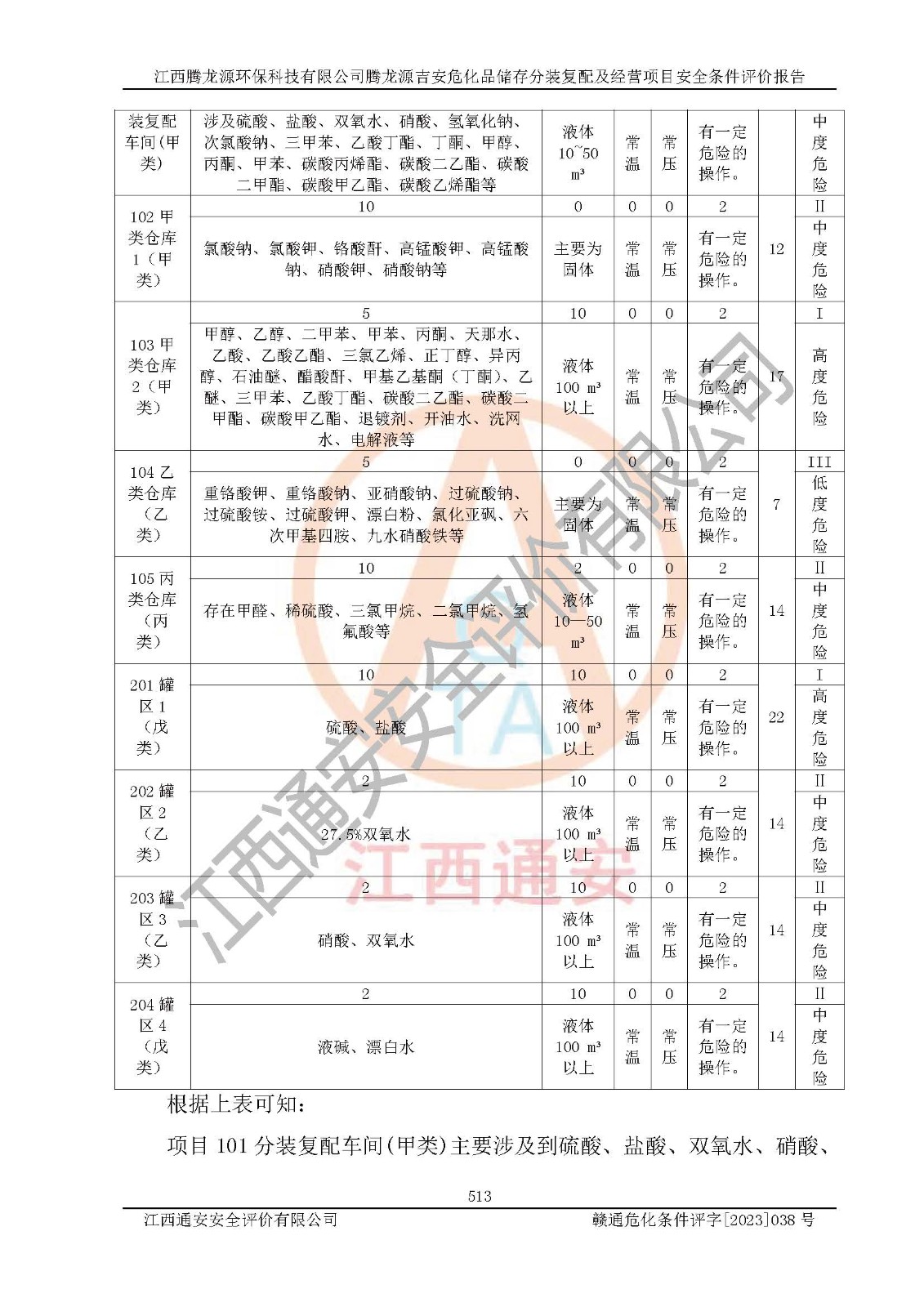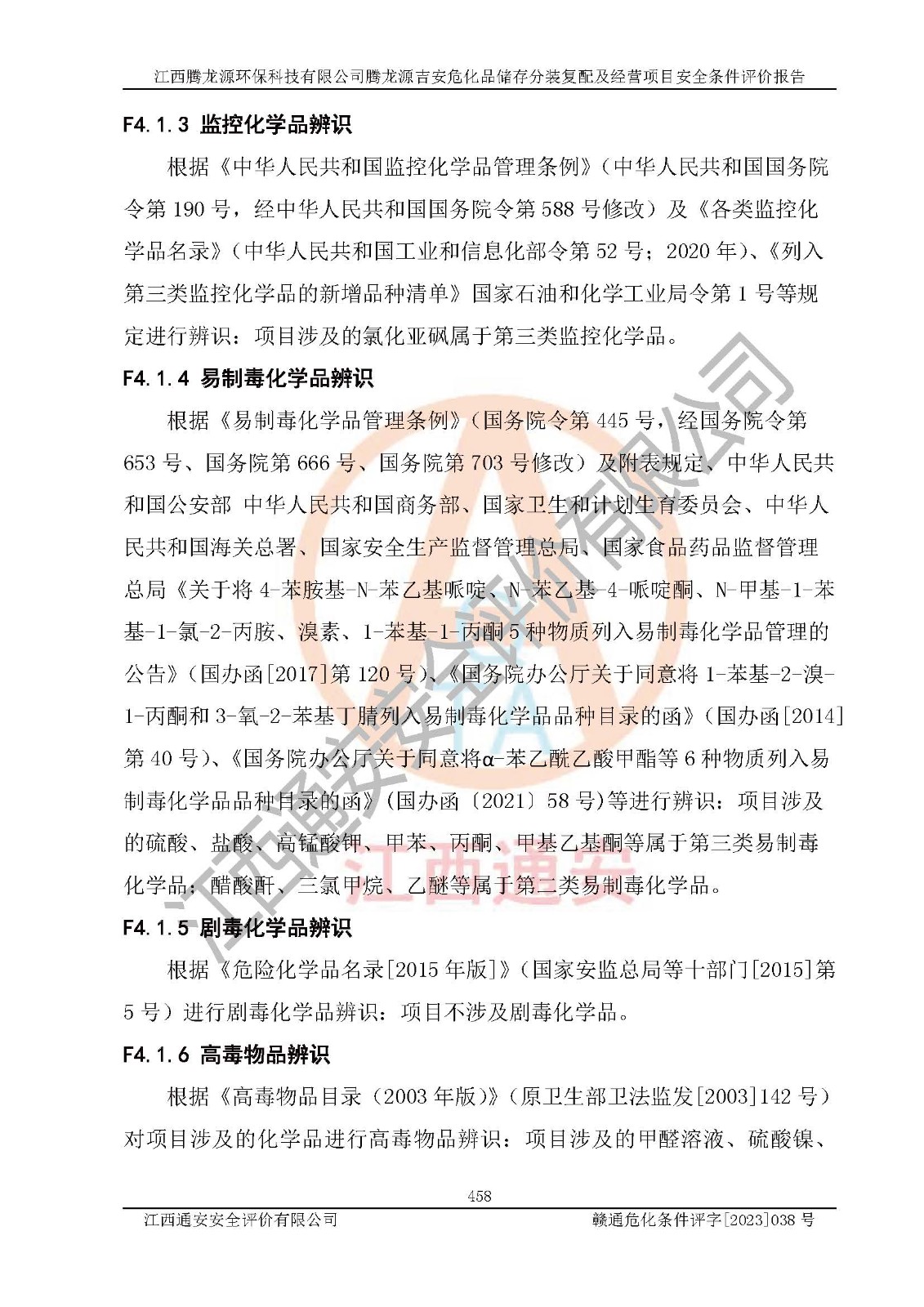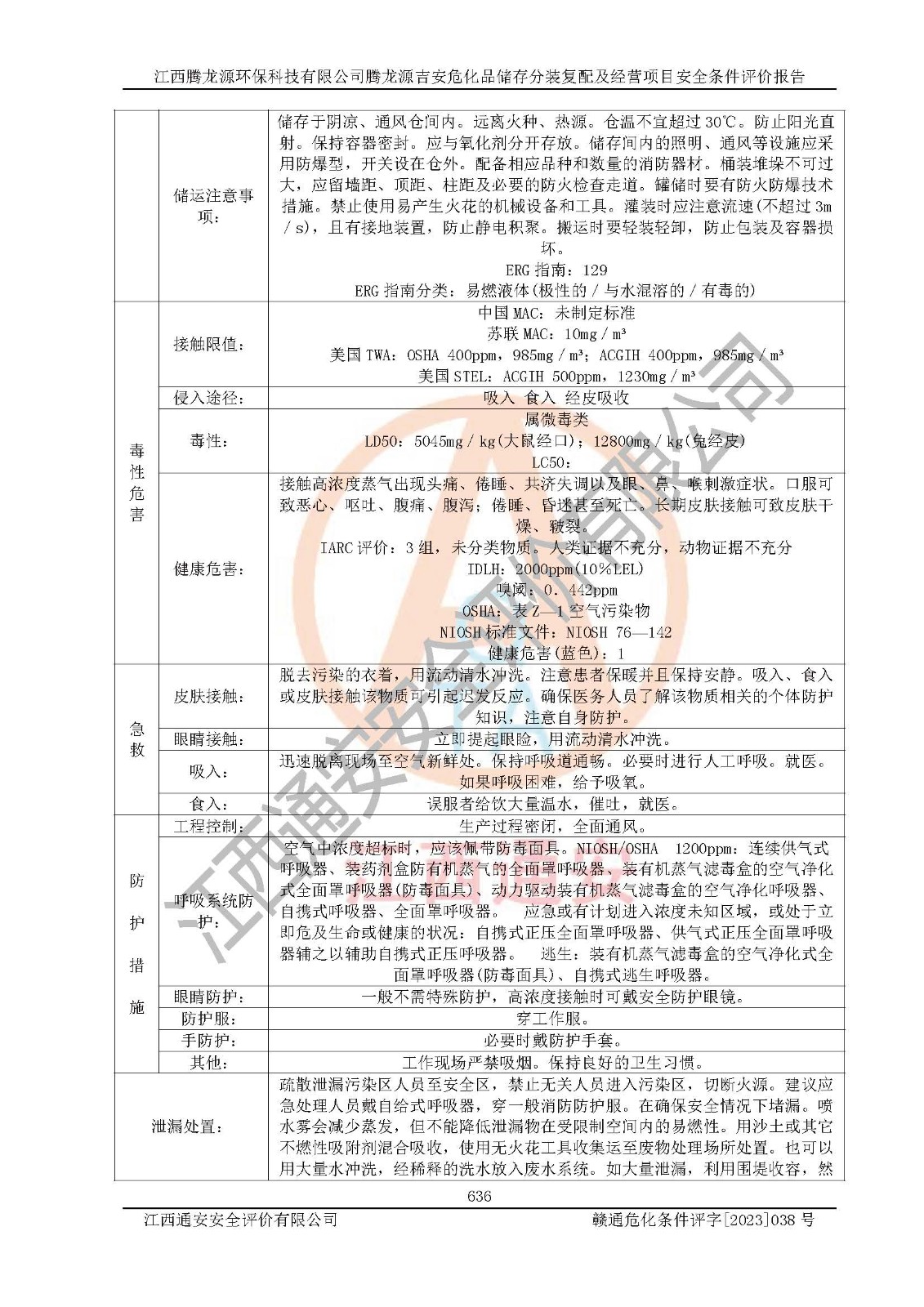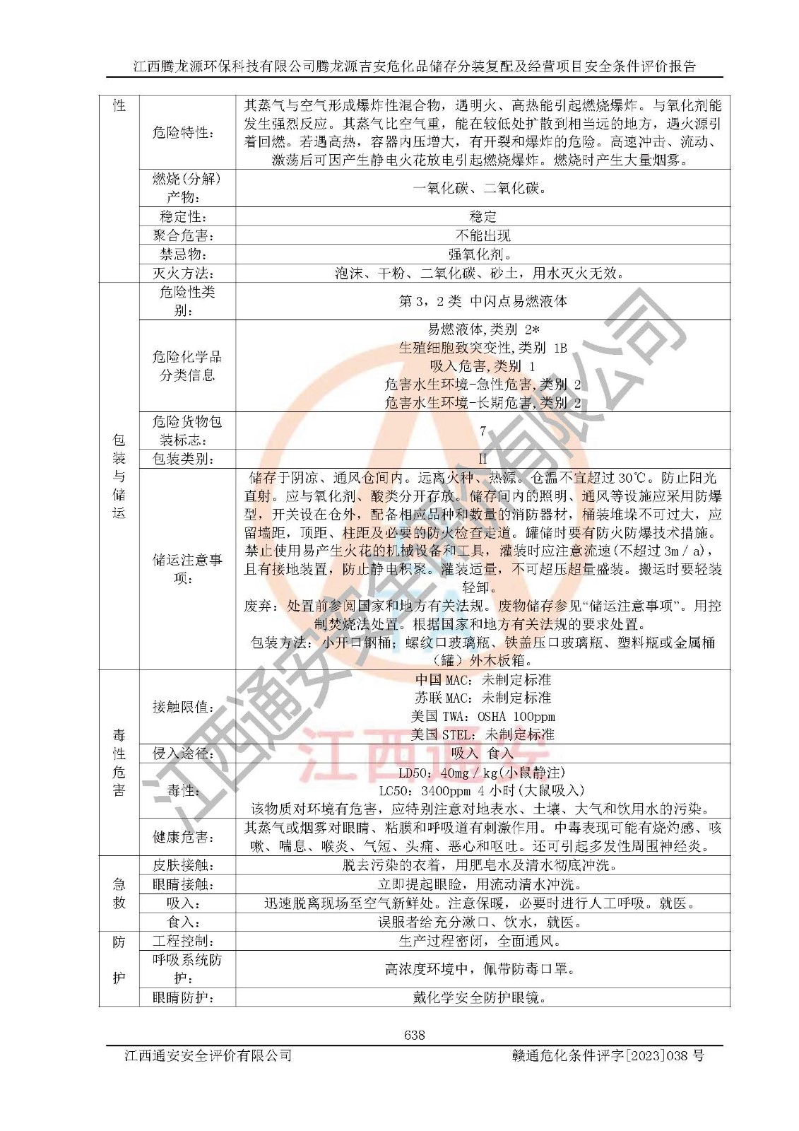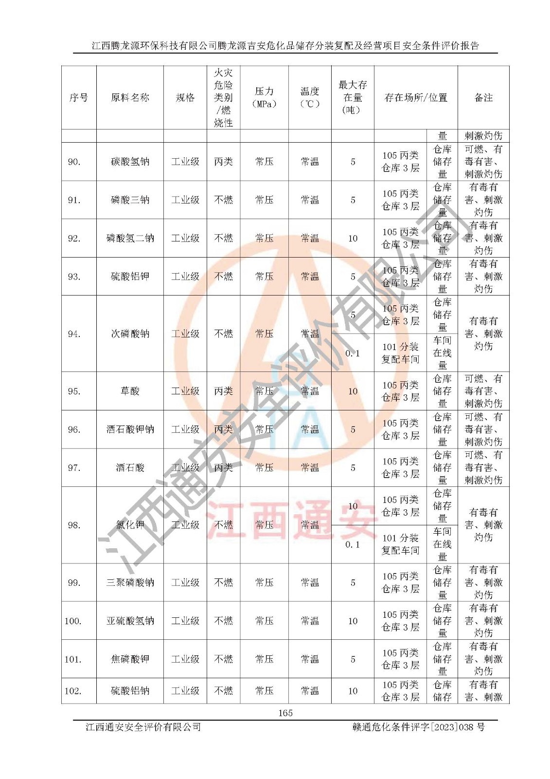 項(xiàng)目簡介 | 江西騰龍?jiān)?*科技有限公司成立于2022年6月20日,并取得吉水縣市場監(jiān)督管理局頒發(fā)的《營業(yè)執(zhí)照》,營業(yè)執(zhí)照統(tǒng)一社會信用代碼:91360822MABQK5GB5P。公司注冊住所:江西省吉安市吉水縣城西工業(yè)園區(qū)二期金龍路。法定**人:吳詩明。注冊資本壹仟萬元整。企業(yè)性質(zhì)為有限責(zé)任公司(自然人投資或控股)。營業(yè)執(zhí)照許可經(jīng)營范圍:一般項(xiàng)目:化工產(chǎn)品銷售(不含許可類化工產(chǎn)品)(除許可業(yè)務(wù)外,可自主依法經(jīng)營法律法規(guī)非禁止或限制的項(xiàng)目)。 江西騰龍?jiān)?*科技有限公司2023年2月24日取得吉水縣發(fā)展和改革委員會頒發(fā)的《江西省企業(yè)投資項(xiàng)目備案通知書》,備案項(xiàng)目名稱為:騰龍?jiān)醇参;穬Υ娣盅b復(fù)配及經(jīng)營項(xiàng)目。項(xiàng)目統(tǒng)一代碼為:2302-360822-04-01-318980。項(xiàng)目總投資20000萬元,項(xiàng)目總占地面積31.34畝。 根據(jù)《危險(xiǎn)化學(xué)品目錄(2015版)》(**安監(jiān)總局等十部門公告[2015]第5號)及應(yīng)急管理部、工業(yè)和信息化部、公安部、生態(tài)環(huán)境部、交通運(yùn)輸部、農(nóng)業(yè)農(nóng)村部、衛(wèi)生健康委、市場監(jiān)管總局、鐵路局、民航局決定調(diào)整《危險(xiǎn)化學(xué)品目錄(2015版)》(應(yīng)急管理部、工業(yè)和信息化部、公安部、生態(tài)環(huán)境部、交通運(yùn)輸部、農(nóng)業(yè)農(nóng)村部、衛(wèi)生健康委、市場監(jiān)管總局、鐵路局、民航局公告2022年第8號)等文件對該項(xiàng)目生產(chǎn)過程中所涉及的化學(xué)品進(jìn)行辨識:項(xiàng)目涉及的硫酸、鹽酸、雙氧水、硝酸、氫氧化鈉(固體和溶液)、次氯酸鈉溶液、氯酸鈉、氯酸鉀、鉻酸酐、高錳酸鈉、高錳酸鉀、硝酸鉀、重鉻酸鉀、重鉻酸鈉、硝酸鈉、亞硝酸鈉、過硫酸鈉、過硫酸銨、過硫酸鉀、漂白粉、氯化亞砜、甲醇、乙醇、二甲苯、甲苯、**、天那水、乙酸、乙酸乙酯、甲醛溶液、三氯乙烯、正丁醇、異丙醇、石油醚、醋酸酐、甲基乙基酮(丁酮)、三氯甲烷、乙醚、氨水(20%)、甲酸、二氯甲烷、**苯、乙酸丁酯、氫氟酸、磷酸、硫化鈉(無水)、氫氧化鉀、氨基磺酸、三氯化鐵、九水硝酸鐵、氯化鋅、硫脲、硼酸、硫酸鎳、氯化鎳、氟化氫銨、氟化氫鉀、氟化氫鈉、偏硅酸鈉、九水偏硅酸鈉、氟硅酸鈉、亞硫酸氫鈉、氟化鈉、氟化鉀、六次甲基四胺、結(jié)晶氯化鋁、碳酸二乙酯、碳酸二甲酯、酸性清洗劑、退鍍劑、開油水、洗網(wǎng)水、污水殺菌劑(復(fù)配的次氯酸鈉溶液)、電解液等屬于危險(xiǎn)化學(xué)品。 江西騰龍?jiān)?*科技有限公司騰龍?jiān)醇参;穬Υ娣盅b復(fù)配及經(jīng)營項(xiàng)目只進(jìn)行物理混合復(fù)配、分裝等作業(yè),不涉及化學(xué)反應(yīng)過程。因此該公司?;穫}儲經(jīng)營活動需要辦理《危險(xiǎn)化學(xué)品經(jīng)營許可證》。 根據(jù)《中華人民共和國監(jiān)控化學(xué)品管理?xiàng)l例》(中華人民共和國***令**90號,經(jīng)中華人民共和國***令第588號修改)及《各類監(jiān)控化學(xué)品名錄》(中華人民共和國工業(yè)和信息化部令第52號;2020年)、《列入第三類監(jiān)控化學(xué)品的新增品種清單》**石油和化學(xué)工業(yè)局令**號等規(guī)定進(jìn)行辨識:項(xiàng)目涉及的氯化亞砜屬于第三類監(jiān)控化學(xué)品。 根據(jù)《易制毒化學(xué)品管理?xiàng)l例》(***令第445號,經(jīng)***令第653號、***第666號、***第703號修改)及附表規(guī)定、中華人民共和國公安部 中華人民共和國商務(wù)部、**衛(wèi)生和計(jì)劃生育委員會、中華人民共和國海關(guān)總署、**安全生產(chǎn)監(jiān)督管理總局、**食品藥品監(jiān)督管理總局《關(guān)于將4-苯胺基-N-苯乙基哌啶、N-苯乙基-4-哌啶酮、N-甲基-1-苯基-1-氯-2-丙胺、溴素、1-苯基-1-**5種物質(zhì)列入易制毒化學(xué)品管理的公告》(國辦函[2017]**20號)、《***辦公廳關(guān)于同意將1-苯基-2-溴-1-**和3-氧-2-苯基丁腈列入易制毒化學(xué)品品種目錄的函》(國辦函[2014]第40號)、《***辦公廳關(guān)于同意將α-苯乙酰乙酸甲酯等6種物質(zhì)列入易制毒化學(xué)品品種目錄的函》(國辦函〔2021〕58號)等進(jìn)行辨識:項(xiàng)目涉及的硫酸、鹽酸、高錳酸鉀、甲苯、**、甲基乙基酮等屬于第三類易制毒化學(xué)品;醋酸酐、三氯甲烷、乙醚等屬于第二類易制毒化學(xué)品。 根據(jù)《危險(xiǎn)化學(xué)品名錄[2015年版]》(**安監(jiān)總局等十部門[2015]第5號)進(jìn)行劇毒化學(xué)品辨識:項(xiàng)目不涉及劇毒化學(xué)品。 根據(jù)《高毒物品目錄(2003年版)》(原衛(wèi)生部衛(wèi)法監(jiān)發(fā)[2003]142號)對項(xiàng)目涉及的化學(xué)品進(jìn)行高毒物品辨識:項(xiàng)目涉及的甲醛溶液、硫酸鎳、氯化鎳、氟化氫銨、氟化氫鉀、氟化氫鈉、氟化鈉、氟化鉀、鉻酸酐、高錳酸鉀、高錳酸鈉、重鉻酸鉀、重鉻酸鈉等屬于高毒物品。 根據(jù)中華人民共和國公安部《易制爆危險(xiǎn)化學(xué)品名錄》(2017年版)中規(guī)定進(jìn)行辨識:項(xiàng)目涉及的雙氧水、硝酸、氯酸鈉、氯酸鉀、高錳酸鉀、高錳酸鈉、硝酸鉀、重鉻酸鉀、重鉻酸鈉、硝酸鈉、六次甲基四胺等屬于易