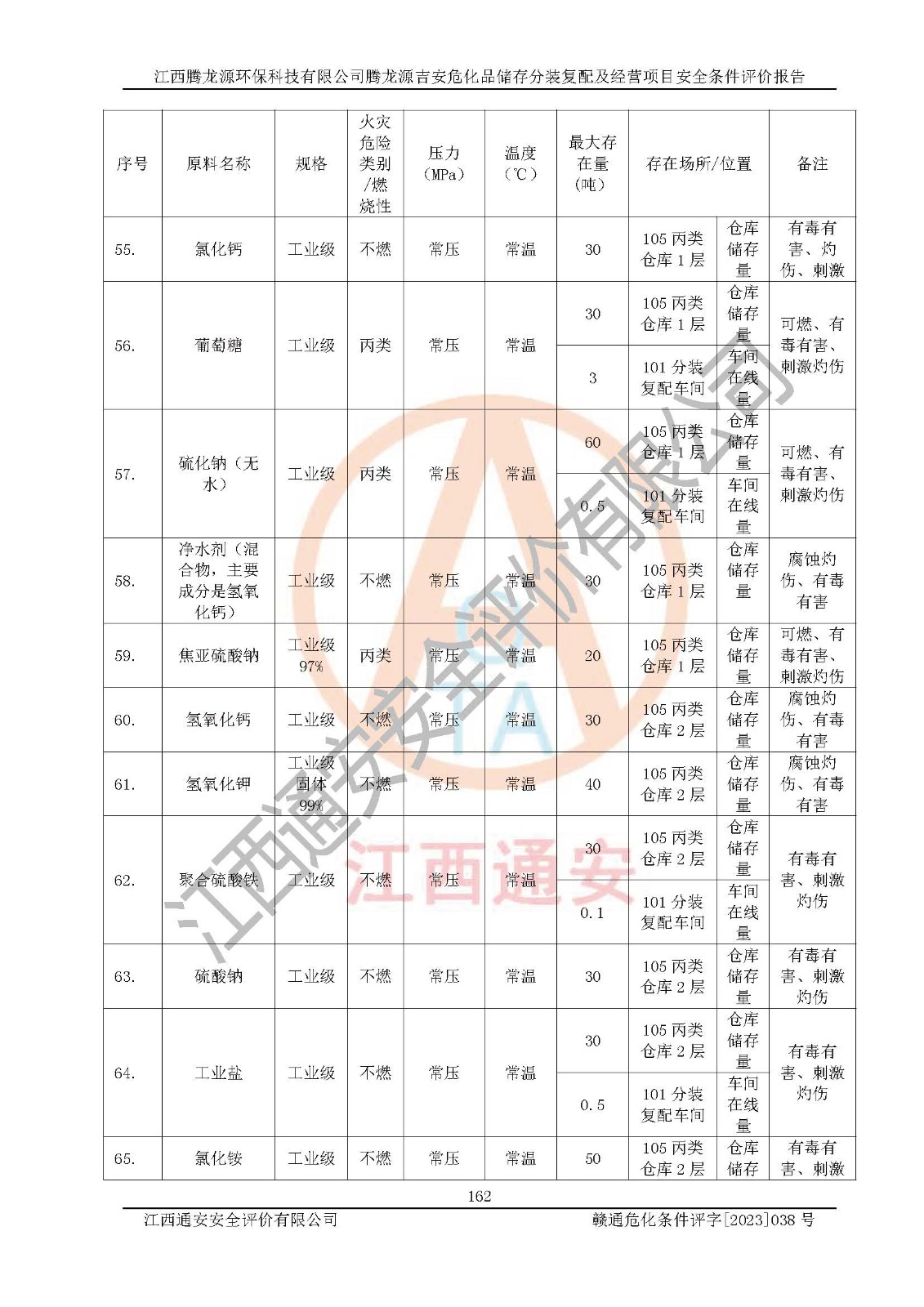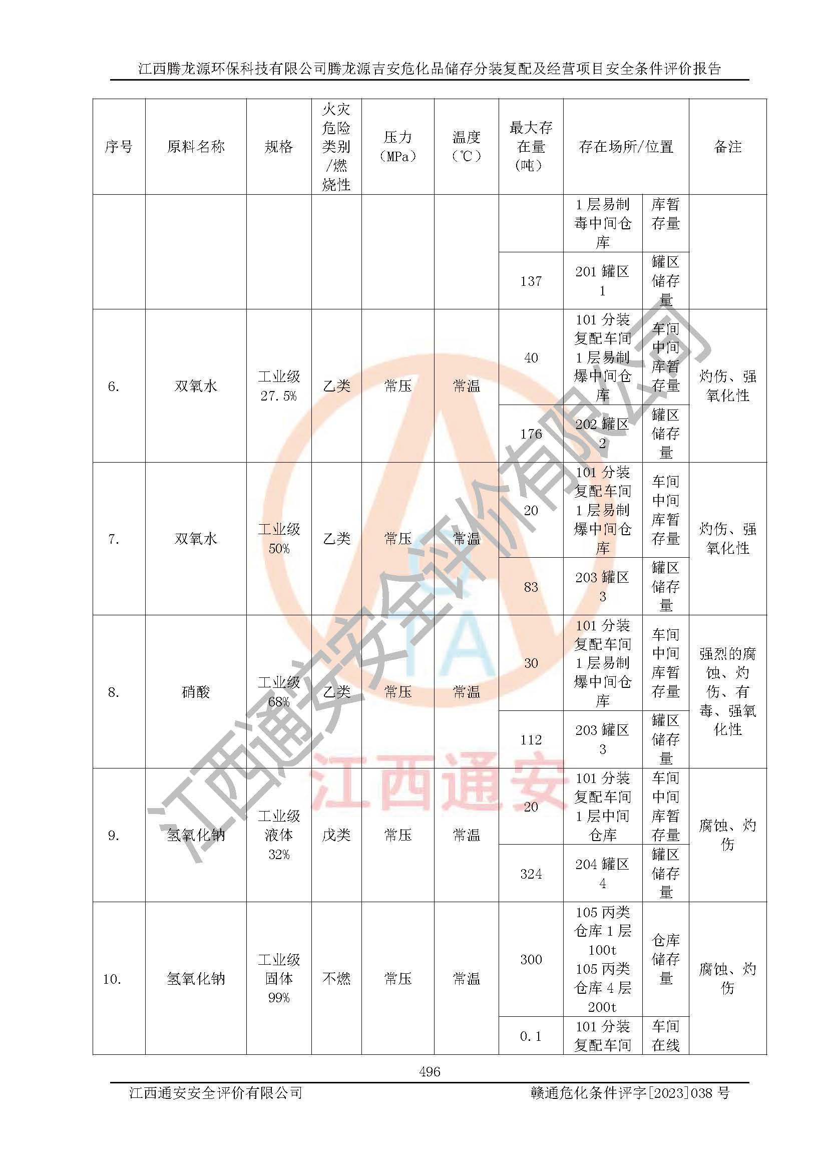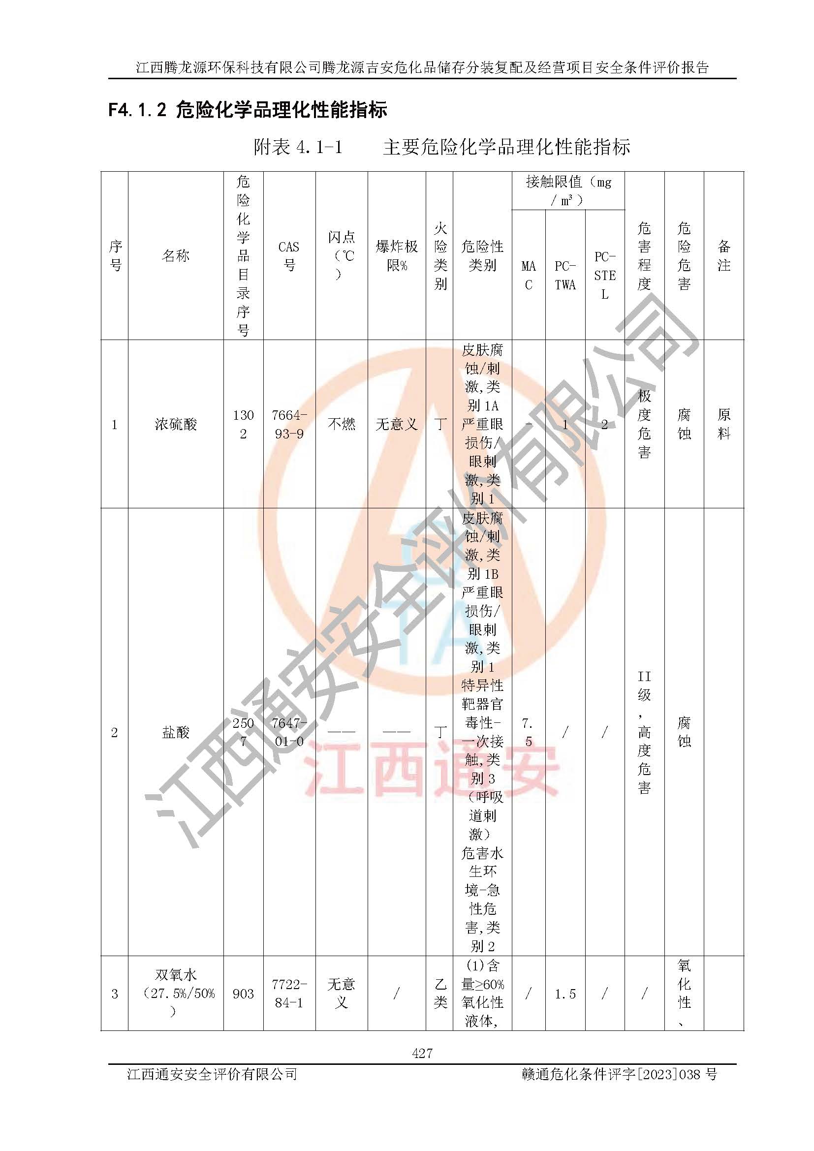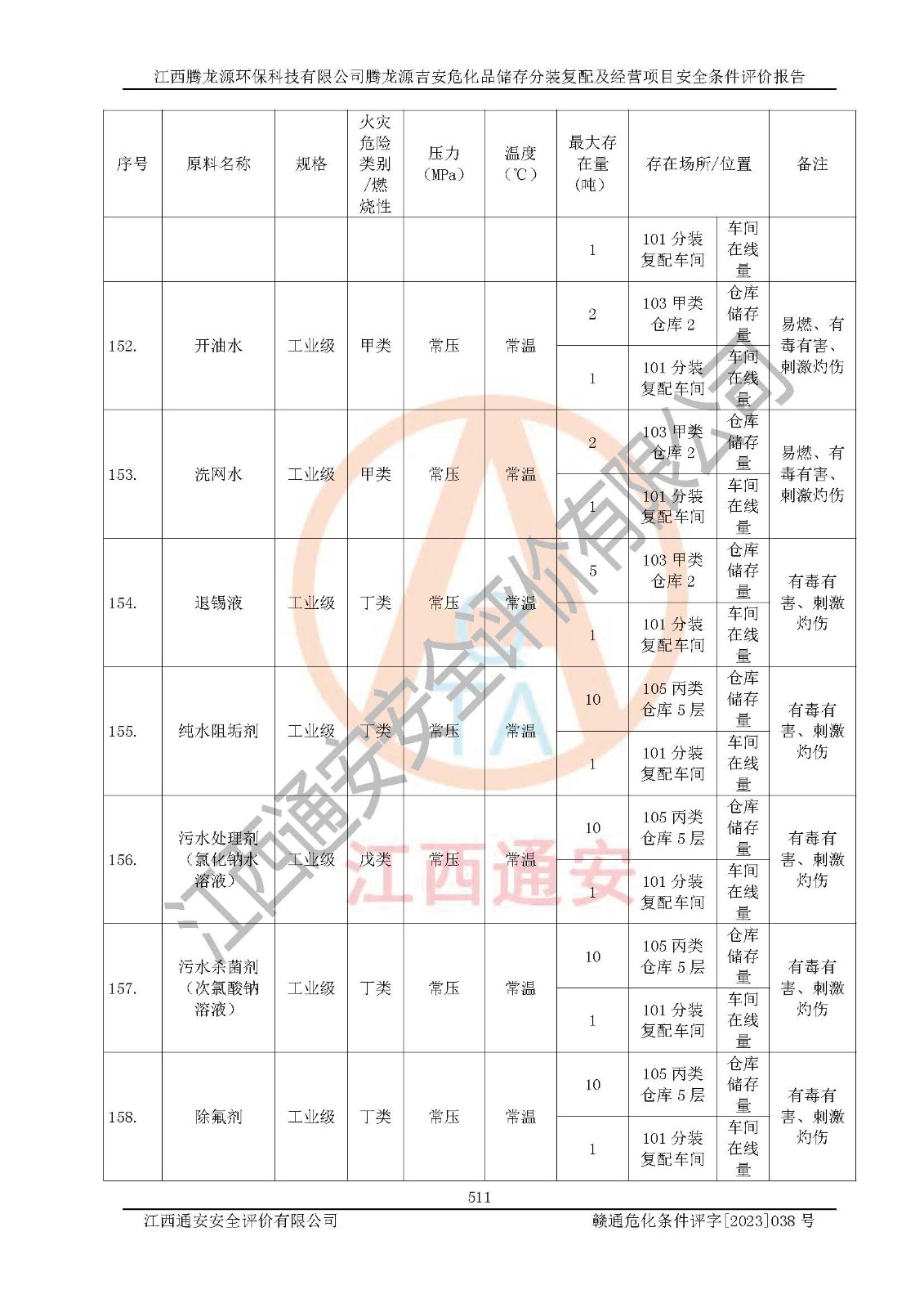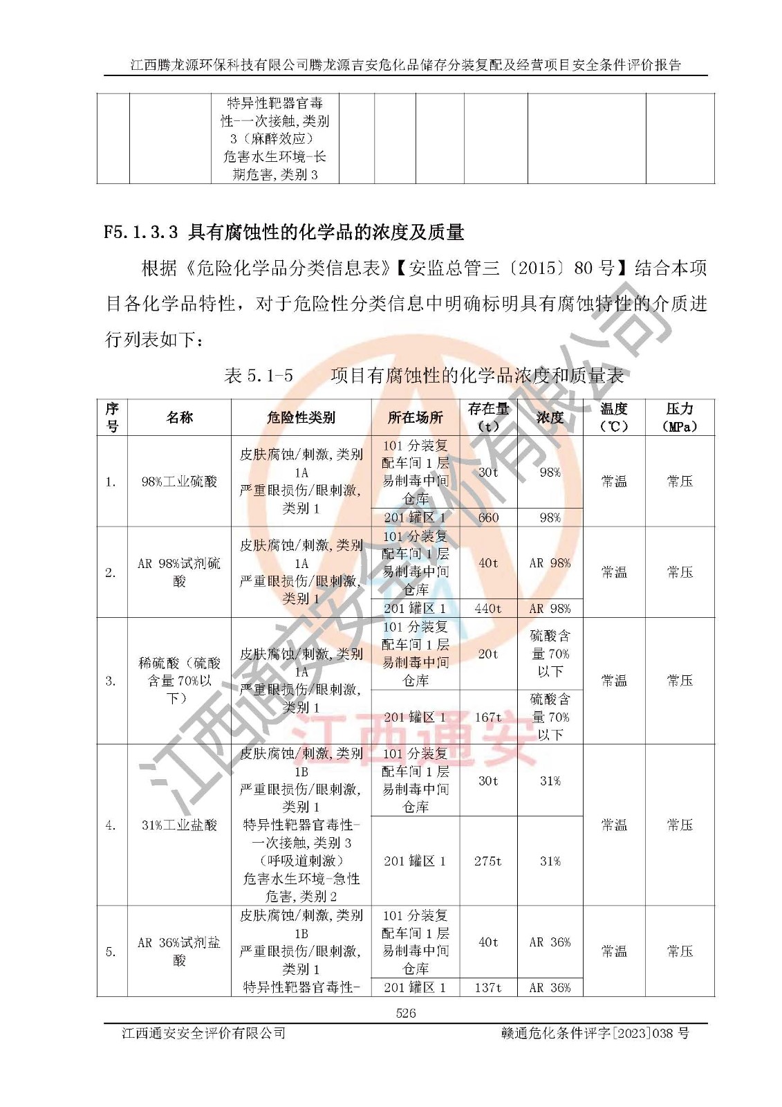 項(xiàng)目簡介 | 江西騰龍?jiān)?*科技有限公司成立于2022年6月20日,并取得吉水縣市場監(jiān)督管理局頒發(fā)的《營業(yè)執(zhí)照》,營業(yè)執(zhí)照統(tǒng)一社會信用代碼:91360822MABQK5GB5P。公司注冊住所:江西省吉安市吉水縣城西工業(yè)園區(qū)二期金龍路。法定**人:吳詩明。注冊資本壹仟萬元整。企業(yè)性質(zhì)為有限責(zé)任公司(自然人投資或控股)。營業(yè)執(zhí)照許可經(jīng)營范圍:一般項(xiàng)目:化工產(chǎn)品銷售(不含許可類化工產(chǎn)品)(除許可業(yè)務(wù)外,可自主依法經(jīng)營法律法規(guī)非禁止或限制的項(xiàng)目)。 江西騰龍?jiān)?*科技有限公司2023年2月24日取得吉水縣發(fā)展和改革委員會頒發(fā)的《江西省企業(yè)投資項(xiàng)目備案通知書》,備案項(xiàng)目名稱為:騰龍?jiān)醇参;穬Υ娣盅b復(fù)配及經(jīng)營項(xiàng)目。項(xiàng)目統(tǒng)一代碼為:2302-360822-04-01-318980。項(xiàng)目總投資20000萬元,項(xiàng)目總占地面積31.34畝。 根據(jù)《危險(xiǎn)化學(xué)品目錄(2015版)》(**安監(jiān)總局等十部門公告[2015]第5號)及應(yīng)急管理部、工業(yè)和信息化部、公安部、生態(tài)環(huán)境部、交通運(yùn)輸部、農(nóng)業(yè)農(nóng)村部、衛(wèi)生健康委、市場監(jiān)管總局、鐵路局、民航局決定調(diào)整《危險(xiǎn)化學(xué)品目錄(2015版)》(應(yīng)急管理部、工業(yè)和信息化部、公安部、生態(tài)環(huán)境部、交通運(yùn)輸部、農(nóng)業(yè)農(nóng)村部、衛(wèi)生健康委、市場監(jiān)管總局、鐵路局、民航局公告2022年第8號)等文件對該項(xiàng)目生產(chǎn)過程中所涉及的化學(xué)品進(jìn)行辨識:項(xiàng)目涉及的硫酸、鹽酸、雙氧水、硝酸、氫氧化鈉(固體和溶液)、次氯酸鈉溶液、氯酸鈉、氯酸鉀、鉻酸酐、高錳酸鈉、高錳酸鉀、硝酸鉀、重鉻酸鉀、重鉻酸鈉、硝酸鈉、亞硝酸鈉、過硫酸鈉、過硫酸銨、過硫酸鉀、漂白粉、氯化亞砜、甲醇、乙醇、二甲苯、甲苯、**、天那水、乙酸、乙酸乙酯、甲醛溶液、三氯乙烯、正丁醇、異丙醇、石油醚、醋酸酐、甲基乙基酮(丁酮)、三氯甲烷、乙醚、氨水(20%)、甲酸、二氯甲烷、**苯、乙酸丁酯、氫氟酸、磷酸、硫化鈉(無水)、氫氧化鉀、氨基磺酸、三氯化鐵、九水硝酸鐵、氯化鋅、硫脲、硼酸、硫酸鎳、氯化鎳、氟化氫銨、氟化氫鉀、氟化氫鈉、偏硅酸鈉、九水偏硅酸鈉、氟硅酸鈉、亞硫酸氫鈉、氟化鈉、氟化鉀、六次甲基四胺、結(jié)晶氯化鋁、碳酸二乙酯、碳酸二甲酯、酸性清洗劑、退鍍劑、開油水、洗網(wǎng)水、污水殺菌劑(復(fù)配的次氯酸鈉溶液)、電解液等屬于危險(xiǎn)化學(xué)品。 江西騰龍?jiān)?*科技有限公司騰龍?jiān)醇参;穬Υ娣盅b復(fù)配及經(jīng)營項(xiàng)目只進(jìn)行物理混合復(fù)配、分裝等作業(yè),不涉及化學(xué)反應(yīng)過程。因此該公司?;穫}儲經(jīng)營活動需要辦理《危險(xiǎn)化學(xué)品經(jīng)營許可證》。 根據(jù)《中華人民共和國監(jiān)控化學(xué)品管理?xiàng)l例》(中華人民共和國***令**90號,經(jīng)中華人民共和國***令第588號修改)及《各類監(jiān)控化學(xué)品名錄》(中華人民共和國工業(yè)和信息化部令第52號;2020年)、《列入第三類監(jiān)控化學(xué)品的新增品種清單》**石油和化學(xué)工業(yè)局令**號等規(guī)定進(jìn)行辨識:項(xiàng)目涉及的氯化亞砜屬于第三類監(jiān)控化學(xué)品。 根據(jù)《易制毒化學(xué)品管理?xiàng)l例》(***令第445號,經(jīng)***令第653號、***第666號、***第703號修改)及附表規(guī)定、中華人民共和國公安部 中華人民共和國商務(wù)部、**衛(wèi)生和計(jì)劃生育委員會、中華人民共和國海關(guān)總署、**安全生產(chǎn)監(jiān)督管理總局、**食品藥品監(jiān)督管理總局《關(guān)于將4-苯胺基-N-苯乙基哌啶、N-苯乙基-4-哌啶酮、N-甲基-1-苯基-1-氯-2-丙胺、溴素、1-苯基-1-**5種物質(zhì)列入易制毒化學(xué)品管理的公告》(國辦函[2017]**20號)、《***辦公廳關(guān)于同意將1-苯基-2-溴-1-**和3-氧-2-苯基丁腈列入易制毒化學(xué)品品種目錄的函》(國辦函[2014]第40號)、《***辦公廳關(guān)于同意將α-苯乙酰乙酸甲酯等6種物質(zhì)列入易制毒化學(xué)品品種目錄的函》(國辦函〔2021〕58號)等進(jìn)行辨識:項(xiàng)目涉及的硫酸、鹽酸、高錳酸鉀、甲苯、**、甲基乙基酮等屬于第三類易制毒化學(xué)品;醋酸酐、三氯甲烷、乙醚等屬于第二類易制毒化學(xué)品。 根據(jù)《危險(xiǎn)化學(xué)品名錄[2015年版]》(**安監(jiān)總局等十部門[2015]第5號)進(jìn)行劇毒化學(xué)品辨識:項(xiàng)目不涉及劇毒化學(xué)品。 根據(jù)《高毒物品目錄(2003年版)》(原衛(wèi)生部衛(wèi)法監(jiān)發(fā)[2003]142號)對項(xiàng)目涉及的化學(xué)品進(jìn)行高毒物品辨識:項(xiàng)目涉及的甲醛溶液、硫酸鎳、氯化鎳、氟化氫銨、氟化氫鉀、氟化氫鈉、氟化鈉、氟化鉀、鉻酸酐、高錳酸鉀、高錳酸鈉、重鉻酸鉀、重鉻酸鈉等屬于高毒物品。 根據(jù)中華人民共和國公安部《易制爆危險(xiǎn)化學(xué)品名錄》(2017年版)中規(guī)定進(jìn)行辨識:項(xiàng)目涉及的雙氧水、硝酸、氯酸鈉、氯酸鉀、高錳酸鉀、高錳酸鈉、硝酸鉀、重鉻酸鉀、重鉻酸鈉、硝酸鈉、六次甲基四胺等屬于易