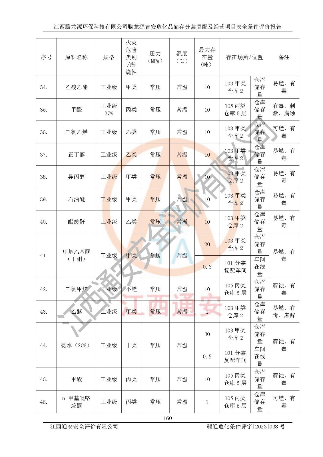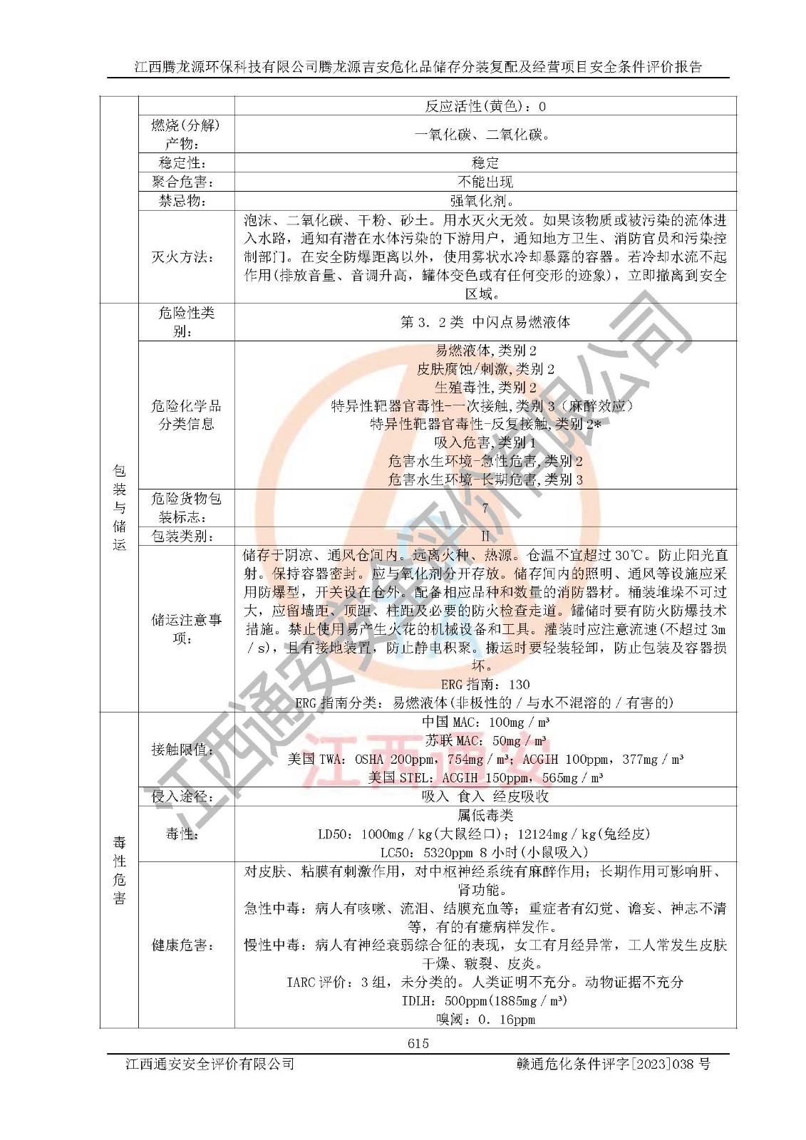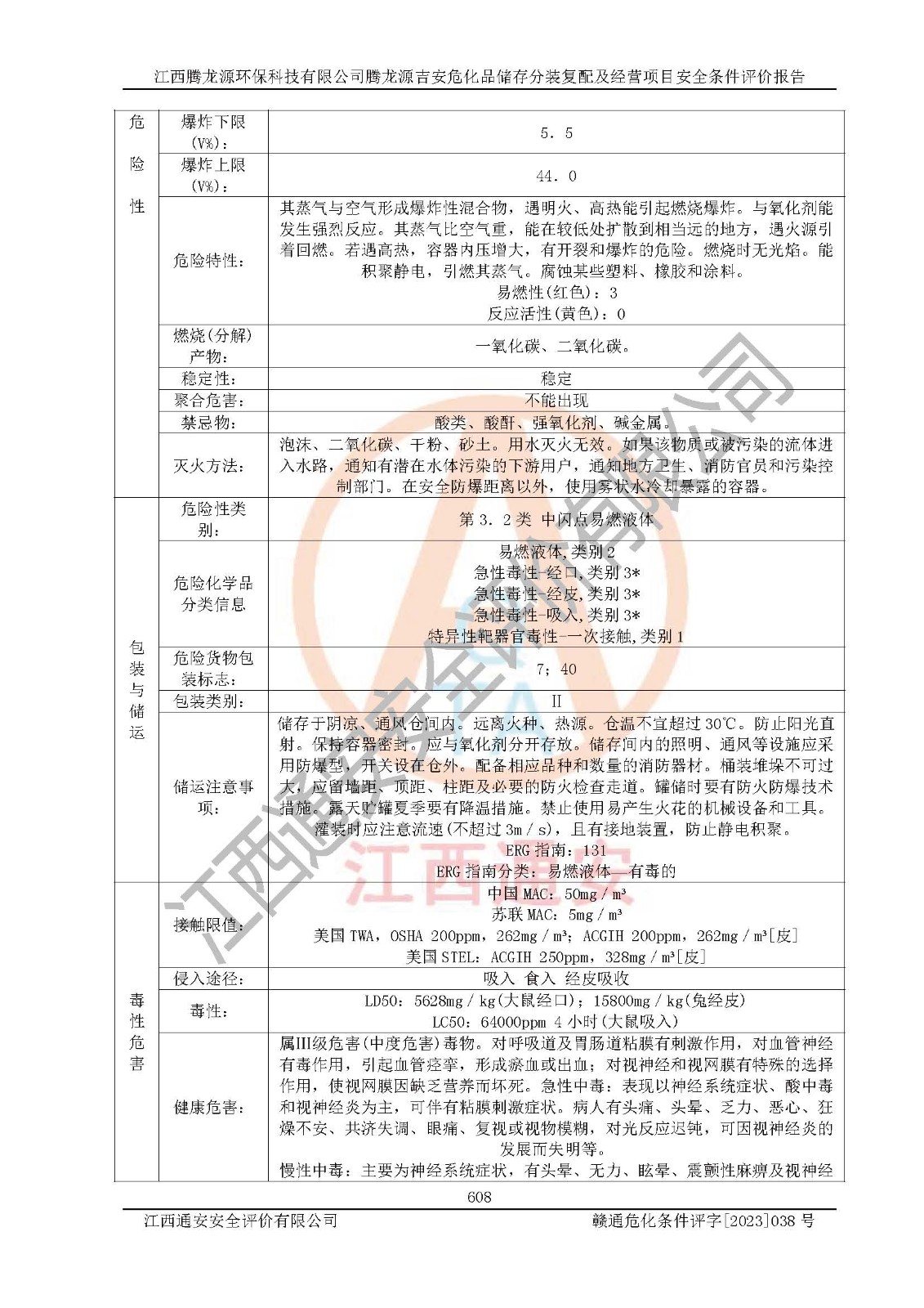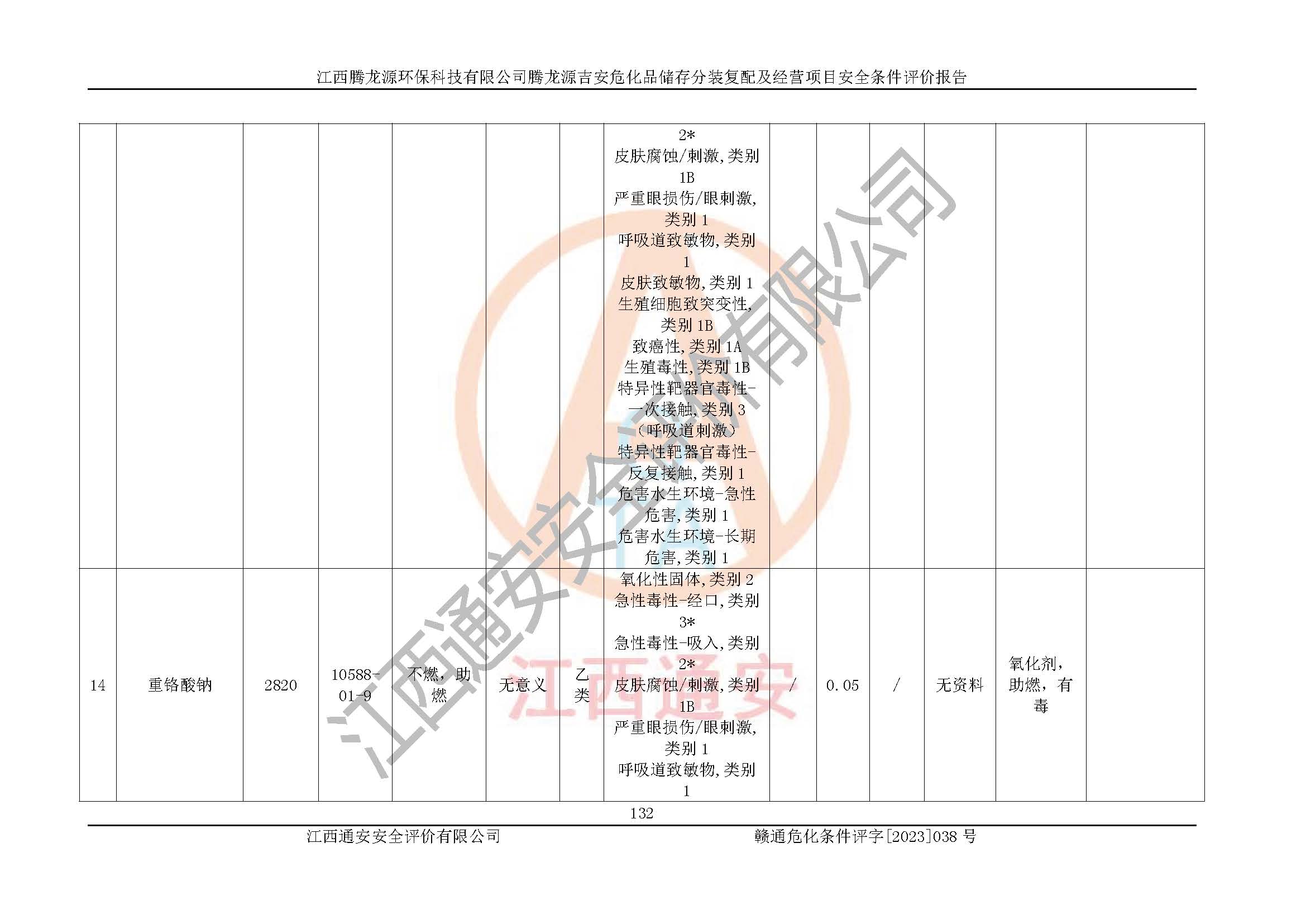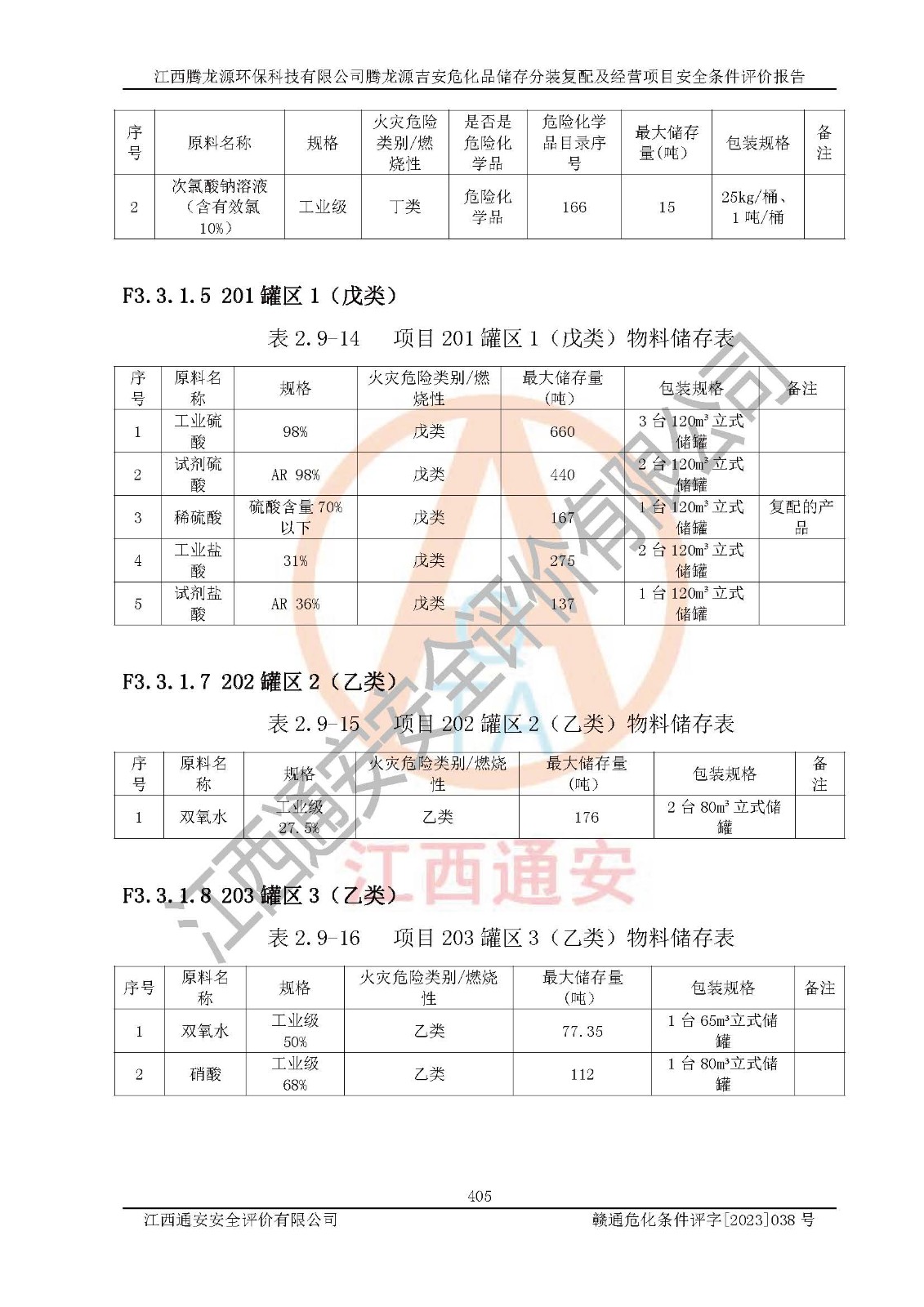 項(xiàng)目簡介 | 江西騰龍?jiān)?*科技有限公司成立于2022年6月20日,并取得吉水縣市場監(jiān)督管理局頒發(fā)的《營業(yè)執(zhí)照》,營業(yè)執(zhí)照統(tǒng)一社會信用代碼:91360822MABQK5GB5P。公司注冊住所:江西省吉安市吉水縣城西工業(yè)園區(qū)二期金龍路。法定**人:吳詩明。注冊資本壹仟萬元整。企業(yè)性質(zhì)為有限責(zé)任公司(自然人投資或控股)。營業(yè)執(zhí)照許可經(jīng)營范圍:一般項(xiàng)目:化工產(chǎn)品銷售(不含許可類化工產(chǎn)品)(除許可業(yè)務(wù)外,可自主依法經(jīng)營法律法規(guī)非禁止或限制的項(xiàng)目)。 江西騰龍?jiān)?*科技有限公司2023年2月24日取得吉水縣發(fā)展和改革委員會頒發(fā)的《江西省企業(yè)投資項(xiàng)目備案通知書》,備案項(xiàng)目名稱為:騰龍?jiān)醇参;穬Υ娣盅b復(fù)配及經(jīng)營項(xiàng)目。項(xiàng)目統(tǒng)一代碼為:2302-360822-04-01-318980。項(xiàng)目總投資20000萬元,項(xiàng)目總占地面積31.34畝。 根據(jù)《危險(xiǎn)化學(xué)品目錄(2015版)》(**安監(jiān)總局等十部門公告[2015]第5號)及應(yīng)急管理部、工業(yè)和信息化部、公安部、生態(tài)環(huán)境部、交通運(yùn)輸部、農(nóng)業(yè)農(nóng)村部、衛(wèi)生健康委、市場監(jiān)管總局、鐵路局、民航局決定調(diào)整《危險(xiǎn)化學(xué)品目錄(2015版)》(應(yīng)急管理部、工業(yè)和信息化部、公安部、生態(tài)環(huán)境部、交通運(yùn)輸部、農(nóng)業(yè)農(nóng)村部、衛(wèi)生健康委、市場監(jiān)管總局、鐵路局、民航局公告2022年第8號)等文件對該項(xiàng)目生產(chǎn)過程中所涉及的化學(xué)品進(jìn)行辨識:項(xiàng)目涉及的硫酸、鹽酸、雙氧水、硝酸、氫氧化鈉(固體和溶液)、次氯酸鈉溶液、氯酸鈉、氯酸鉀、鉻酸酐、高錳酸鈉、高錳酸鉀、硝酸鉀、重鉻酸鉀、重鉻酸鈉、硝酸鈉、亞硝酸鈉、過硫酸鈉、過硫酸銨、過硫酸鉀、漂白粉、氯化亞砜、甲醇、乙醇、二甲苯、甲苯、**、天那水、乙酸、乙酸乙酯、甲醛溶液、三氯乙烯、正丁醇、異丙醇、石油醚、醋酸酐、甲基乙基酮(丁酮)、三氯甲烷、乙醚、氨水(20%)、甲酸、二氯甲烷、**苯、乙酸丁酯、氫氟酸、磷酸、硫化鈉(無水)、氫氧化鉀、氨基磺酸、三氯化鐵、九水硝酸鐵、氯化鋅、硫脲、硼酸、硫酸鎳、氯化鎳、氟化氫銨、氟化氫鉀、氟化氫鈉、偏硅酸鈉、九水偏硅酸鈉、氟硅酸鈉、亞硫酸氫鈉、氟化鈉、氟化鉀、六次甲基四胺、結(jié)晶氯化鋁、碳酸二乙酯、碳酸二甲酯、酸性清洗劑、退鍍劑、開油水、洗網(wǎng)水、污水殺菌劑(復(fù)配的次氯酸鈉溶液)、電解液等屬于危險(xiǎn)化學(xué)品。 江西騰龍?jiān)?*科技有限公司騰龍?jiān)醇参;穬Υ娣盅b復(fù)配及經(jīng)營項(xiàng)目只進(jìn)行物理混合復(fù)配、分裝等作業(yè),不涉及化學(xué)反應(yīng)過程。因此該公司?;穫}儲經(jīng)營活動需要辦理《危險(xiǎn)化學(xué)品經(jīng)營許可證》。 根據(jù)《中華人民共和國監(jiān)控化學(xué)品管理?xiàng)l例》(中華人民共和國***令**90號,經(jīng)中華人民共和國***令第588號修改)及《各類監(jiān)控化學(xué)品名錄》(中華人民共和國工業(yè)和信息化部令第52號;2020年)、《列入第三類監(jiān)控化學(xué)品的新增品種清單》**石油和化學(xué)工業(yè)局令**號等規(guī)定進(jìn)行辨識:項(xiàng)目涉及的氯化亞砜屬于第三類監(jiān)控化學(xué)品。 根據(jù)《易制毒化學(xué)品管理?xiàng)l例》(***令第445號,經(jīng)***令第653號、***第666號、***第703號修改)及附表規(guī)定、中華人民共和國公安部 中華人民共和國商務(wù)部、**衛(wèi)生和計(jì)劃生育委員會、中華人民共和國海關(guān)總署、**安全生產(chǎn)監(jiān)督管理總局、**食品藥品監(jiān)督管理總局《關(guān)于將4-苯胺基-N-苯乙基哌啶、N-苯乙基-4-哌啶酮、N-甲基-1-苯基-1-氯-2-丙胺、溴素、1-苯基-1-**5種物質(zhì)列入易制毒化學(xué)品管理的公告》(國辦函[2017]**20號)、《***辦公廳關(guān)于同意將1-苯基-2-溴-1-**和3-氧-2-苯基丁腈列入易制毒化學(xué)品品種目錄的函》(國辦函[2014]第40號)、《***辦公廳關(guān)于同意將α-苯乙酰乙酸甲酯等6種物質(zhì)列入易制毒化學(xué)品品種目錄的函》(國辦函〔2021〕58號)等進(jìn)行辨識:項(xiàng)目涉及的硫酸、鹽酸、高錳酸鉀、甲苯、**、甲基乙基酮等屬于第三類易制毒化學(xué)品;醋酸酐、三氯甲烷、乙醚等屬于第二類易制毒化學(xué)品。 根據(jù)《危險(xiǎn)化學(xué)品名錄[2015年版]》(**安監(jiān)總局等十部門[2015]第5號)進(jìn)行劇毒化學(xué)品辨識:項(xiàng)目不涉及劇毒化學(xué)品。 根據(jù)《高毒物品目錄(2003年版)》(原衛(wèi)生部衛(wèi)法監(jiān)發(fā)[2003]142號)對項(xiàng)目涉及的化學(xué)品進(jìn)行高毒物品辨識:項(xiàng)目涉及的甲醛溶液、硫酸鎳、氯化鎳、氟化氫銨、氟化氫鉀、氟化氫鈉、氟化鈉、氟化鉀、鉻酸酐、高錳酸鉀、高錳酸鈉、重鉻酸鉀、重鉻酸鈉等屬于高毒物品。 根據(jù)中華人民共和國公安部《易制爆危險(xiǎn)化學(xué)品名錄》(2017年版)中規(guī)定進(jìn)行辨識:項(xiàng)目涉及的雙氧水、硝酸、氯酸鈉、氯酸鉀、高錳酸鉀、高錳酸鈉、硝酸鉀、重鉻酸鉀、重鉻酸鈉、硝酸鈉、六次甲基四胺等屬于易